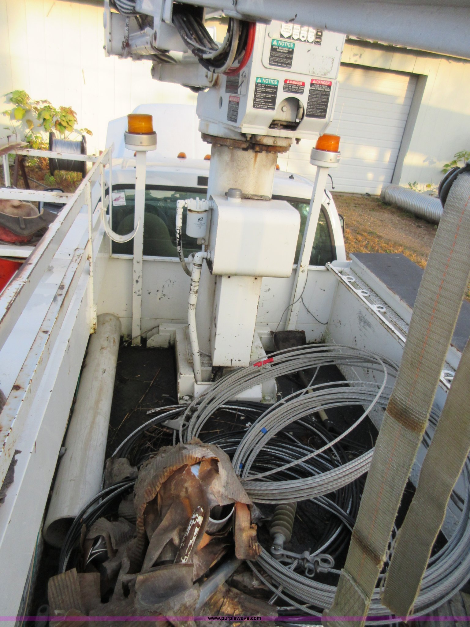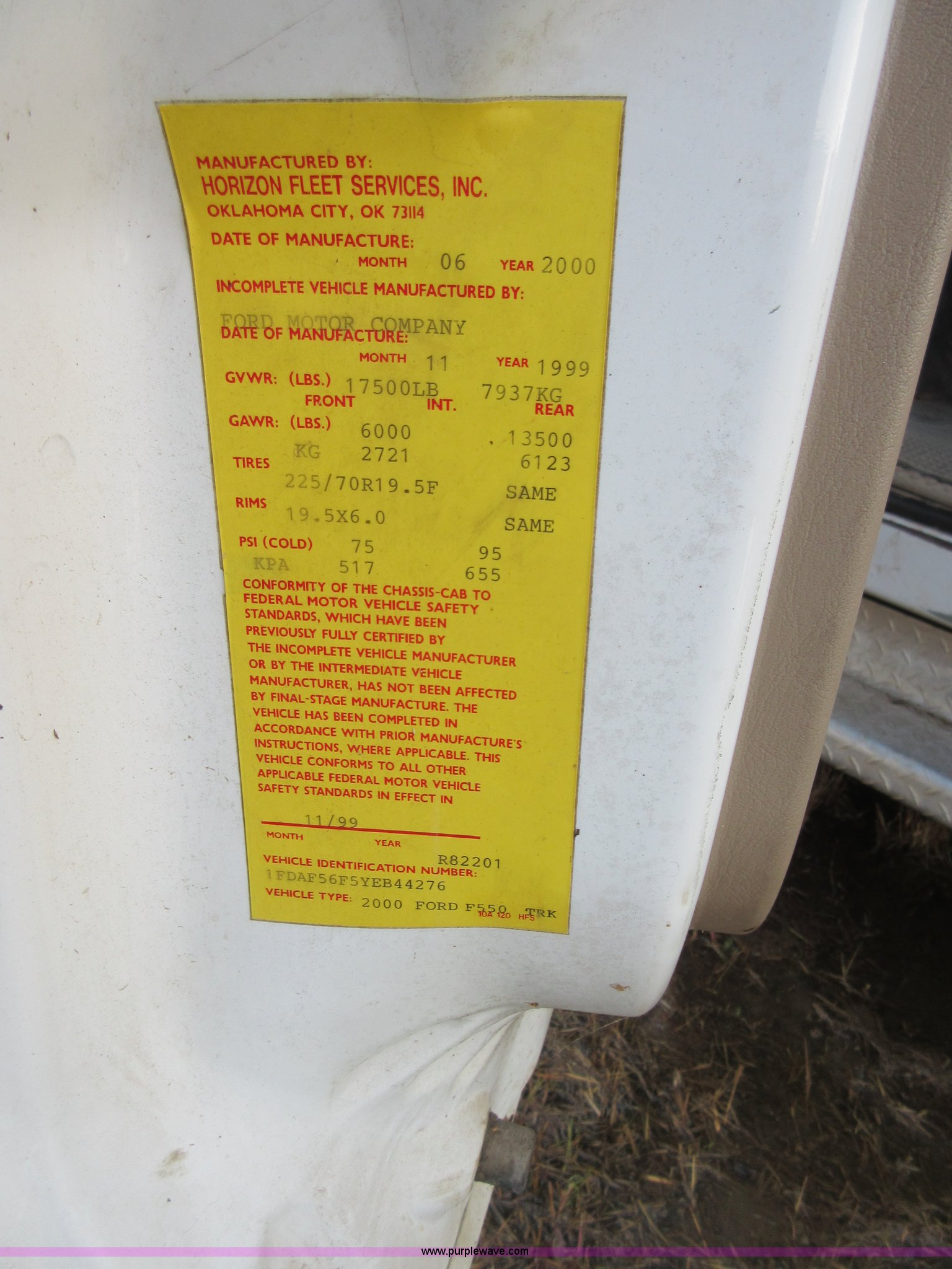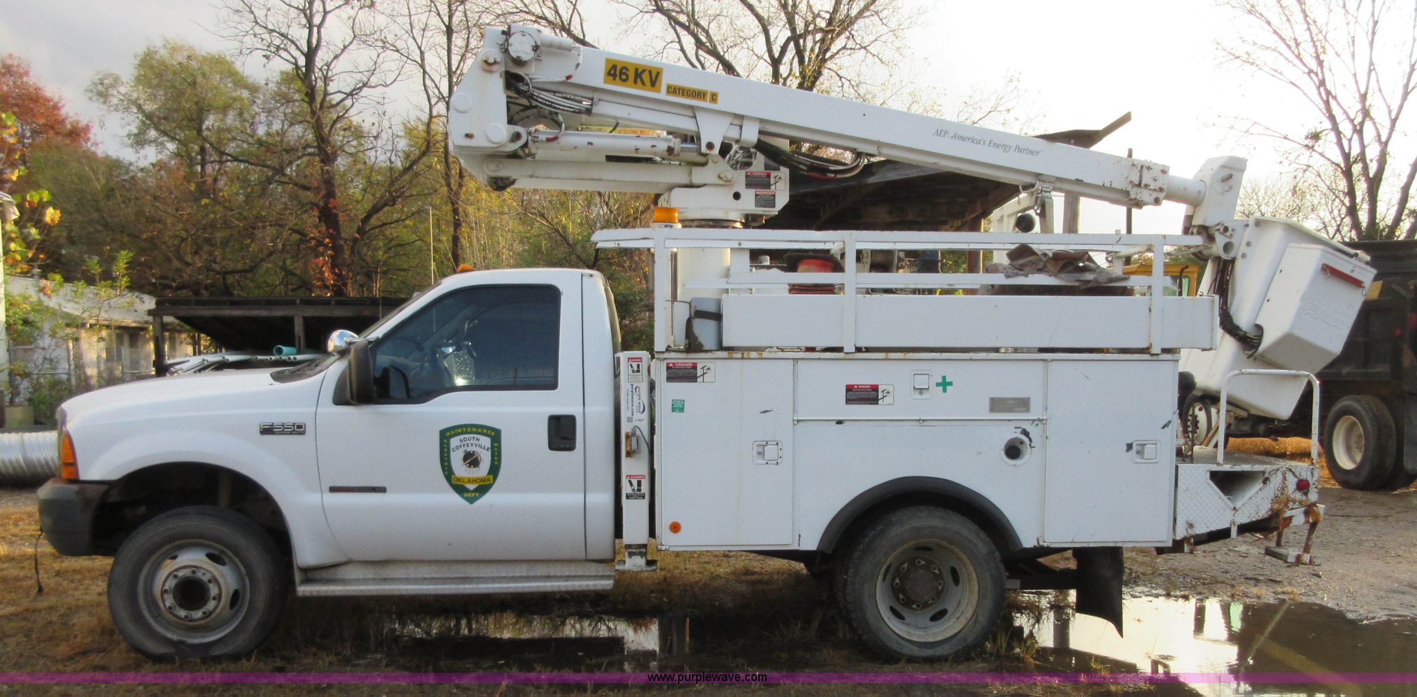 Purple Wave is selling a used Bucket Truck in Oklahoma. This item is a 2000 Ford F550 bucket truck with the following: 129,680 miles on odometer, 8,994 hours on meter, 7.3L V8 turbo diesel engine, Automatic transmission, Single axle, AC and heat, AM/FM, Block heater, PTO, Altec service bed, Serial 3T-64361, Shelving, Work lights, Pintle hitch, Altec TA35 boom, Serial 0494CB0126, 300 lbs maximum lift capacity, 35' maximum lift height, Ground and platform controls, Boom rotation, Articulating boom, Man basket, Single exhaust stack, Spring suspension, Hydraulic brakes, 225/70R19.5 tires, GVWR 17,500 lbs, Two way radio is not included, One outrigger leaks down, Shifter will not come out of park, Non-operational power steering pump, Unit will not come off idle