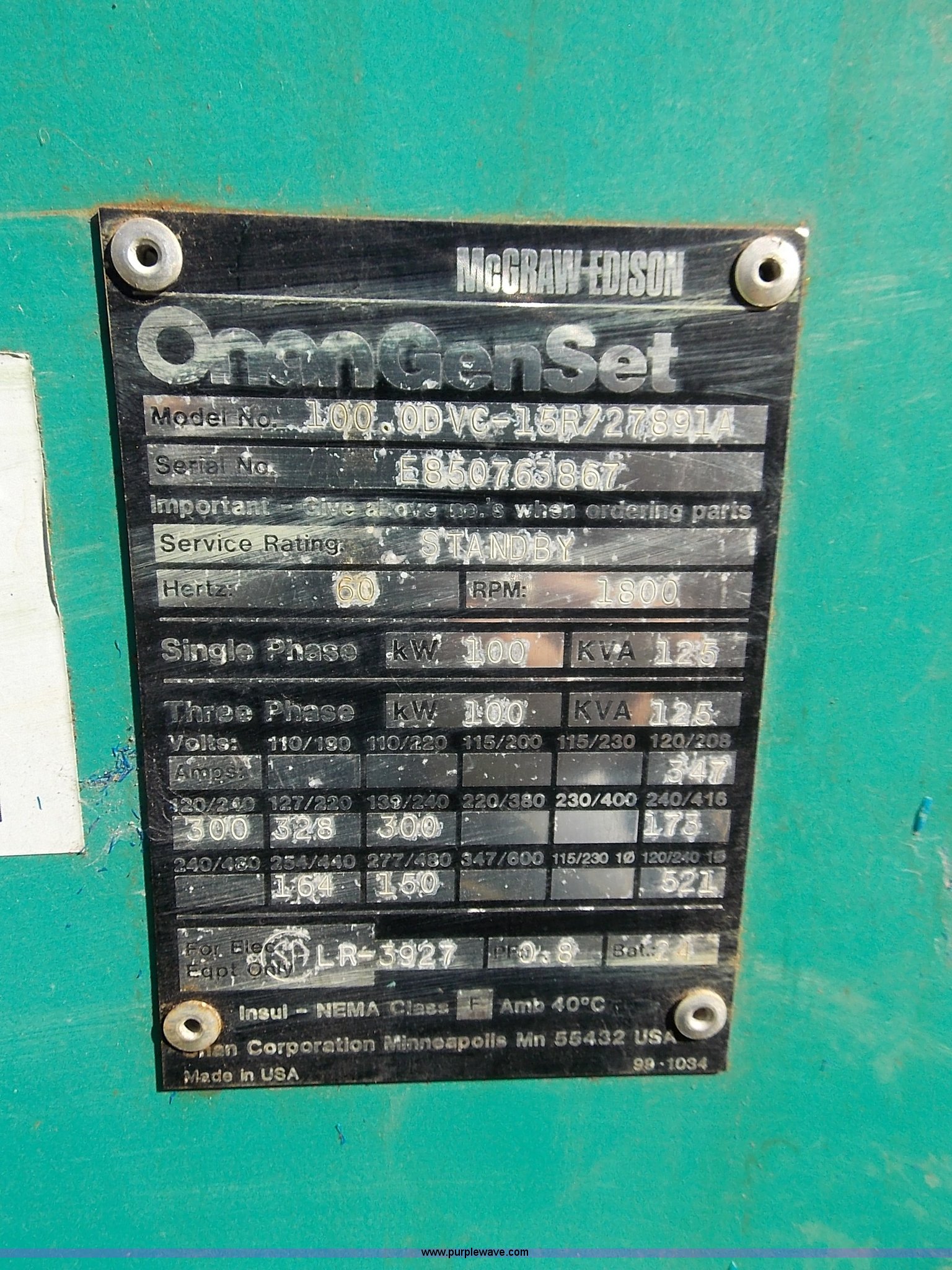 Purple Wave is selling a used Generator Set in Missouri. This item is a Onan generator with the following: 369 hours on meter, Model 10030DVC-15R/278914, Six cylinder diesel engine, Model 0665T, Serial 73116, Three phase, 100 kW each, 60 Hz at 1,800 RPM, Serial E850763867