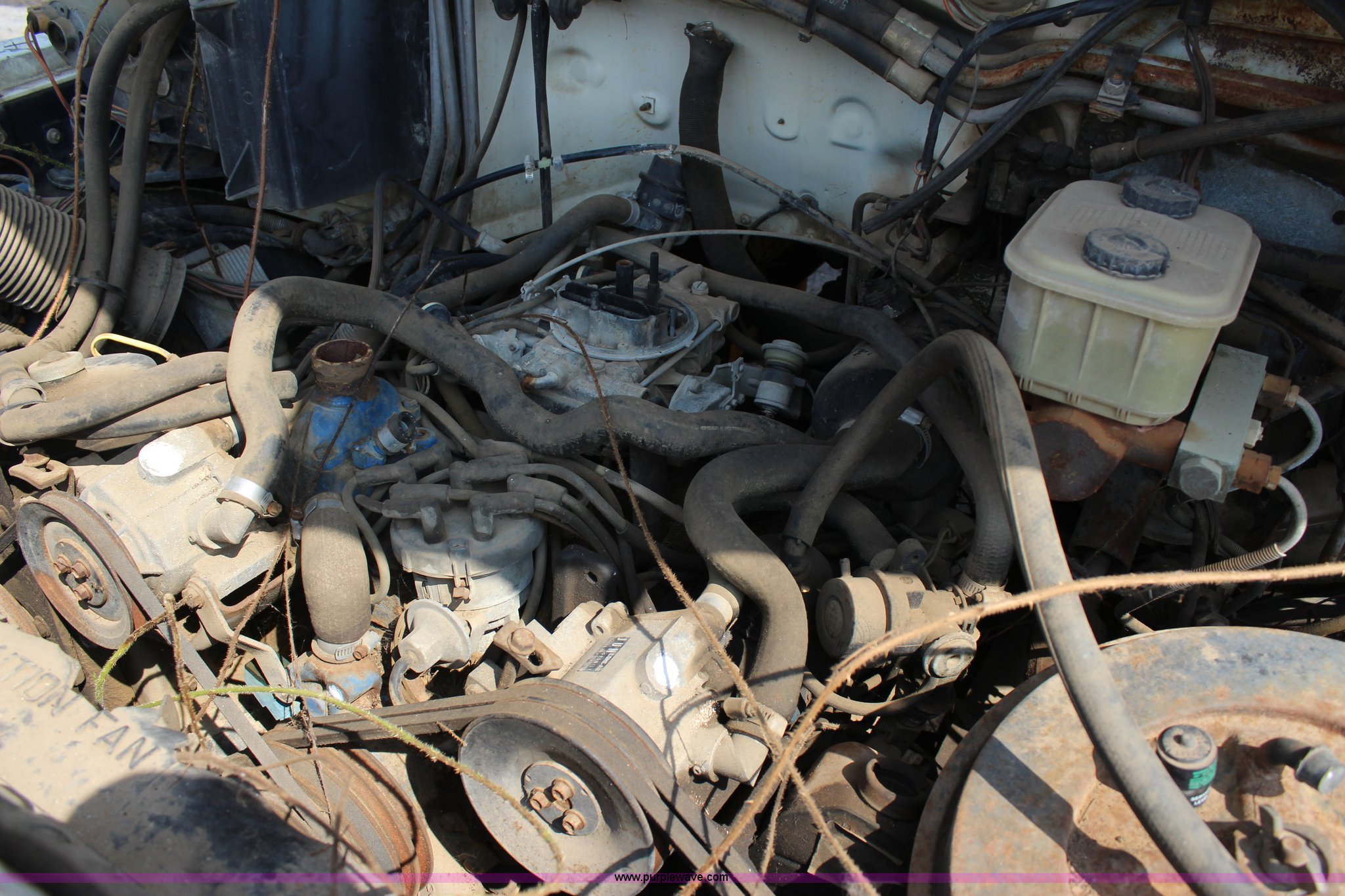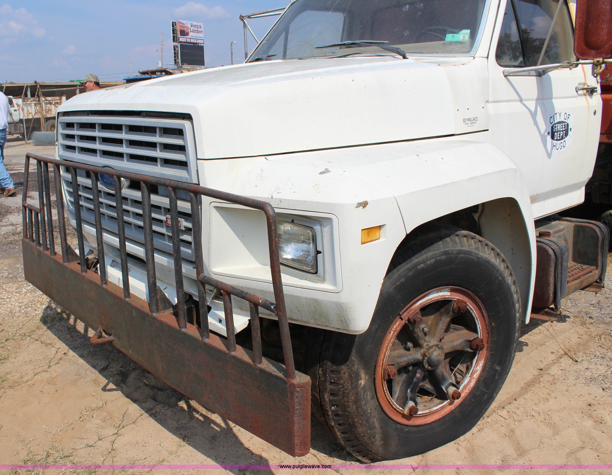 1986 Ford F700 dump truck. 45,771 miles on odometer, Ford 6.1L V8 diesel engine, Eight speed manual transmission, Two speed rear end, Single axle, AC and heat, Spring suspension seat, PTO, 10'L x 8'W steel dump bed 27" side height, 18"H side boards, Manual operated end gate, Brush guard, Dual fuel tanks, 10.00-20 tires, GVWR 24,500 lbs, Tires flat, Unknown operating condition, Unit# 2. 1FDNF70H9GVA27595. City of Hugo. 302 West Jackson. Hugo, OK 74743