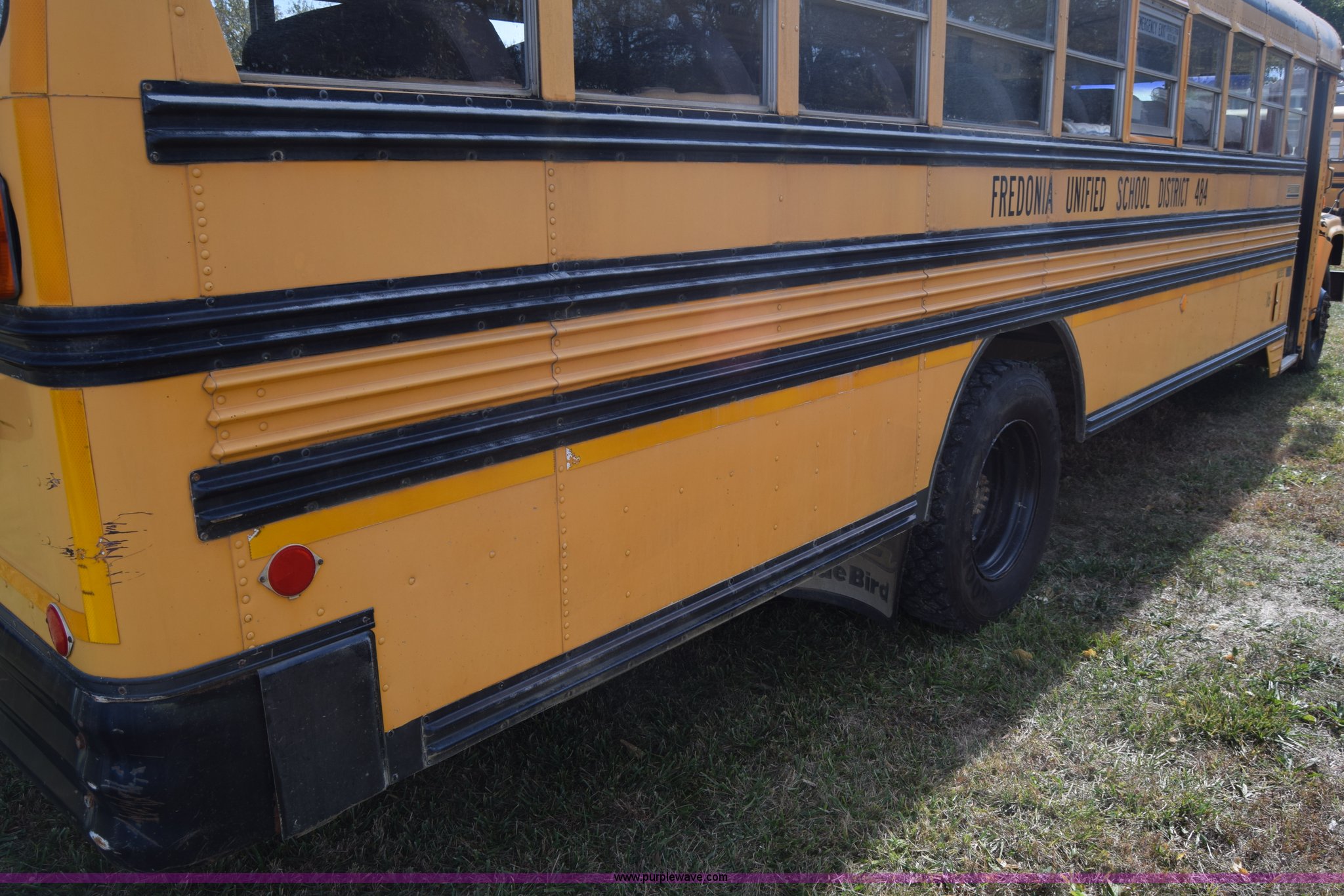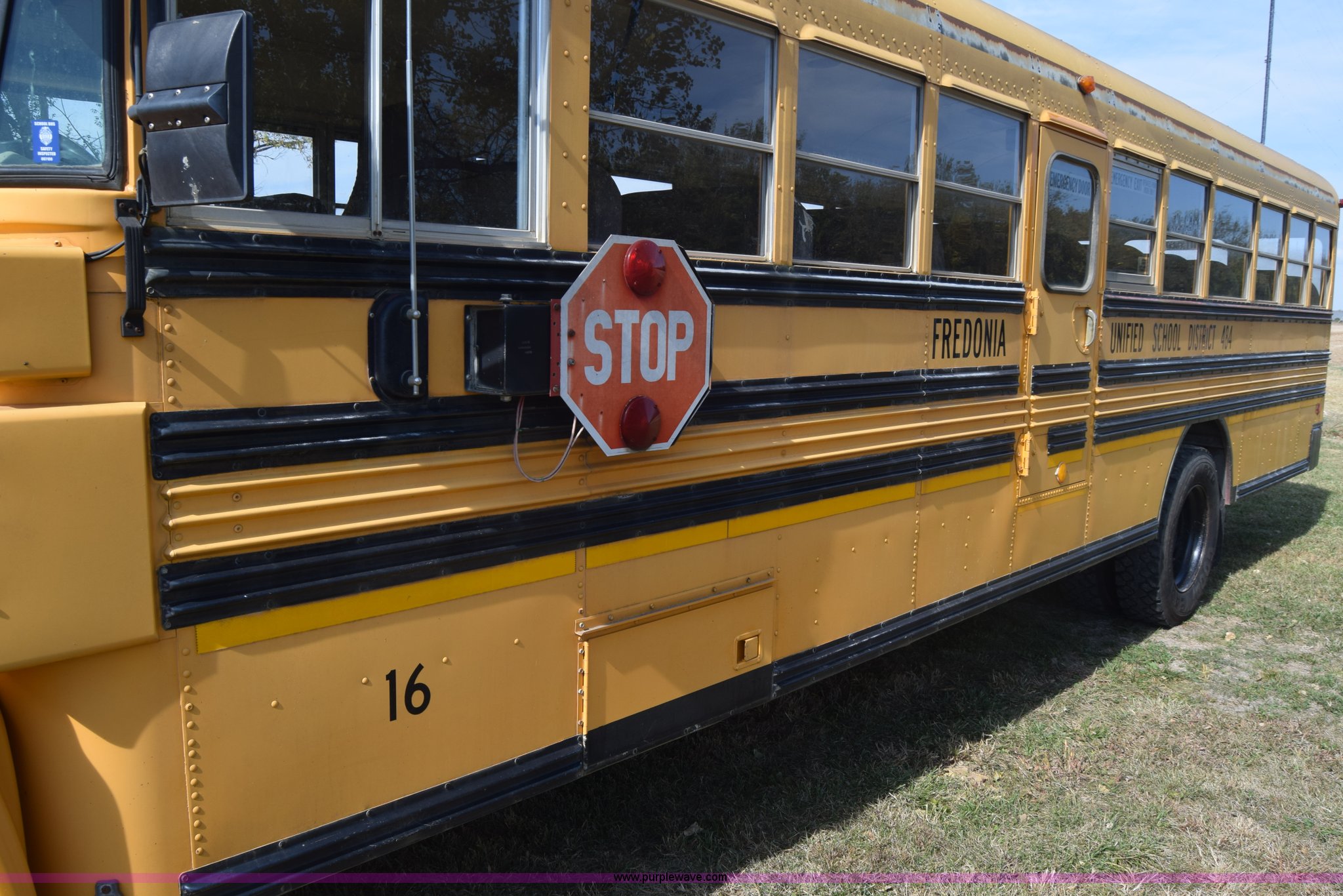 1995 Chevrolet Blue Bird school bus. 184,135 miles on odometer, Caterpillar 3116 6.6L six cylinder diesel engine, Automatic transmission, Heat, Manual windows, Vinyl interior, 56 passenger capacity, 295/75R22.5 tires, GVWR 27,960 lbs, Interior/exterior cosmetic damage. 1GBL7T1J6RJ108457. USD 484 Transportation. 1421 Golf Course Rd. Fredonia, KS 66736