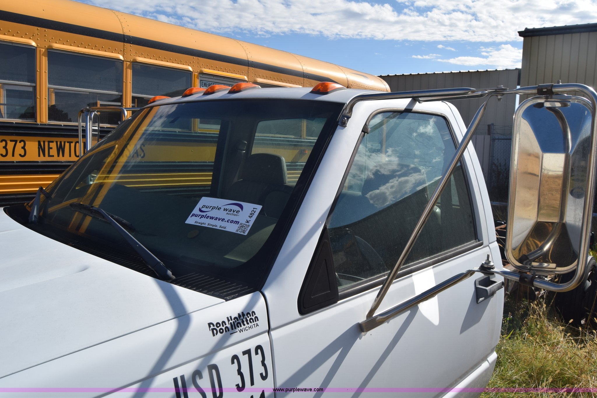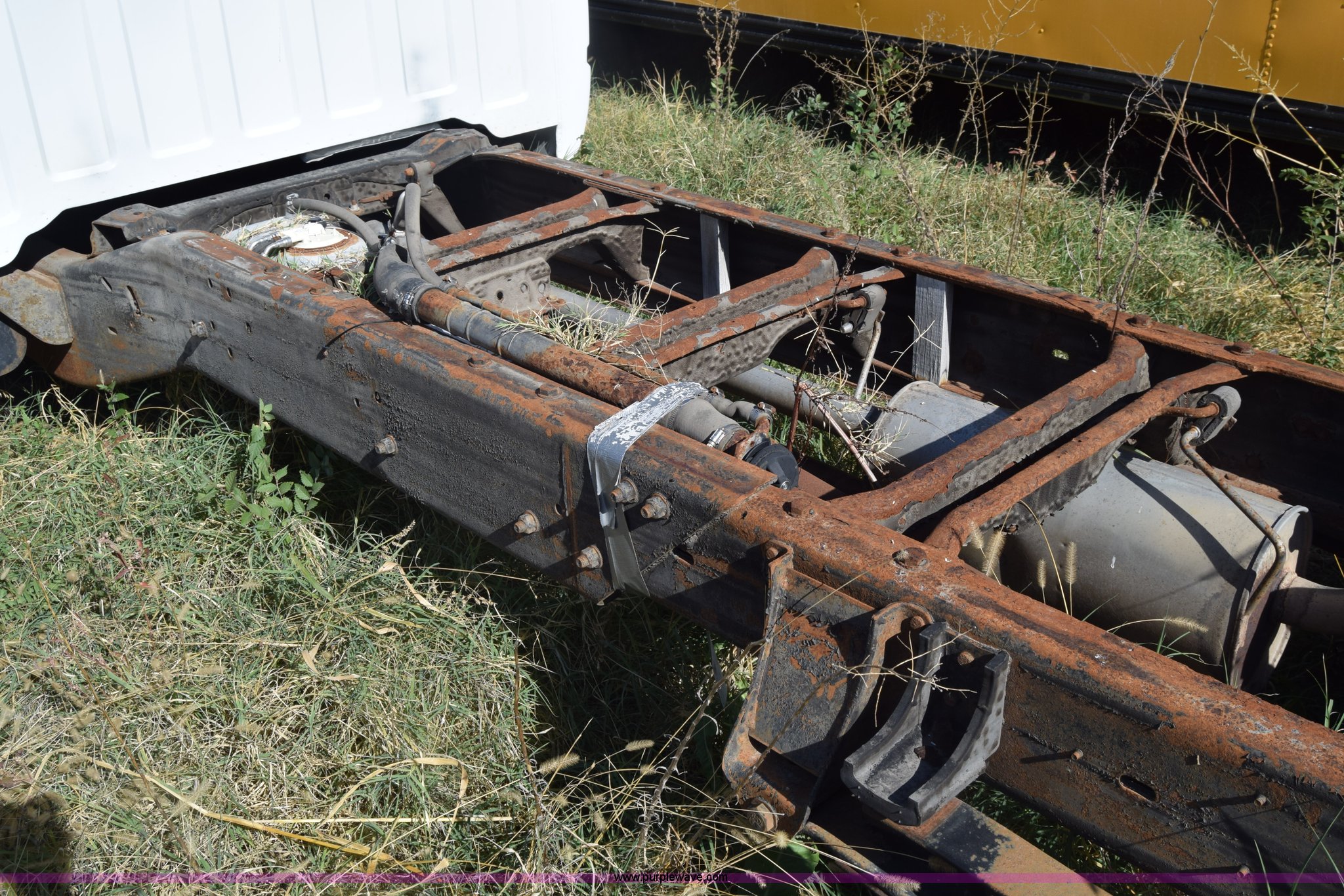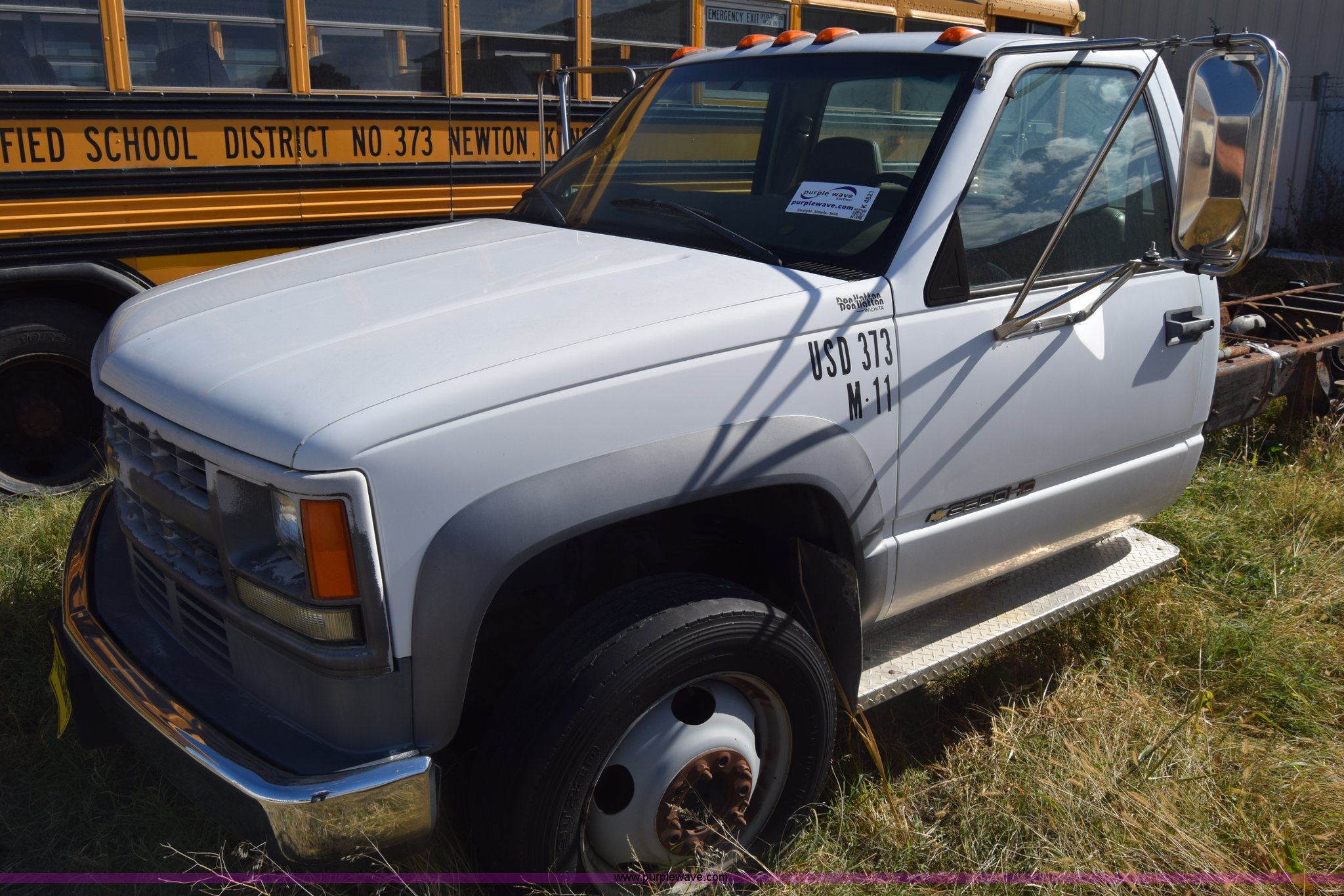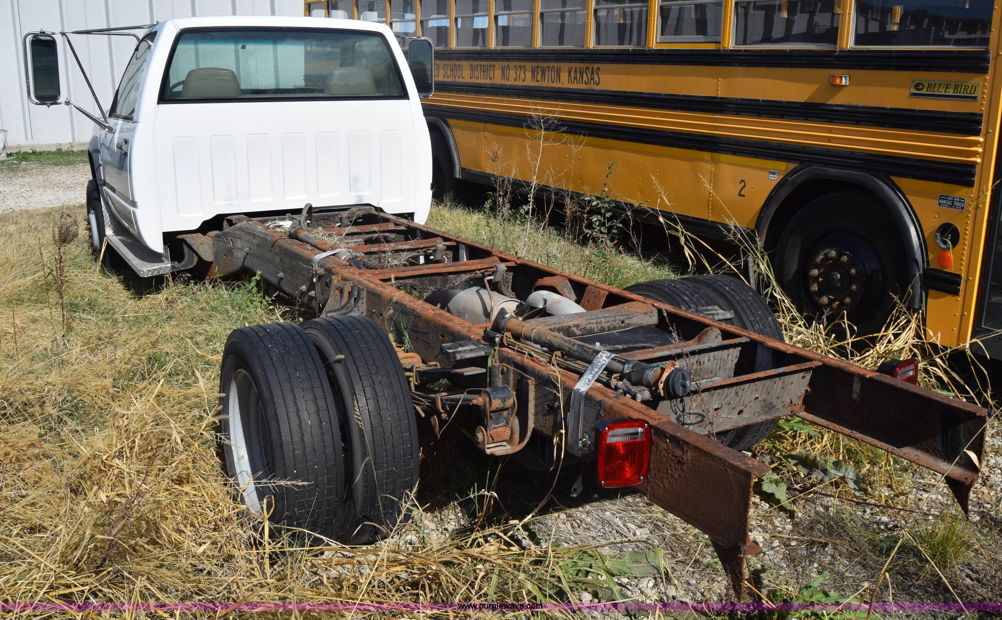 2002 Chevrolet Silverado 3500 pickup truck cab and chassis. 68,867 miles on odometer, 8.1L V8 OHV 16V gas engine, Automatic transmission, AC and heat, AM/FM, Manual windows and locks, Vinyl interior, Running boards, 14' from rear of cab to rear of chassis, 225/70R19.5 tires, Interior/exterior cosmetic damage, Dead battery, Seat torn. 3GBKC34G52M116694. USD 373 Newton. 100 S Evans. Newton, KS 67114