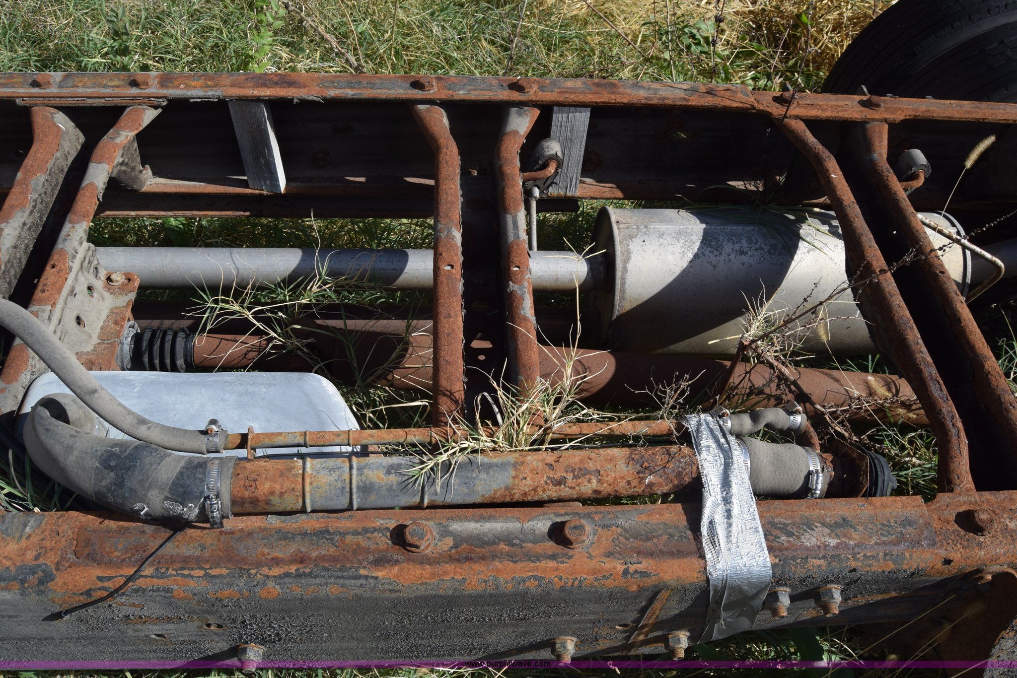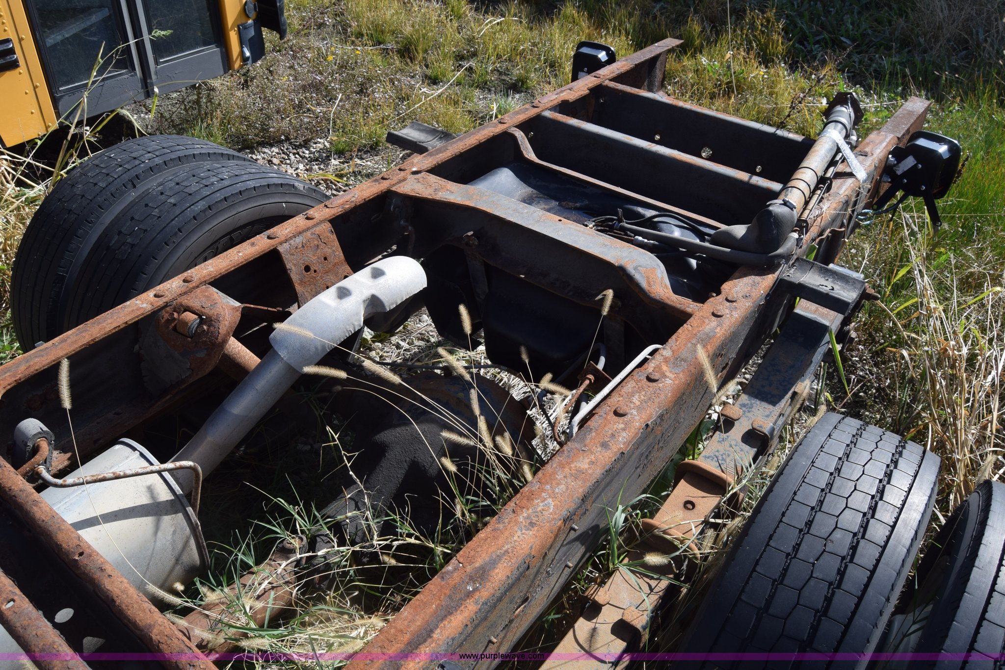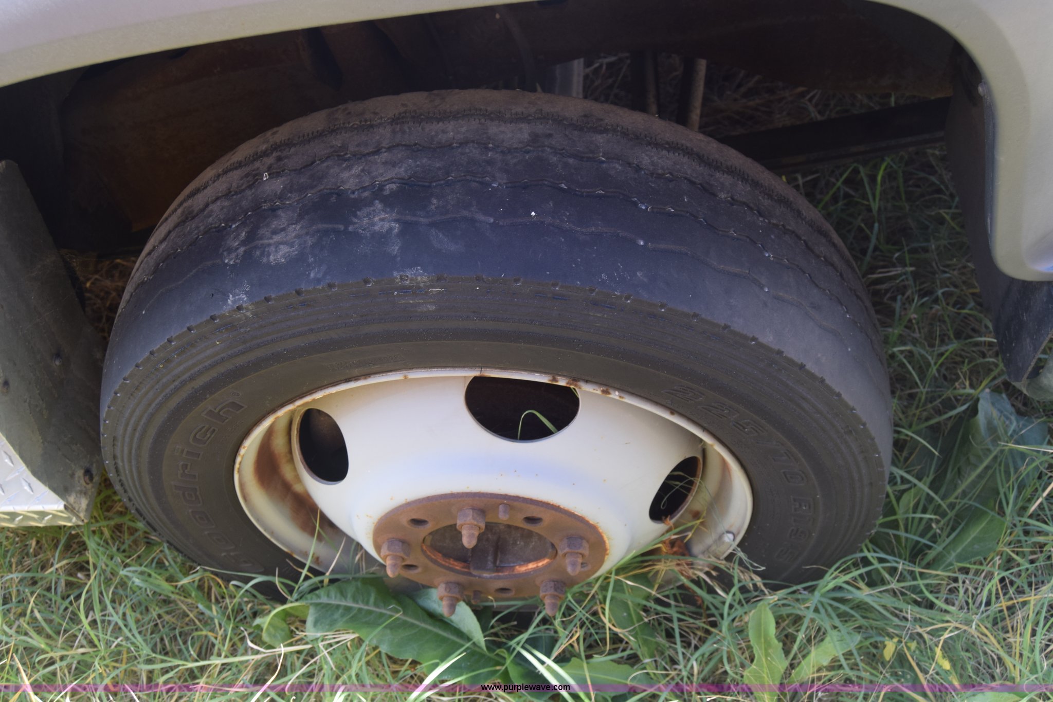 2002 Chevrolet Silverado 3500 pickup truck cab and chassis. 68,867 miles on odometer, 8.1L V8 OHV 16V gas engine, Automatic transmission, AC and heat, AM/FM, Manual windows and locks, Vinyl interior, Running boards, 14' from rear of cab to rear of chassis, 225/70R19.5 tires, Interior/exterior cosmetic damage, Dead battery, Seat torn. 3GBKC34G52M116694. USD 373 Newton. 100 S Evans. Newton, KS 67114