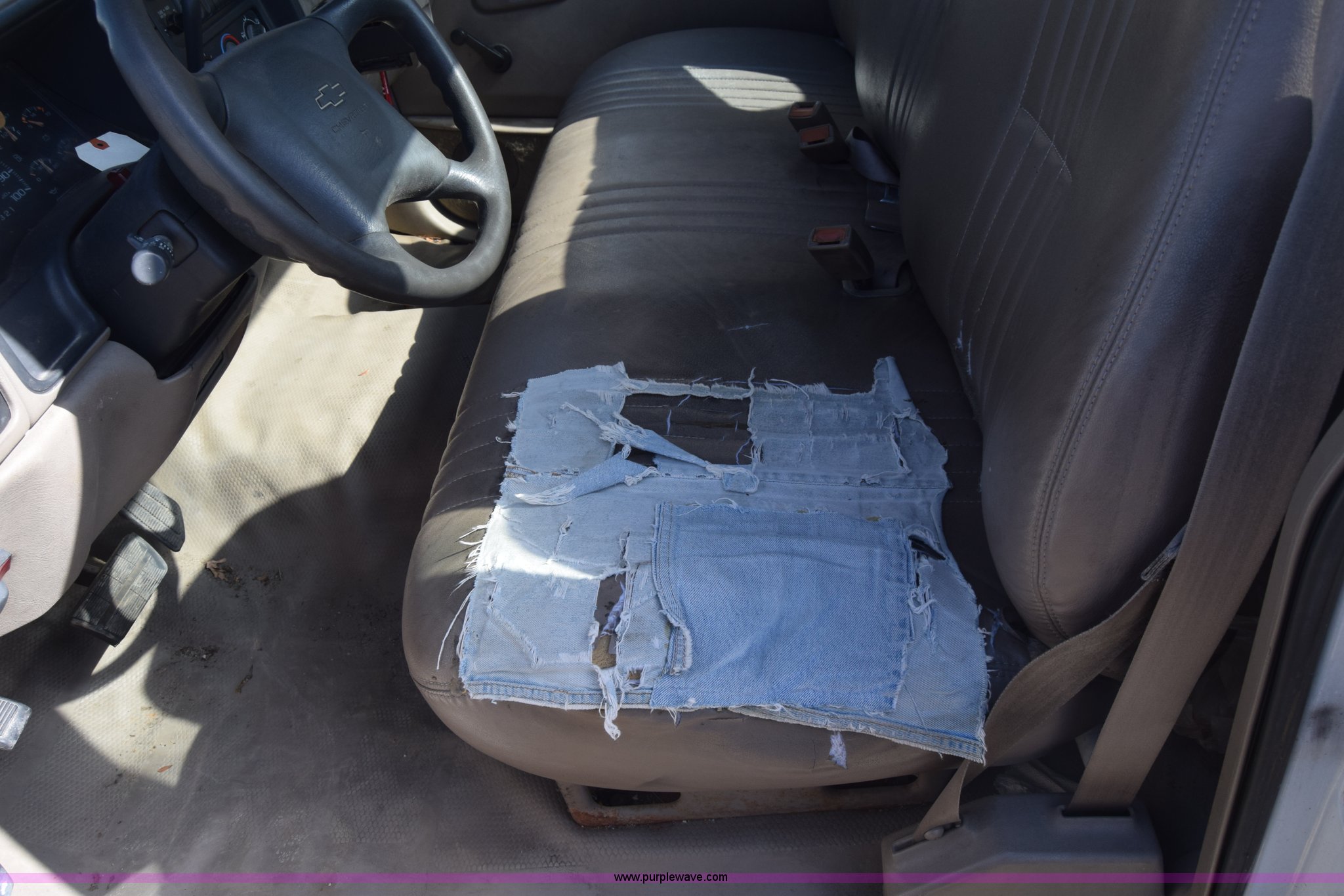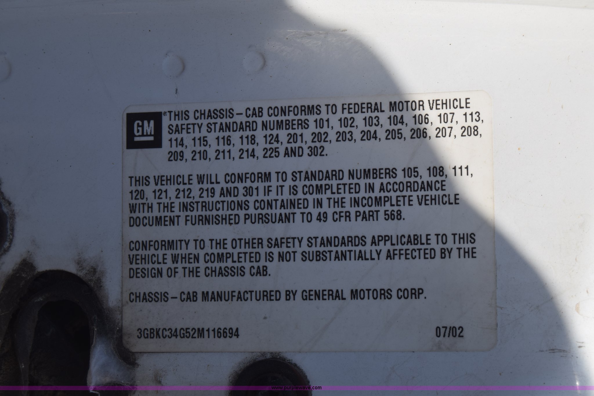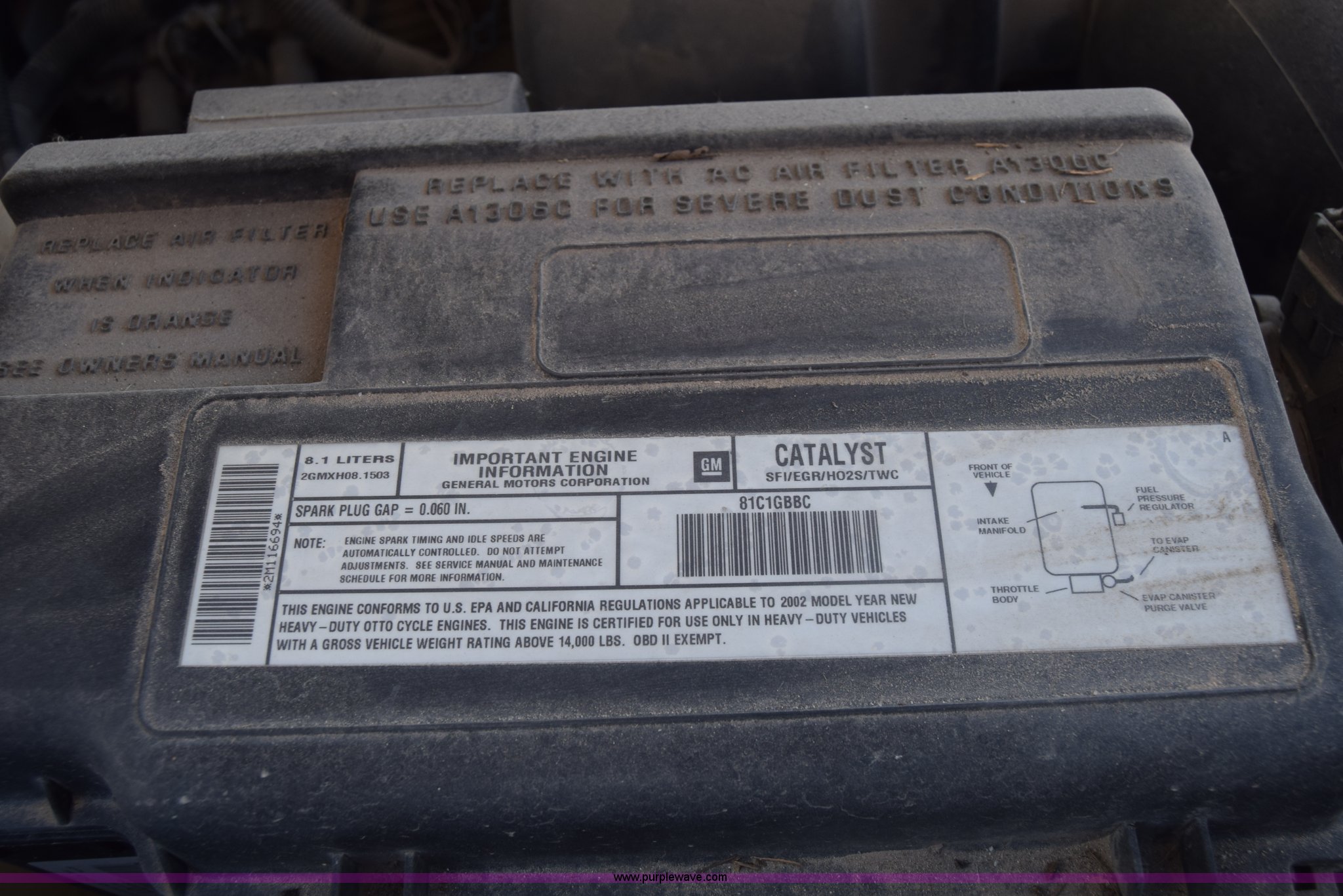 Purple Wave is selling a used 3/4 or 1 Ton Pickup or Van in Kansas. This item is a 2002 Chevrolet Silverado 3500 pickup truck cab and chassis with the following: 68,867 miles on odometer, 8.1L V8 OHV 16V gas engine, Automatic transmission, AC and heat, AM/FM, Manual windows and locks, Vinyl interior, Running boards, 14' from rear of cab to rear of chassis, 225/70R19.5 tires, Interior/exterior cosmetic damage, Dead battery, Seat torn