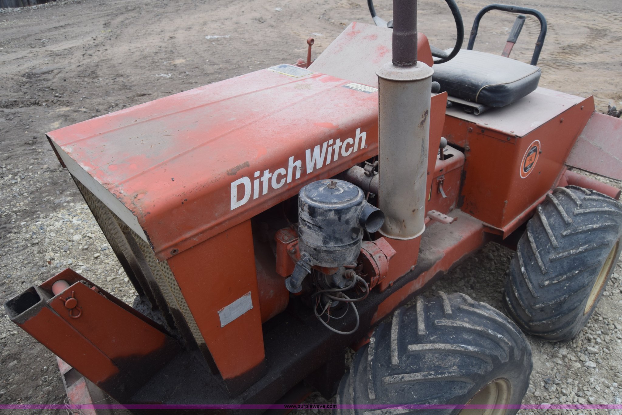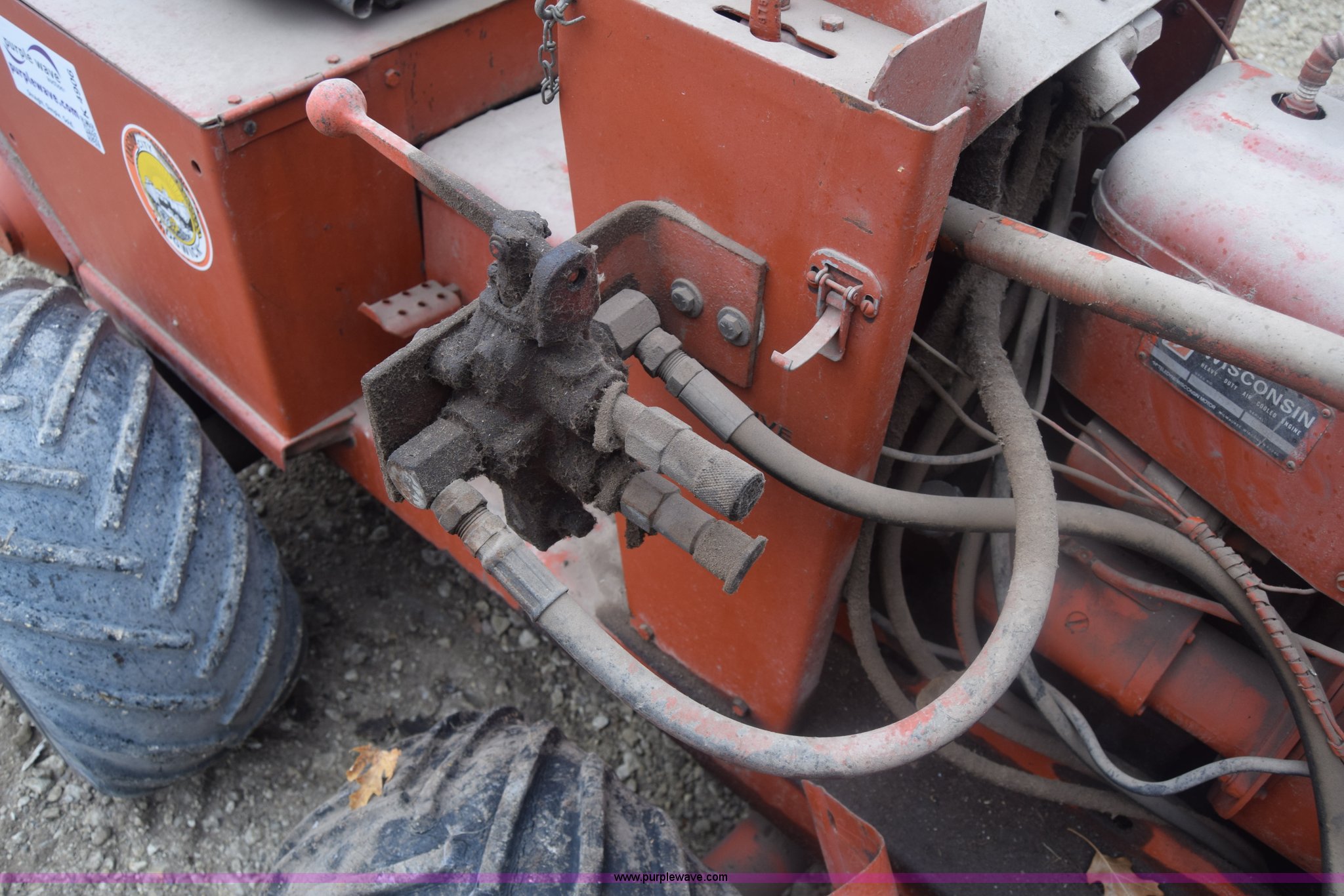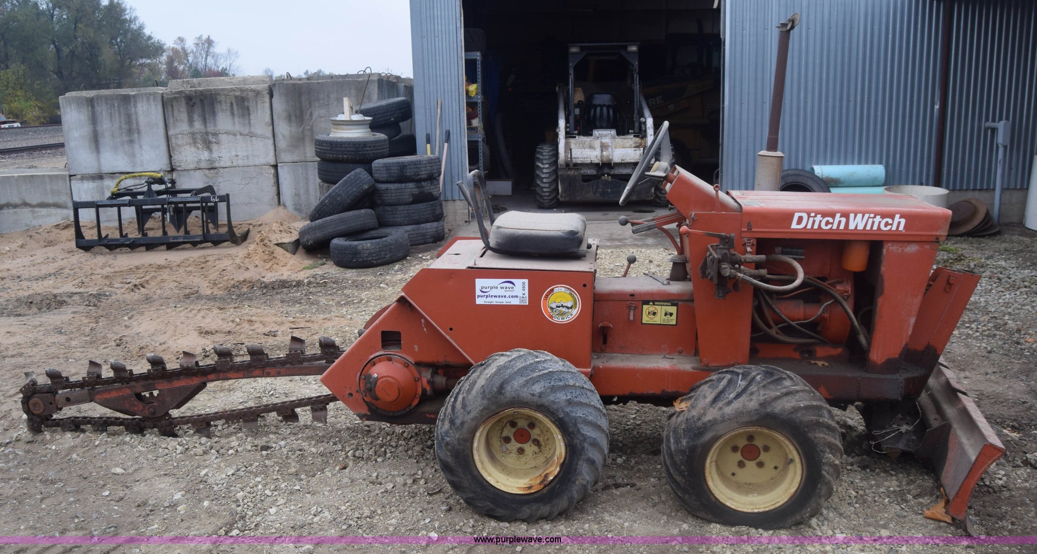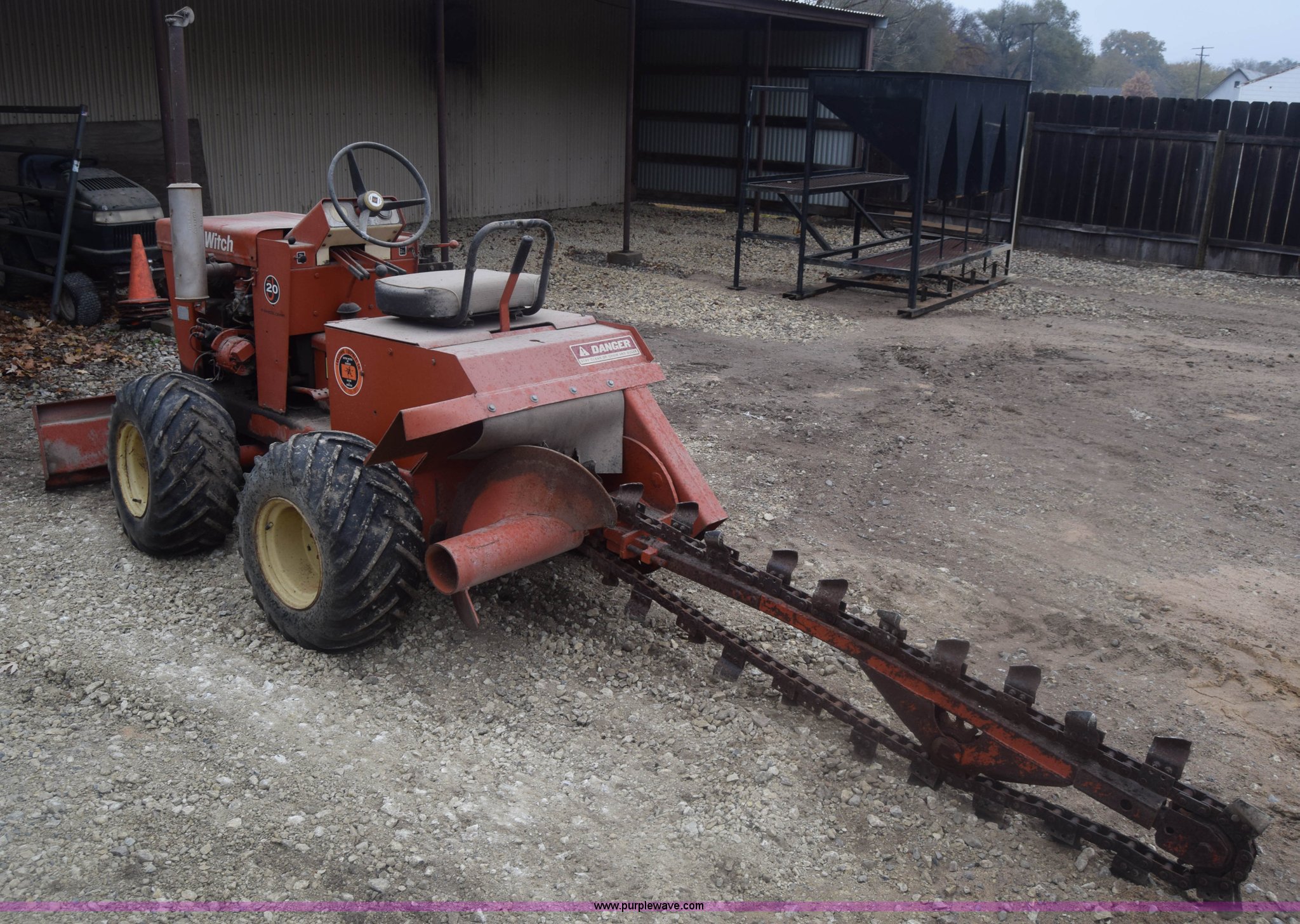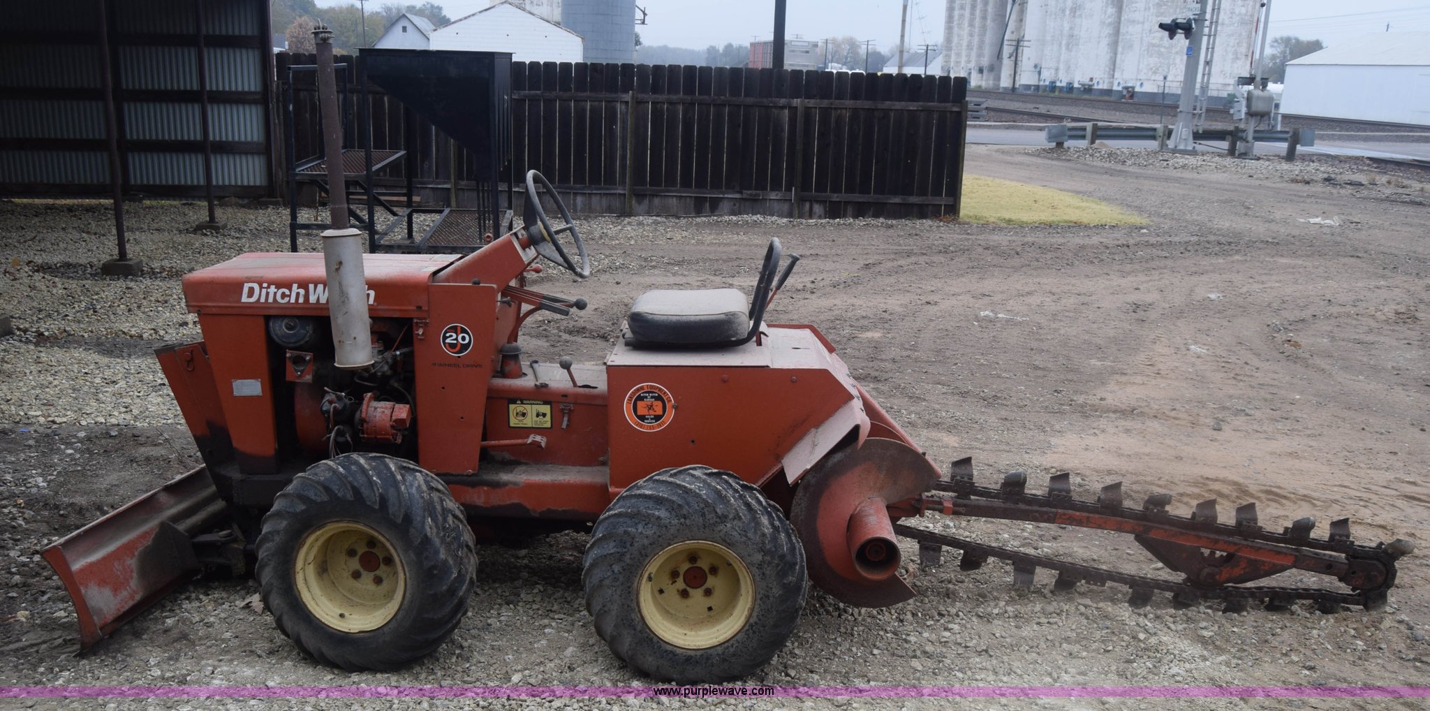 Purple Wave is selling a used Trencher or Rock Saw in Kansas. This item is a Ditch Witch J20 trencher with the following: Wisconson 2 cylinder gas engine, Manual transmission, 3F-1R gears, Four wheel drive, 58"W backfill blade, Hydraulic angle adjustment, 78" trencher bar, 26/12.00-20 tires, Flat tire, Start inoperable, Serial 235052