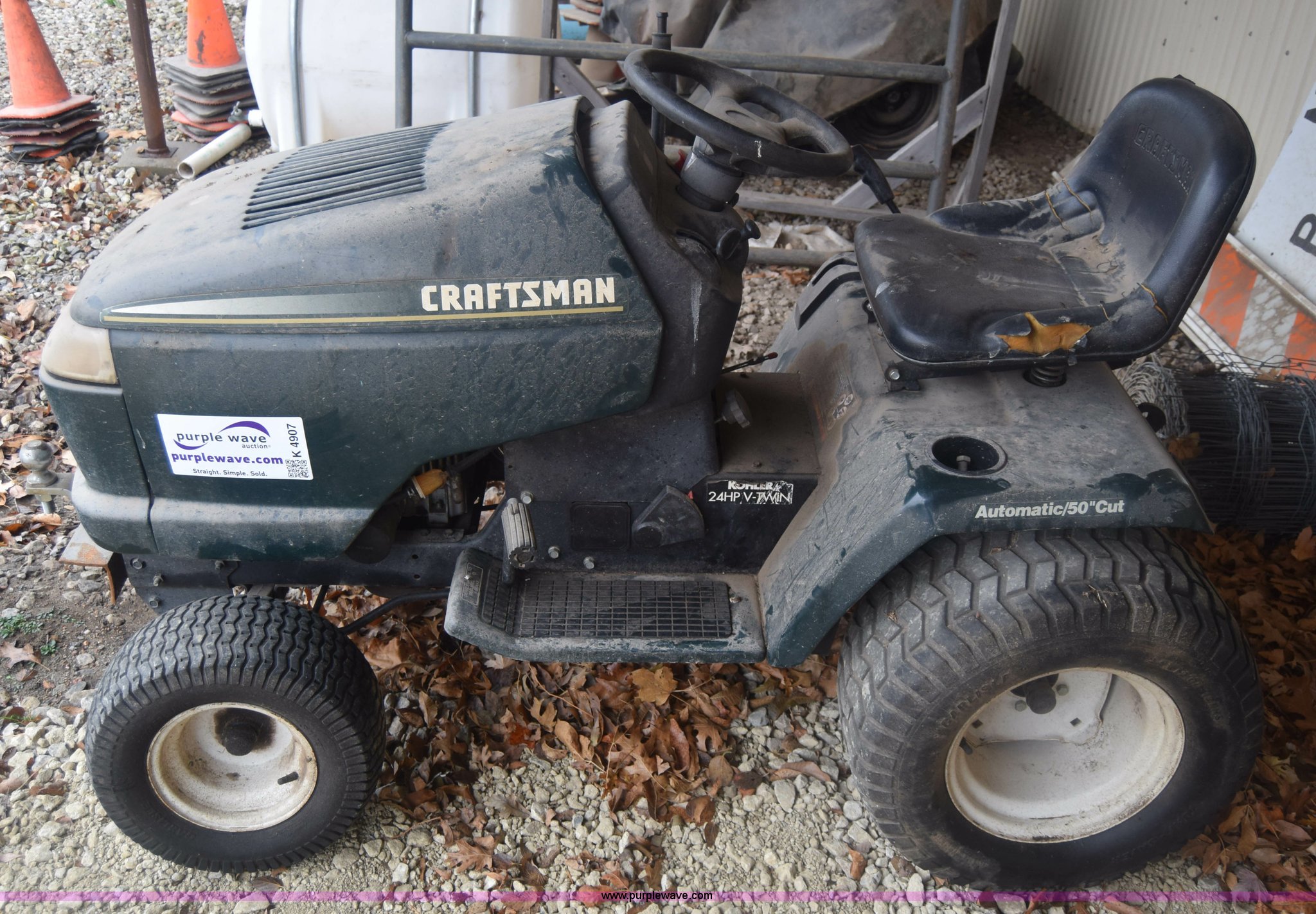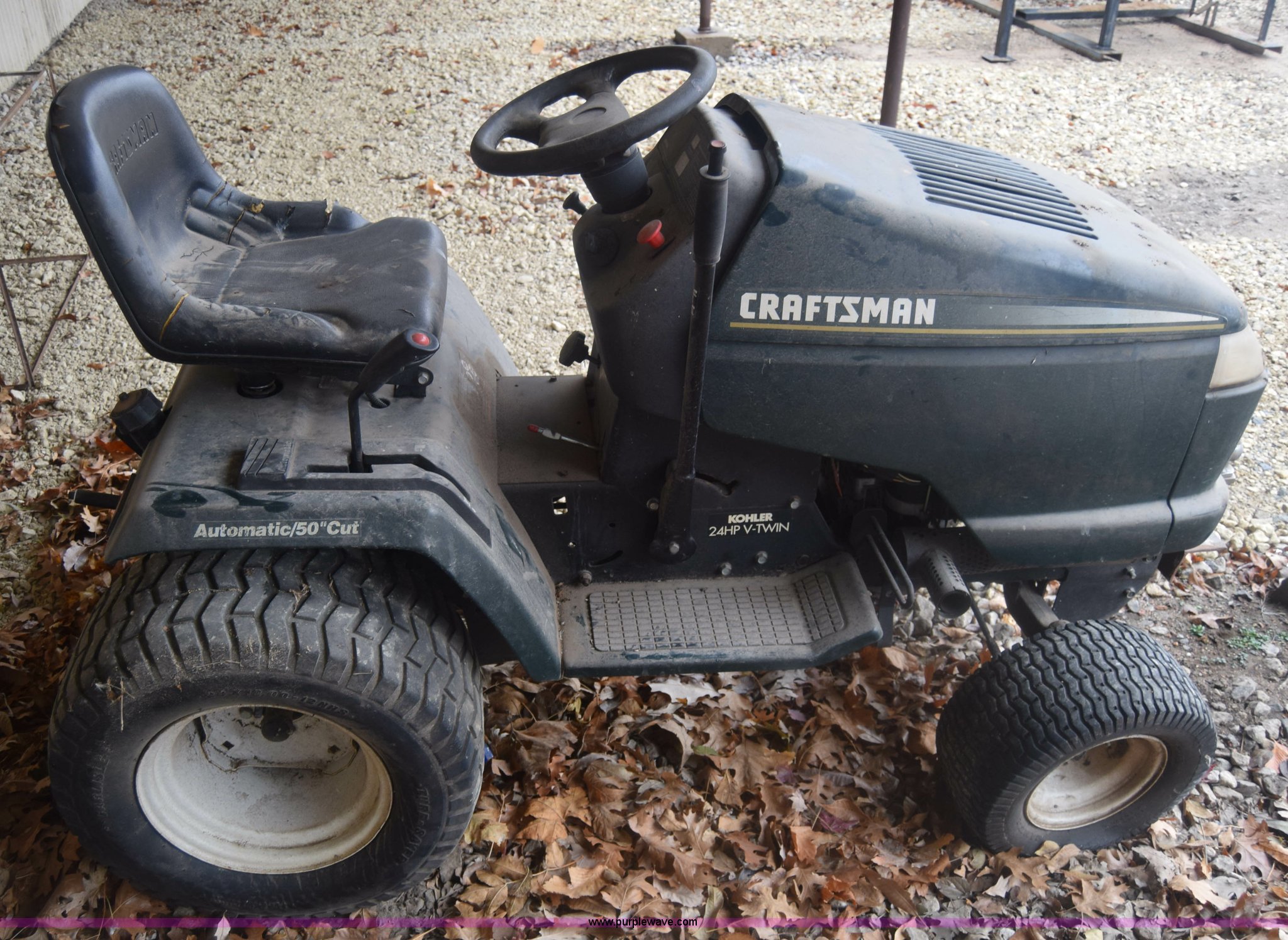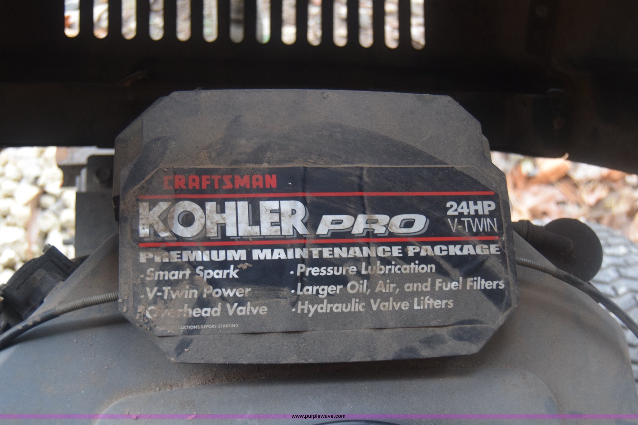 Purple Wave is selling a used Lawn and Garden in Kansas. This item is a Craftsman garden tractor with the following: 553 hours on meter, Kohler 24 HP V-twin gas engine, Model 917273220, Hydrostatic transmission, 16 x 7.50-8 front tires, 24 x 12.00-12 rear tires, No mowing deck