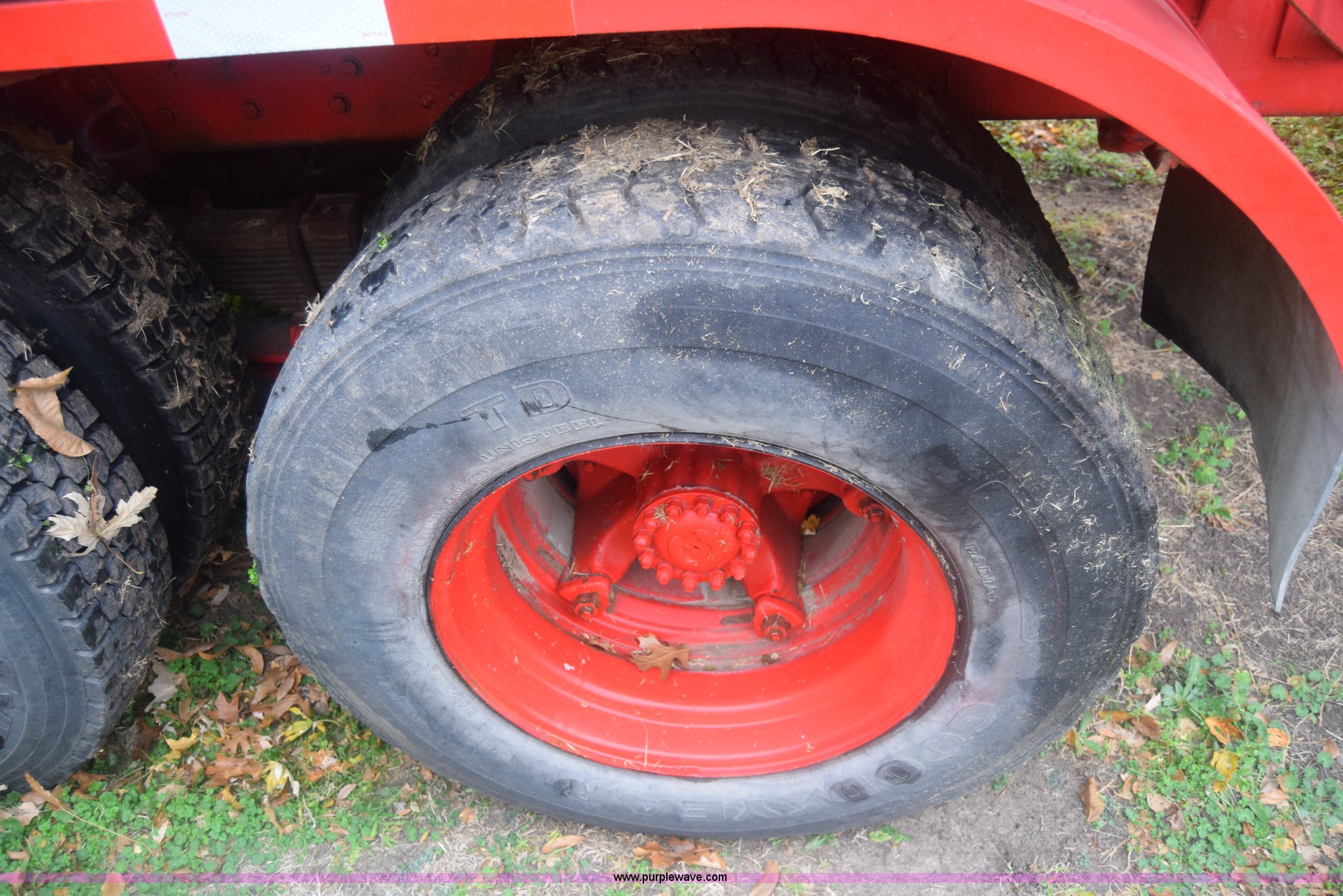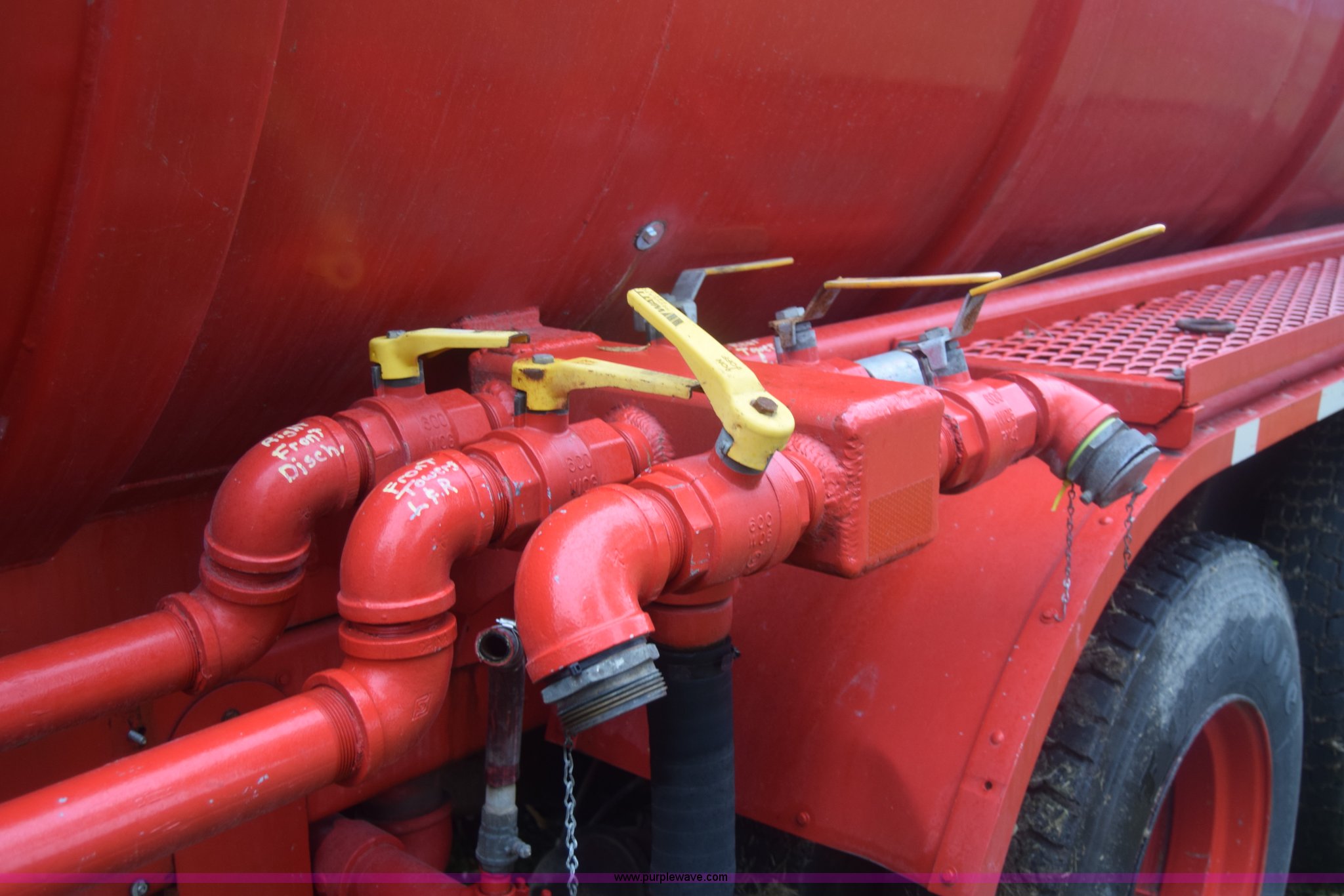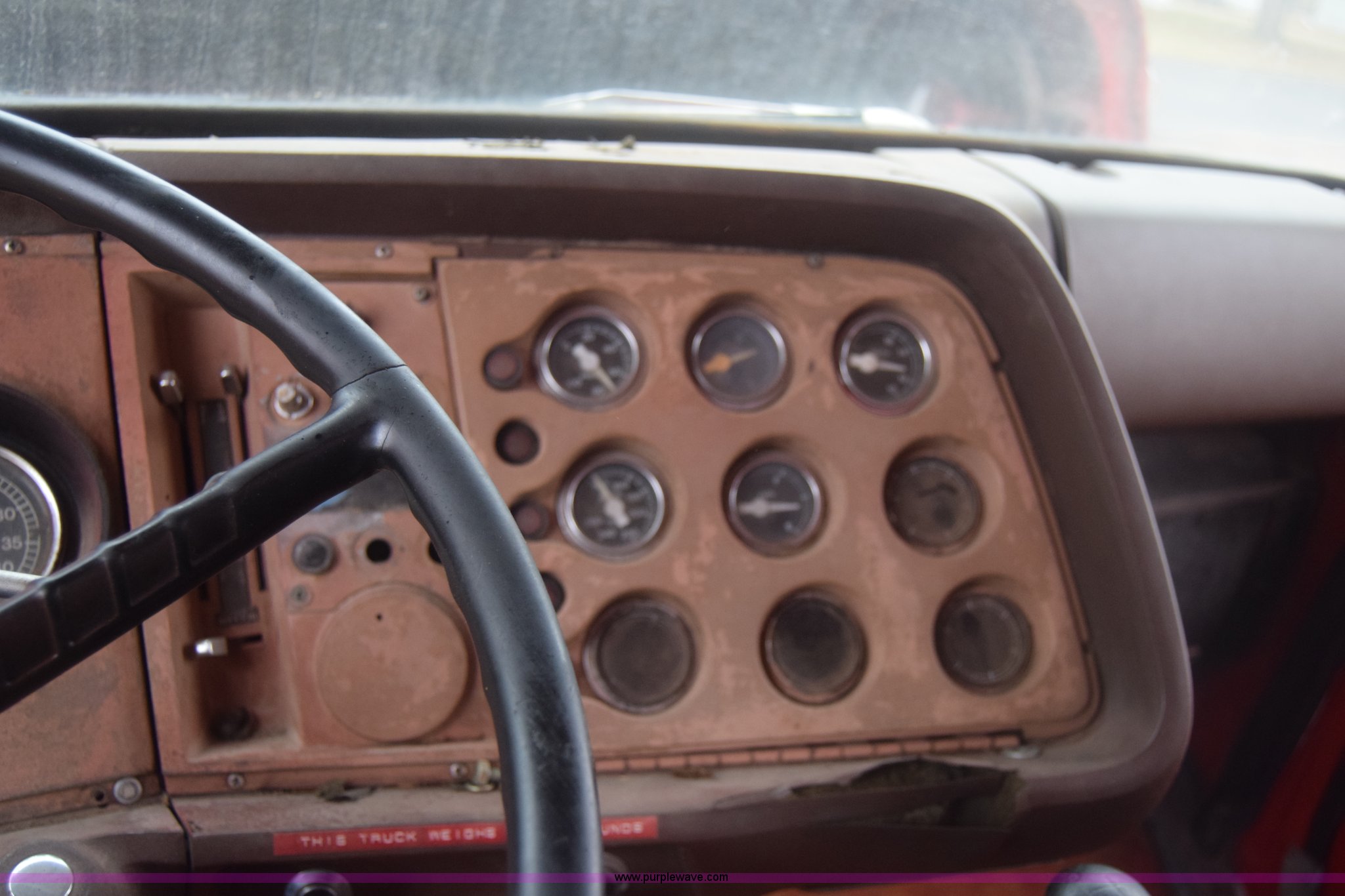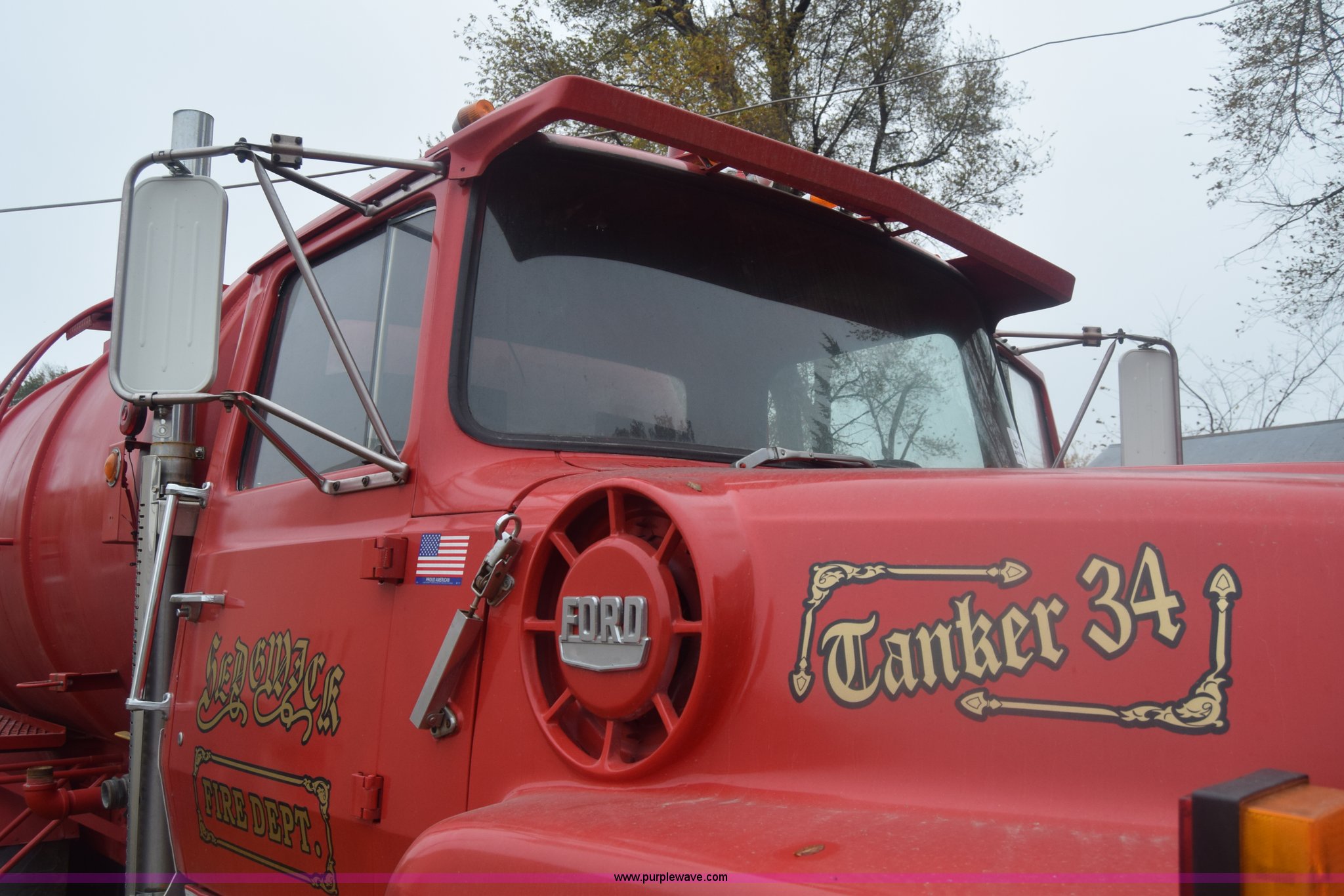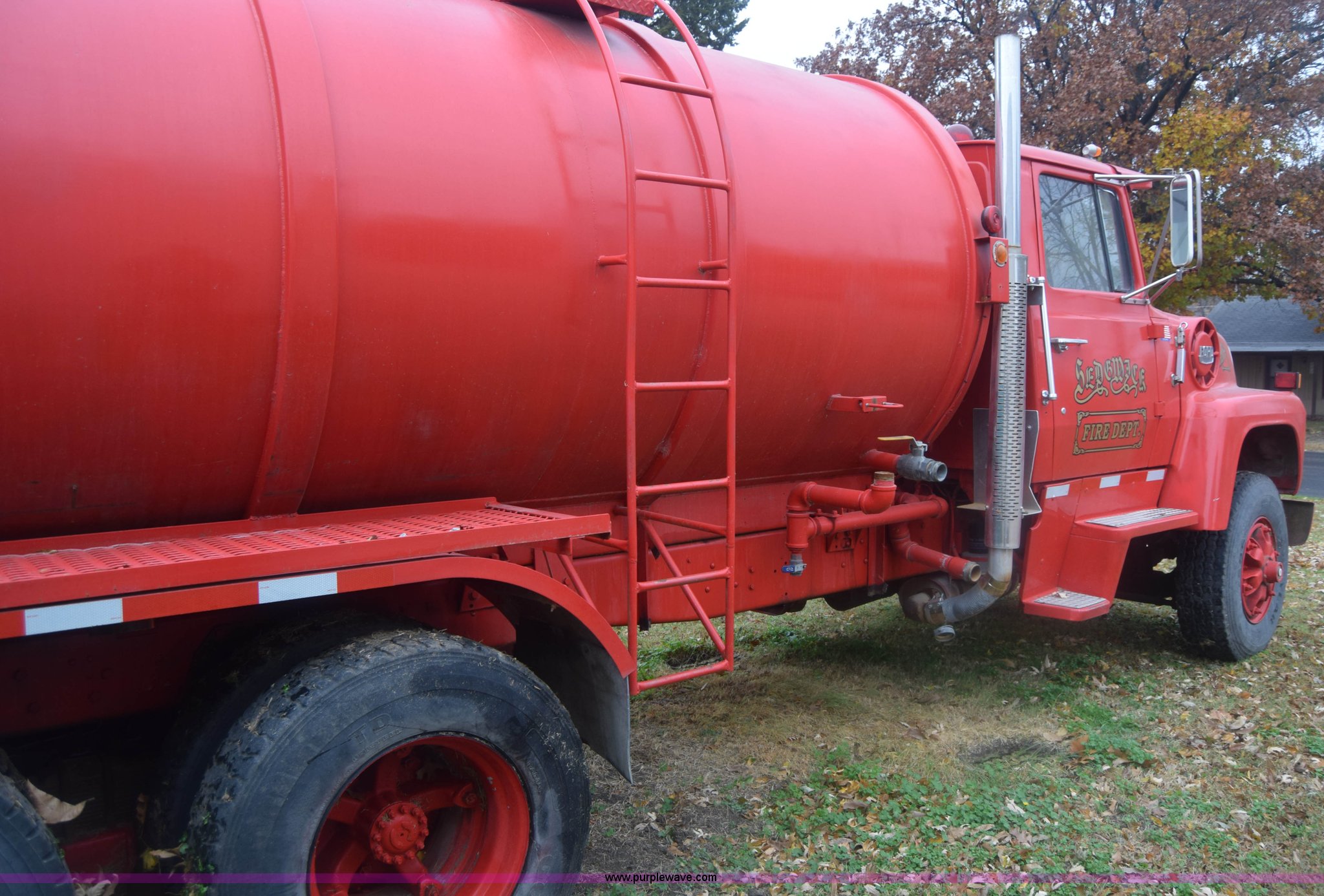 Purple Wave is selling a used Tank Truck or Water Truck in Kansas. This item is a 1975 Ford 8000 Water tanker truck with the following: 270,475 miles on odometer, Caterpillar V636 diesel engine, 5 speed manual transmission, 4,000 gallon tank, Tandem axle, Manual windows and locks, Vinyl seats, Torn, Chelsea PTO, Unknown operating condition, Pintle hitch, Air suspension, Air brakes, Non-operational, 75 gallon fuel tank, 315/80R22.5 front tires, 11/R22.5 rear tires, GVWR 46,000 lbs, Holes in tank