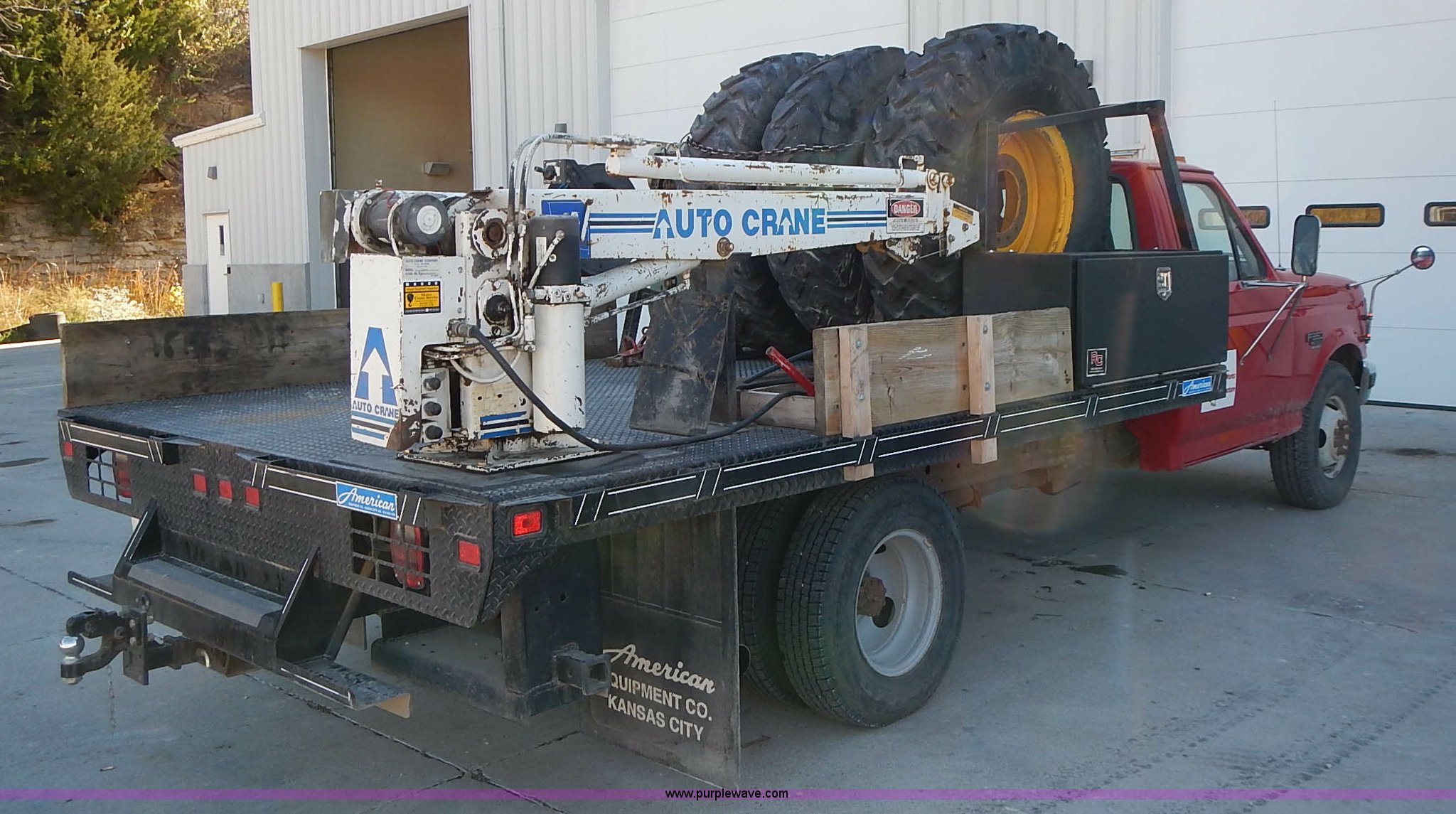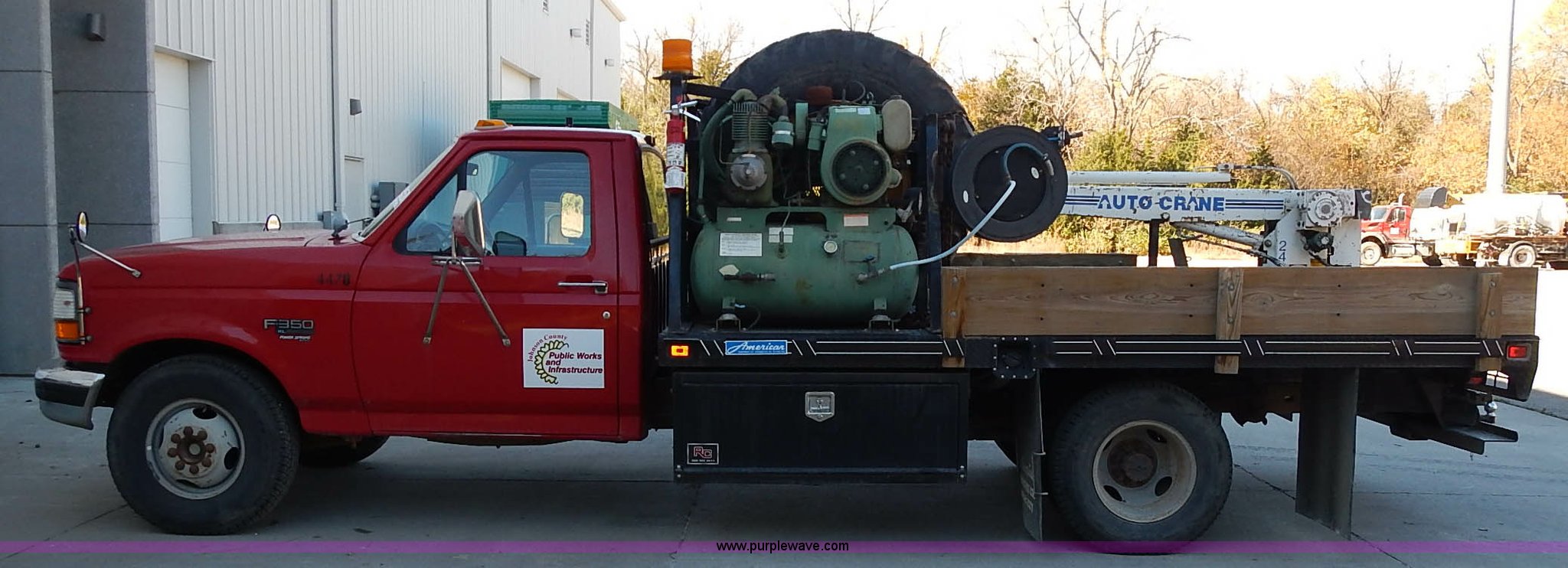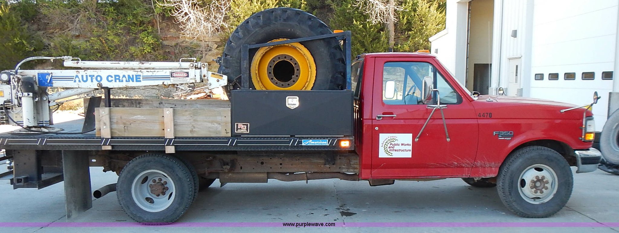 Purple Wave is selling a used 3/4 or 1 Ton Pickup or Van in Kansas. This item is a 1997 Ford F350 XL flatbed pickup truck with crane with the following: 85,435 miles on odometer, 7.3L V8 OHV 16V diesel engine, Automatic transmission, AC and heat, AM/FM, Manual windows and locks, Vinyl interior, Jensen 12'L x 8'2"W flatbed, Toolbox, Buckeye air compressor, Kohler gas engine, 10 HP, Hose reel, Auto Crane 2403-DR crane, 2,400 lbs maximum lift capacity, Remote, Receiver hitch, 215/85R16 tires, Bed contents and tires are not included, Bumper rusted, Decals will be removed prior to auction, Unit# FLT4470