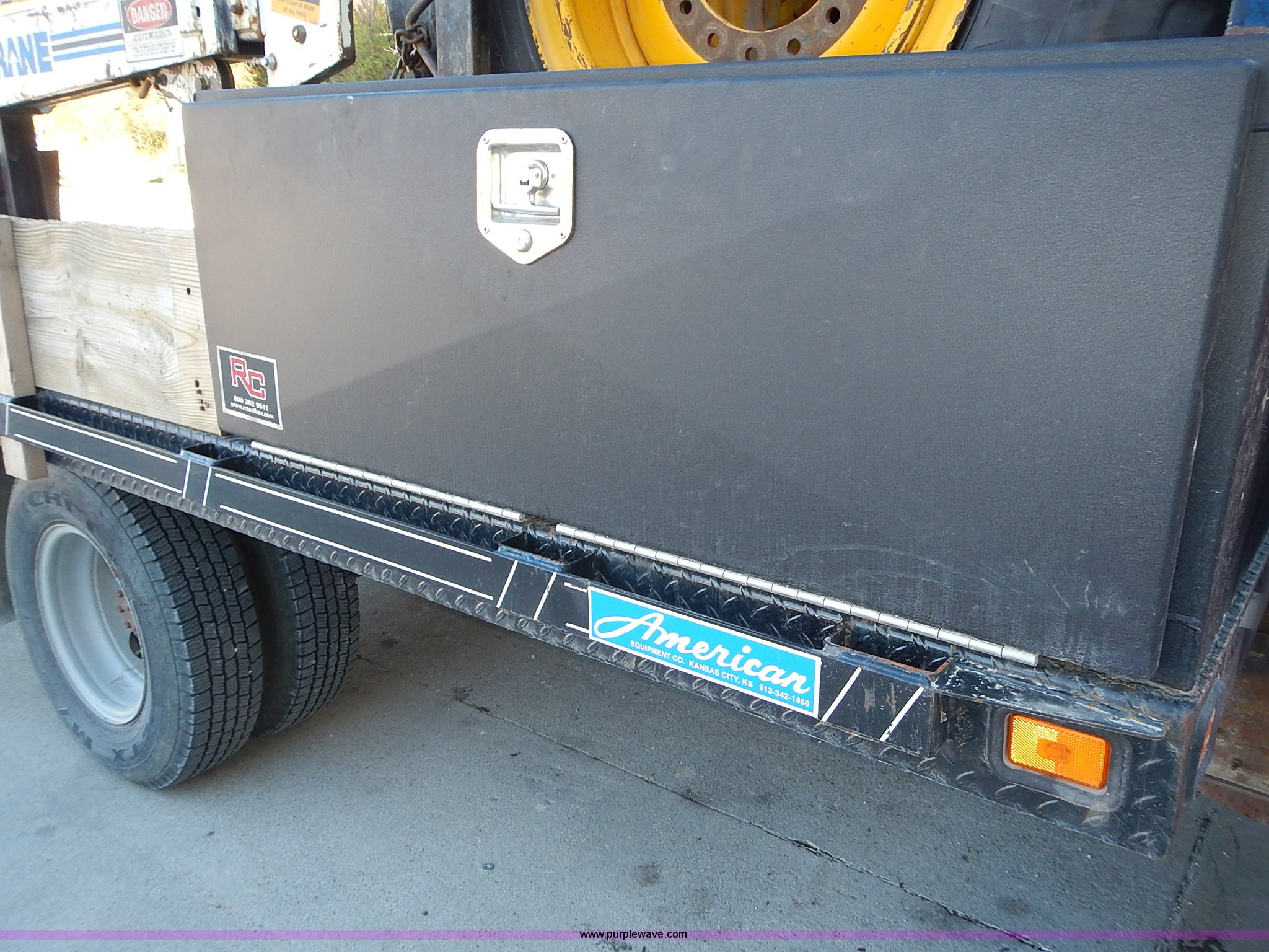 1997 Ford F350 XL flatbed pickup truck with crane. 85,435 miles on odometer, 7.3L V8 OHV 16V diesel engine, Automatic transmission, AC and heat, AM/FM, Manual windows and locks, Vinyl interior, Jensen 12'L x 8'2"W flatbed Toolbox, Buckeye air compressor Kohler gas engine 10 HP, Hose reel, Auto Crane 2403-DR crane 2,400 lbs maximum lift capacity, Remote, Receiver hitch, 215/85R16 tires, Bed contents and tires are not included, Bumper rusted, Decals will be removed prior to auction, Unit# FLT4470. 1FDKF37F3VEB74430. Johnson County. 19370 W. 159th. Olathe, KS 66062
