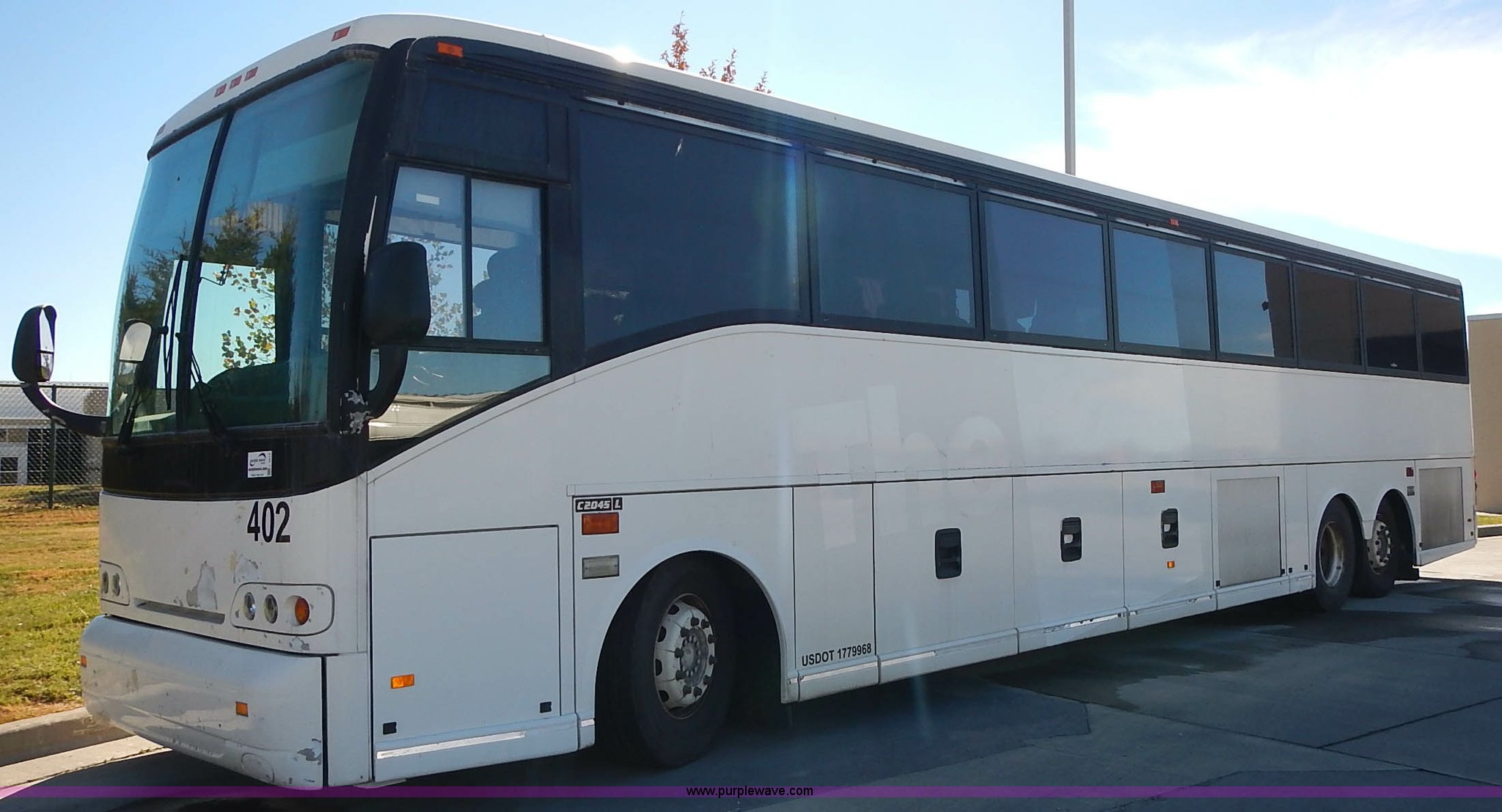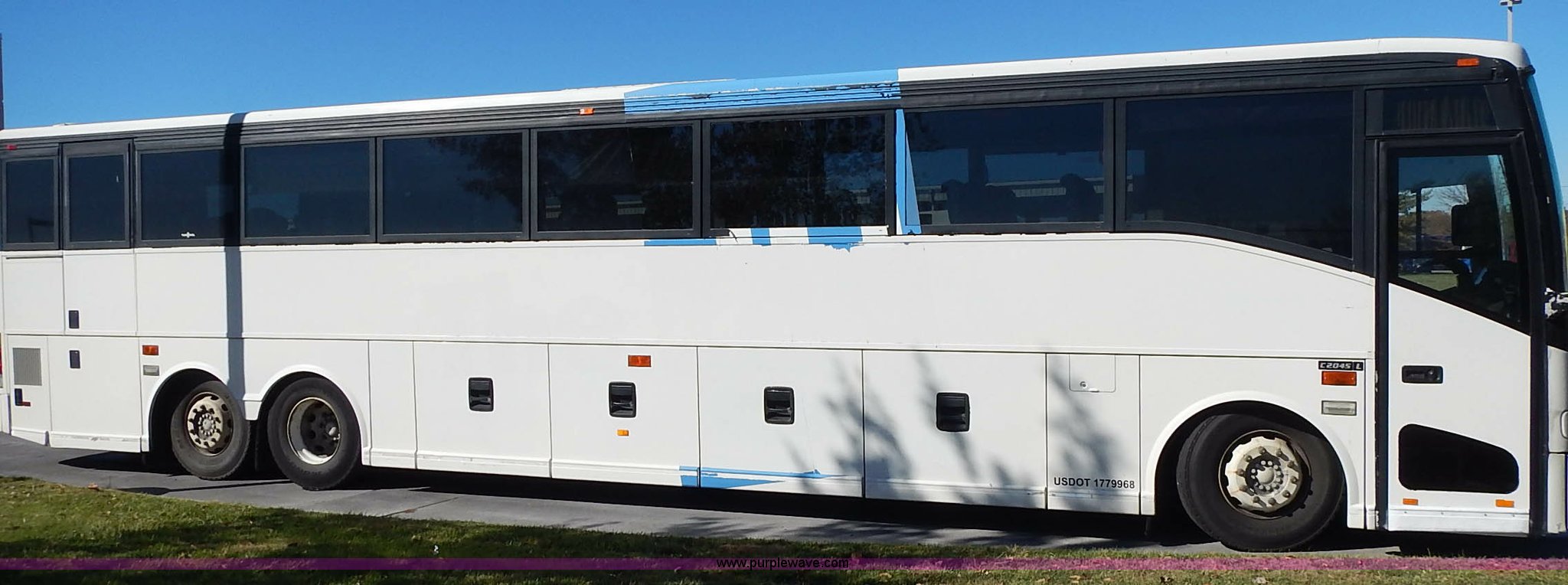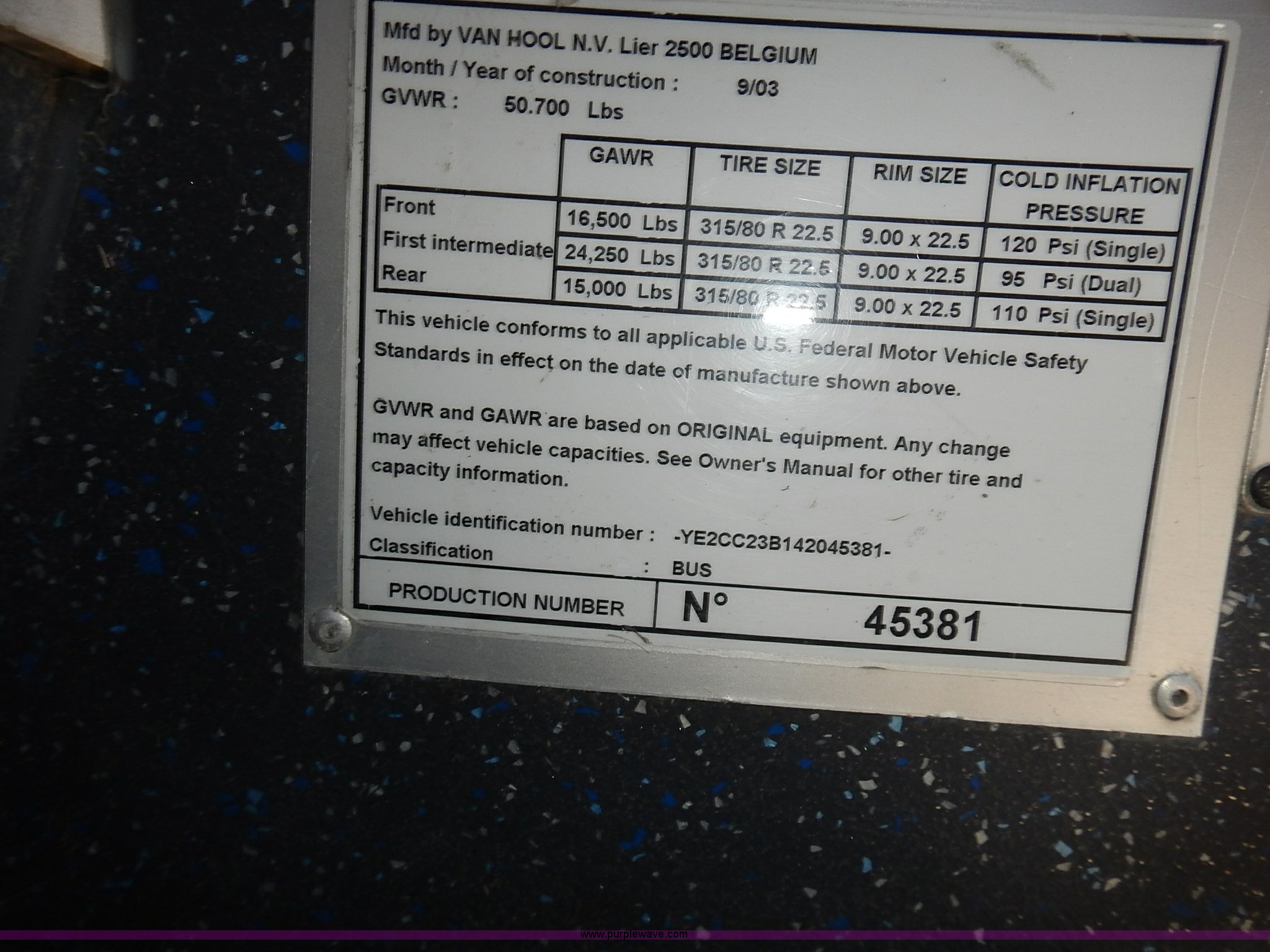 Purple Wave is selling a used Bus in Kansas. This item is a 2004 Van Hool C2045L coach bus with the following: 56,230 miles on odometer, 643,243 actual miles, Cummins ISM 10.8L L6 turbo diesel engine, Allison automatic transmission, AC and heat, AM/FM, Suspension seat, On-board restroom, Overhead storage, 57 passenger capacity, Ceiling and front emergency egress, Underside luggage storage, Television monitors, Air suspension, Air brakes, 315/80R22.5 front tires, 215/80R22.5 rear tires, GVWR 50,700 lbs, Roof water damage, Seats worn, Unit# JCT402