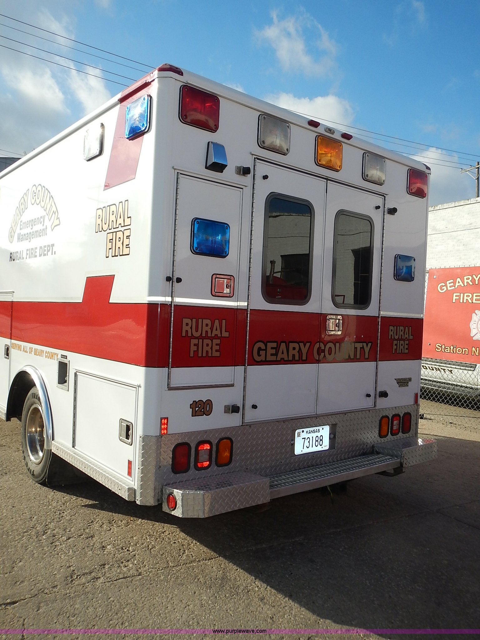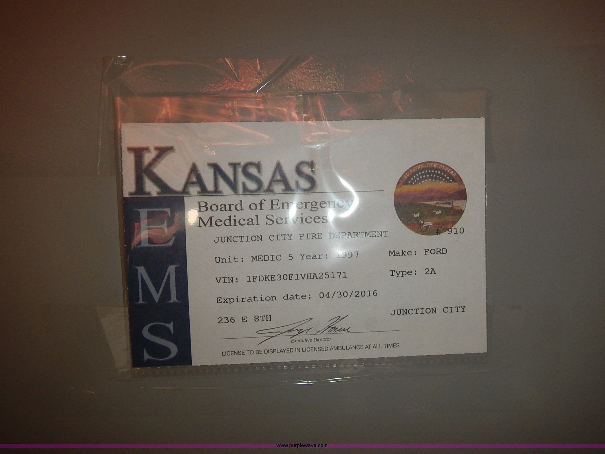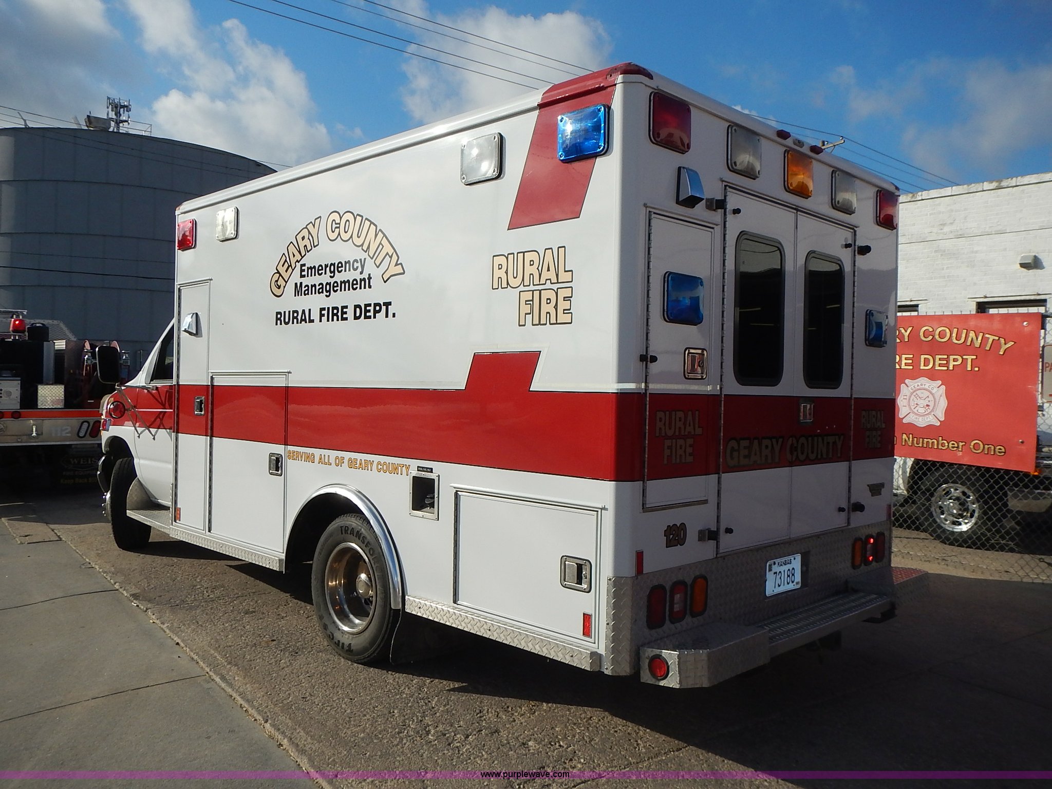 1997 Ford Econoline E350 ambulance. 157,296 miles on odometer, 7.3L V8 OHV 16V turbo diesel engine, Automatic transmission, AC and heat, Tilt, Cruise, AM/FM, Power windows and locks, Cloth/vinyl interior, Emergency lights and sirens, Whelen PA/siren controls, (2) oxygen hookups, Vacuum hookup, Receiver hitch, Trailer wiring, Firestone 225/75R16 tires, Decals will be removed prior to auction, No inverter, No rear interior power, Batteries replaced in October 2015, Lights, sirens, and controls will be removed if unit is purchased by a non-emergency agency, Unit# 120. 1FDKE30F1VHA25171. 236 E 8th. Junction City, KS 66441