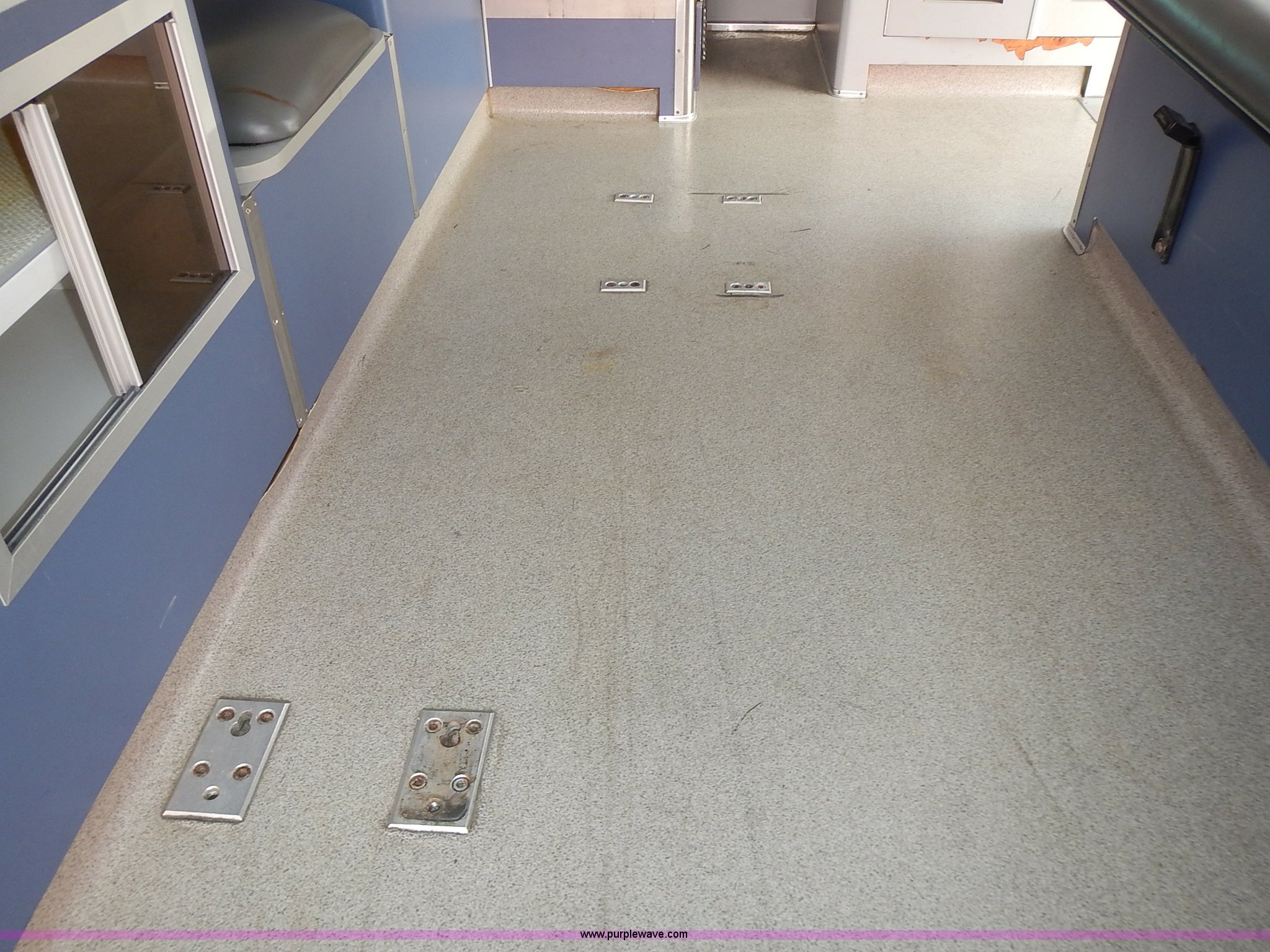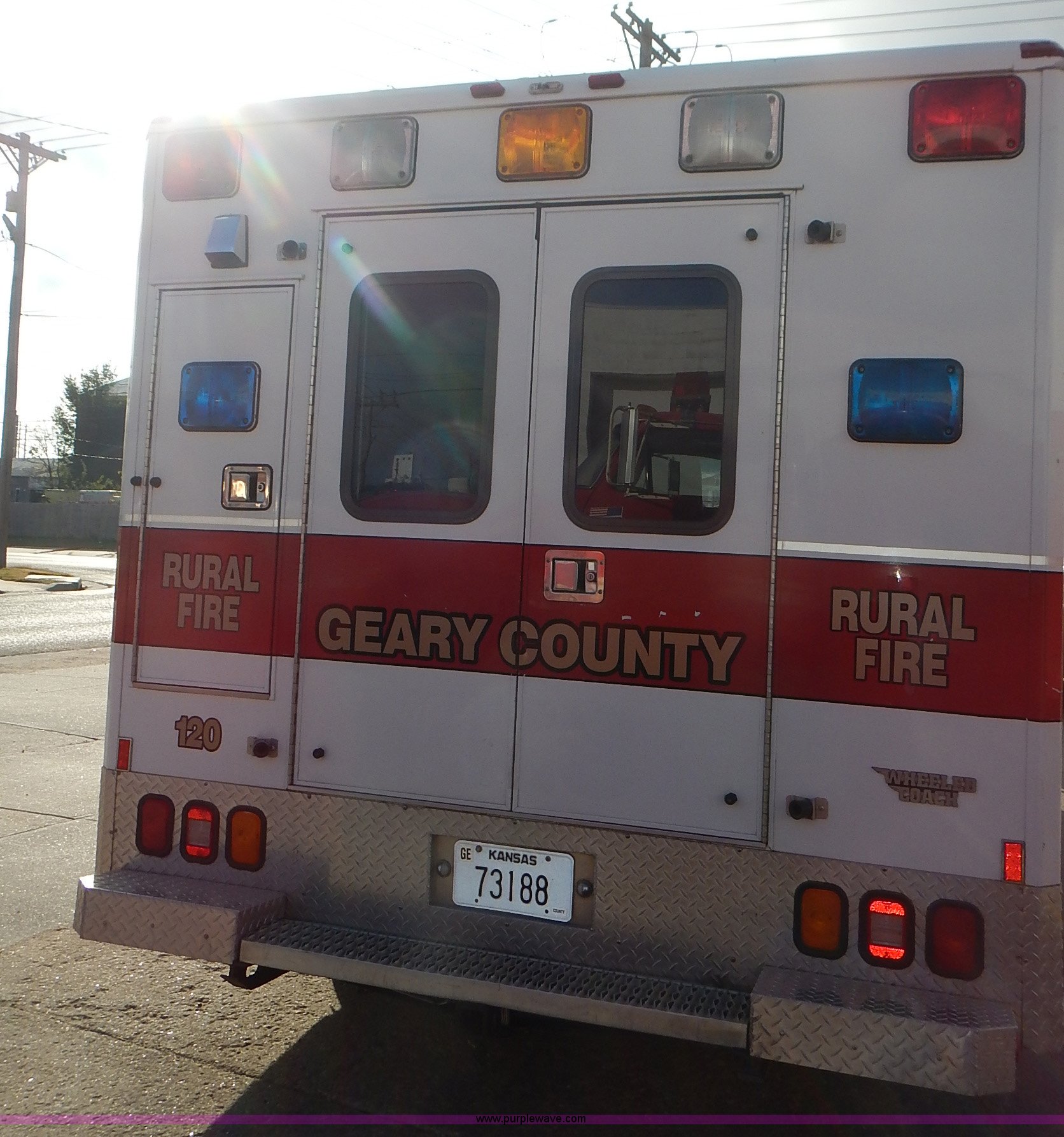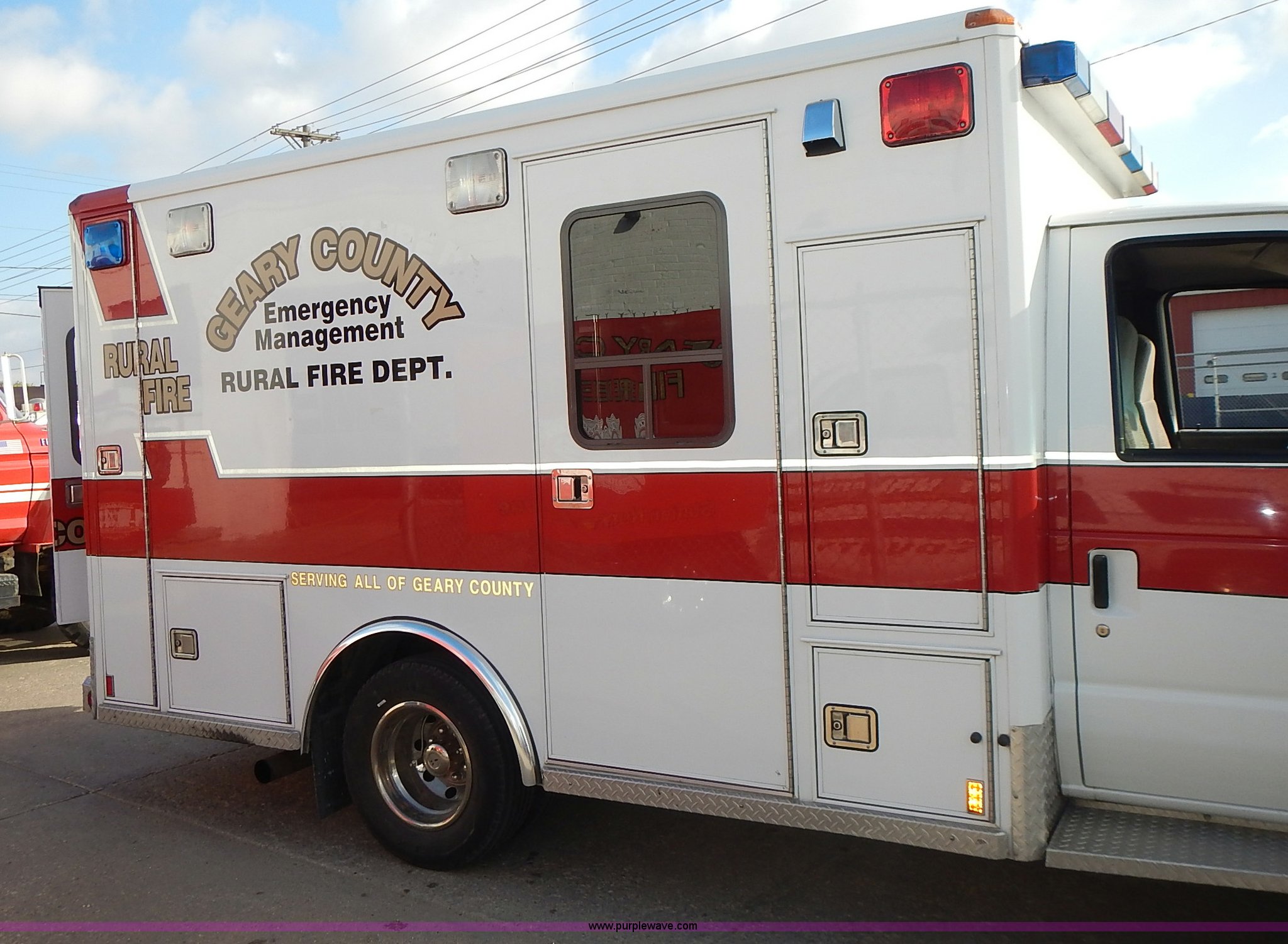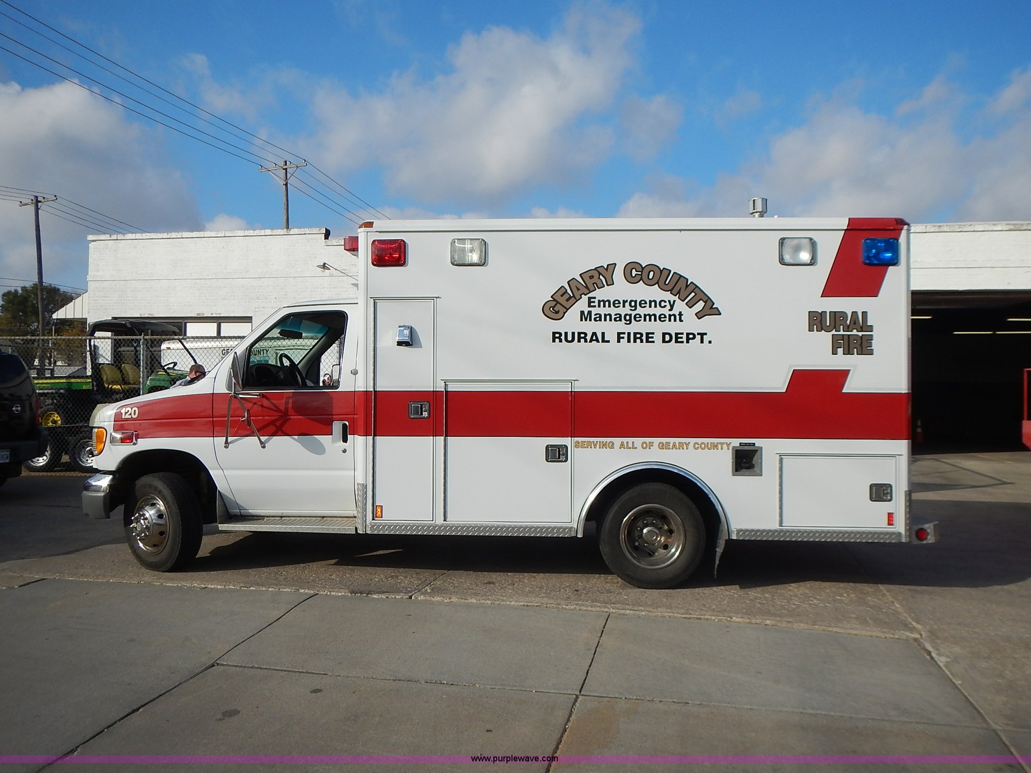 1997 Ford Econoline E350 ambulance. 157,296 miles on odometer, 7.3L V8 OHV 16V turbo diesel engine, Automatic transmission, AC and heat, Tilt, Cruise, AM/FM, Power windows and locks, Cloth/vinyl interior, Emergency lights and sirens, Whelen PA/siren controls, (2) oxygen hookups, Vacuum hookup, Receiver hitch, Trailer wiring, Firestone 225/75R16 tires, Decals will be removed prior to auction, No inverter, No rear interior power, Batteries replaced in October 2015, Lights, sirens, and controls will be removed if unit is purchased by a non-emergency agency, Unit# 120. 1FDKE30F1VHA25171. 236 E 8th. Junction City, KS 66441