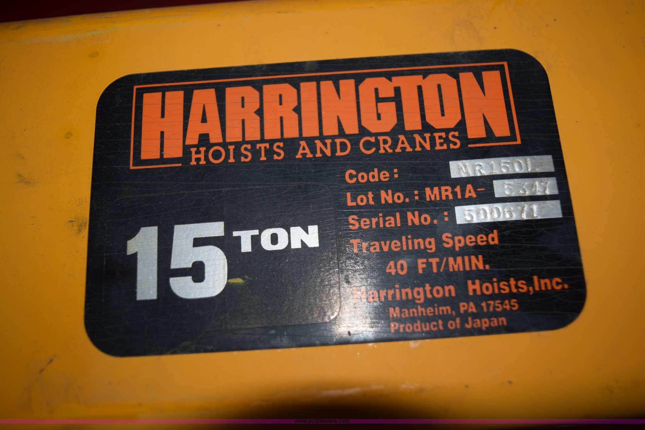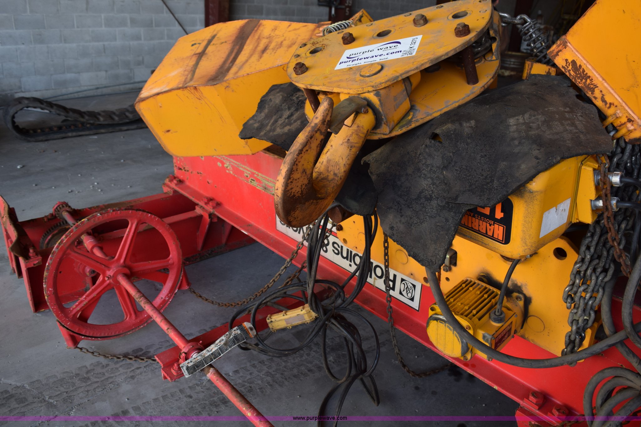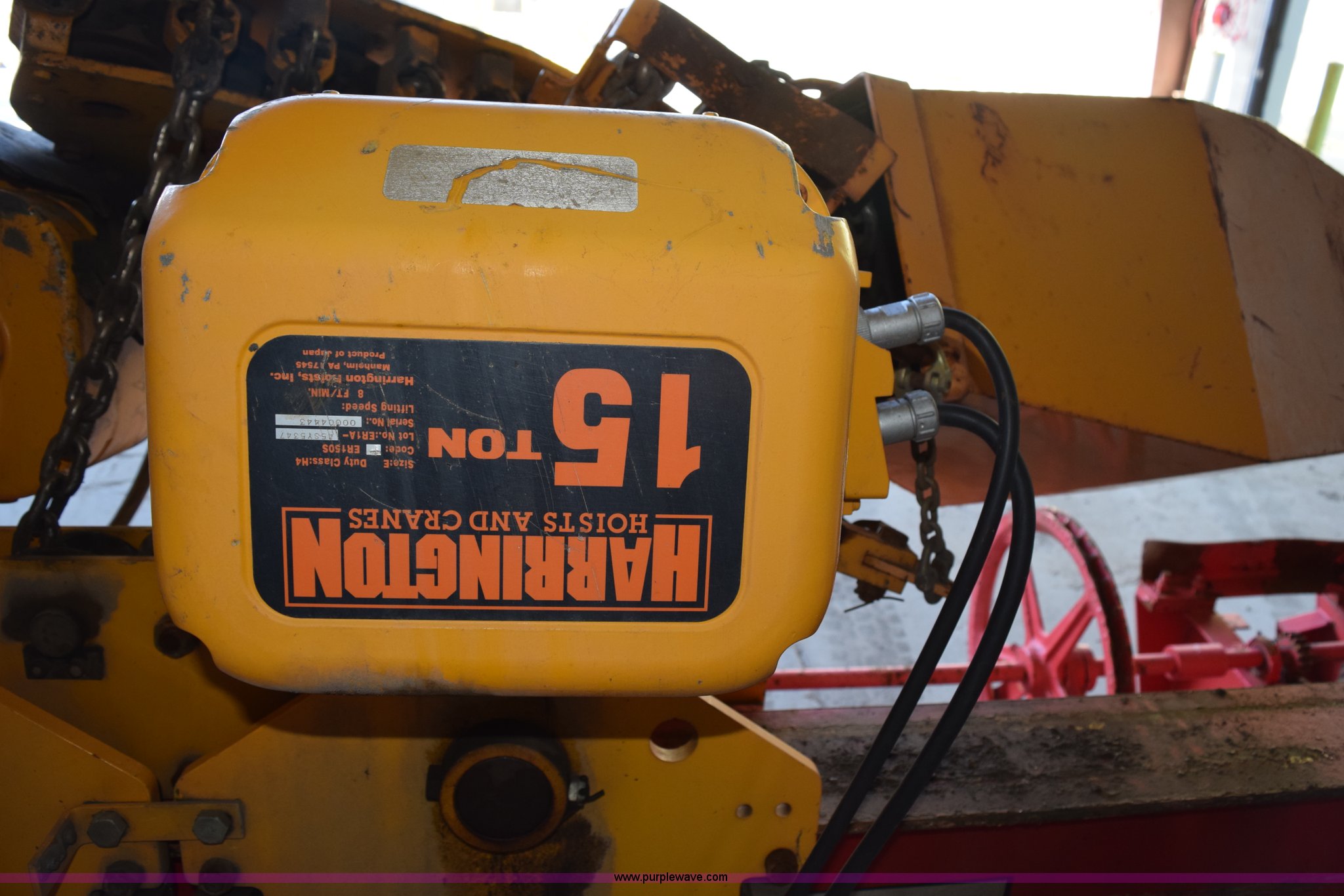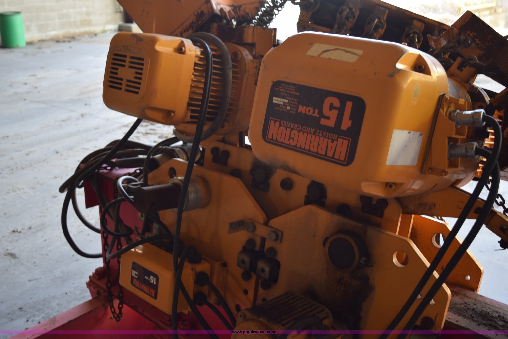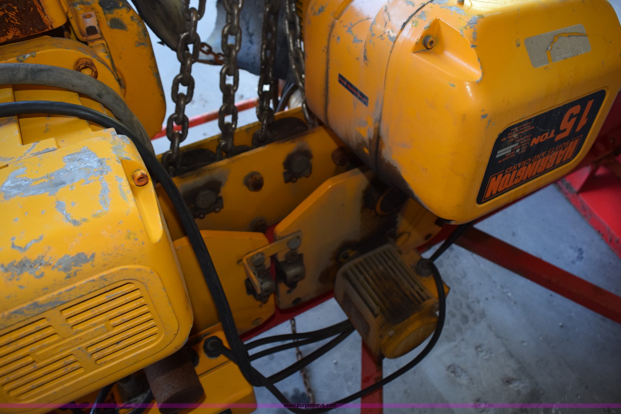 Purple Wave is selling a used Lifting and Rigging in Minnesota. This item is a Harrington crane hoist with the following: (2) 15 ton hoists, 116"W trolley, Operational when removed from service three years ago