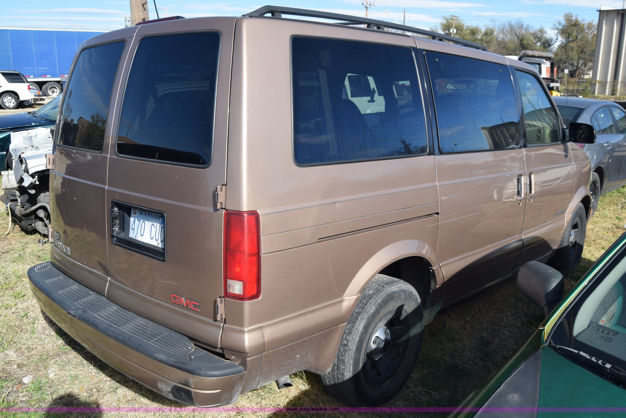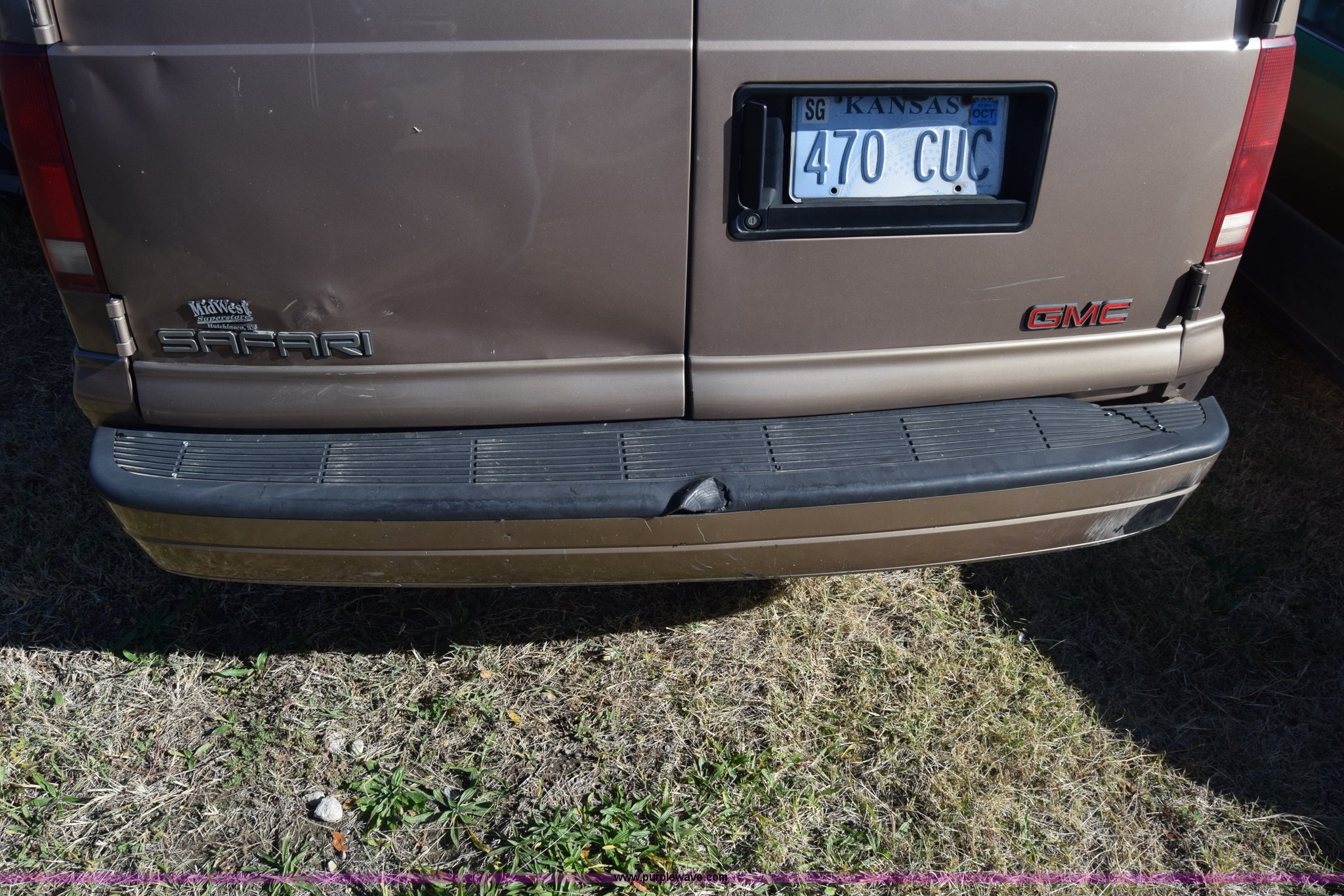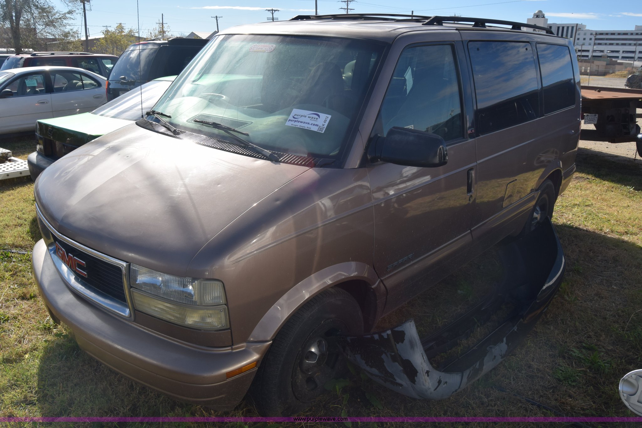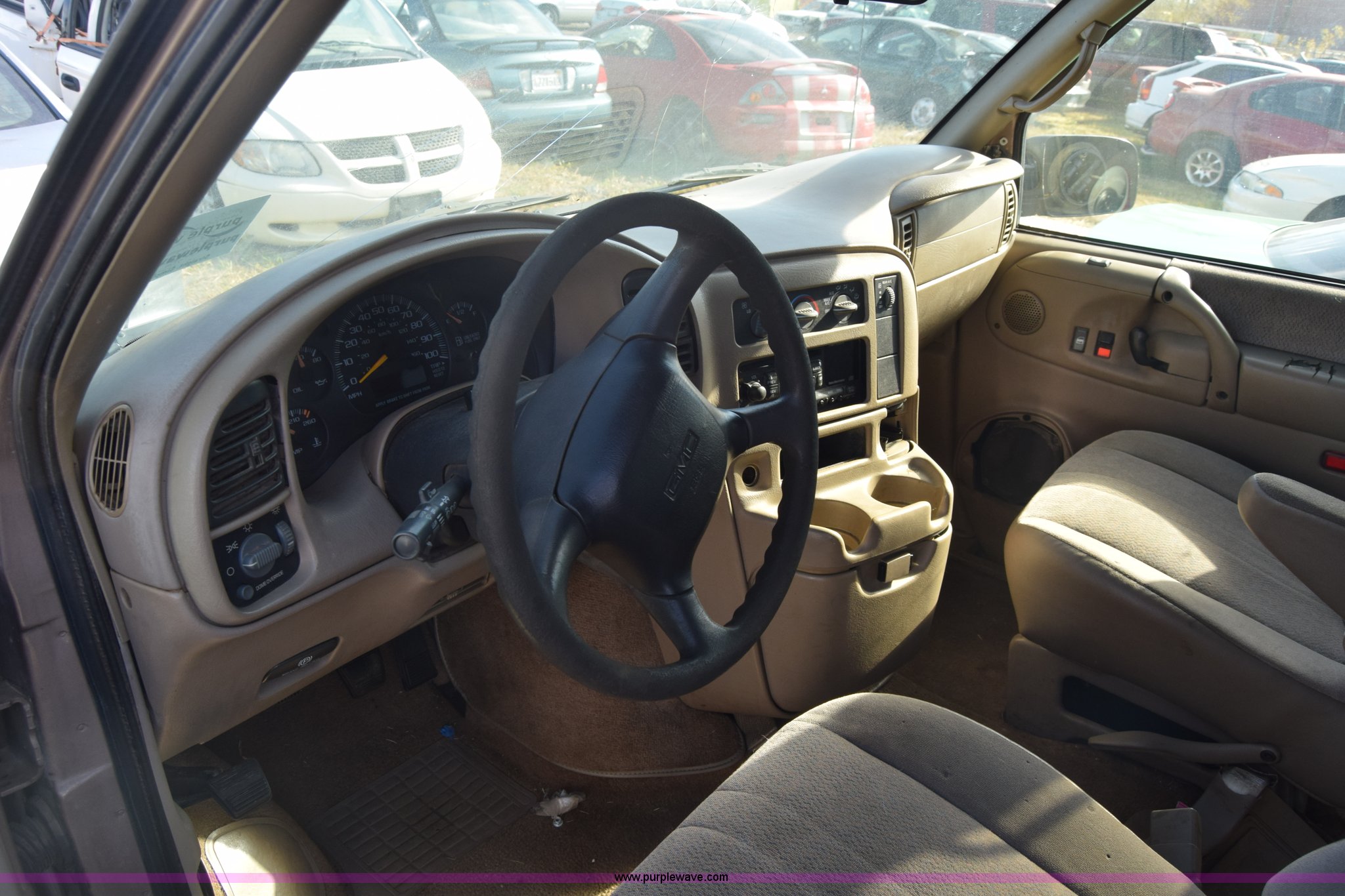 Purple Wave is selling a used Passenger Vehicle in Kansas. This item is a 2001 GMC Safari van with the following: Unknown miles on odometer, 4.3L V6 OHV 12V gas engine, Automatic transmission, AC and heat, Tilt, Cruise, AM/FM/CD, Power windows, locks, and mirrors, Cloth interior, 225/70R15 tires, Keys, Interior/exterior cosmetic damage, Dents and scratches, Windshield cracked, Unit# 15C51423