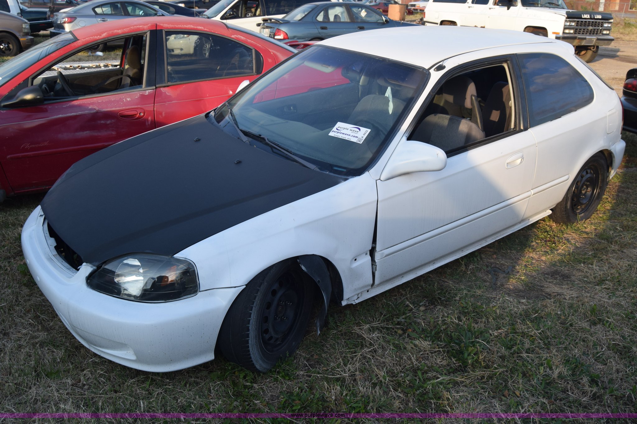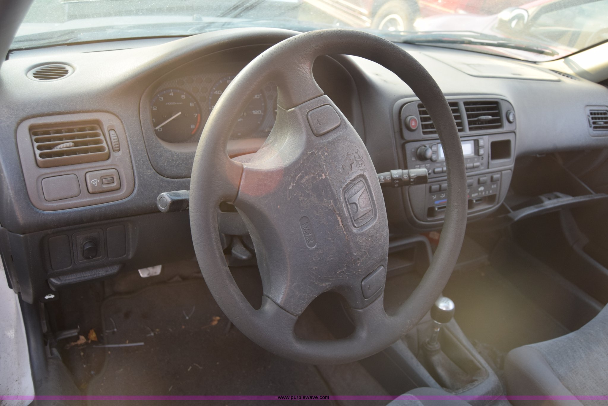 1998 Honda Civic DX. 166,878 miles on odometer, 1.6L L4 SOHC 16V gas engine, Five speed manual transmission, AC and heat, Tilt, Cruise, AM/FM, Manual windows and locks, Cloth interior, 185/65R14 tires, Interior/exterior cosmetic damage, Dents and scratches, Unit# 15C61569. Vehicle is abandoned. Condition and history are unknown. No additional information is available. Vehicle does not have keys unless notated otherwise in the item listing.. View City Of Wichita Terms for title acquisition and item removal requirements.. 2HGEJ6348WH103001. Interstate Wrecker Service. 1028 North Mosley. Wichita, KS 67214