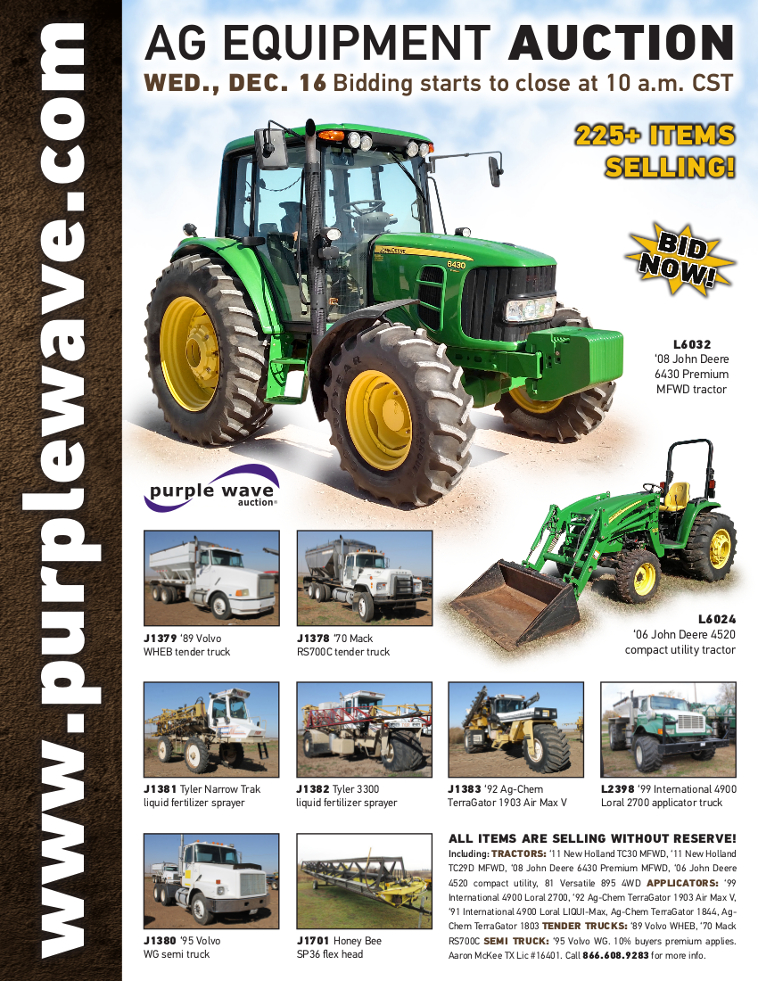 This auction is conducted by Purple Wave, Inc., whose home office is 825 Levee Drive, Manhattan, Kansas. Aaron McKee, Texas auctioneer license # 16401, operates Purple Wave, Inc. Complaints against us may be directed to the Texas Department of Licensing and Regulation, P.O. Box 12157, Austin, Texas 78711, (512) 463-6599. For additional required information, see the attached document.
