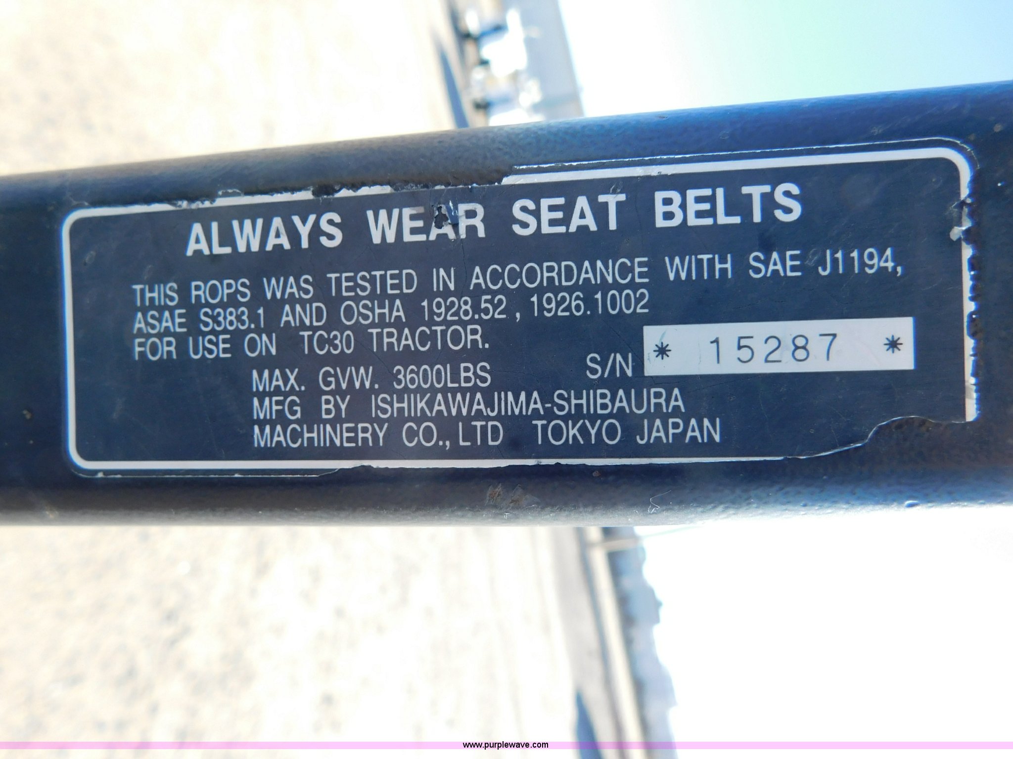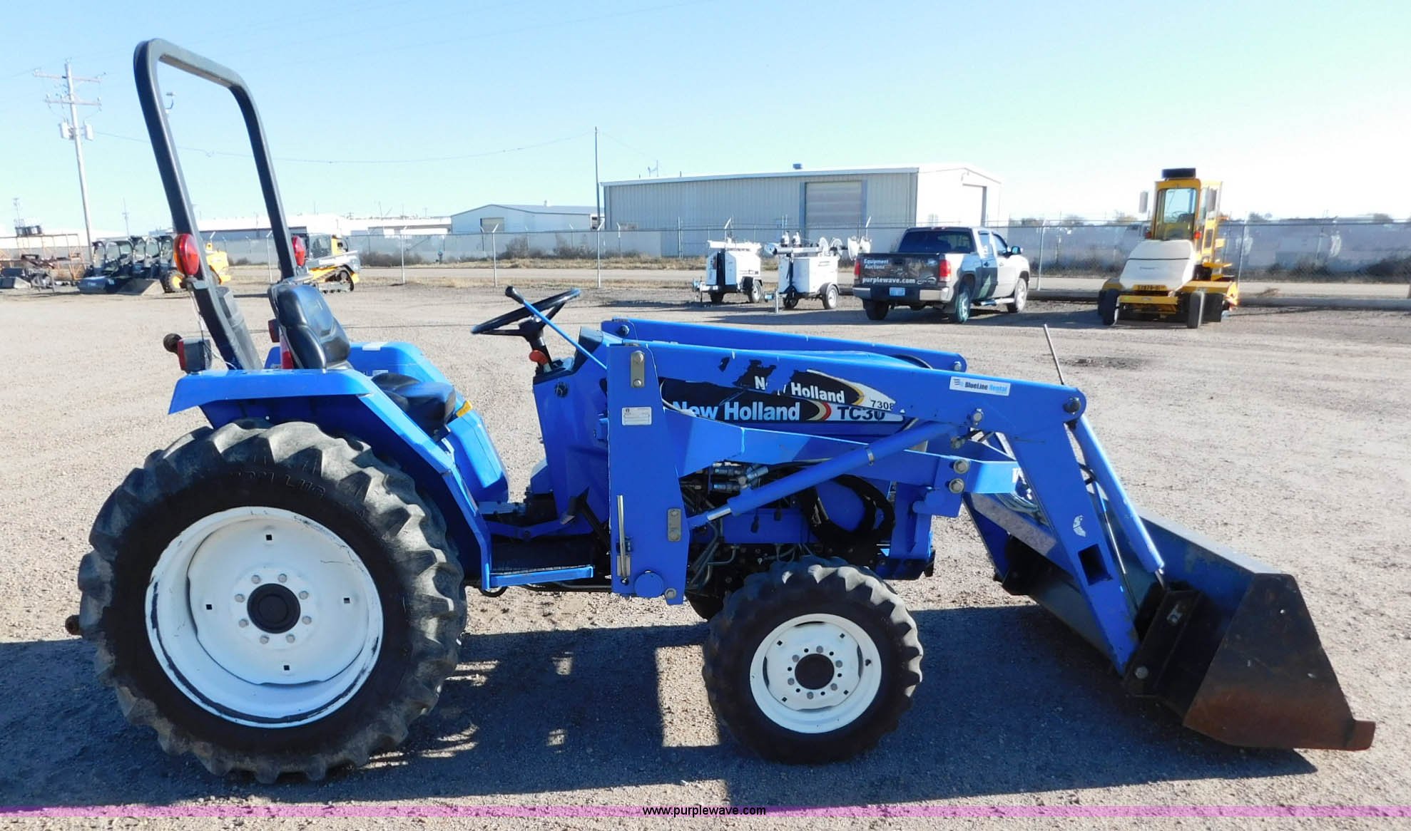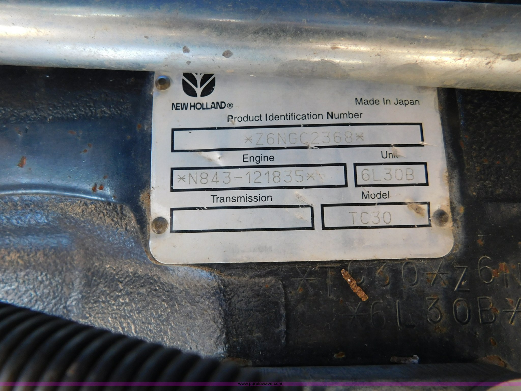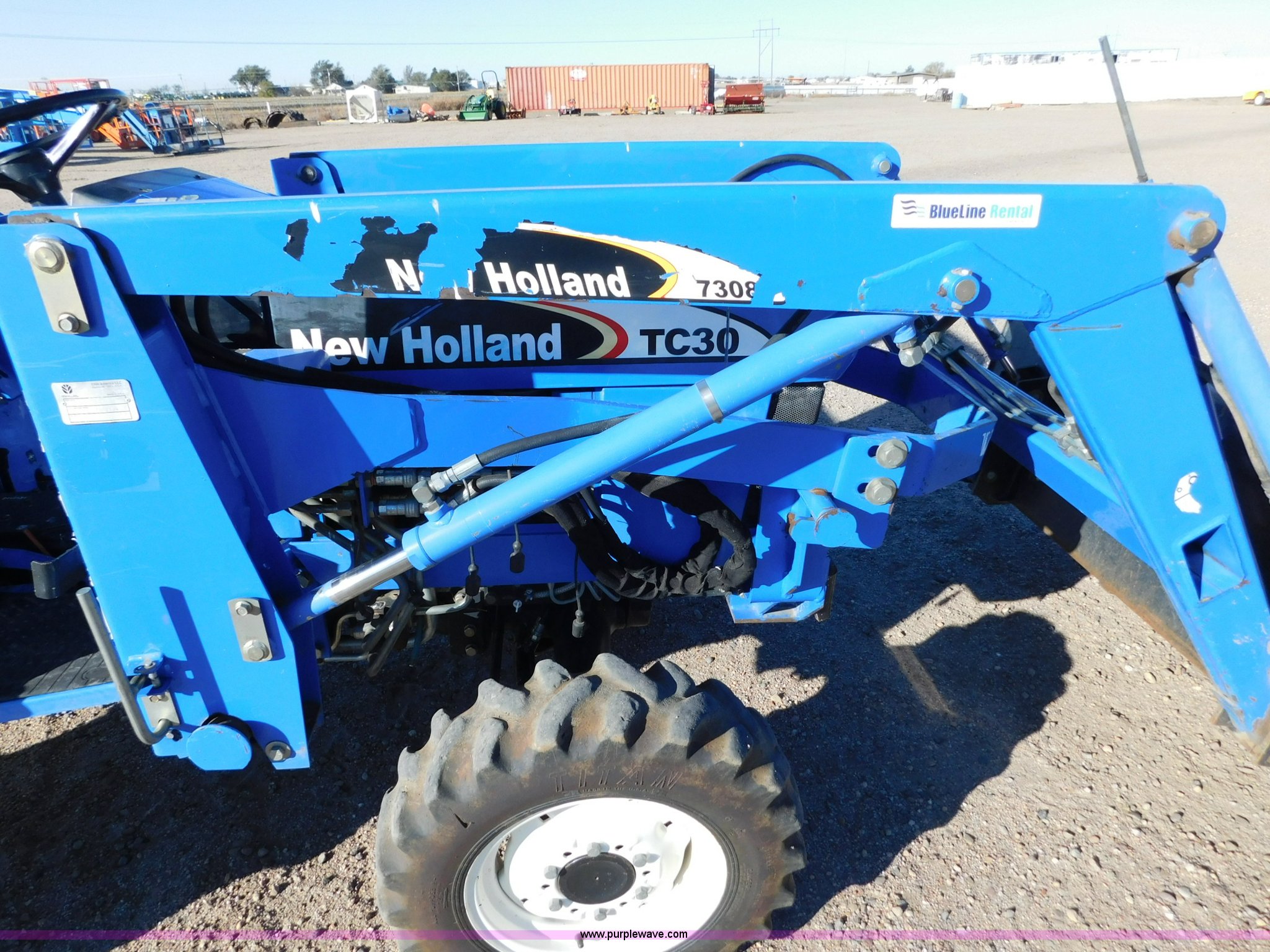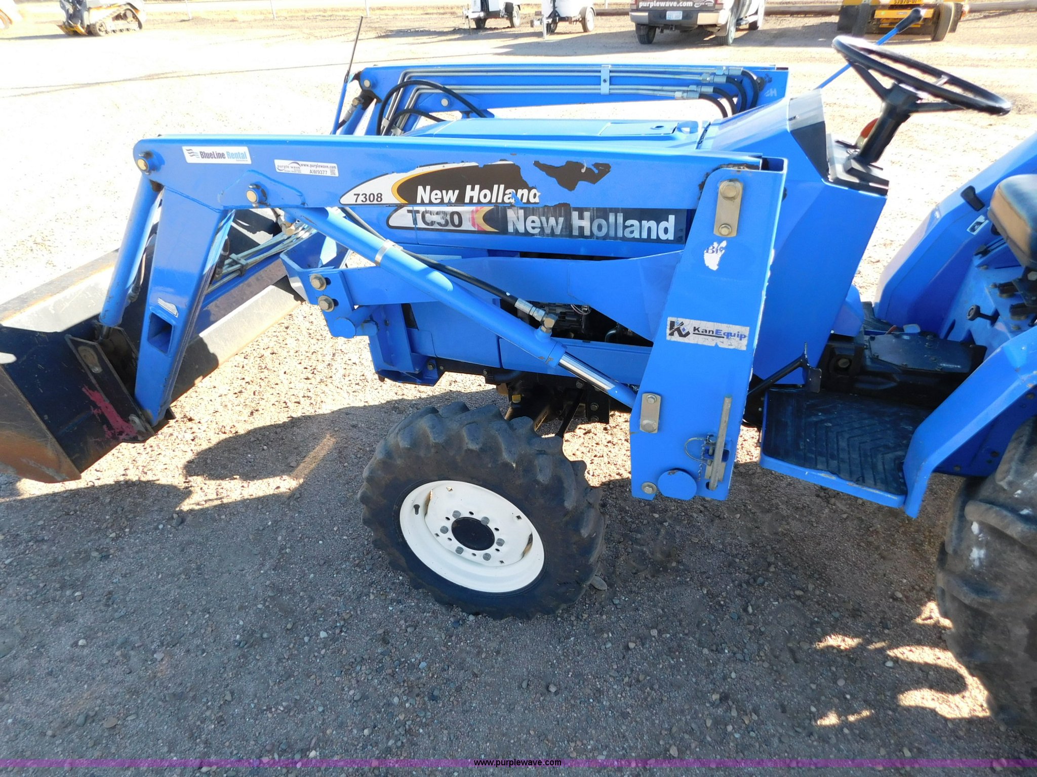 Purple Wave is selling a used Tractor in Kansas. This item is a 2011 New Holland TC30 MFWD tractor with the following: 1,531 hours on meter, Shibaura N843 1.496L three cylinder diesel engine, 30 HP, Serial 121835, Three range hydrostatic transmission, Suspension seat, New Holland 7308 loader, 60"W bucket, Quick attach, Joystick controls, Serial Y7B190444, Three point, Top link, 540 PTO, Mid PTO, Rear hydraulic remote set, Undercarriage tie down hook, 7-14 front tires, 11.2-24 rear tires, Paint damage, Front left tire cut, Left side fender damage, Serial Z6NGC2368