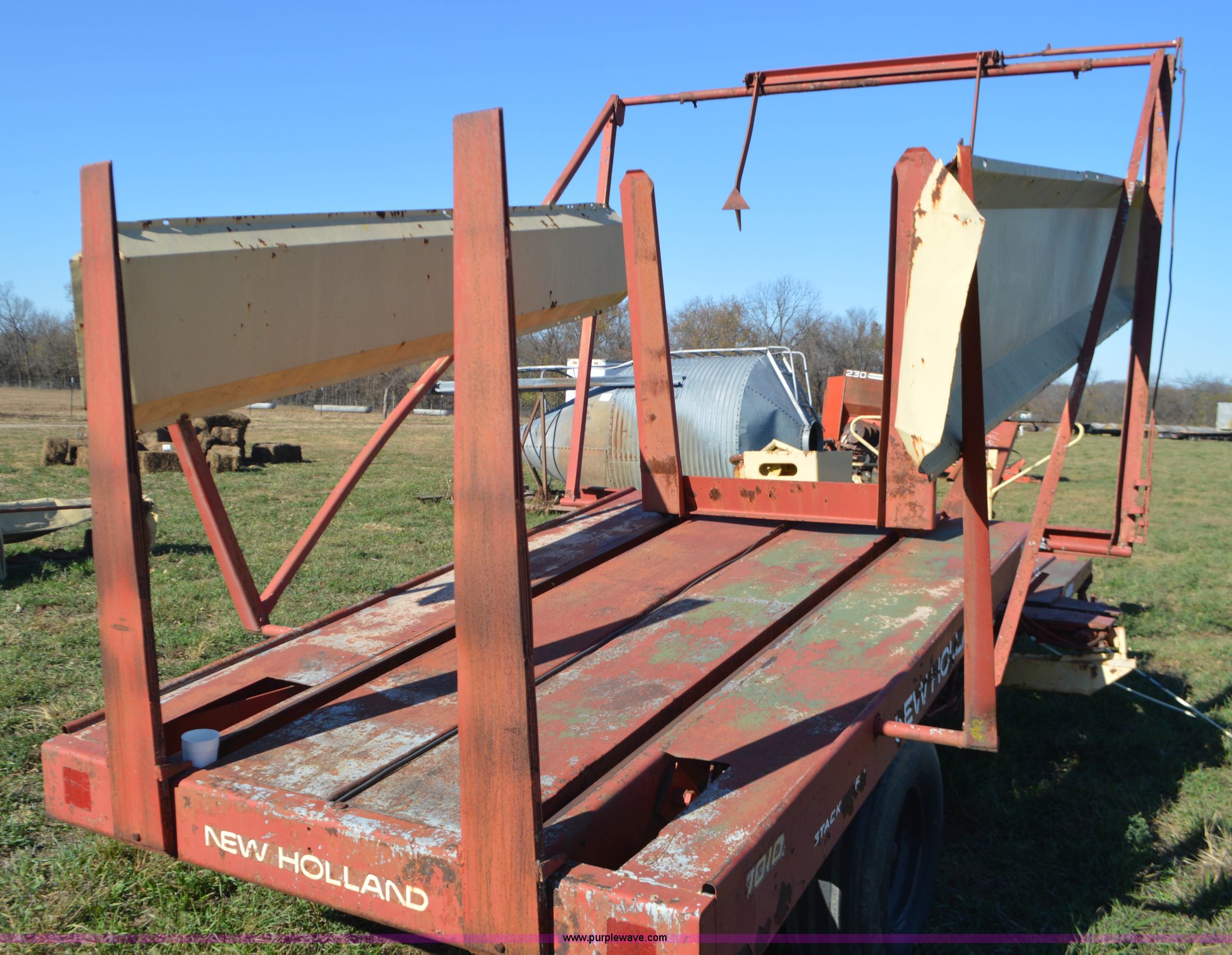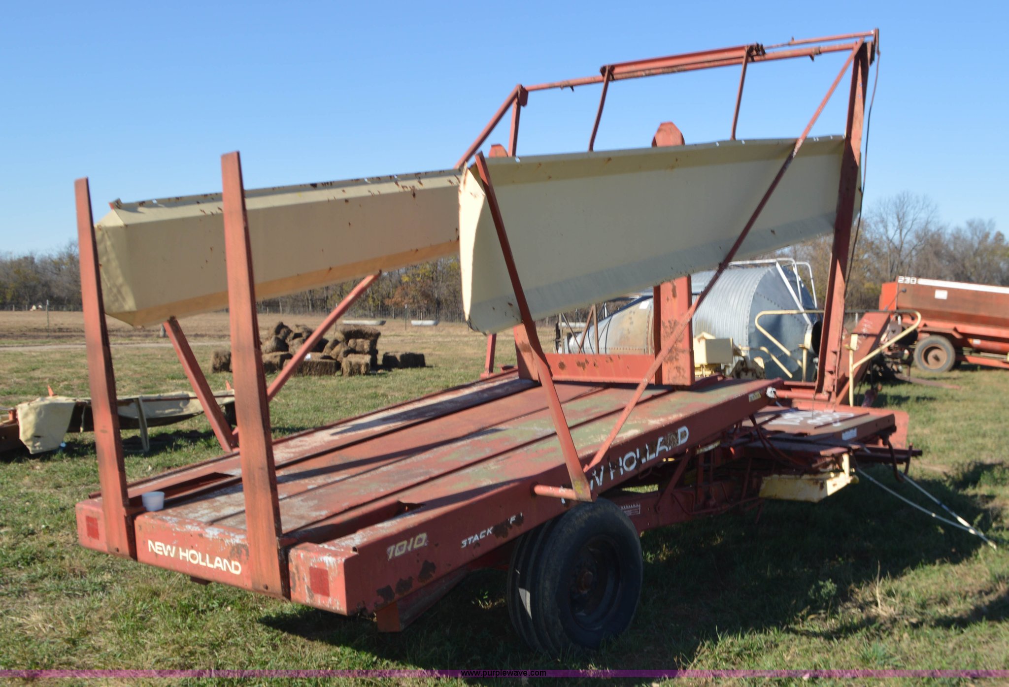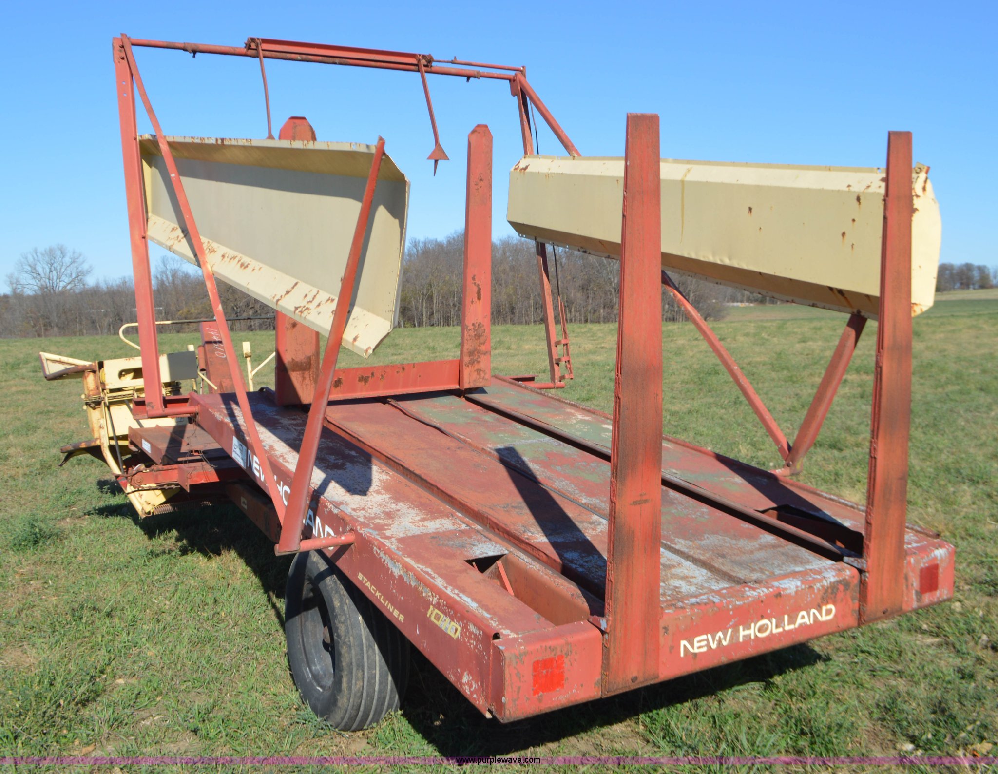 Purple Wave is selling a used Hay Handling in Missouri. This item is a New Holland 1010 Stackliner bale wagon with the following: 540 PTO, Manual jack, Pin hitch, 11-15 tires