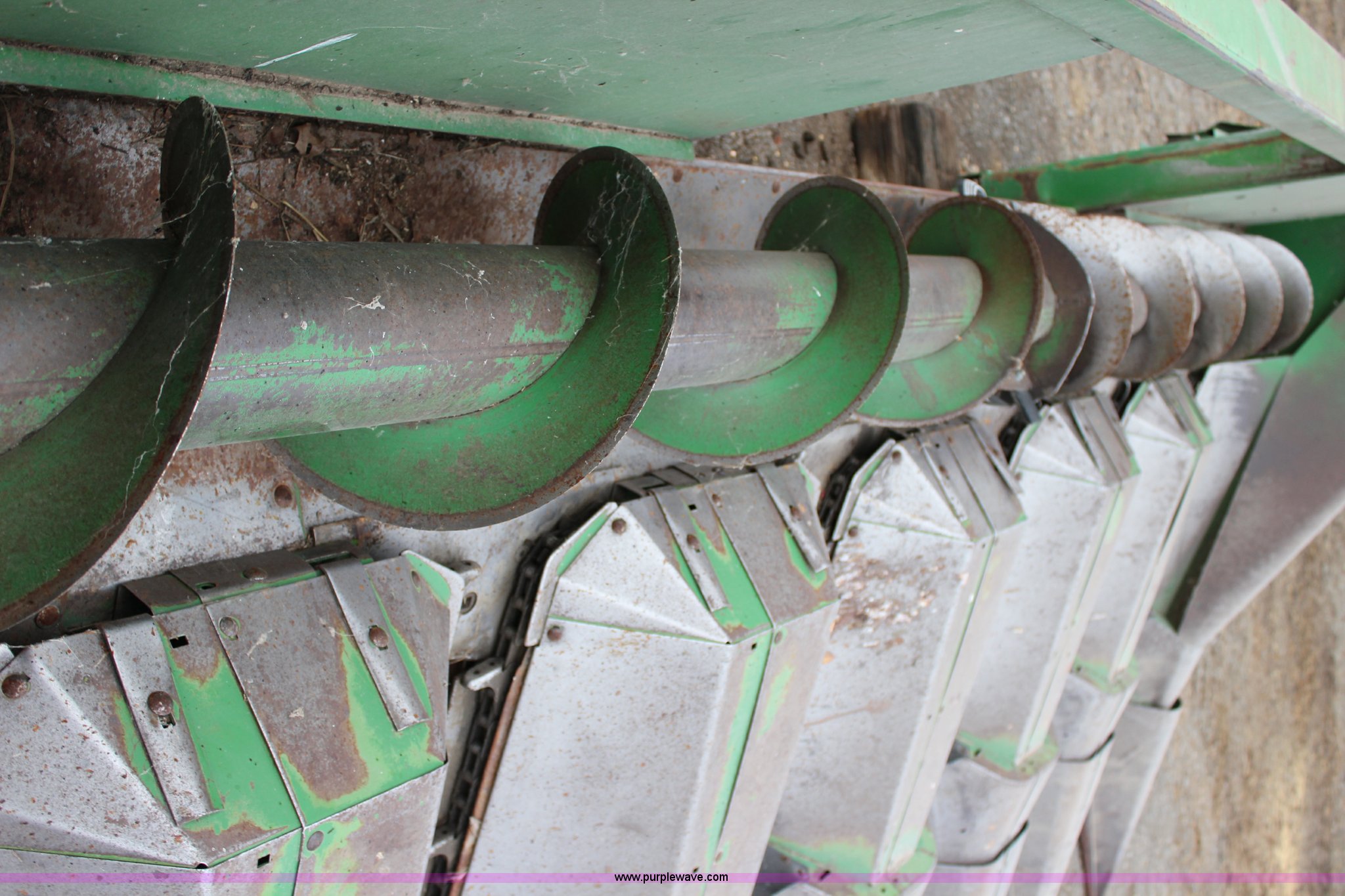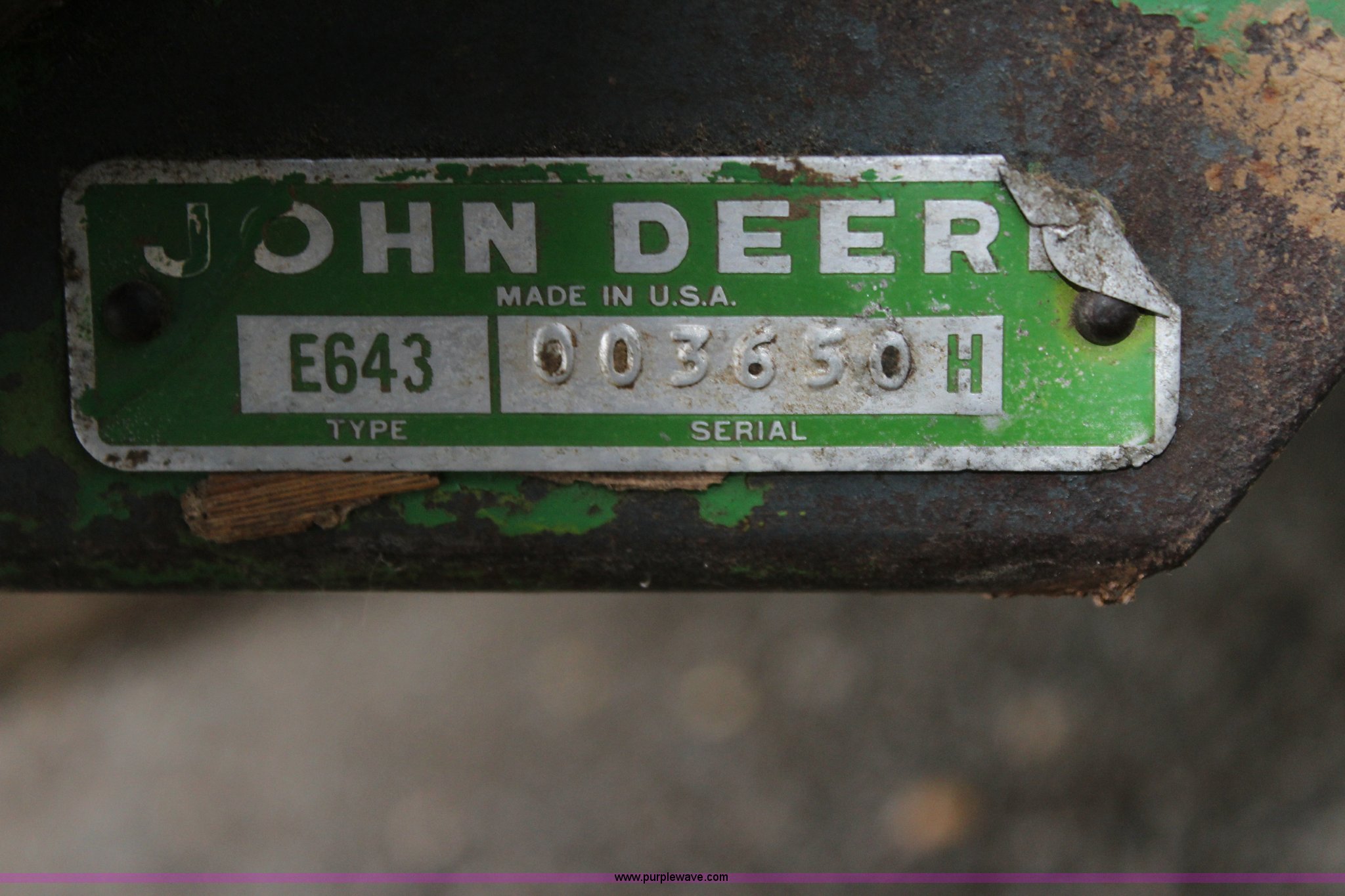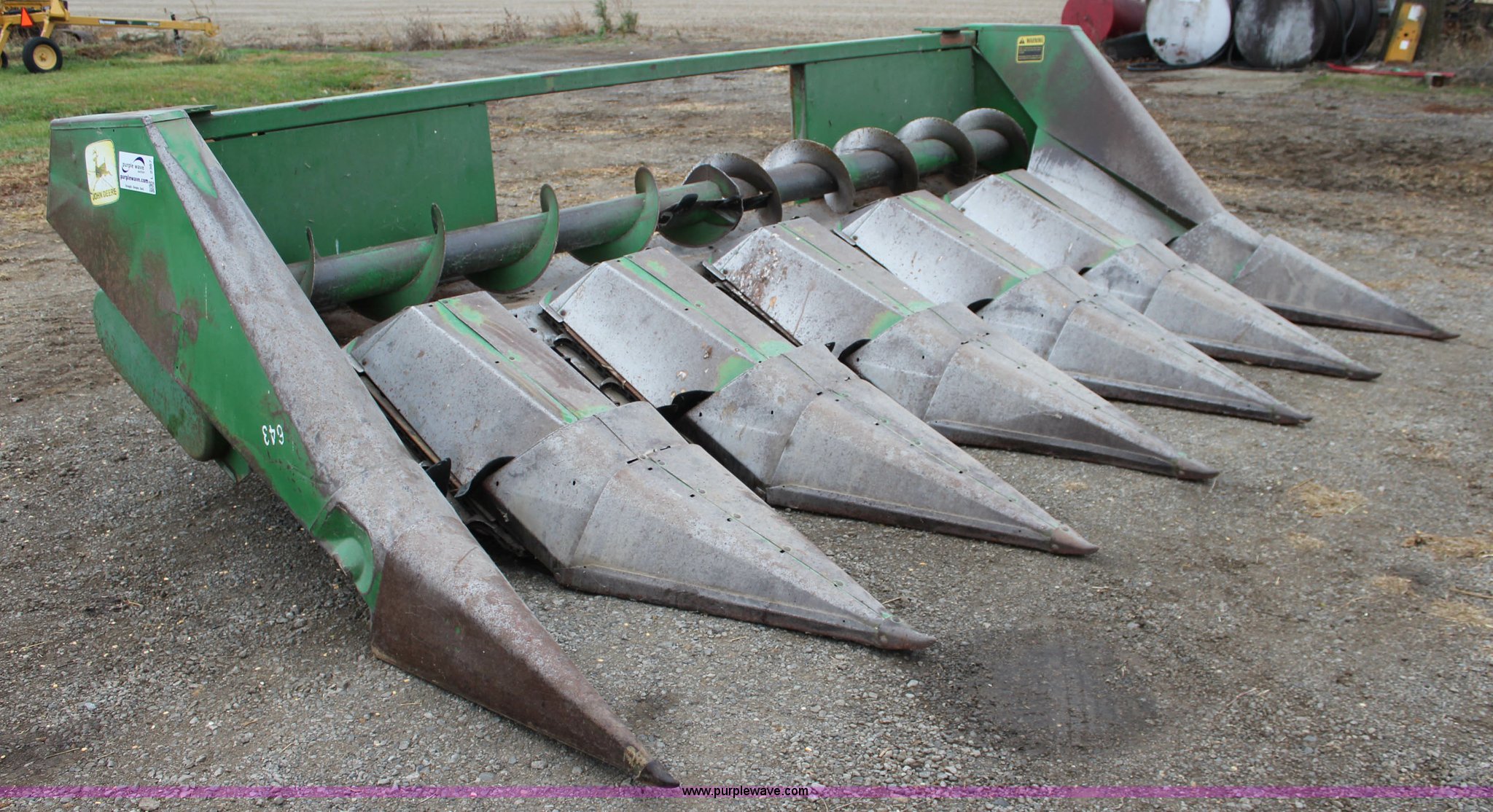 Purple Wave is selling a used Corn or Row Head in Kansas. This item is a 1972 John Deere 643 corn head with the following: Six row, 30" spacing, Setup for side hill machine, One owner, Stored inside, Serial 003650H