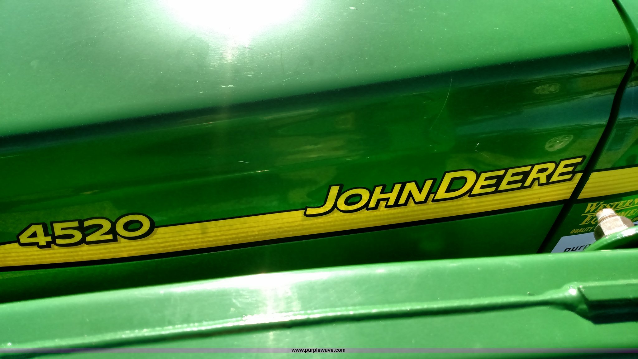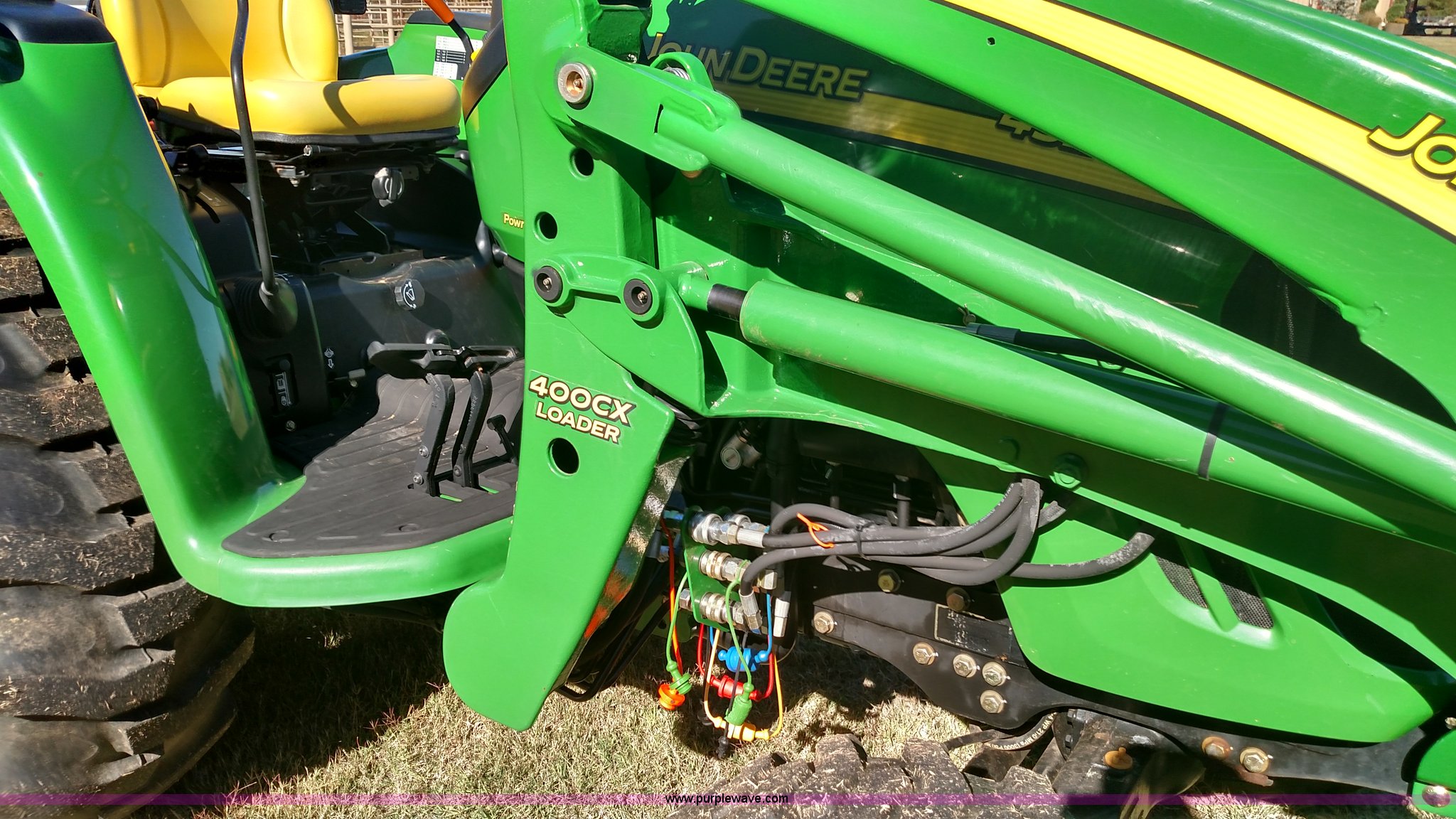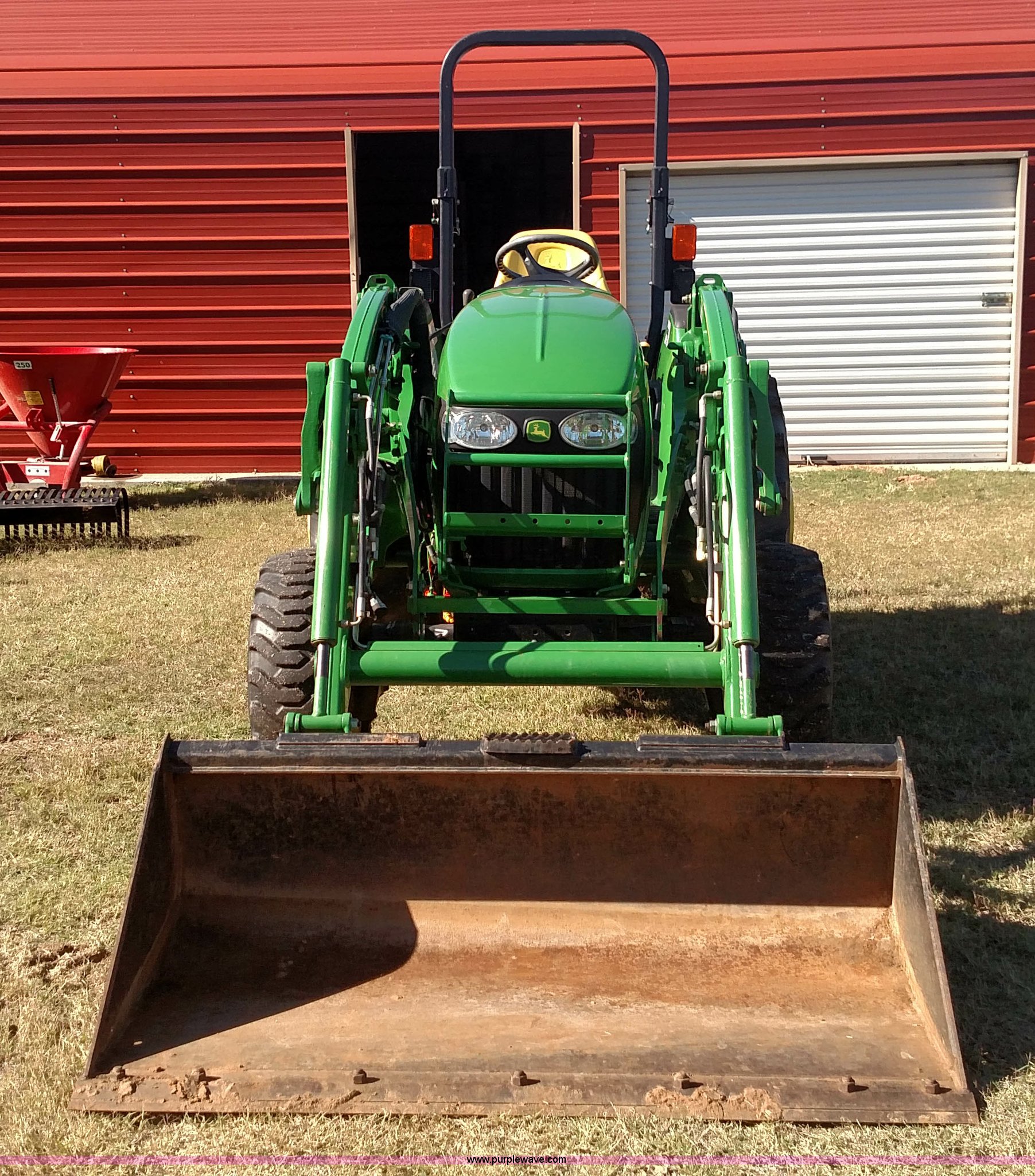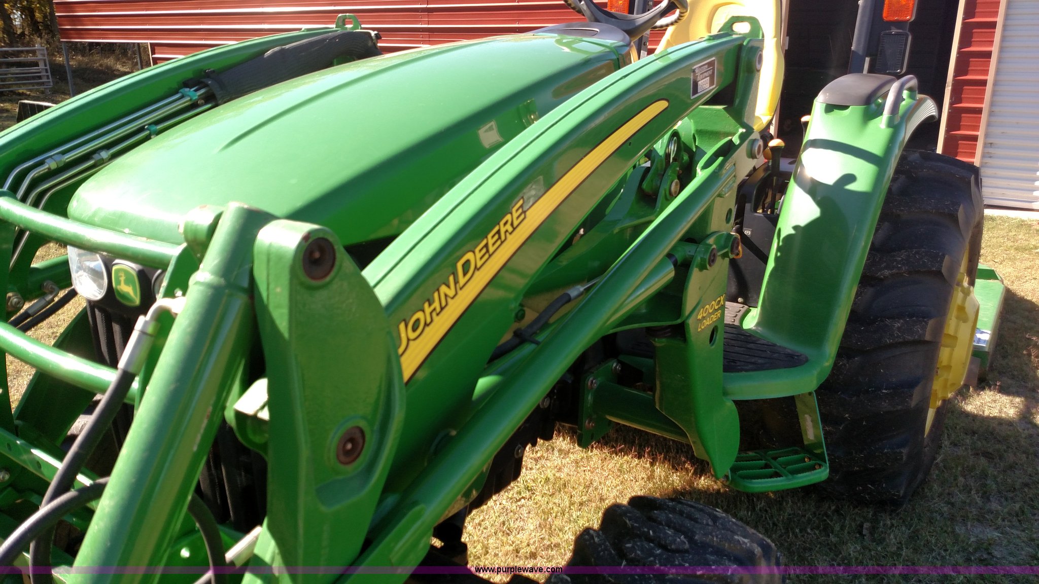 Purple Wave is selling a used Tractor in Oklahoma. This item is a 2006 John Deere 4520 compact utility tractor with the following: 385 hours on meter, Four cylinder turbo diesel engine, 12F-12R gears, Powr Reverser, 400CX loader, skid loader quick attach, Grill guard, C66 Worksite Pro bucket, Joystick loader control, Three point, Quick attach, 540 PTO, (3) rear hydraulic remotes, Wheel weights, 10-16.5 front tires, 17.5L-24 rear tires, Serial LV4520P347227