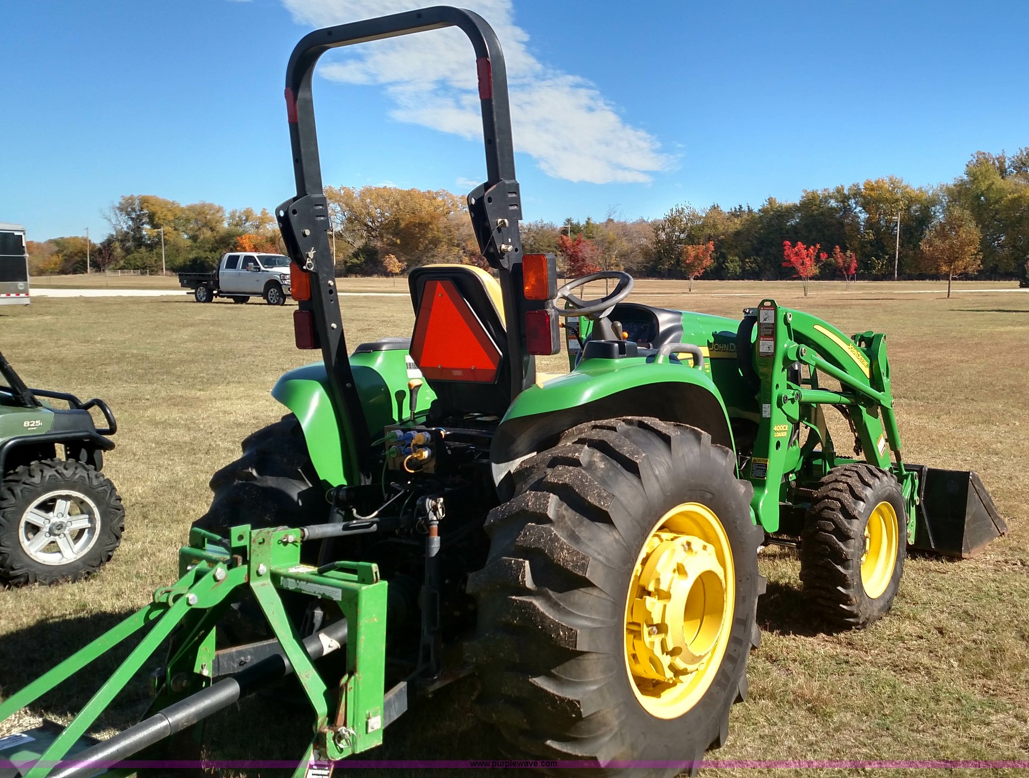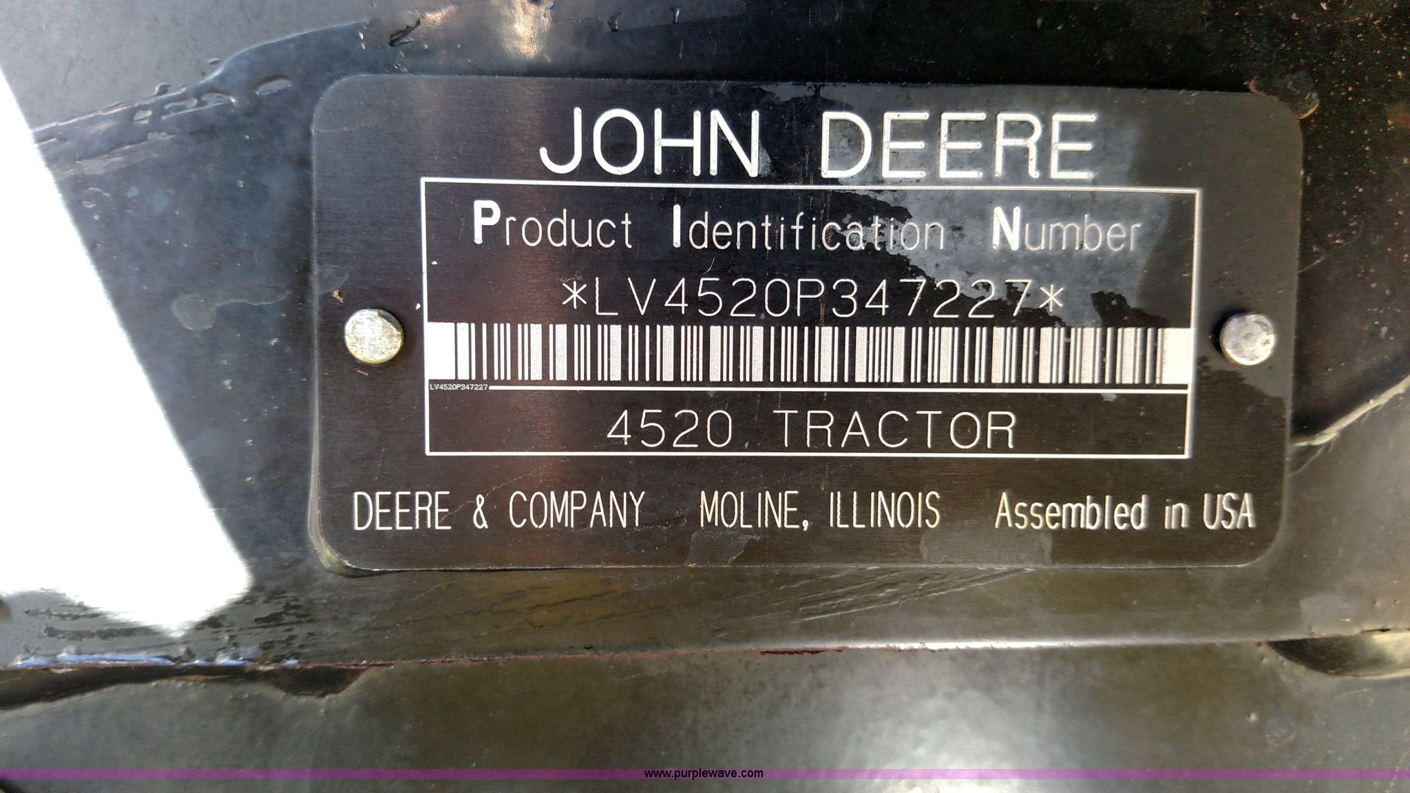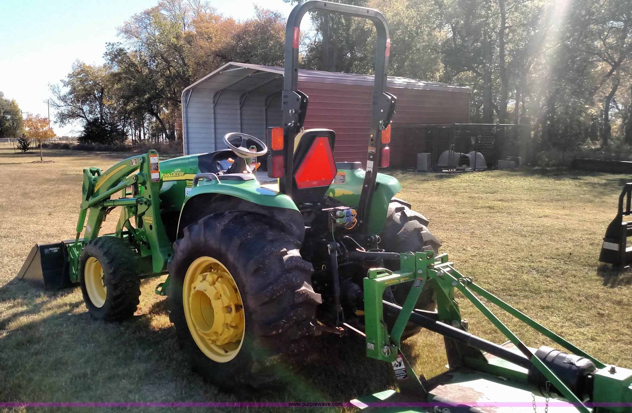 Purple Wave is selling a used Tractor in Oklahoma. This item is a 2006 John Deere 4520 compact utility tractor with the following: 385 hours on meter, Four cylinder turbo diesel engine, 12F-12R gears, Powr Reverser, 400CX loader, skid loader quick attach, Grill guard, C66 Worksite Pro bucket, Joystick loader control, Three point, Quick attach, 540 PTO, (3) rear hydraulic remotes, Wheel weights, 10-16.5 front tires, 17.5L-24 rear tires, Serial LV4520P347227