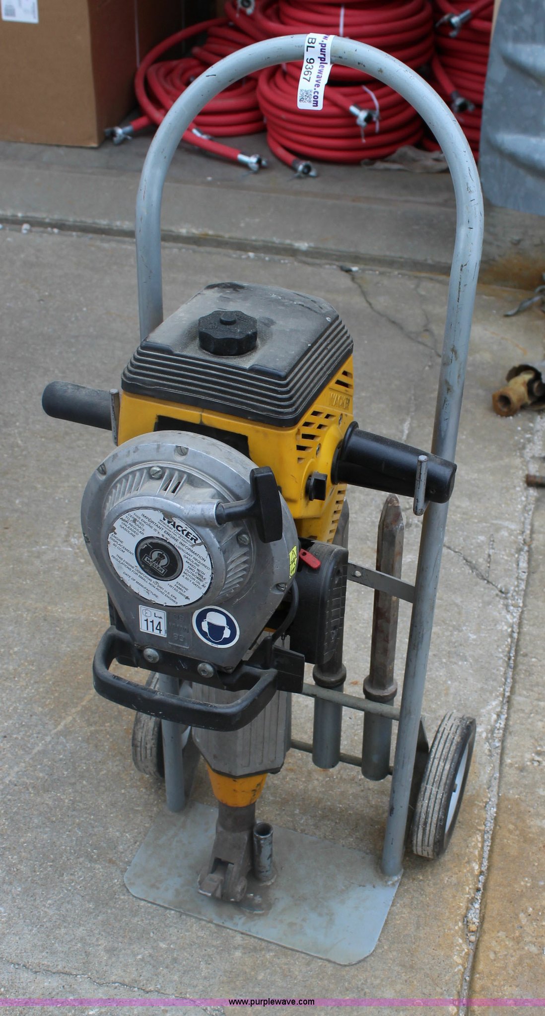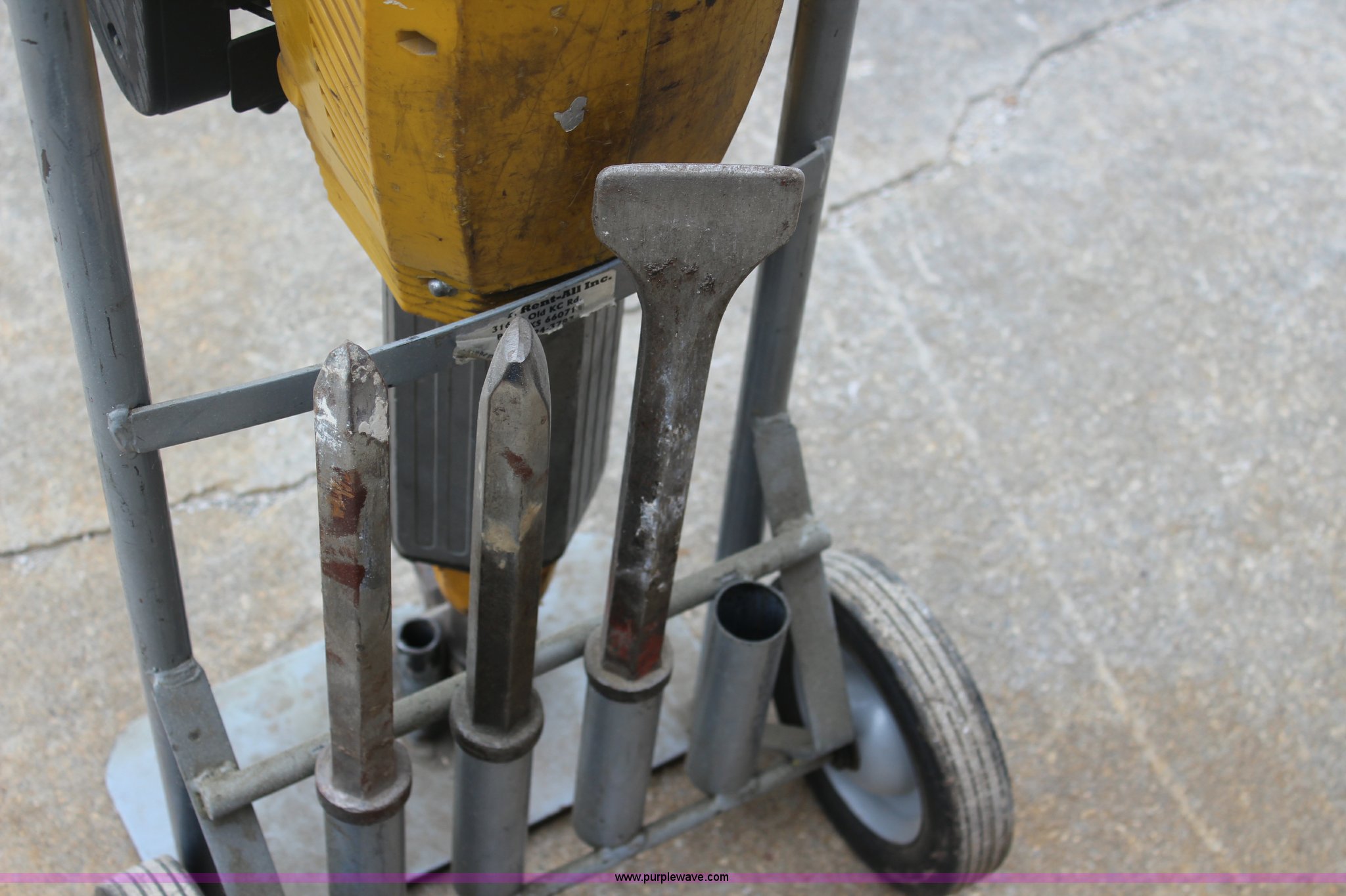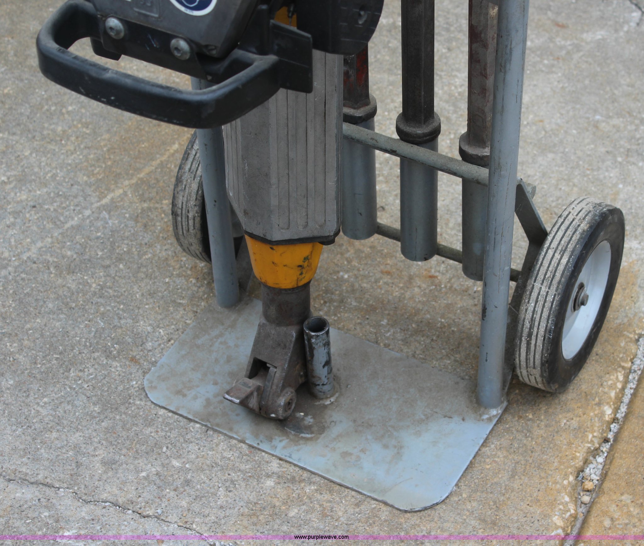 Purple Wave is selling a used Tools in Kansas. This item is a Wacker jack hammer with the following: Two cycle gas engine, (3) bits, Cart