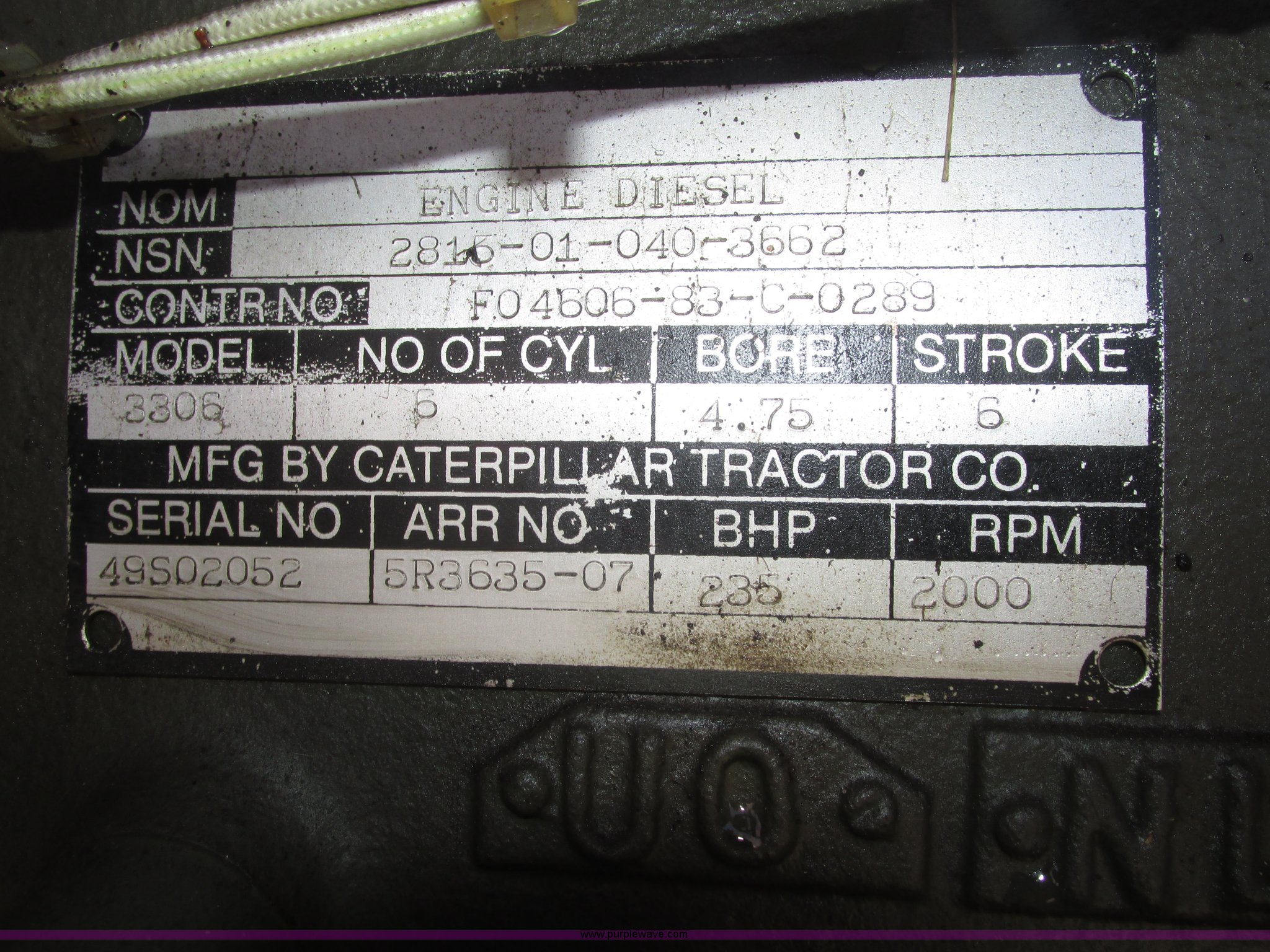 Purple Wave is selling a used Engine in Nebraska. This item is a 1985 Caterpillar 3306 turbo diesel engine with the following: 1,417 hours on meter, Six cylinder, 4.75 x 6 bore and stroke, Engine will be removed from a generator prior to auction, Serial 49S02052