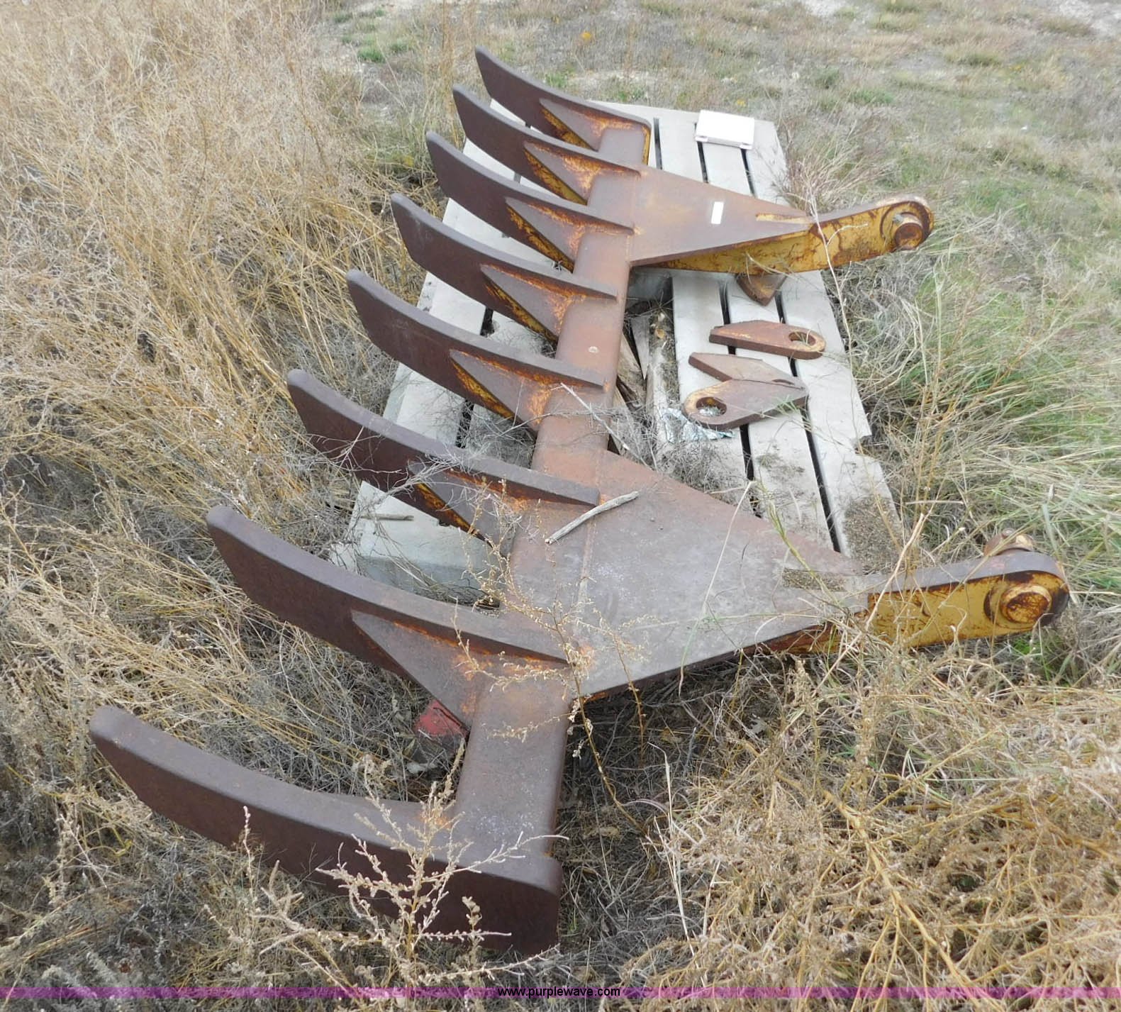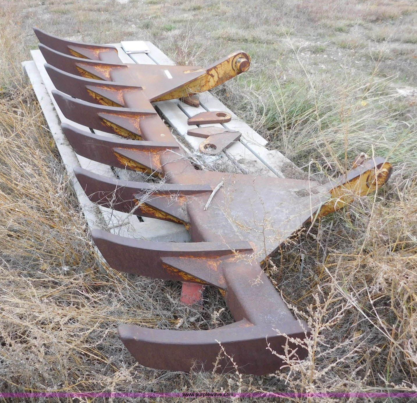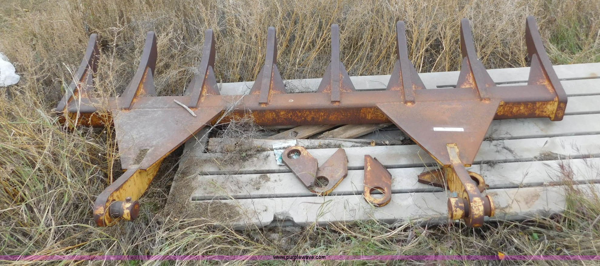 Purple Wave is selling a used Bucket or Loader Attach. in Oklahoma. This item is a 10'W root rake with the following: (8) teeth, 61 3/4" I.D. mounting face