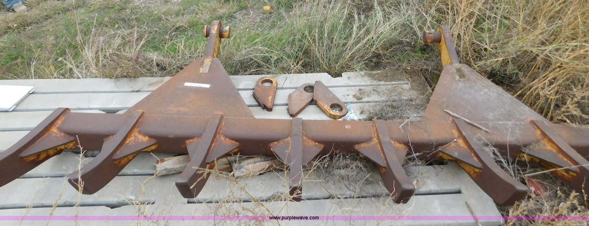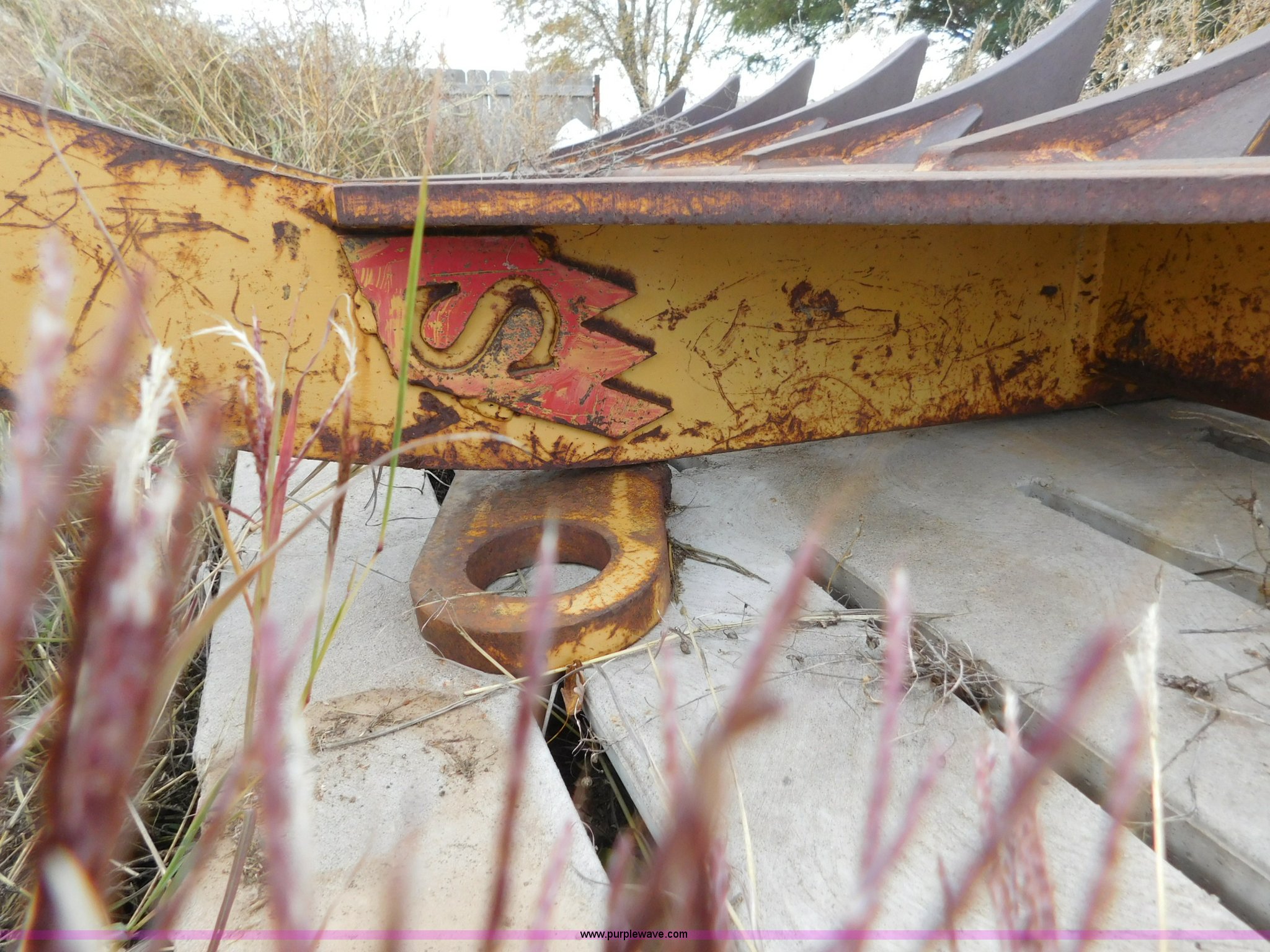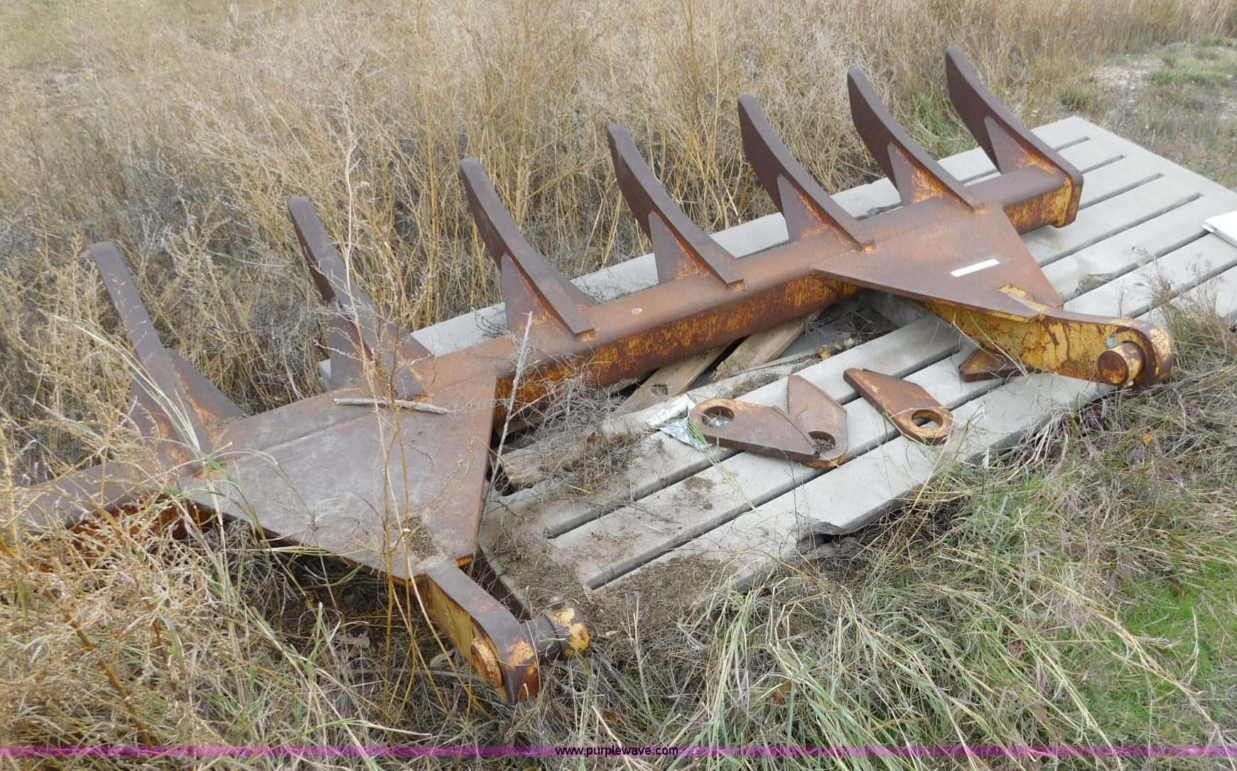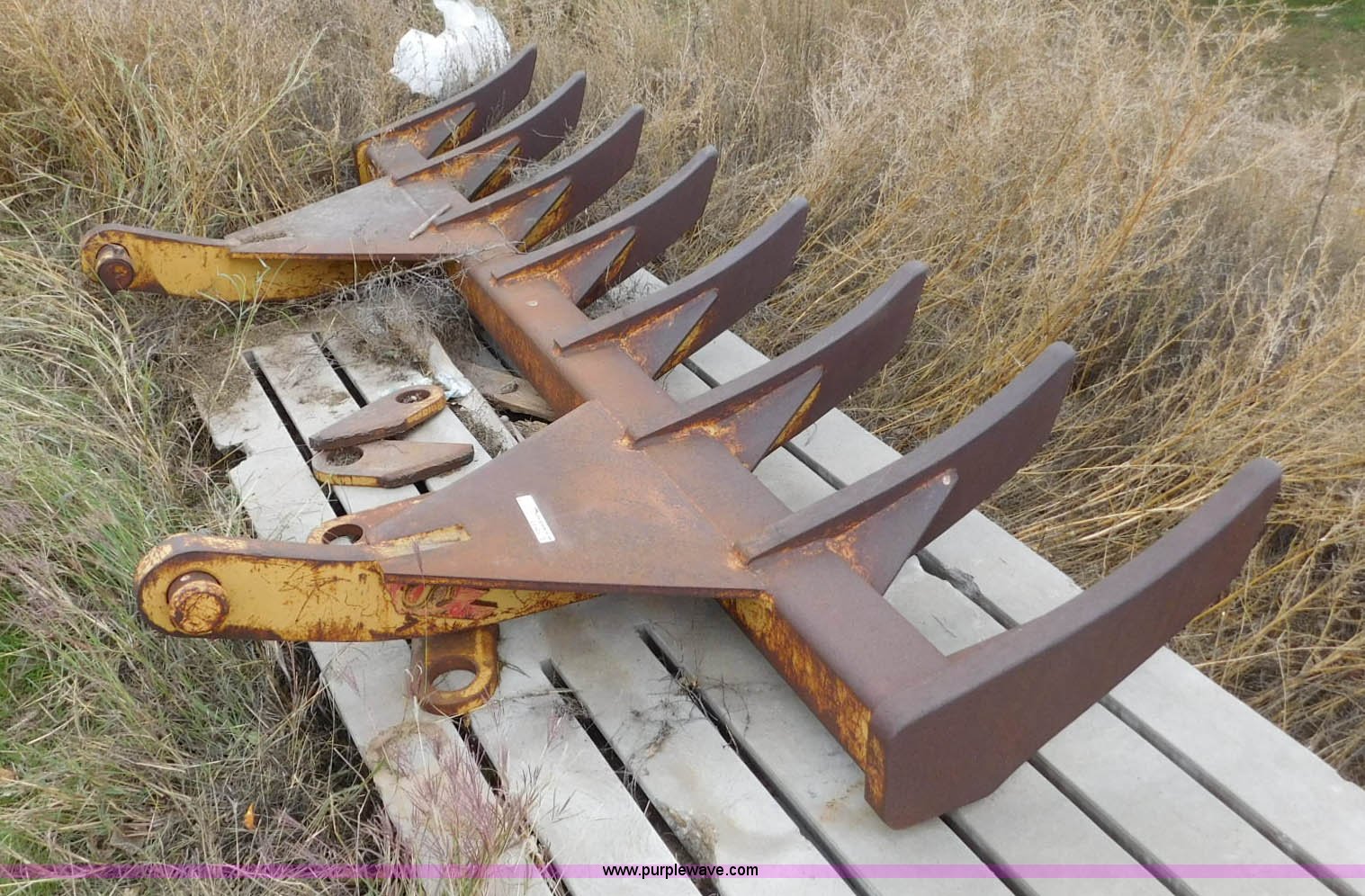 Purple Wave is selling a used Bucket or Loader Attach. in Oklahoma. This item is a 10'W root rake with the following: (8) teeth, 61 3/4" I.D. mounting face