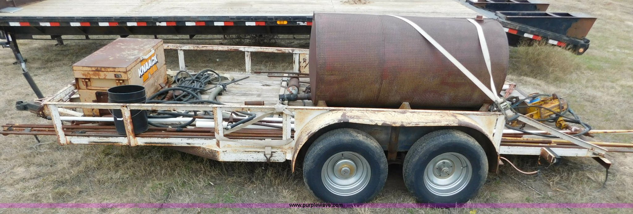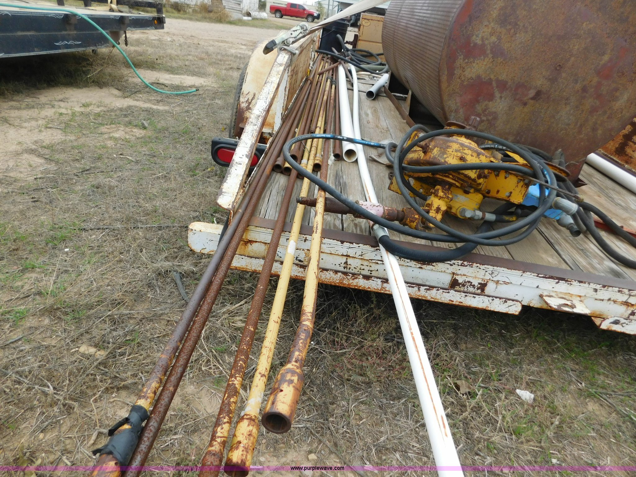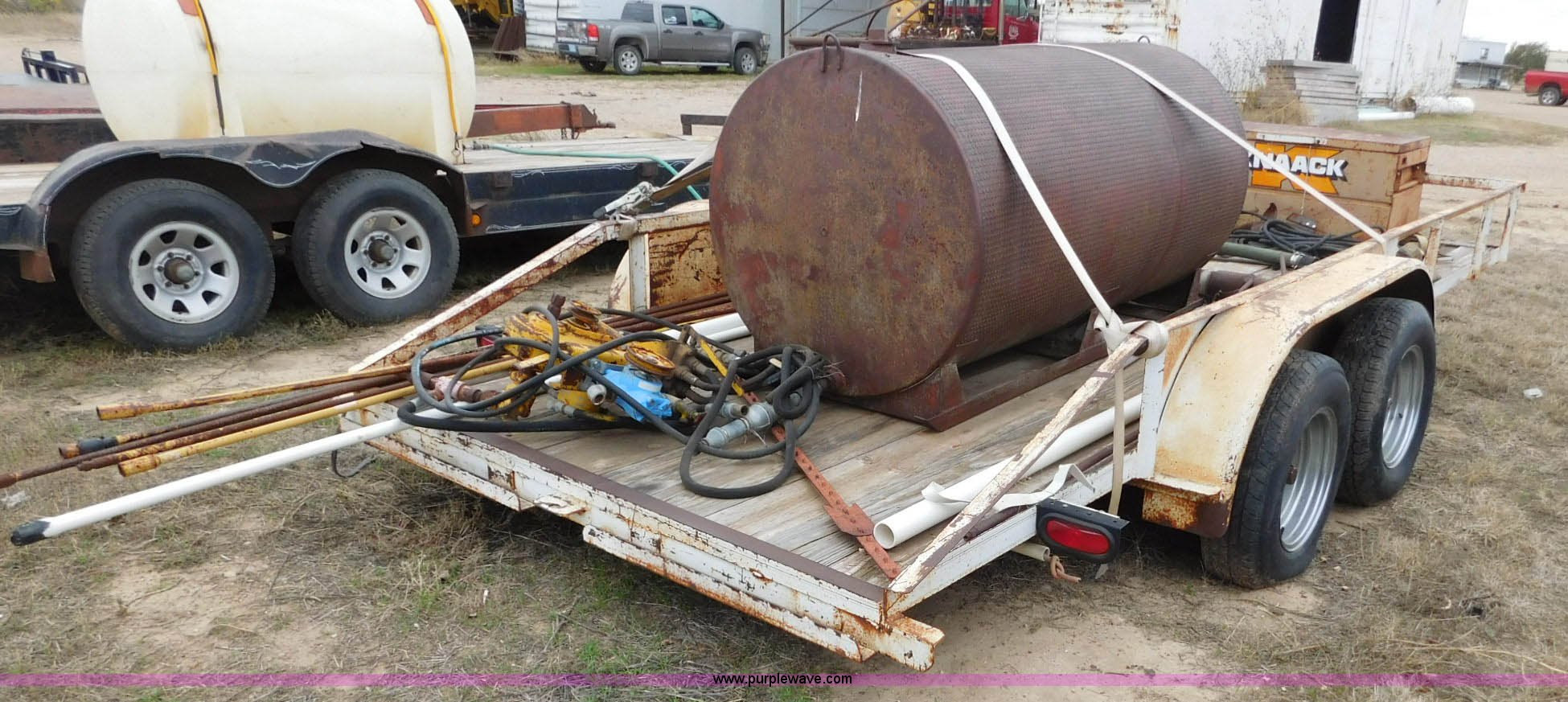 Purple Wave is selling a used Car or Utility Trailer in Oklahoma. This item is a 16'L x 96"W utility trailer with the following: Job box, 400 gallon steel tank, Davis Trencher boring unit, (18) 10'L boring stems, (2) boring end attachments, Tandem axle, P215/75R15 tires, 2 5/16" ball hitch