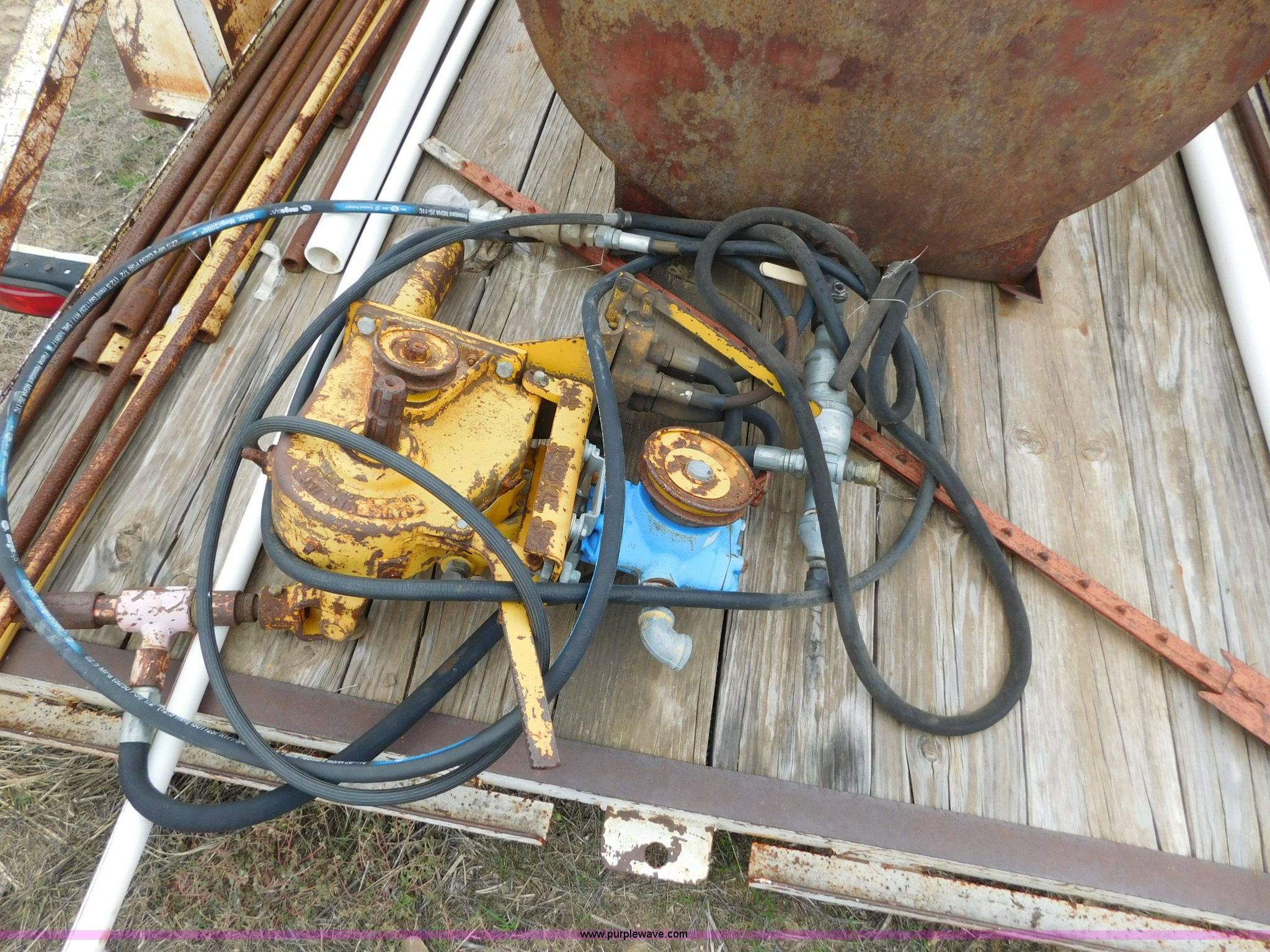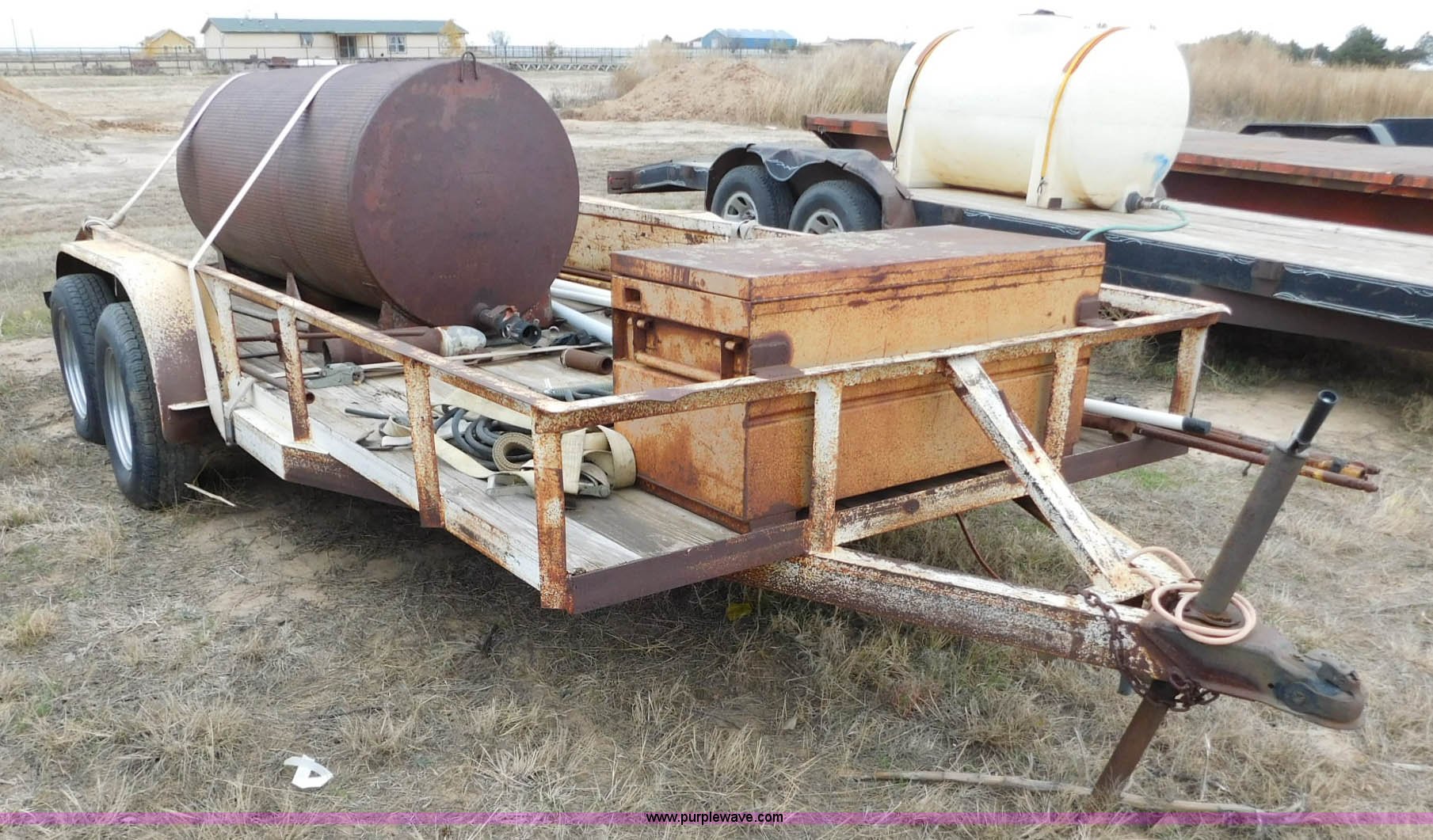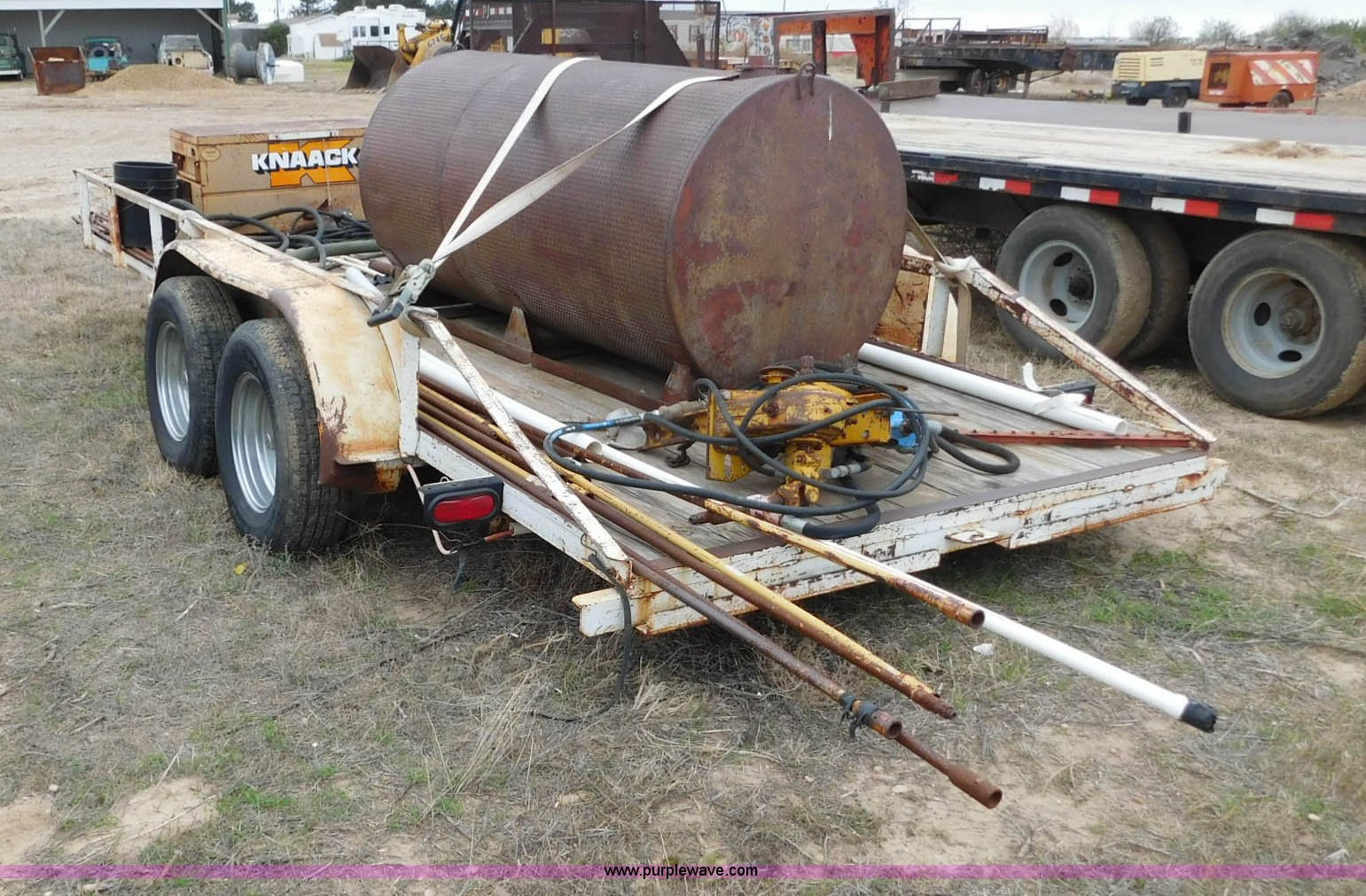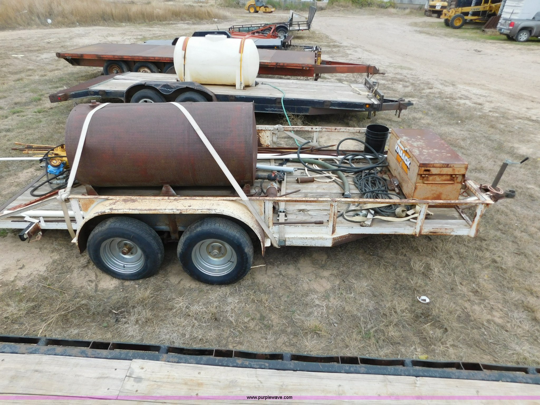 Purple Wave is selling a used Car or Utility Trailer in Oklahoma. This item is a 16'L x 96"W utility trailer with the following: Job box, 400 gallon steel tank, Davis Trencher boring unit, (18) 10'L boring stems, (2) boring end attachments, Tandem axle, P215/75R15 tires, 2 5/16" ball hitch