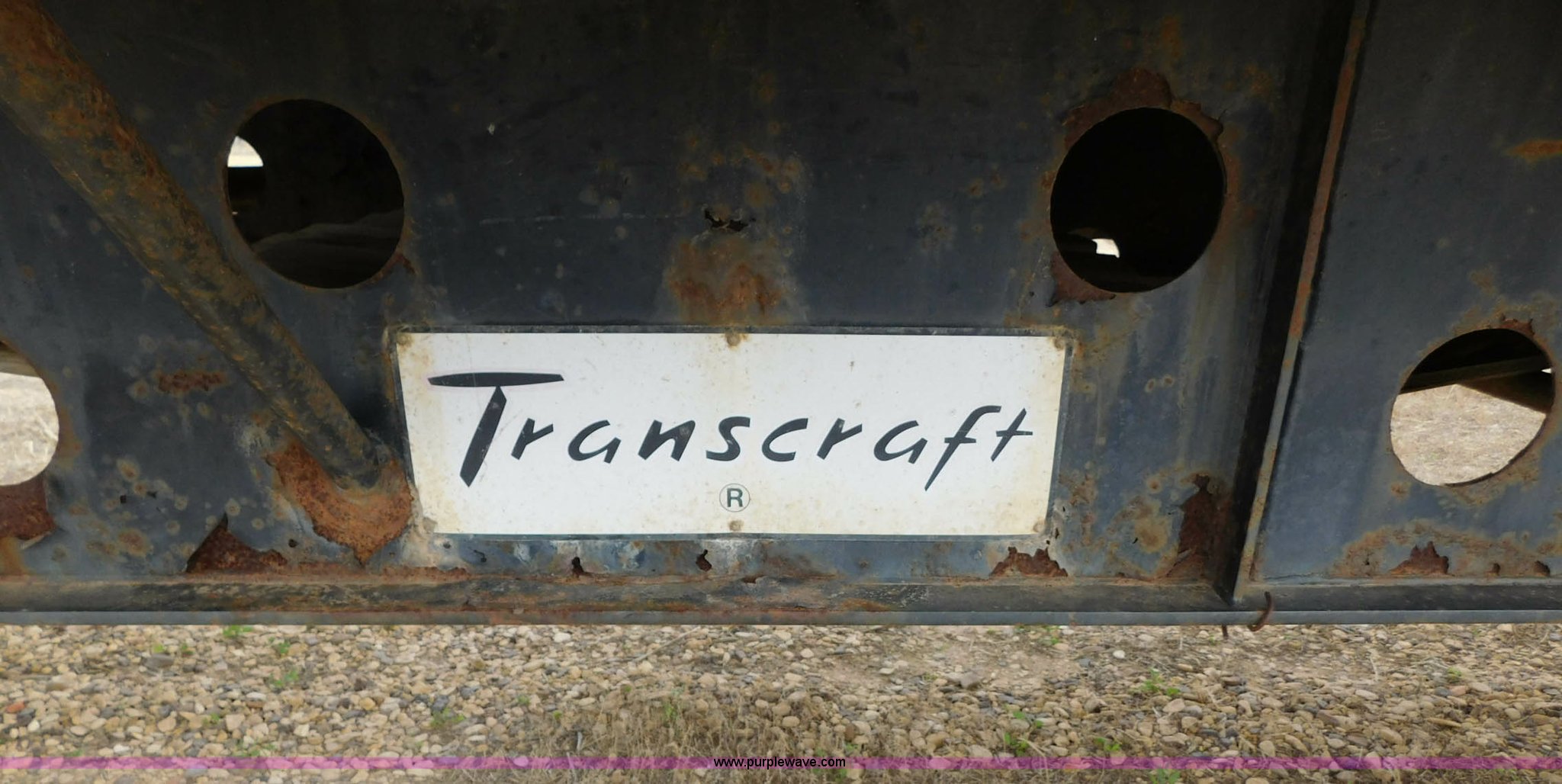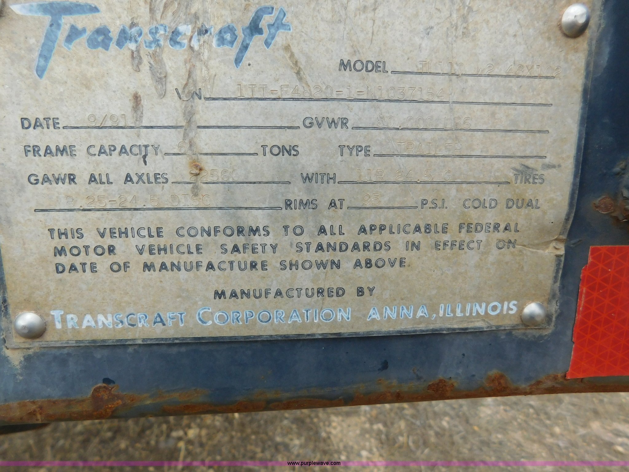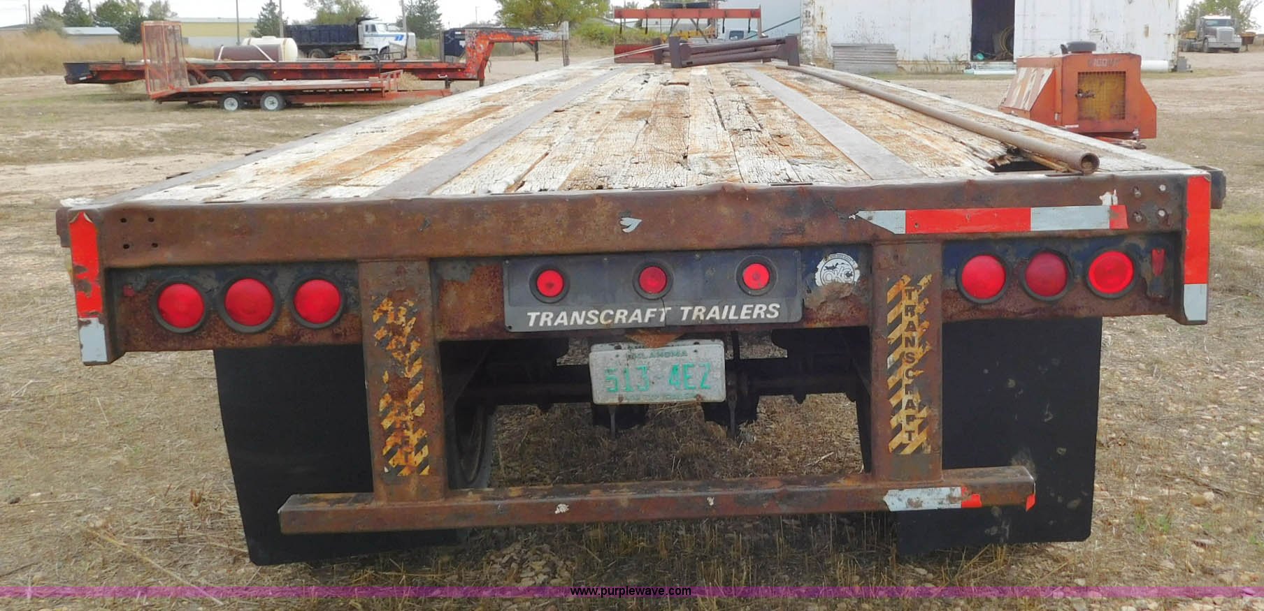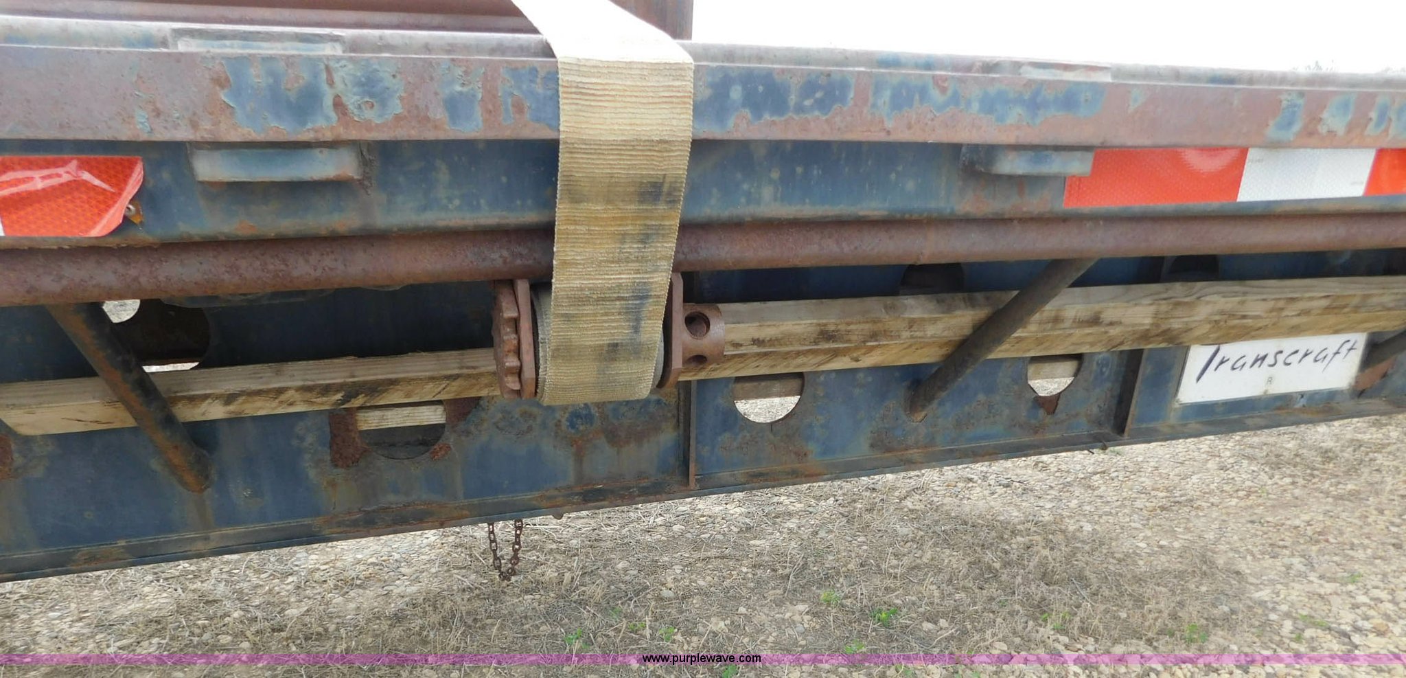 Purple Wave is selling a used Flat or Drop Deck Trailer in Oklahoma. This item is a 1992 Transcraft TL-110 flatbed trailer with the following: 48'L x 8'W, 60 ton capacity, Wood deck, Ratchet tie downs, Under mounted toolbox, Manual landing gear, Mud flaps, Air brakes, 285/75R24.5 tires, GVWR 80,000 lbs, GAWR 22,560 lbs, Weld repairs to frame, Hole in deck, Contents are not included