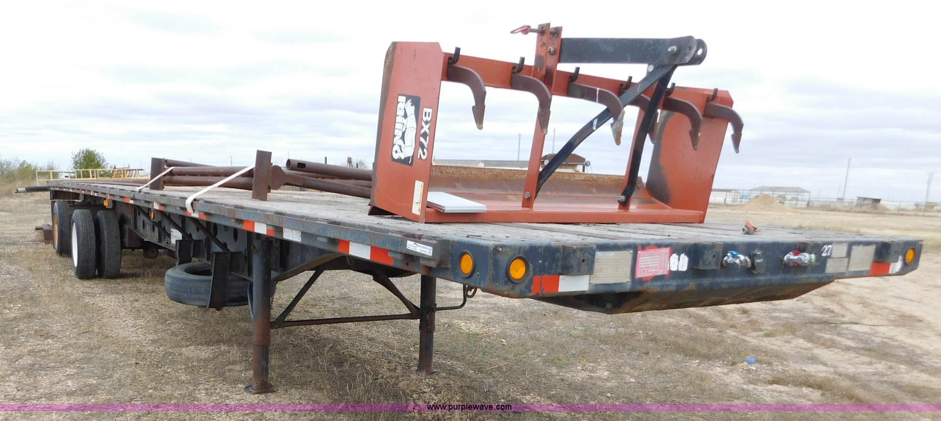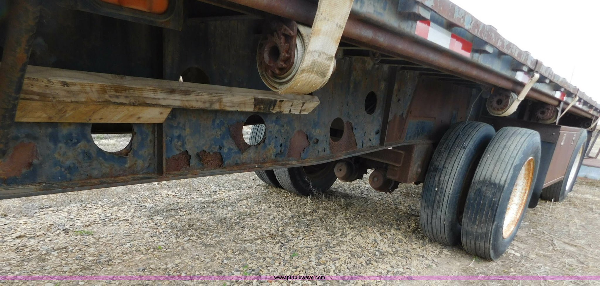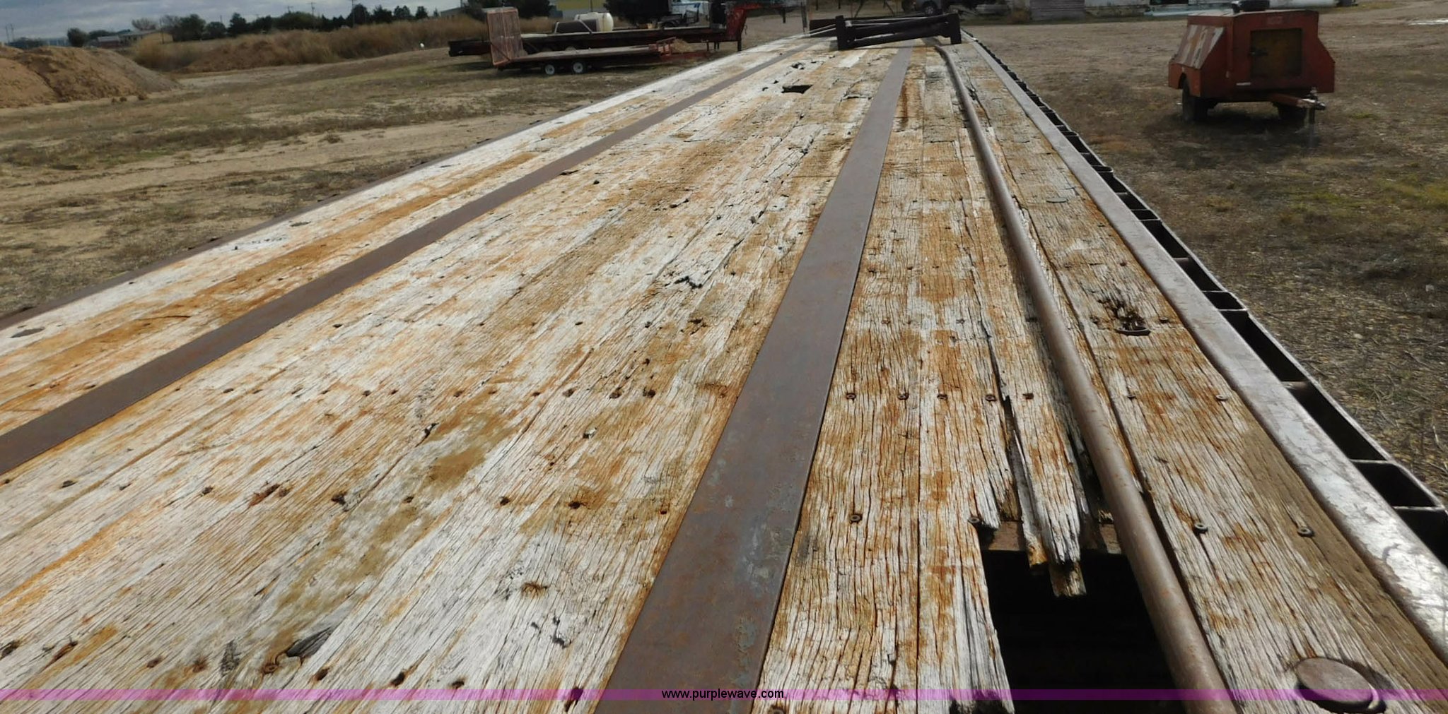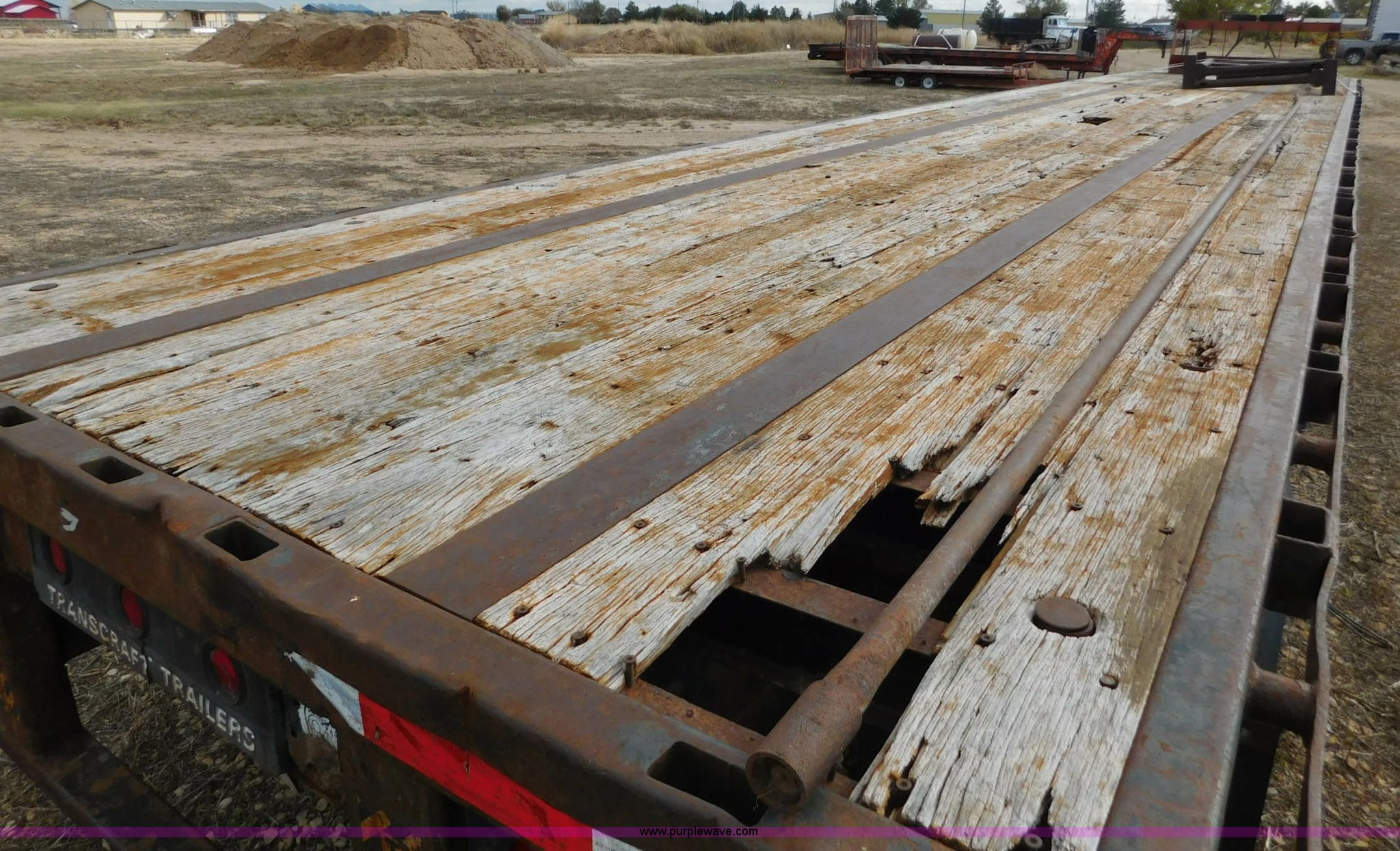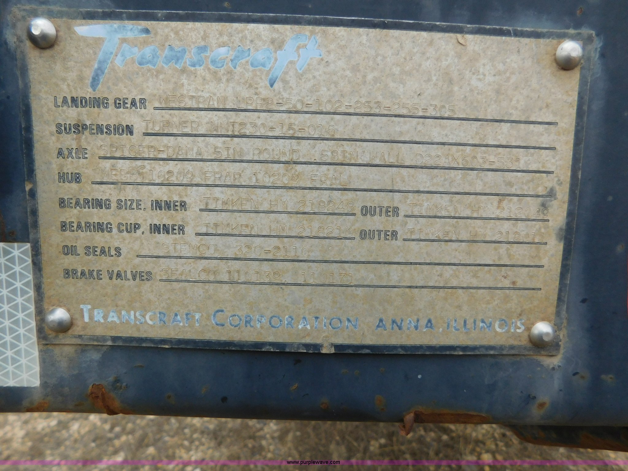 Purple Wave is selling a used Flat or Drop Deck Trailer in Oklahoma. This item is a 1992 Transcraft TL-110 flatbed trailer with the following: 48'L x 8'W, 60 ton capacity, Wood deck, Ratchet tie downs, Under mounted toolbox, Manual landing gear, Mud flaps, Air brakes, 285/75R24.5 tires, GVWR 80,000 lbs, GAWR 22,560 lbs, Weld repairs to frame, Hole in deck, Contents are not included