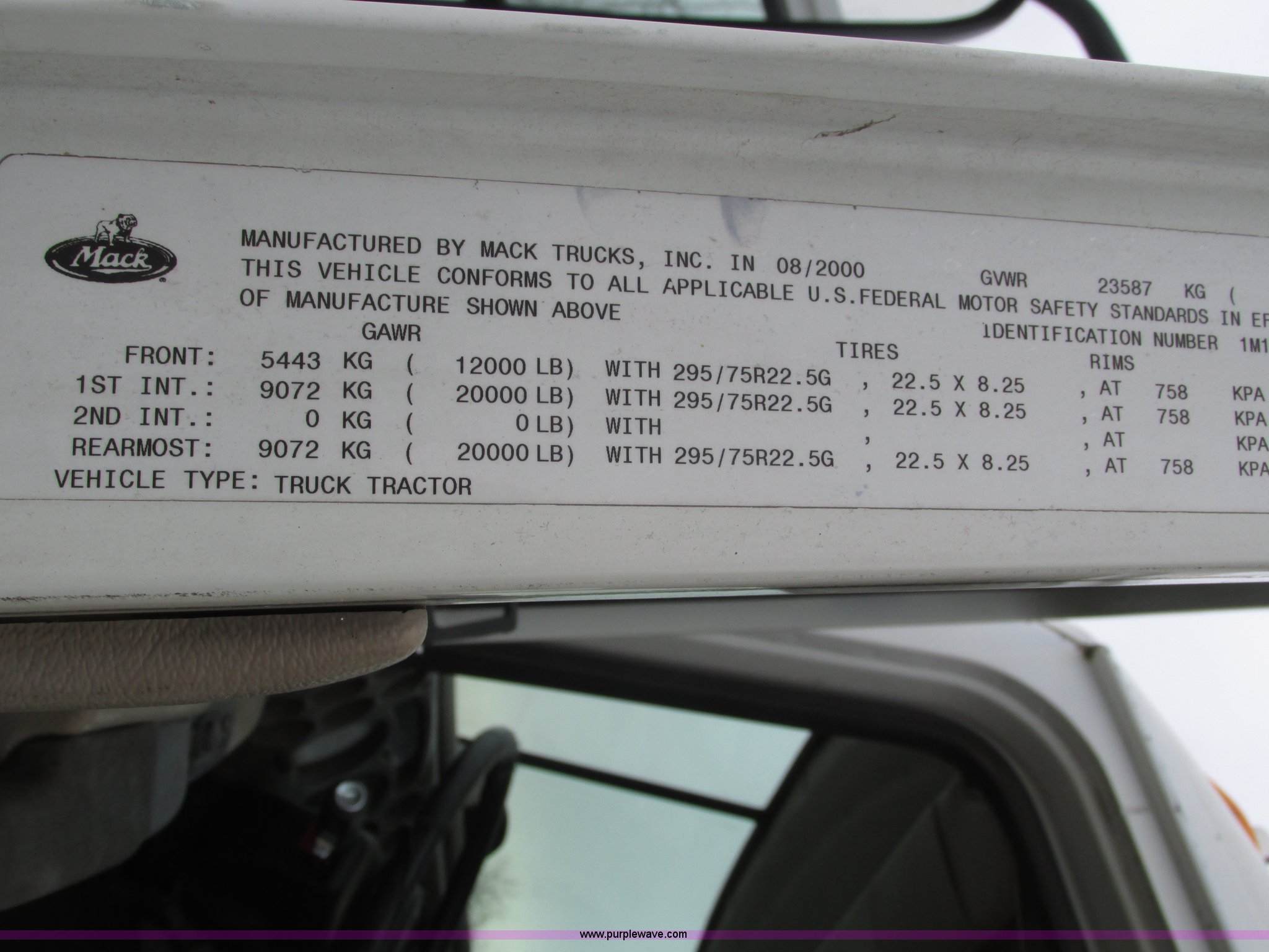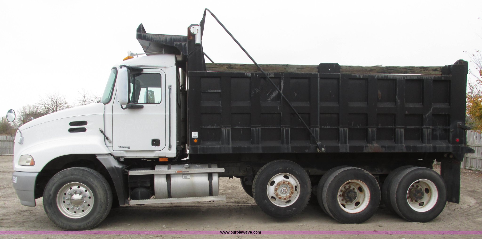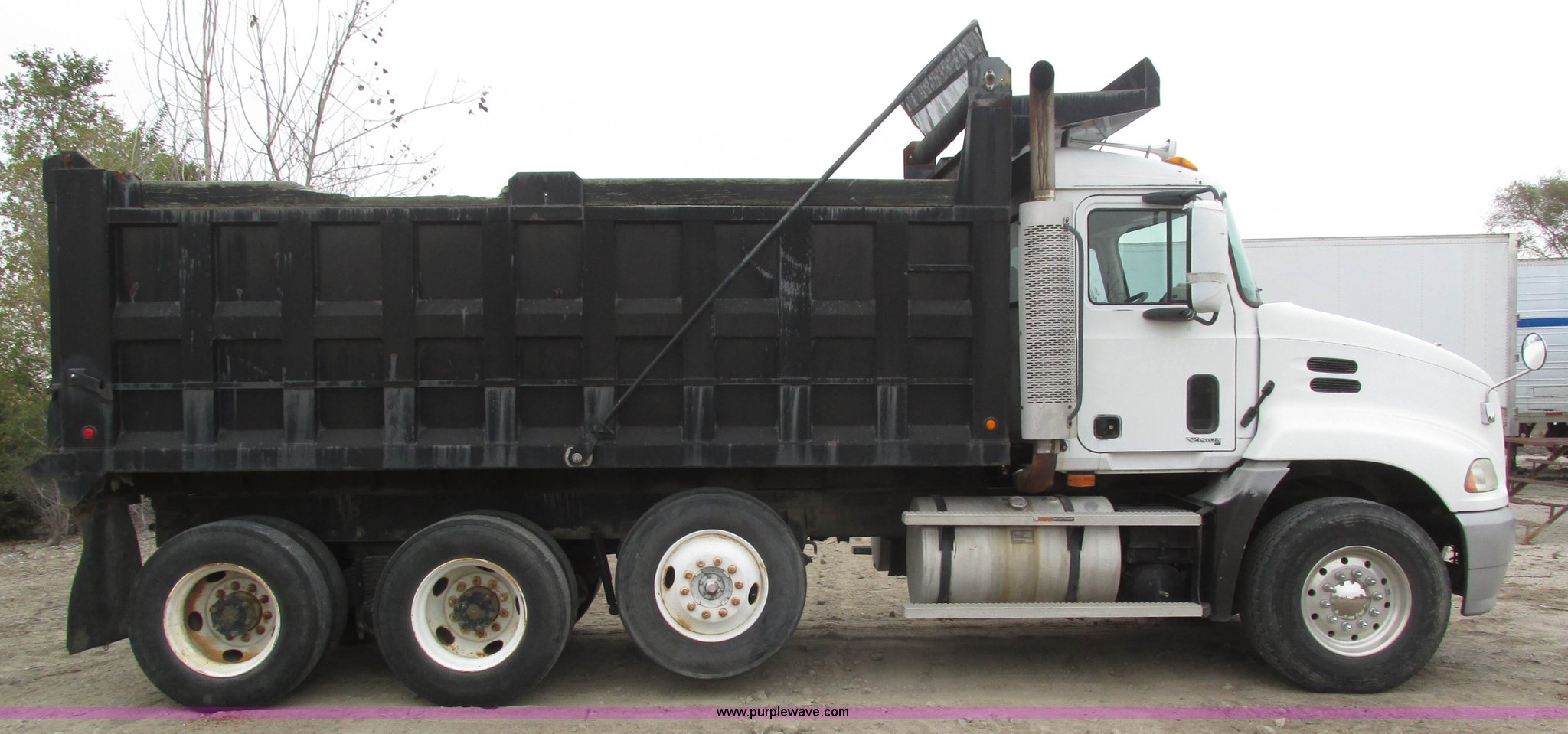 Purple Wave is selling a used Construction Dump Truck in Nebraska. This item is a 2001 Mack Vision CX613 dump truck with the following: 566,728 miles on odometer, 24,734 hours on meter, Mack E7 12.0L L6 turbo diesel engine, Eaton Fuller EVT-300 Auto shift automatic transmission, Triple axle, Inter-axle differential lock, AC and heat, Telescoping steering wheel, Cruise, AM/FM/cassette, Power windows, Power and heated mirrors, Air suspension seat, Passenger daylight door, Air ride cab, Cloth interior, Fog lights, Muncie PTO, 16'L x 95"W steel dump bed, 110" side height, 48" side boards, Single ram hoist, Air operated end gate, (4) end gate doors, Approximately 15"W x 11"H, Roll-over tarp, Single rear exhaust, Dual 90 gallon fuel tanks, Ridewell steerable pusher axle, Pintle hitch, Glad hand couplers, Aluminum front wheels, Steel rear wheels, 385/65R22.5 front tires, 295/75R22.5 steerable pusher axle tires, 295/75R22.5 rear tires, GVWR 52,000 lbs, FAWR 12,000 lbs, IAWR 20,000 lbs, RAWR 20,000 lbs, Camelback suspension, 210" wheel base, Passenger mirror taped, Rear tires weather cracked