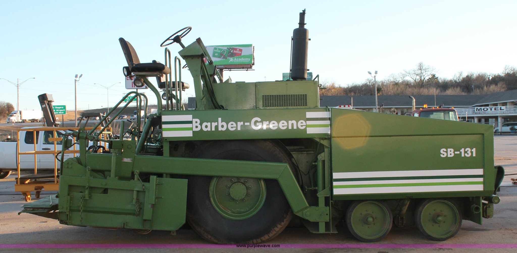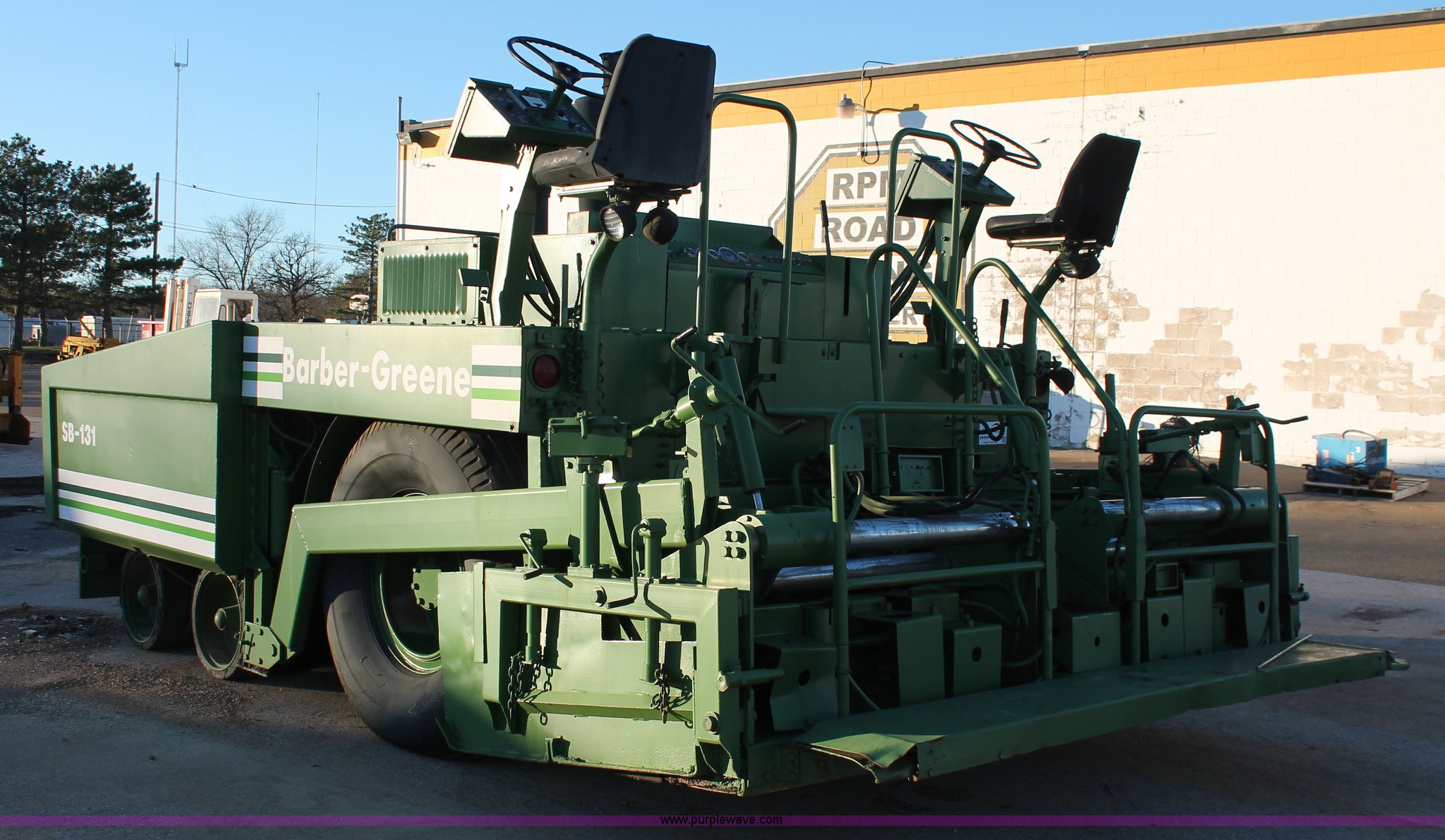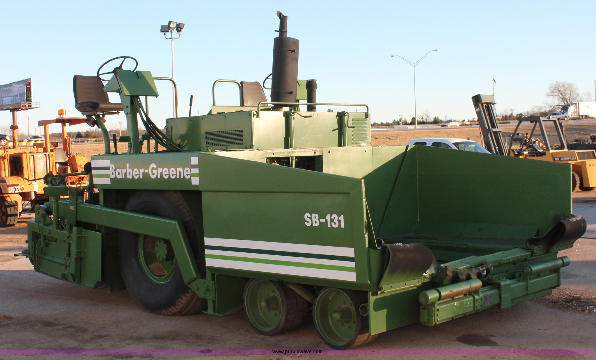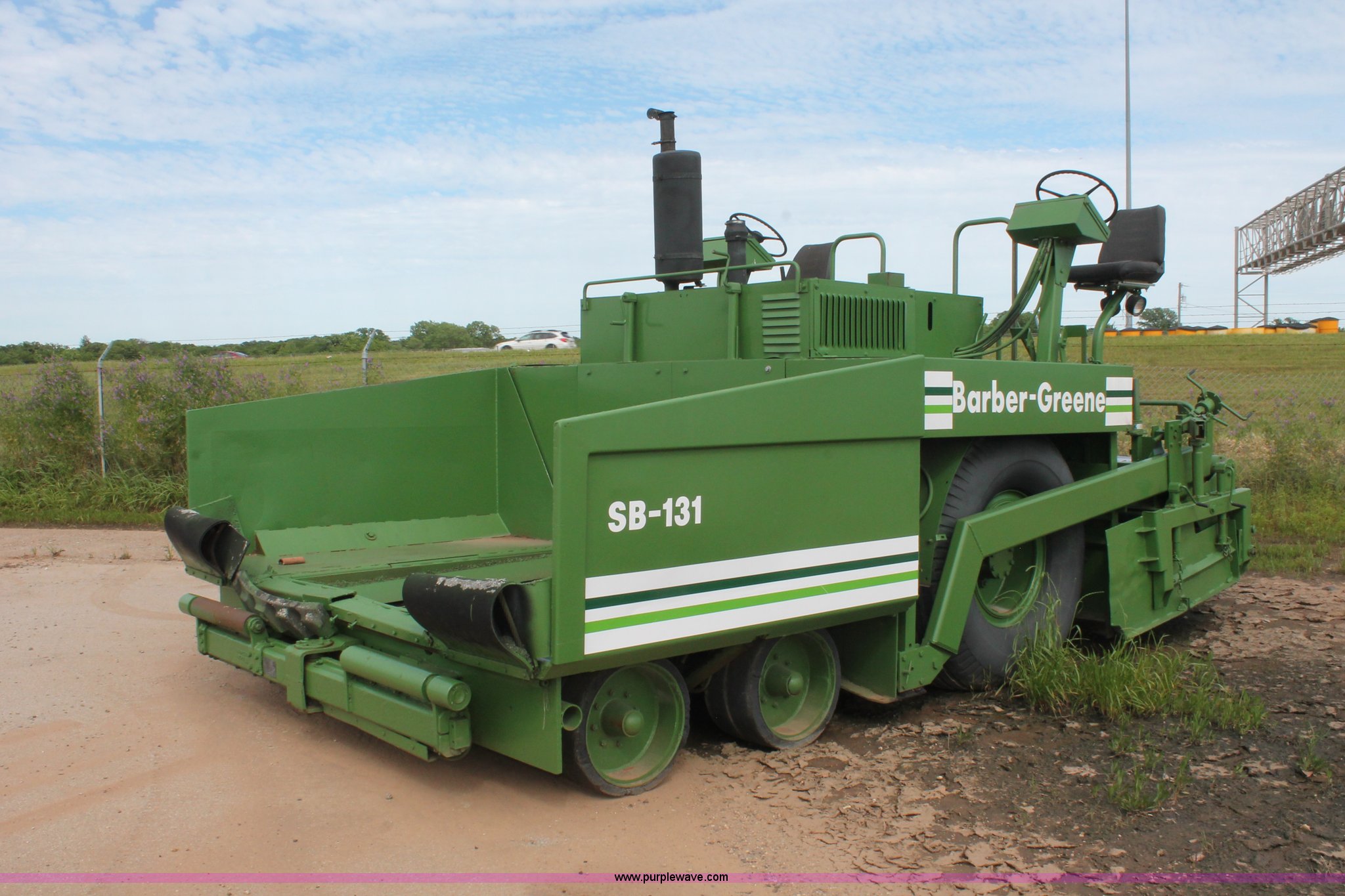 Purple Wave is selling a used Paver or Screed in Oklahoma. This item is a 1982 Barber Greene SB-131 asphalt paver with the following: Four cylinder diesel engine, Three speed travel, Dual open operators stations, 128"W hopper, Dual 24"W conveyor, Hydraulic lift and width controlled screed widener, 12" diameter auger, 16.00-24DT drive tires, 25,400 lbs. base operating weight, Serial SB131X534