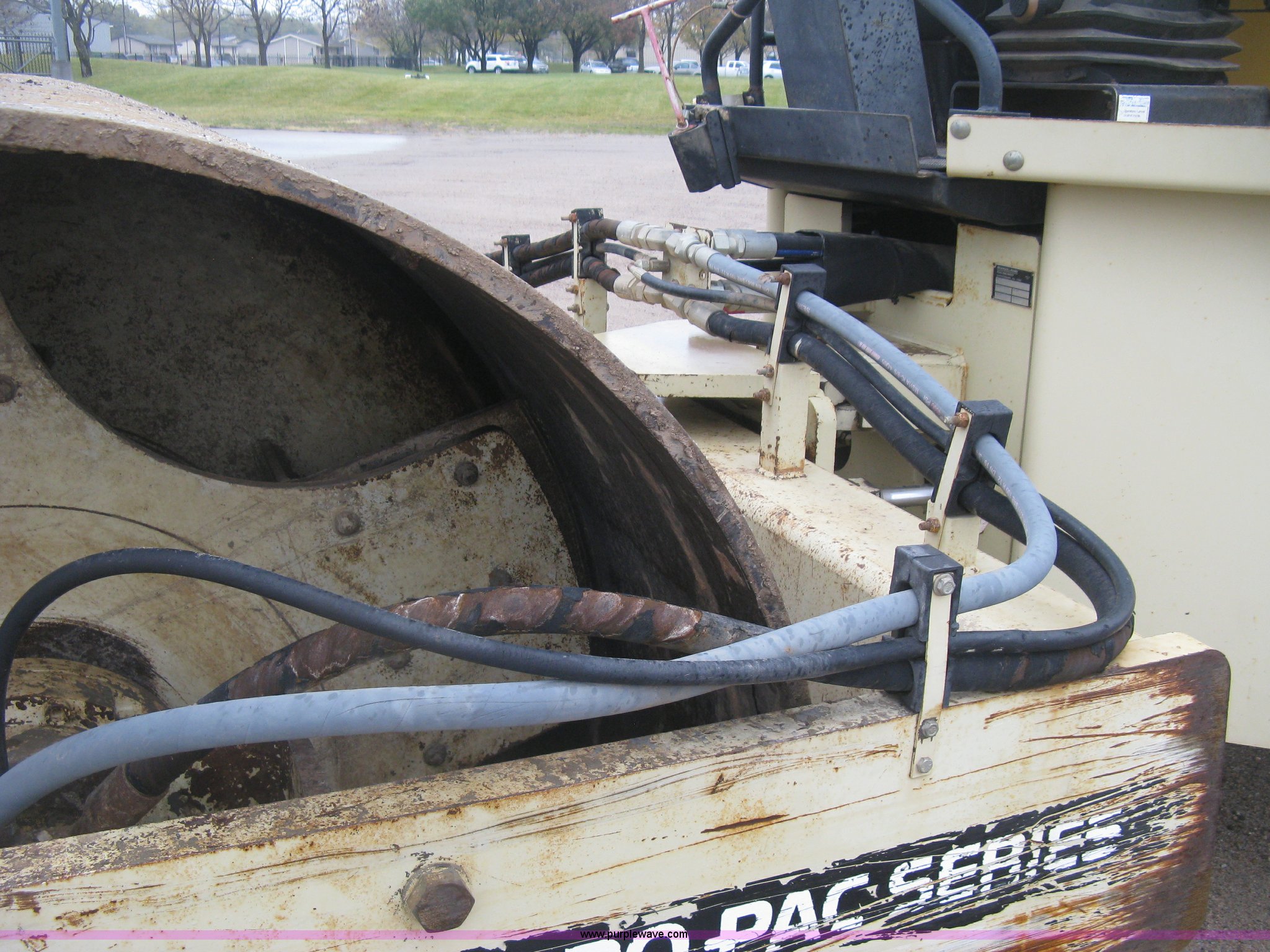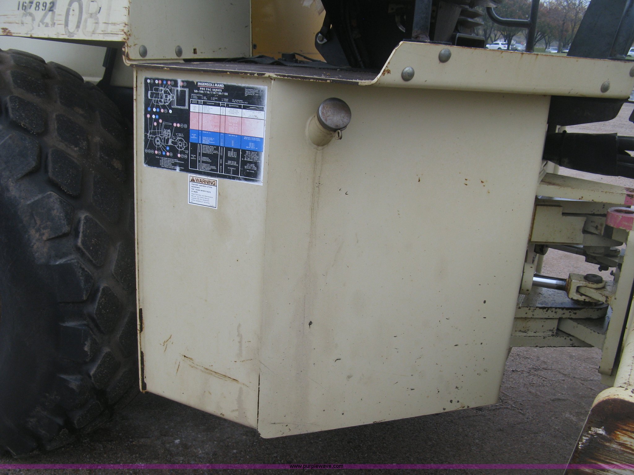 Purple Wave is selling a used Single Drum Roller Compactor in Kansas. This item is a Ingersoll Rand SD100D Pro Pac compactor with the following: 4,045 hours on meter, Cummins 4BT 3.9L four cylinder turbo diesel engine, 125 HP, Two speed hydrostatic transmission, Canopy, Suspension seat, Vandal cover, Work lights, 84"W x 59" diameter drum, Front drum scraper, 23.1-26 tires, Blow by, Service records available, Serial 167892, Unit# 64.08L