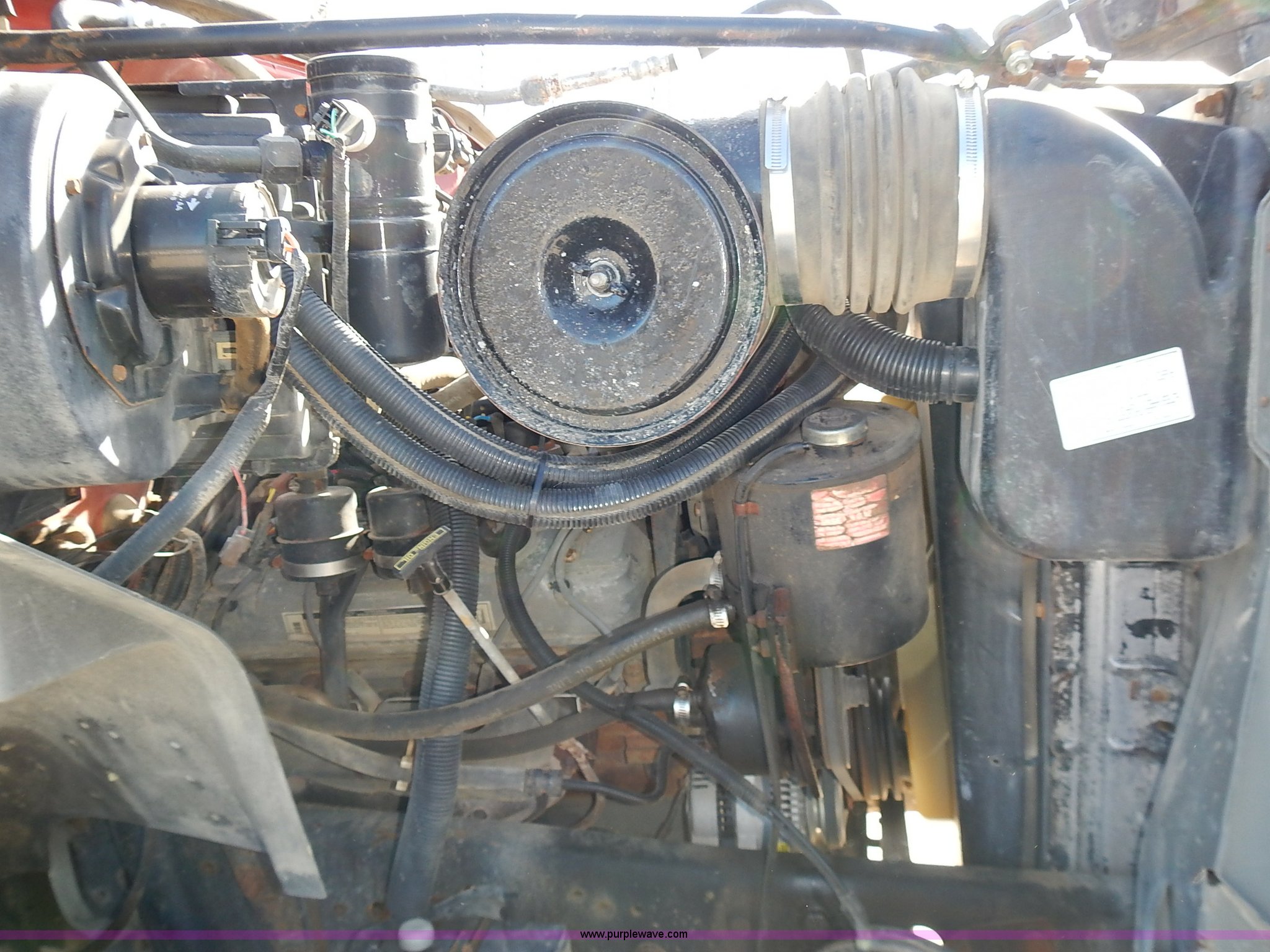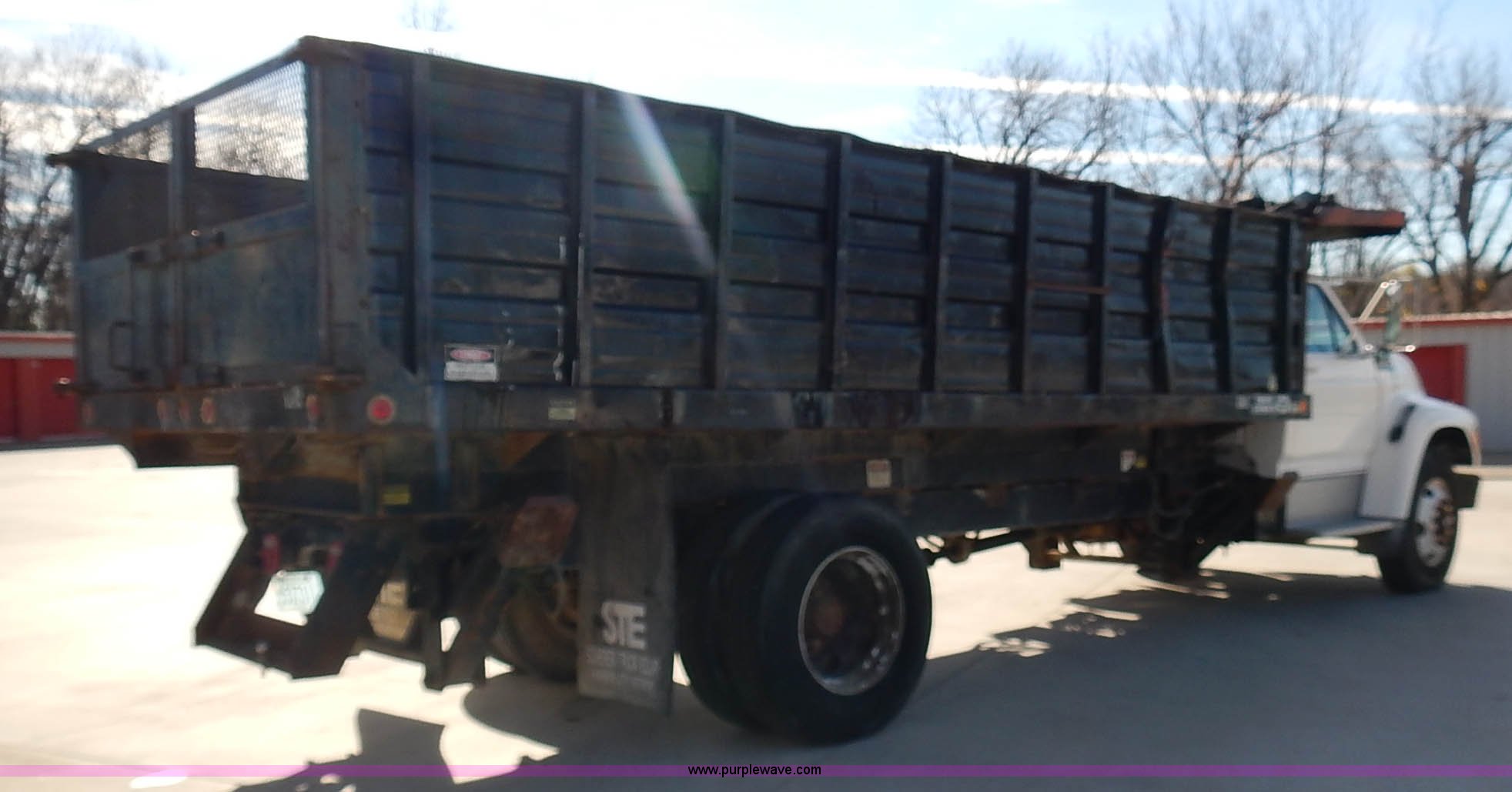 Purple Wave is selling a used Construction Dump Truck in Kansas. This item is a 1995 Ford F750 dump truck with scissor lift bed with the following: 40,449 miles on odometer, 7.0L V8 gas engine, Six speed manual transmission, Single axle, AC and heat, AM/FM, Muncie PTO, Aerial Lift Omaha steel bed, Scissor lift and dump bed, 20'L, 40" side board height, 18' lift height from ground to bottom of bed, Tesco Hi-Lift dual ram four stage hoist, Serial 95-08-711-K-01, Manual operated end gate, Dual doors, Roll-over tarp, Eight ton lift capacity, 50 gallon fuel tank, Front tow hooks, Front and rear stabilizers, Ball hitch, Spring suspension, Hydraulic brakes, 225" wheelbase, 11R22.5 tires, GVWR 28,000 lbs, FAWR 9,000 lbs, RAWR 19,000 lbs, Both hoist cylinders have been rebuilt, Windshield cracked, Lift operators manual