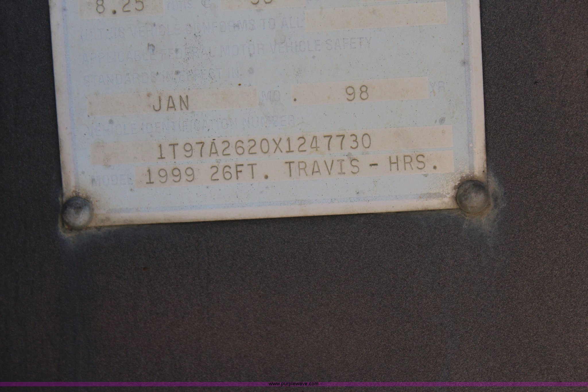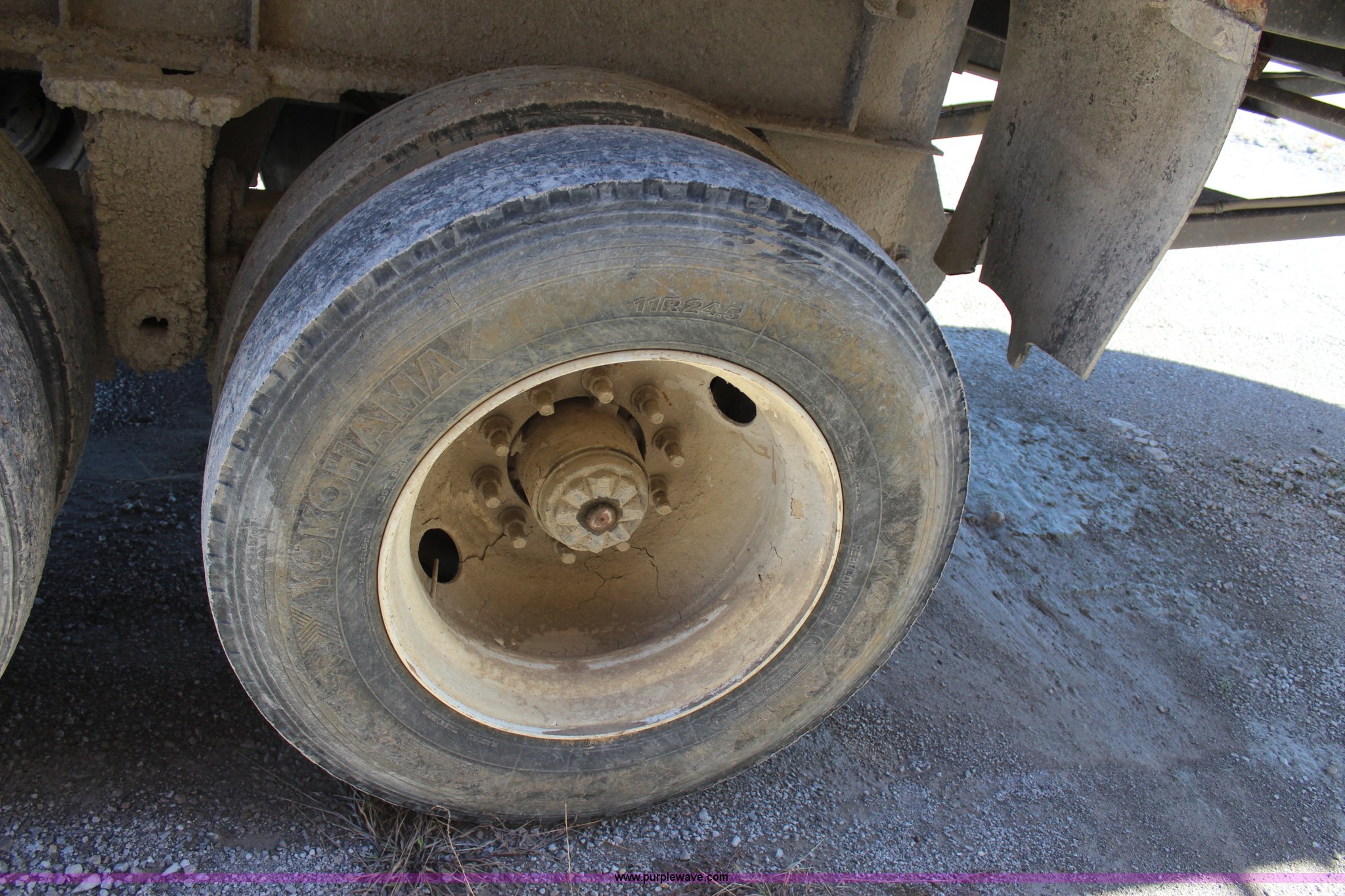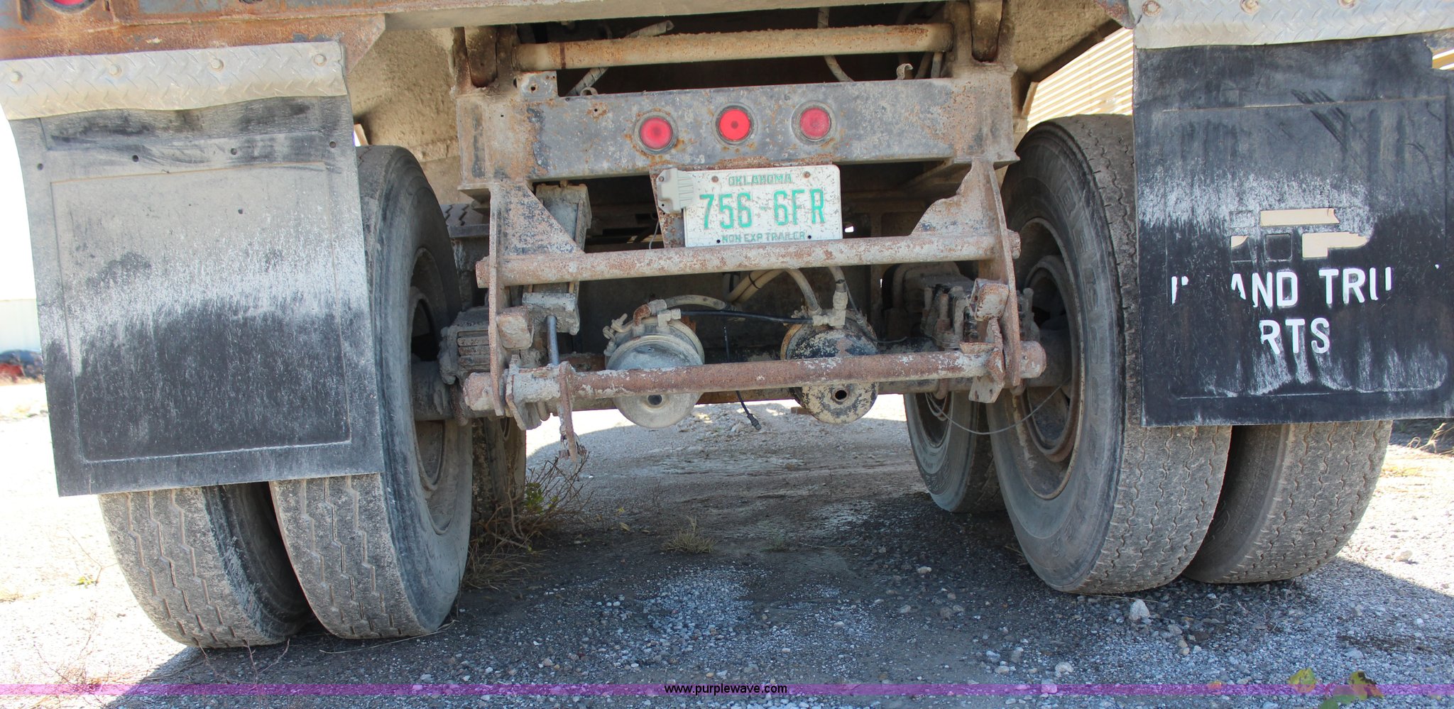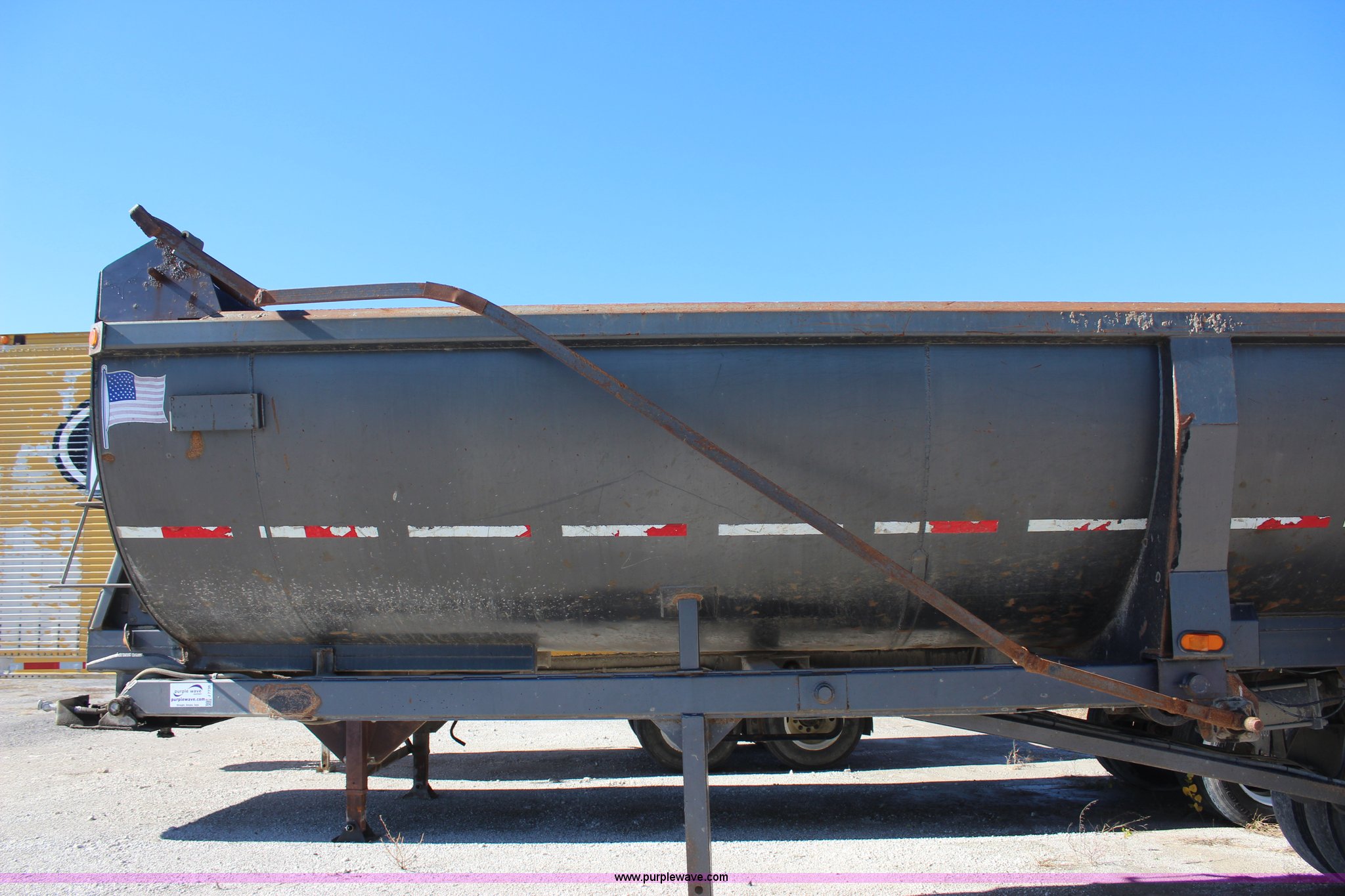Purple Wave is selling a used End Dump Rock Trailer in Oklahoma. This item is a 1999 Travis HRS end dump trailer with the following: 26' overall length, Dual cylinder hoist, End gate, Tarp, Dual leg landing gear, Missing one leg, Fifth wheel plate, Spring suspension, Air brakes, Tandem axle, 11R24.5 tires, GVWR 68,000 lbs, GAWR 20,000 lbs, Unit# 265