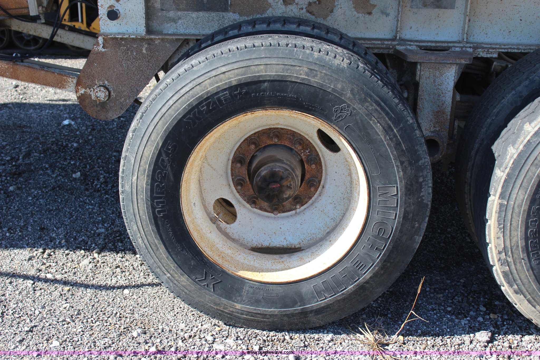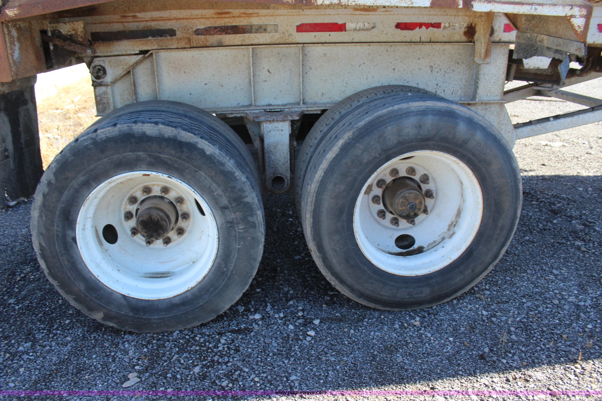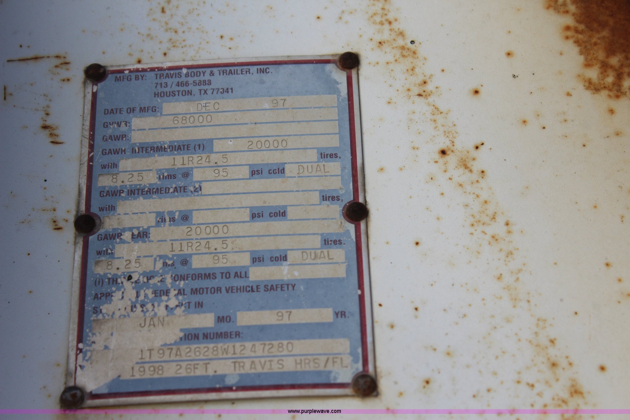 Purple Wave is selling a used End Dump Rock Trailer in Oklahoma. This item is a 1998 Travis HRSFL end dump trailer with the following: 26' overall length, Hydraulic cylinder, Air operated end gate, Electric tarp, Dual leg landing gear, Fifth wheel plate, Spring suspension, Air brakes, Tandem axle, 11R24.5 tires, GVWR 68,000 lbs