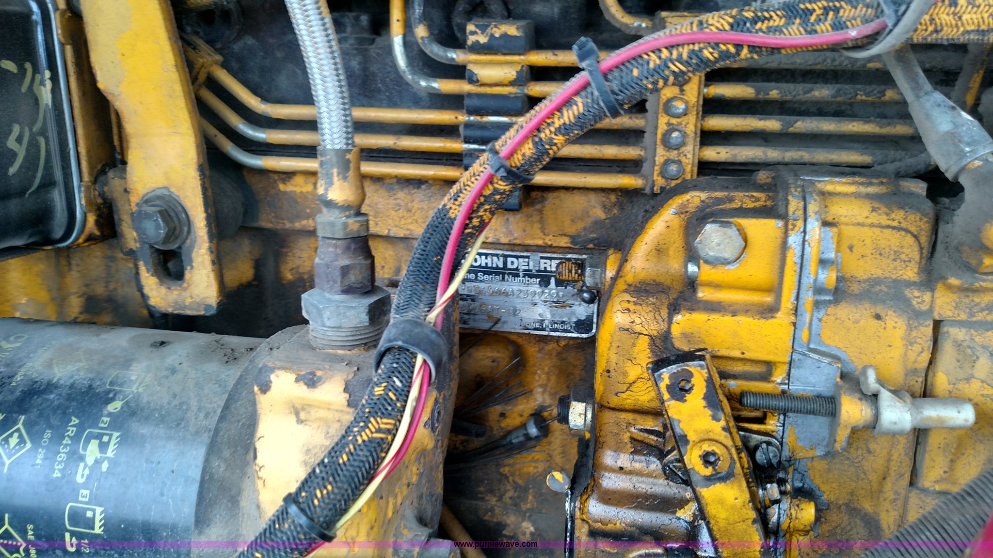 Purple Wave is selling a used Wheel Loader in Kansas. This item is a 1983 John Deere 644C wheel loader with the following: 6,341 hours on meter, John Deere six cylinder diesel engine, 2F-1R gears, Joystick loader controls, 103"W bucket, Three cubic yard capacity, (4) Dymax 60"L x 6"W forks, Pin hitch, 20.5-25 tires, 25,234 lbs. base operating weight, Recently replaced starter, Transmission may be weak, Serial DW644CB500026
