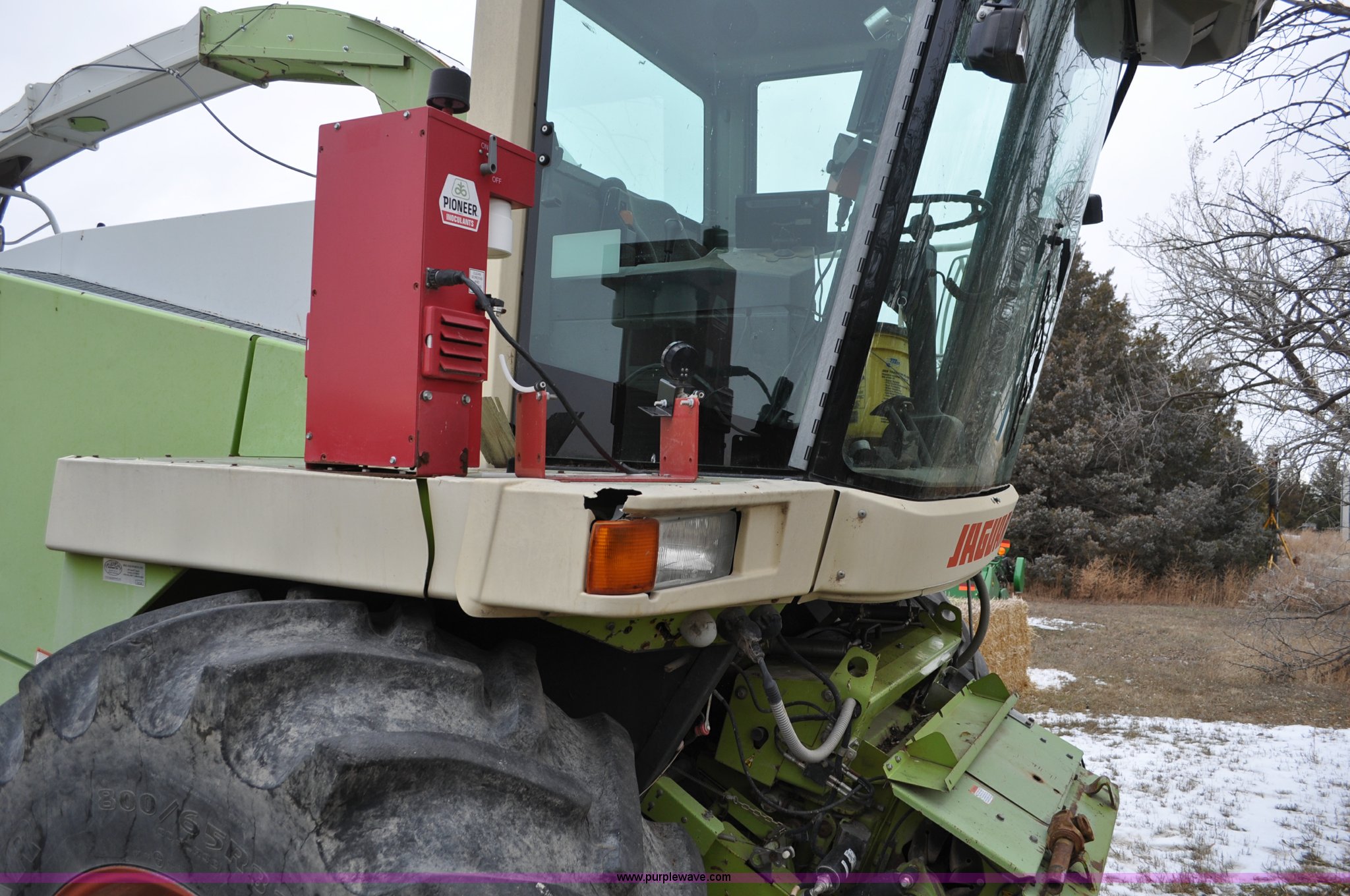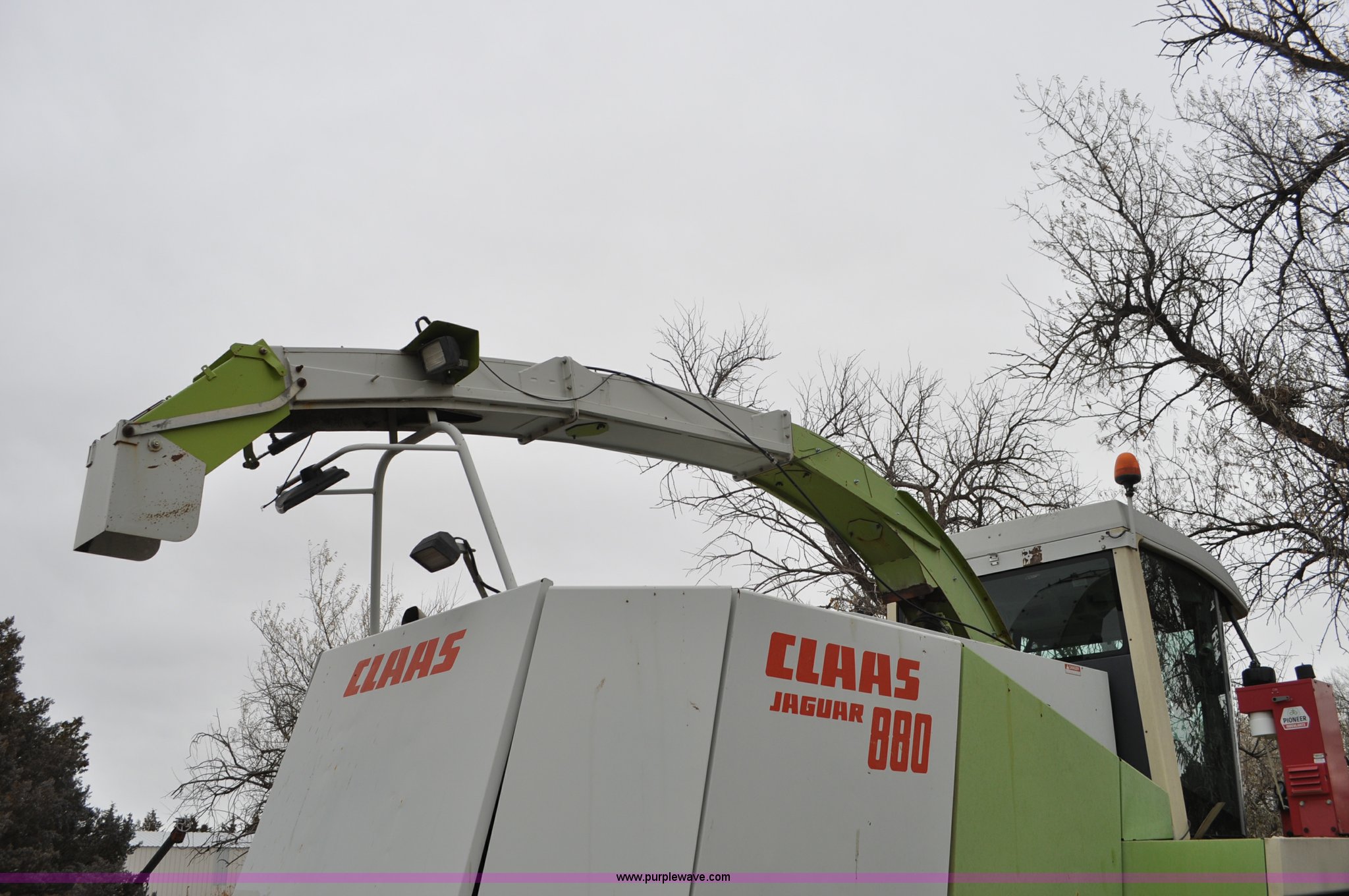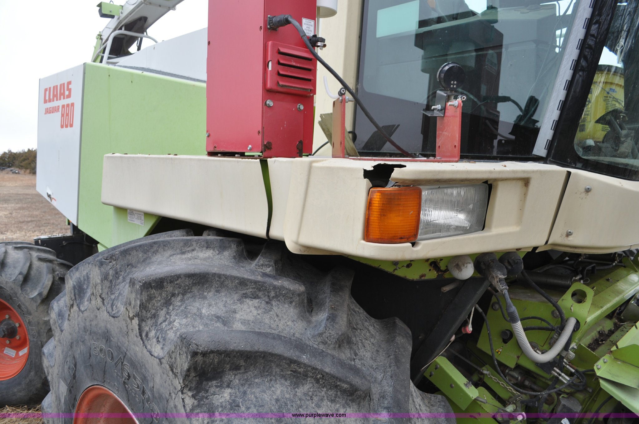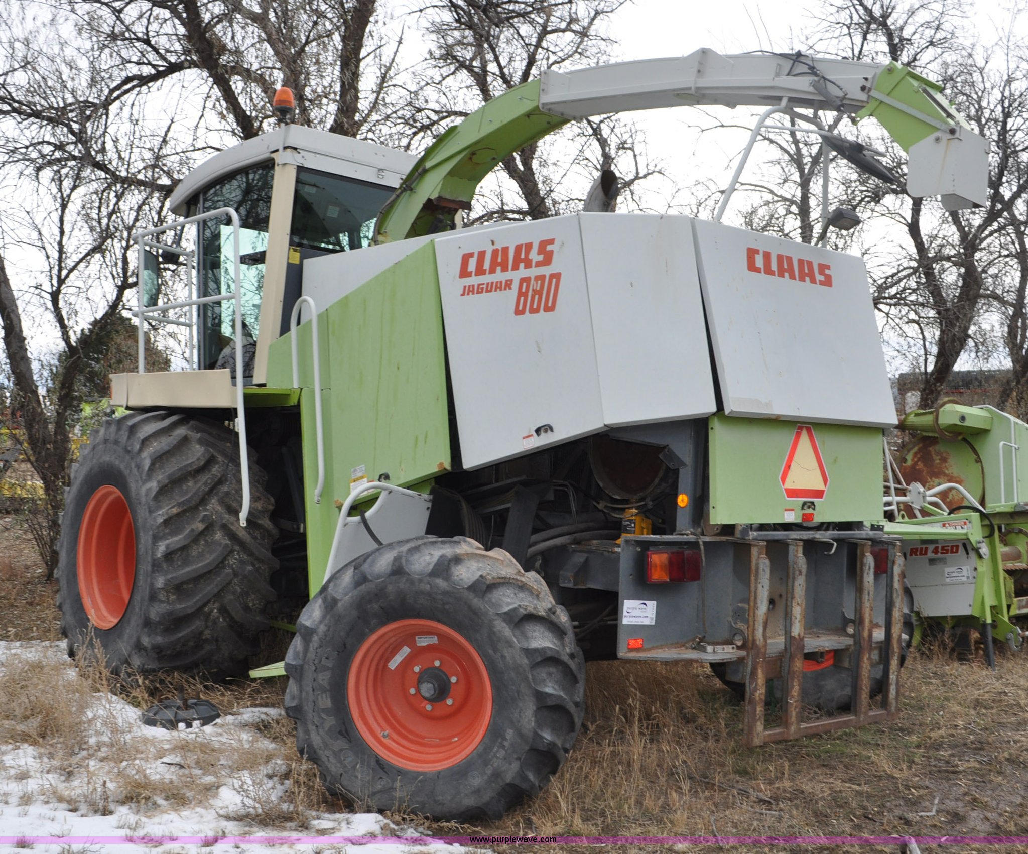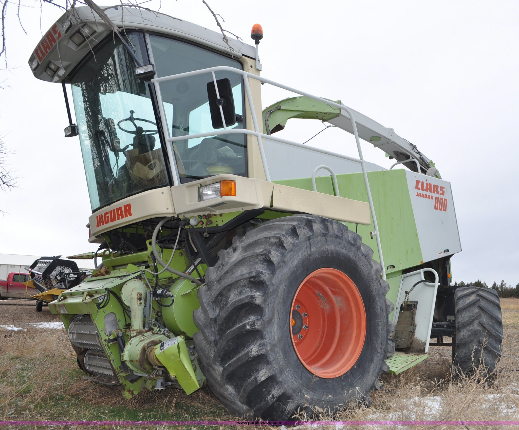 Purple Wave is selling a used Forage Harvester in Colorado. This item is a 2000 Claas Jaguar 880 forage harvester with the following: Unknown hours on meter, Mercedes-Benz OM442 eight cylinder turbo diesel engine, Hydrostatic transmission, AC and heat, Tilt steering wheel, AM/FM, Air suspension seat, Instructor's seat, Pioneer Ap system, Auto lube, Silage additive spray system, Hydraulic adjust spout, 800/65R32 front tires, 540/65R24 rear tires, Some parts may be missing, Machine has been partially disassembled, Unknown operating condition, Serial 491-03431
