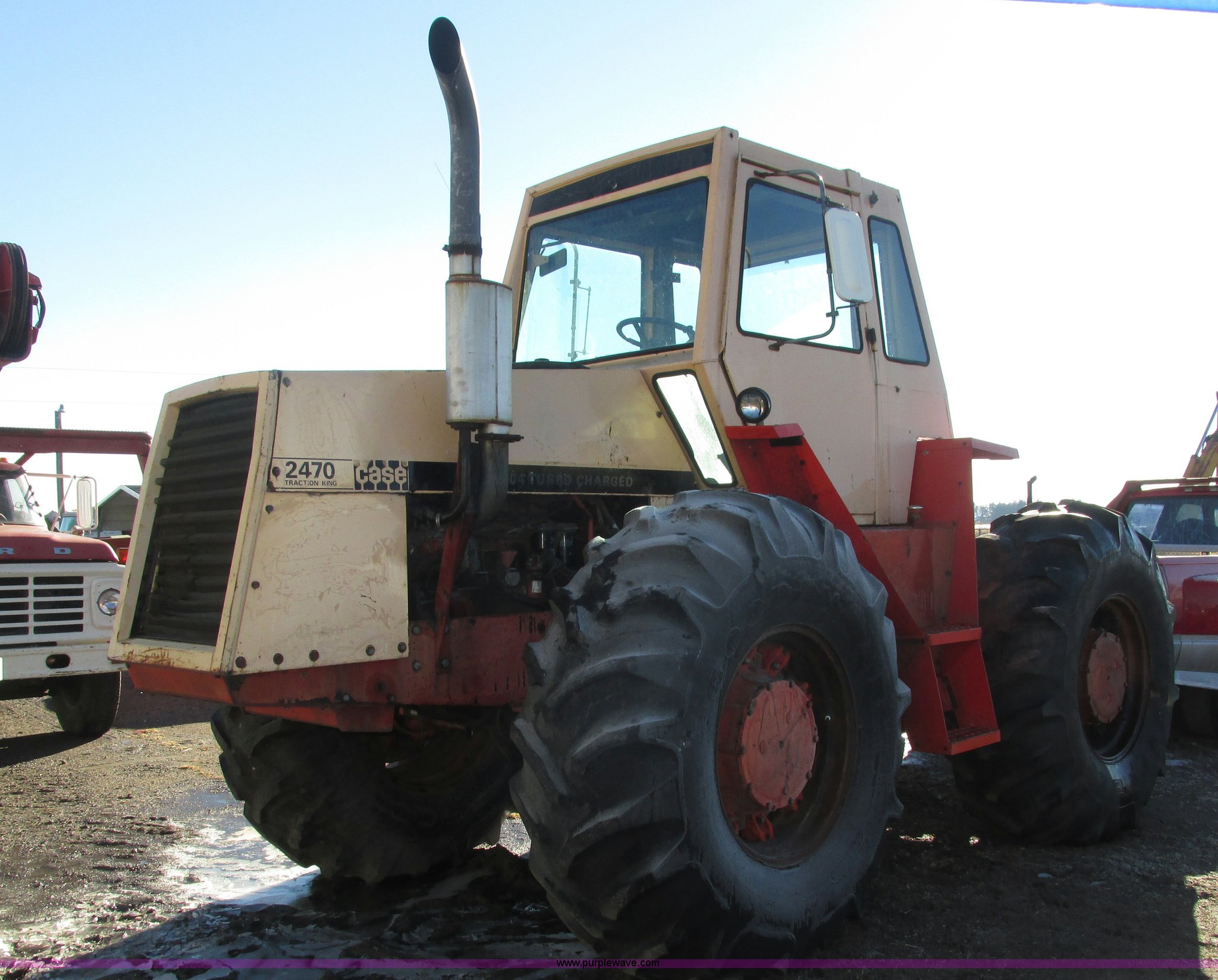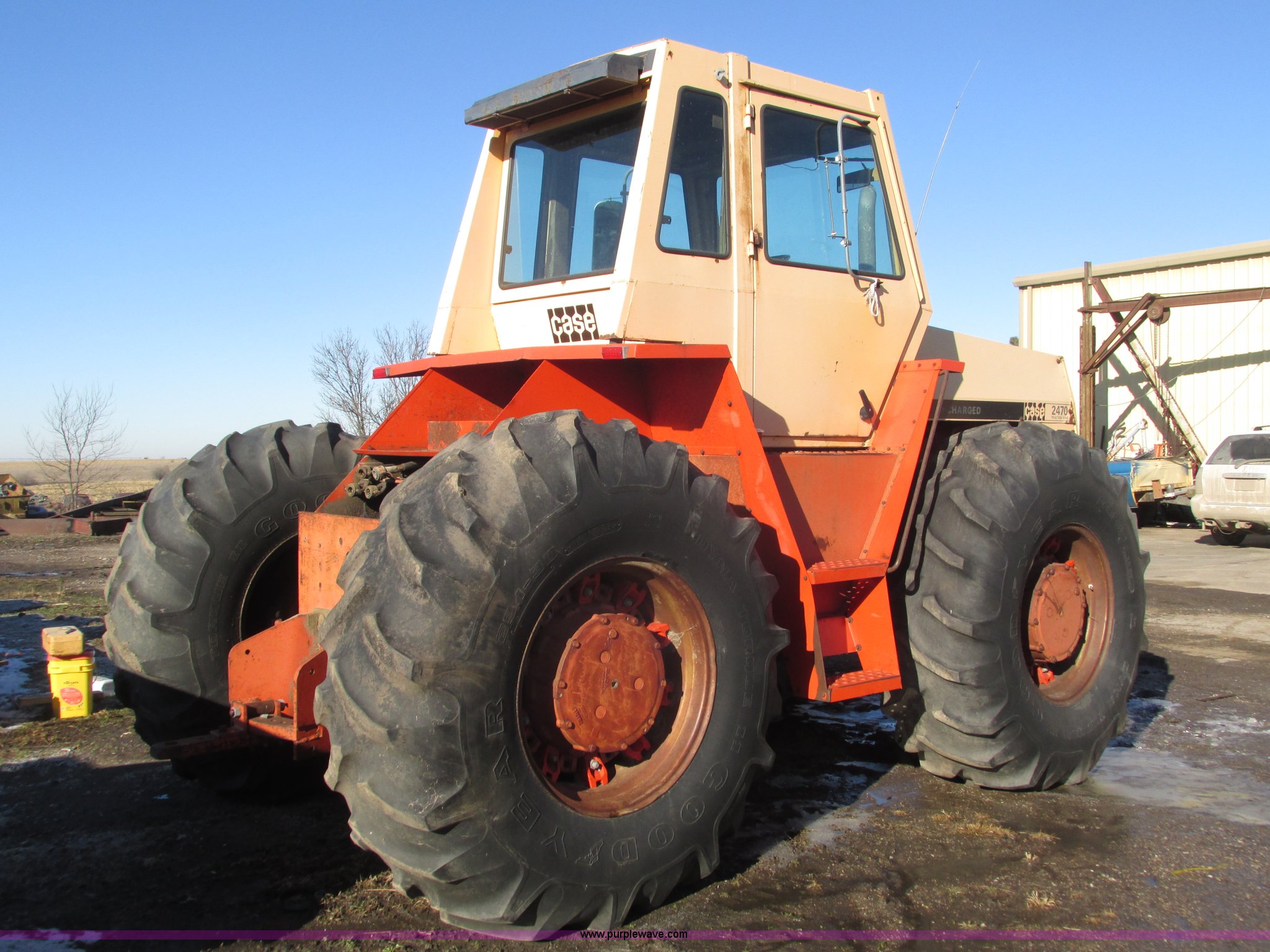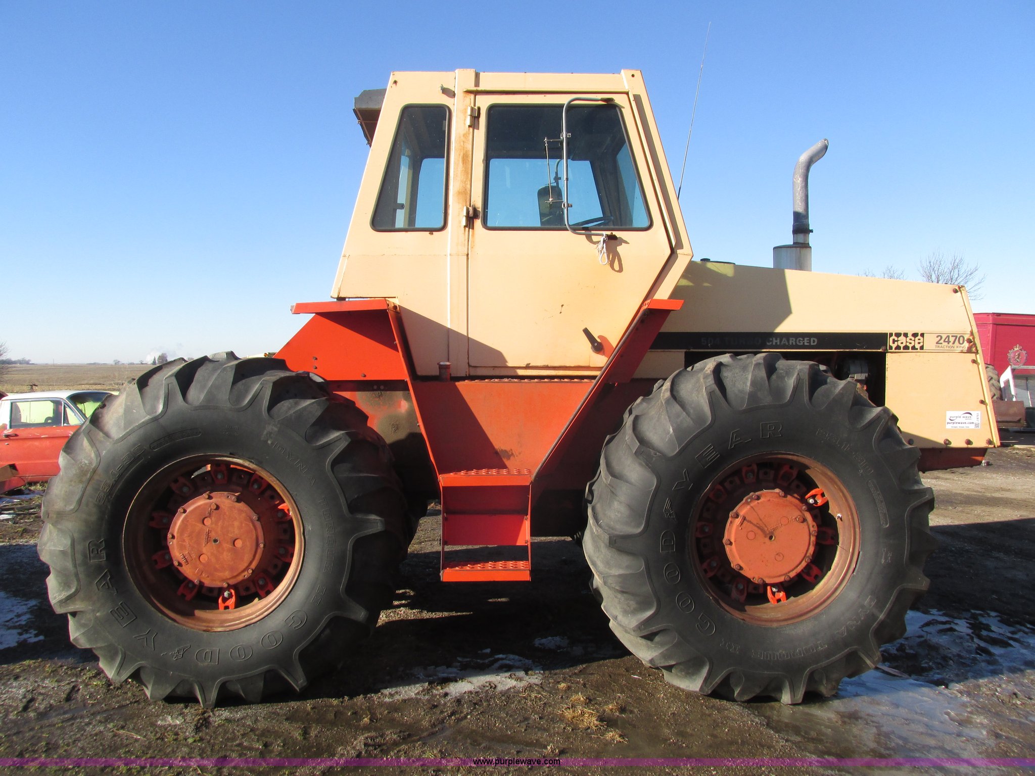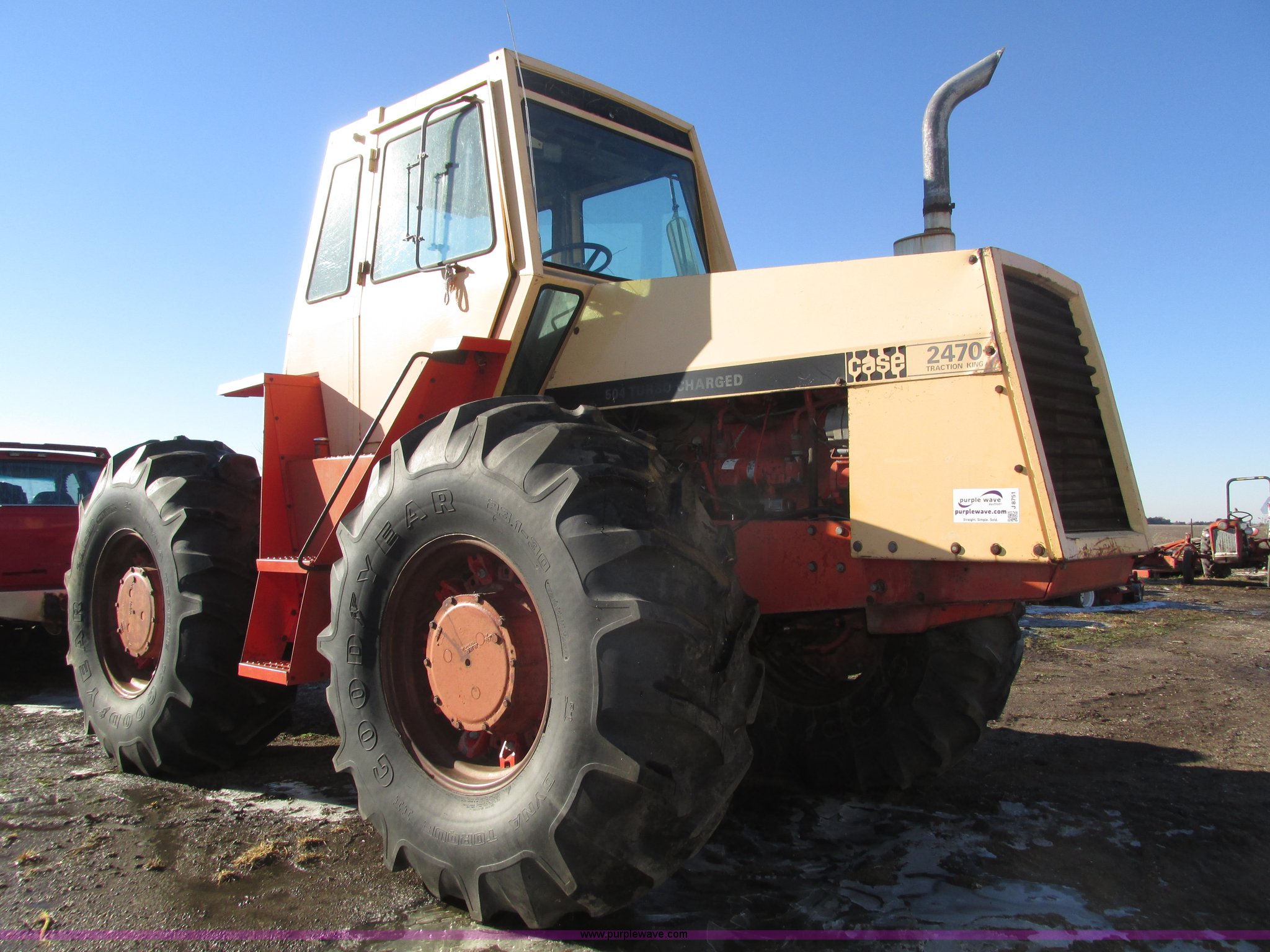 Purple Wave is selling a used Tractor in Nebraska. This item is a 1972 Case 2470 Traction King 4WD tractor with the following: 4,435 hours on meter, J.I. Case 504 8.3L six cylinder turbo diesel engine, Powershift transmission, 12F-2R gears, Four wheel steer, AC and heat, Tilt steering wheel, Suspension seat, Block heater, Glow plugs, Draw bar, (2) rear hydraulic remote sets, 110 gallon fuel capacity, Goodyear 23.1-20 tires, Seat cover missing, Batteries will be installed and hooked up prior to auction, Serial 8692407