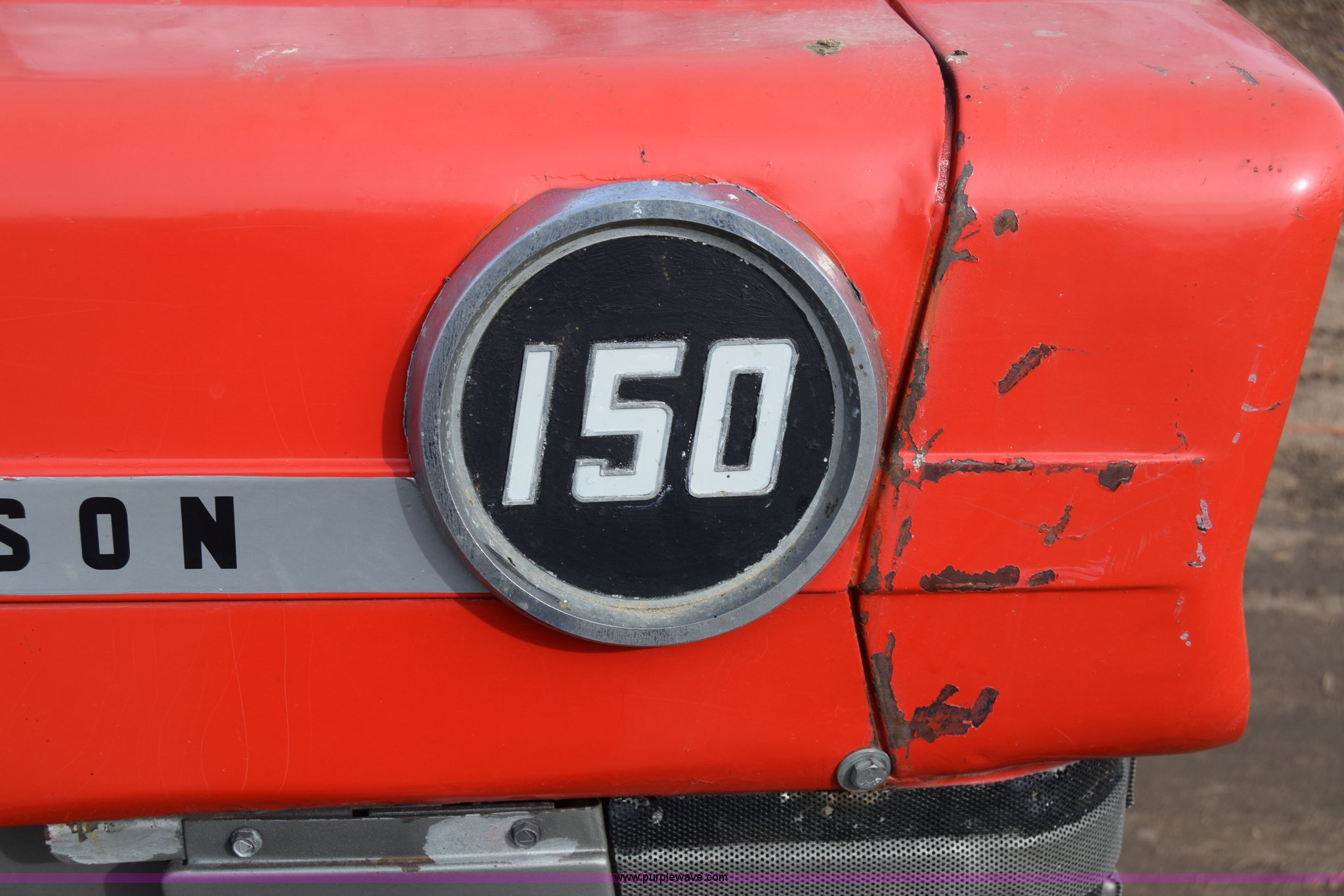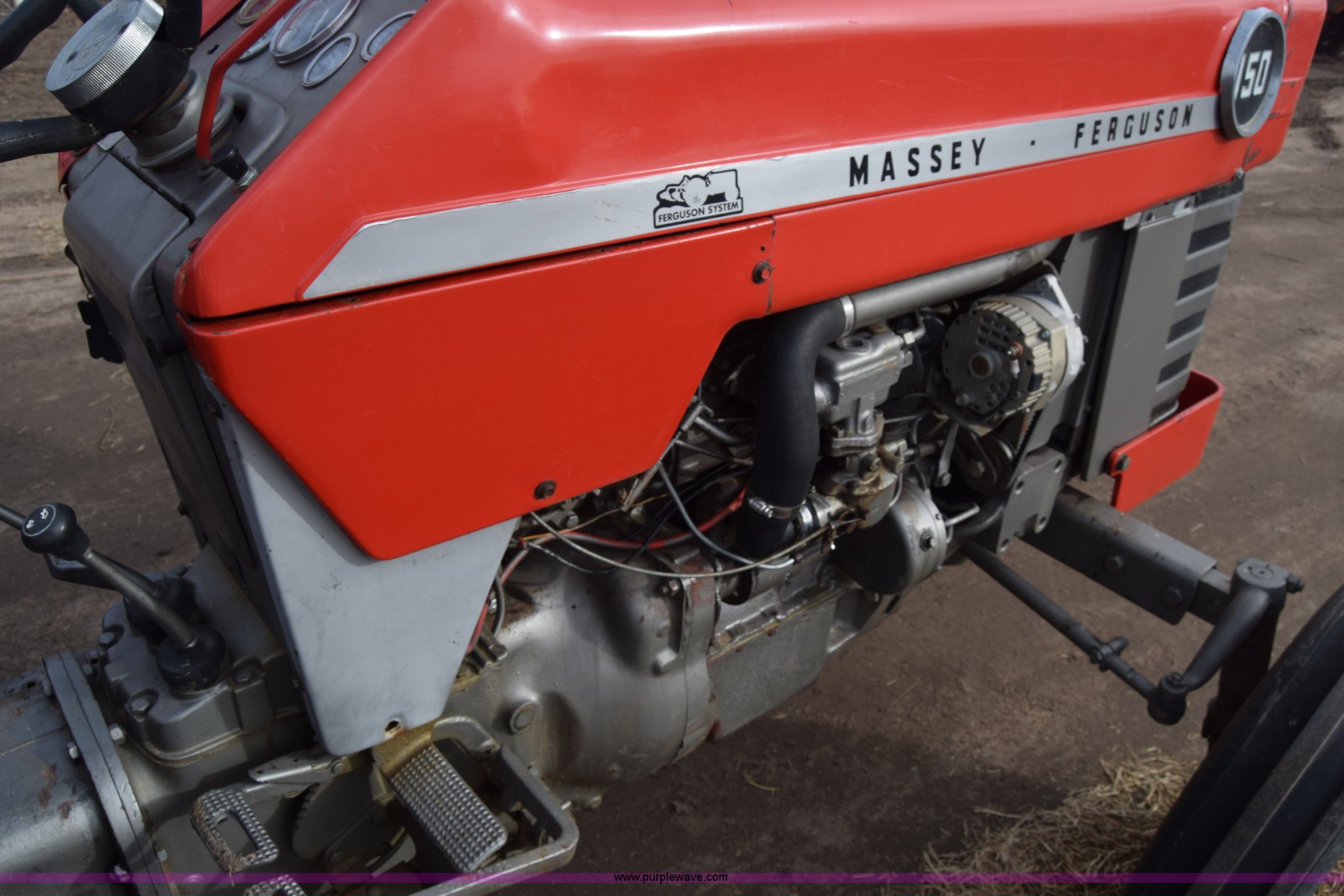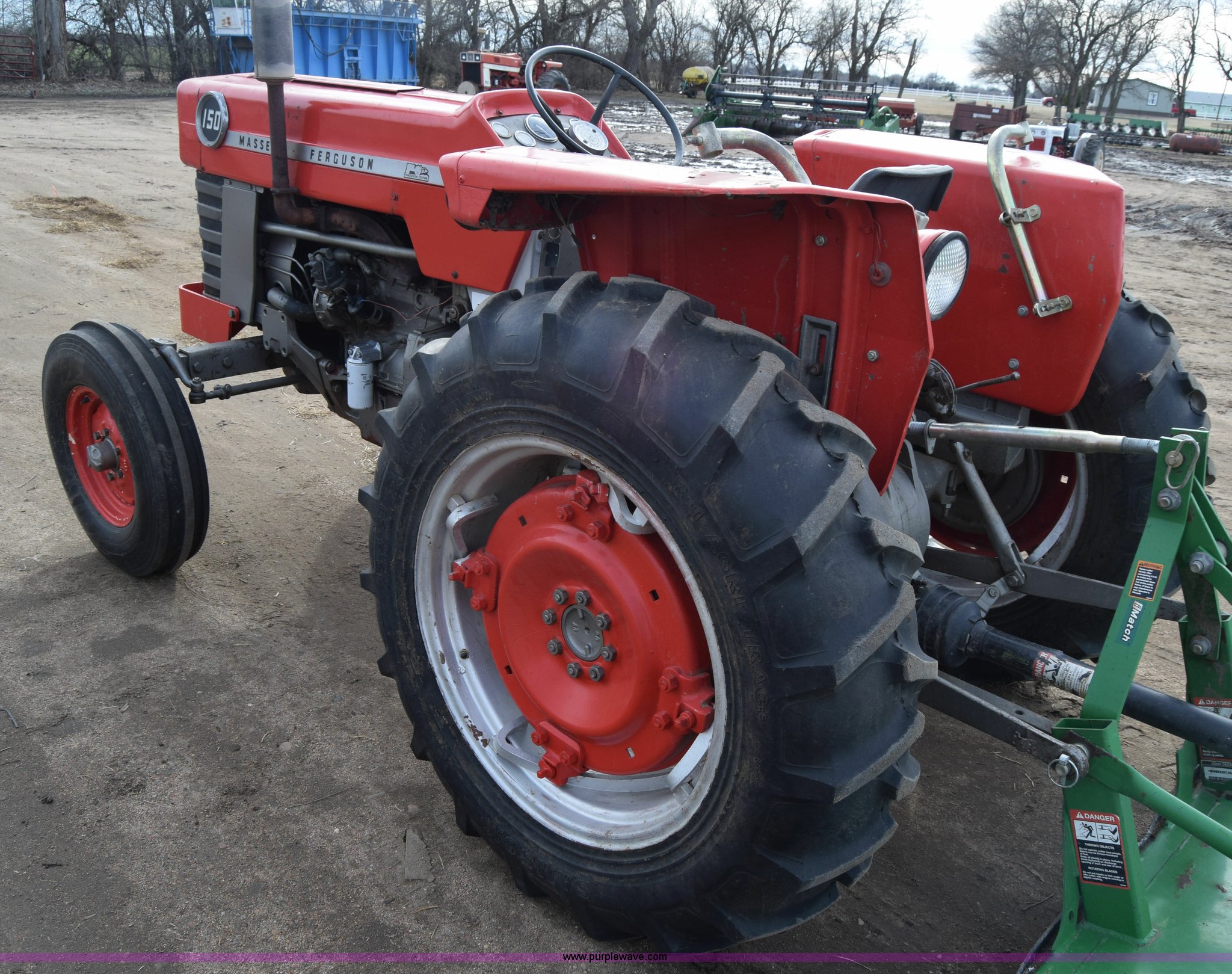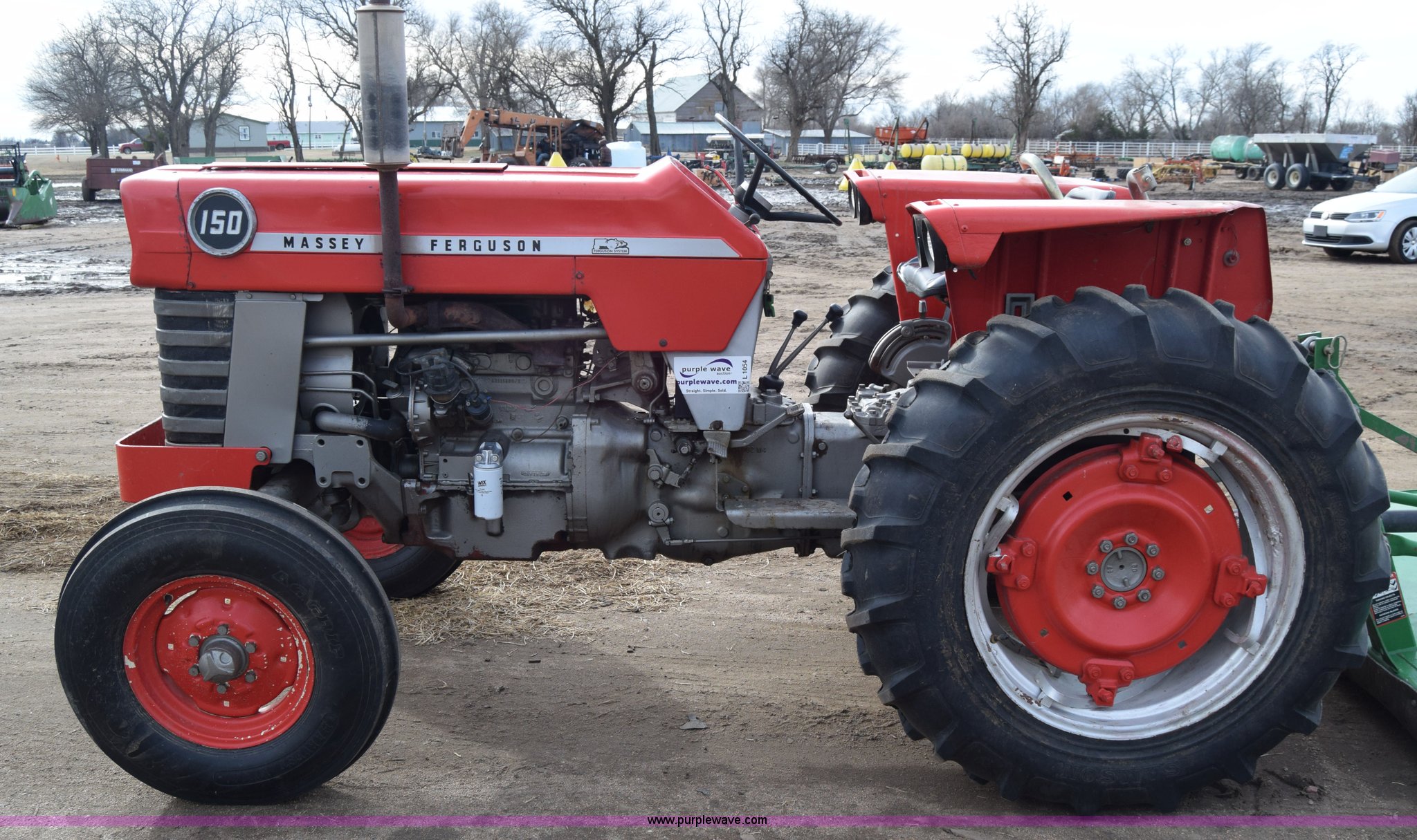 Purple Wave is selling a used Tractor in Kansas. This item is a Massey-Ferguson 150 tractor with the following: 9,292 hours on meter, Continental 2.4L four cylinder gas engine, 45 HP, Manual transmission, 8F-2R gears, Suspension seat, Work lights, Three point, 540 PTO, 18.5 gallon fuel tank, 81" wheelbase, 7.50-16 front tires, 12.4-28 rear tires, Rotary mower not included