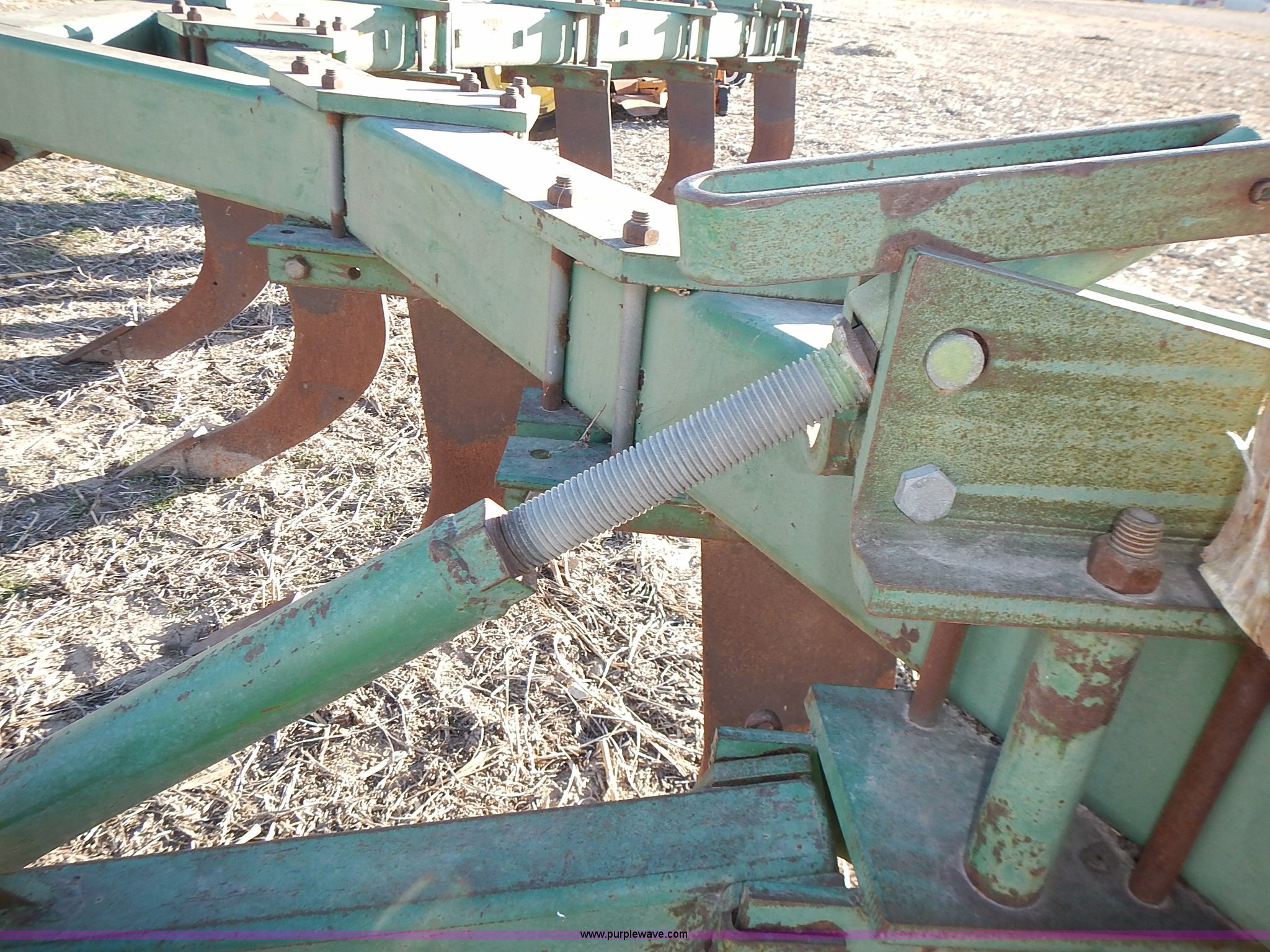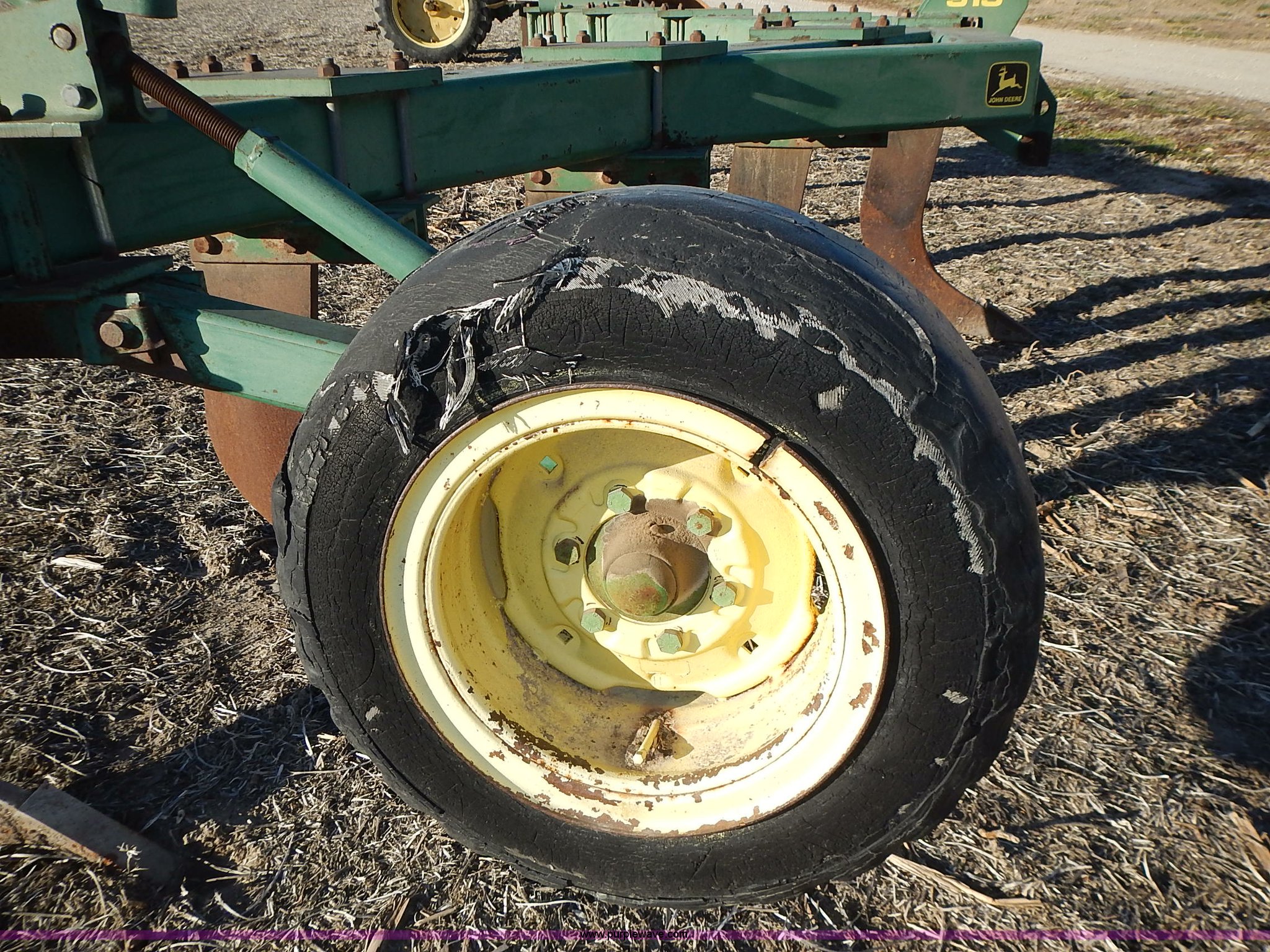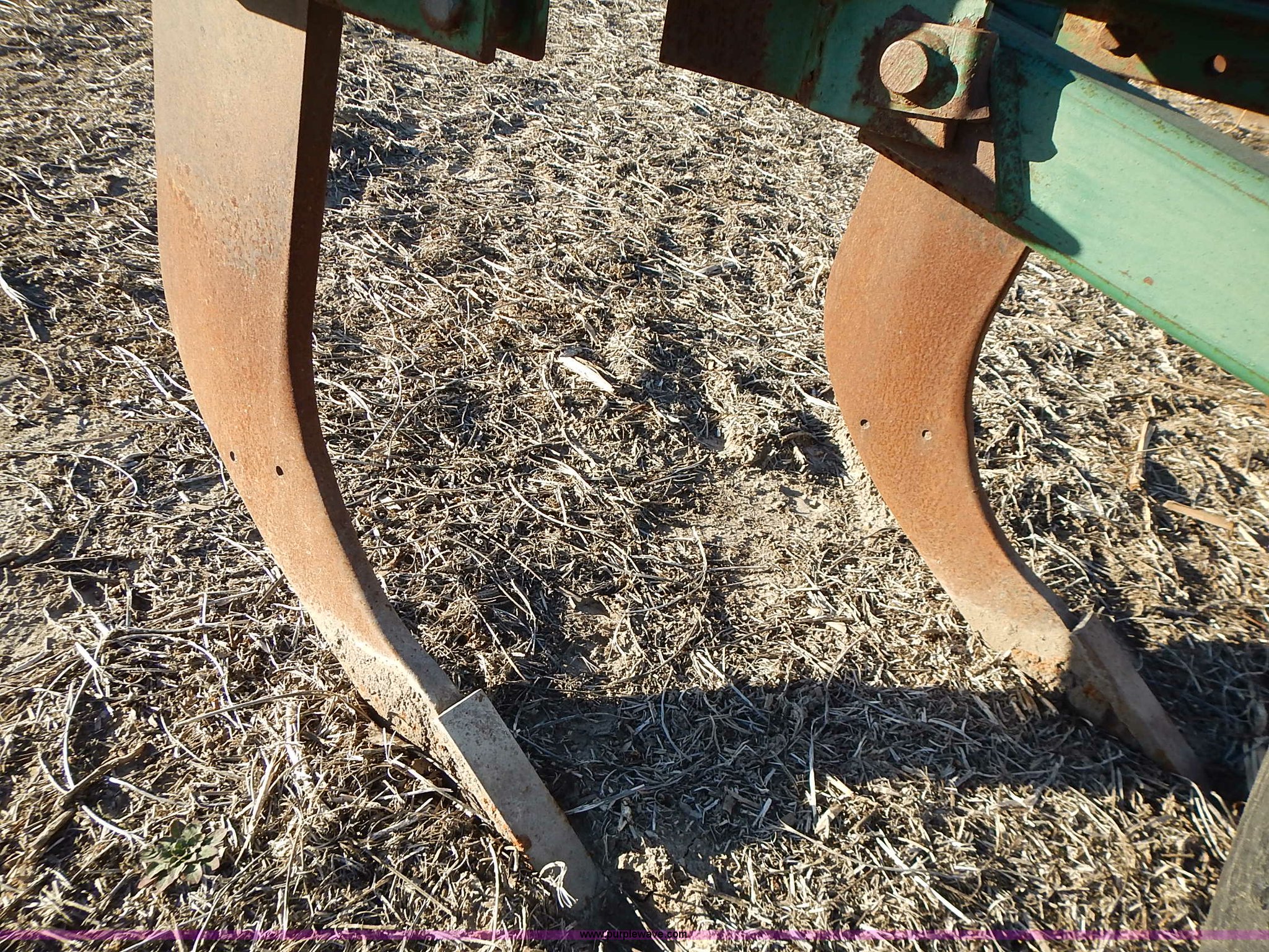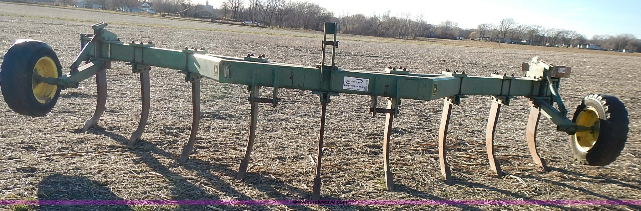 Purple Wave is selling a used Ripper in Kansas. This item is a John Deere 915 V ripper with the following: 17.5'W, (9) shanks, 24" spacing, Three point, Tires worn, Serial N00915X000424