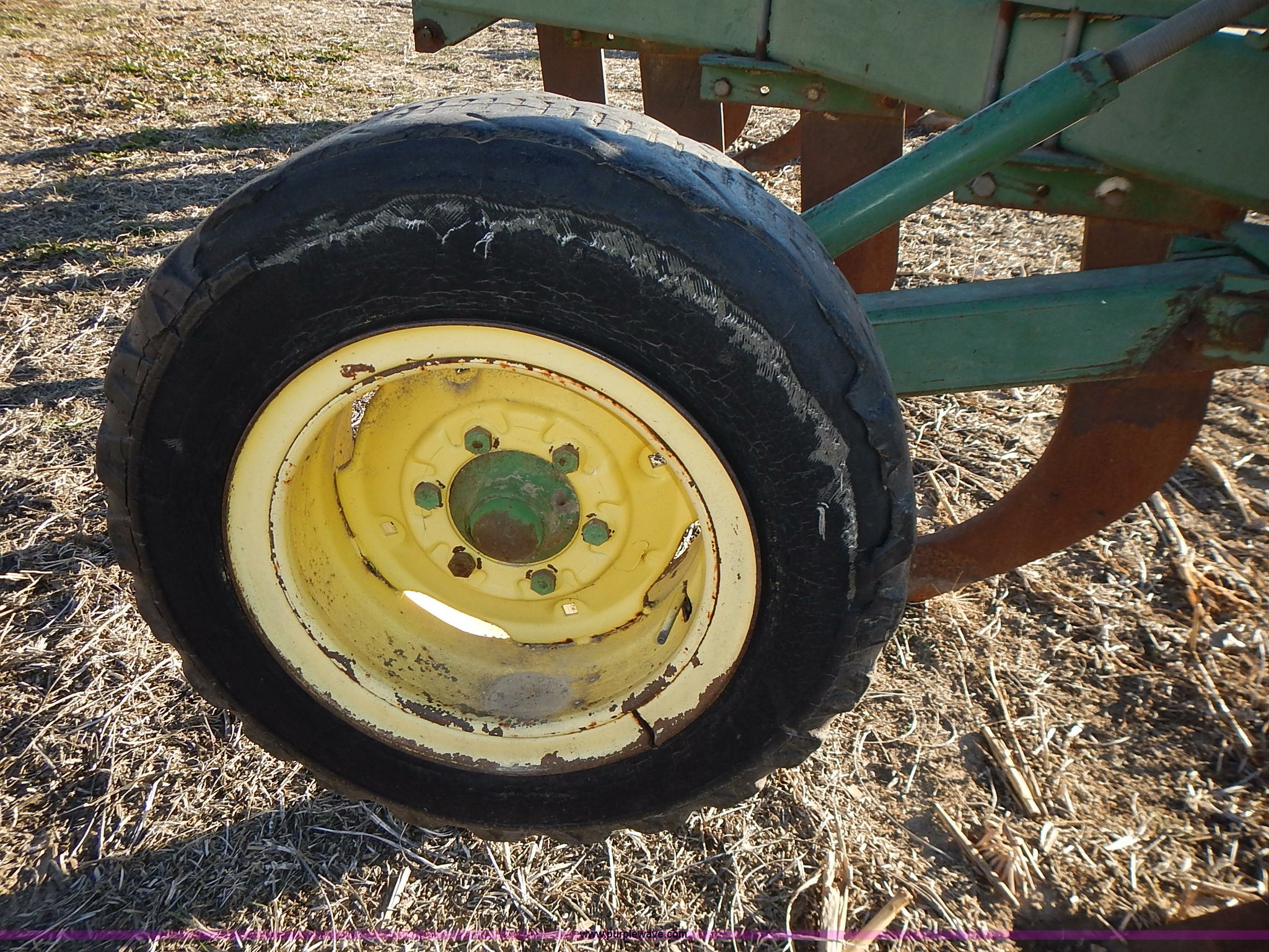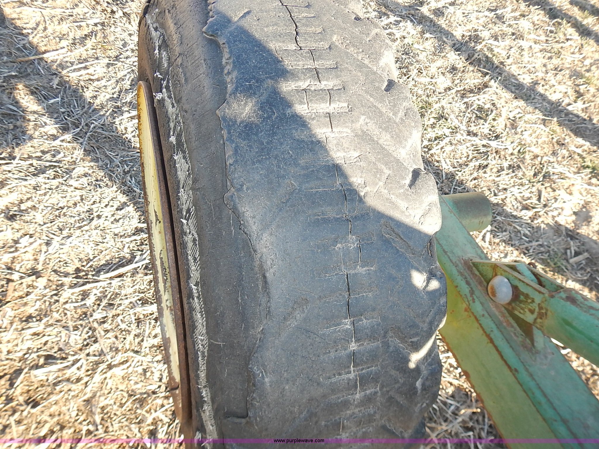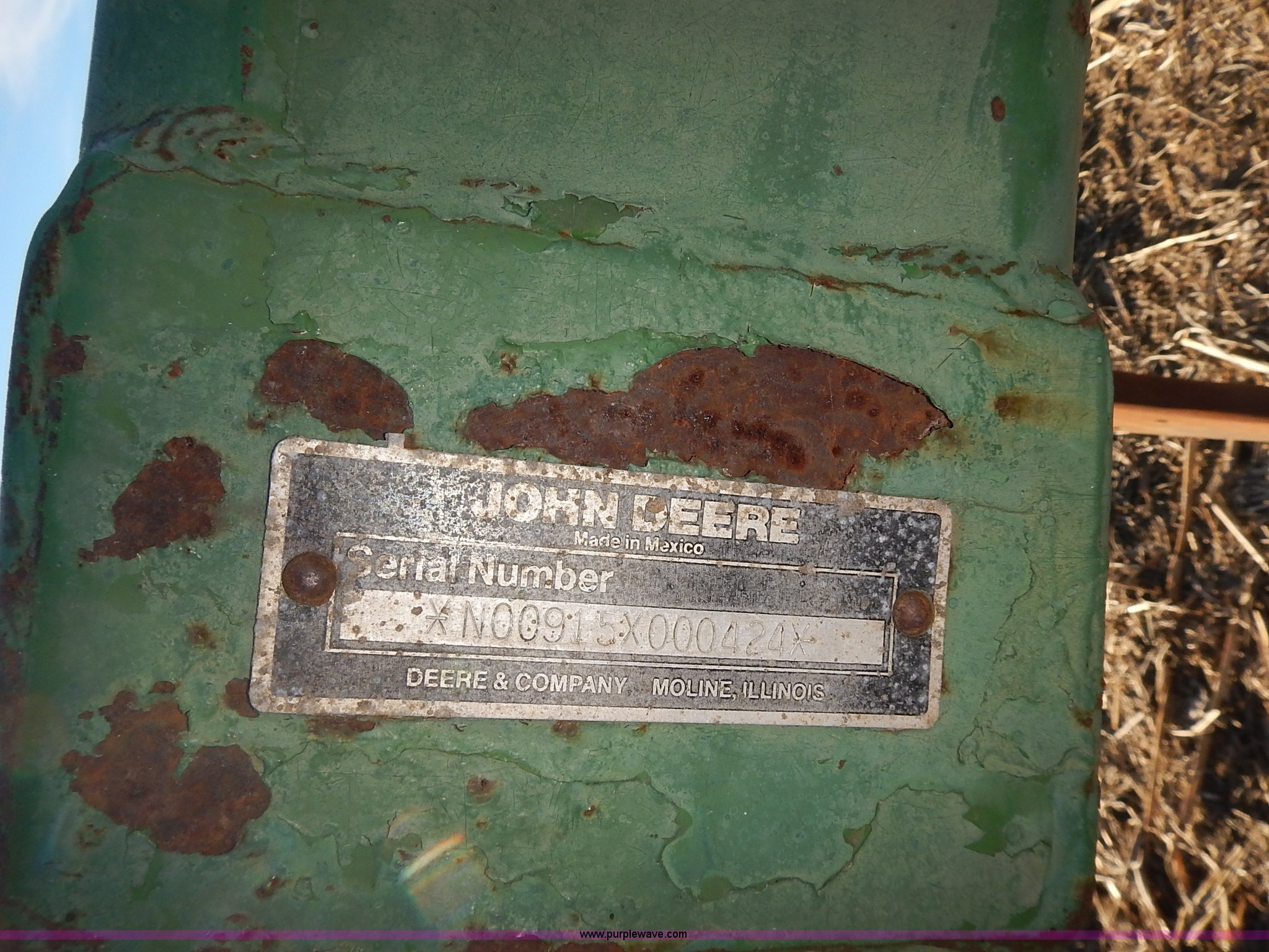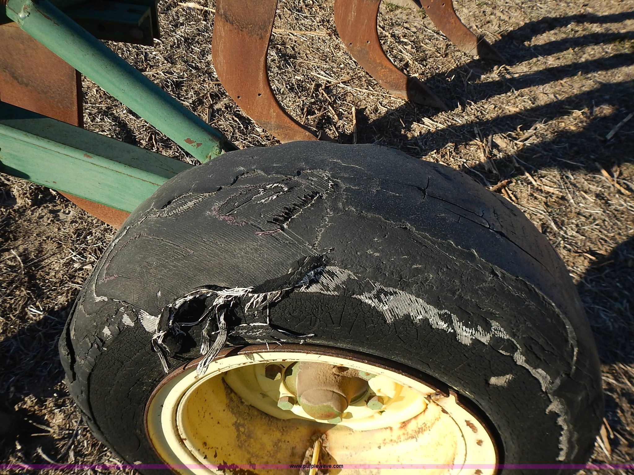 Purple Wave is selling a used Ripper in Kansas. This item is a John Deere 915 V ripper with the following: 17.5'W, (9) shanks, 24" spacing, Three point, Tires worn, Serial N00915X000424