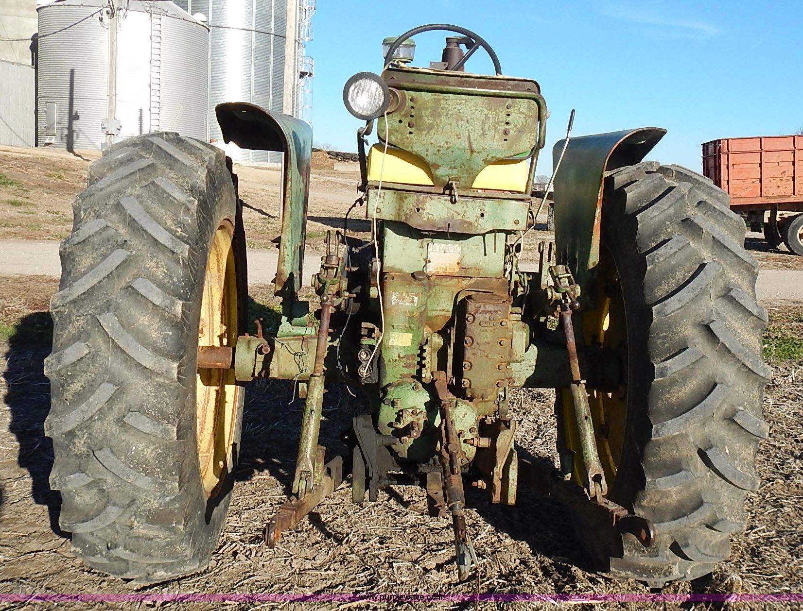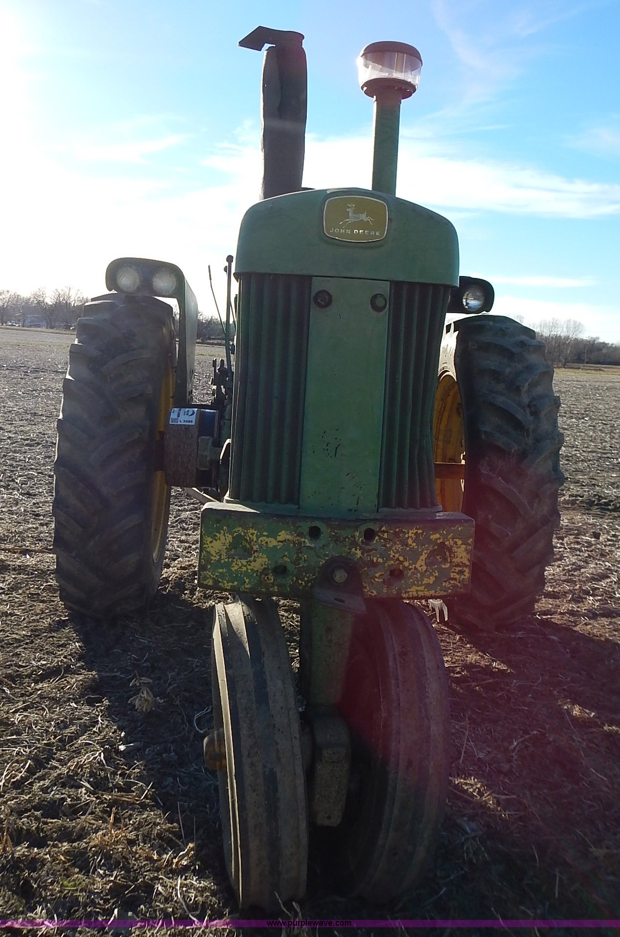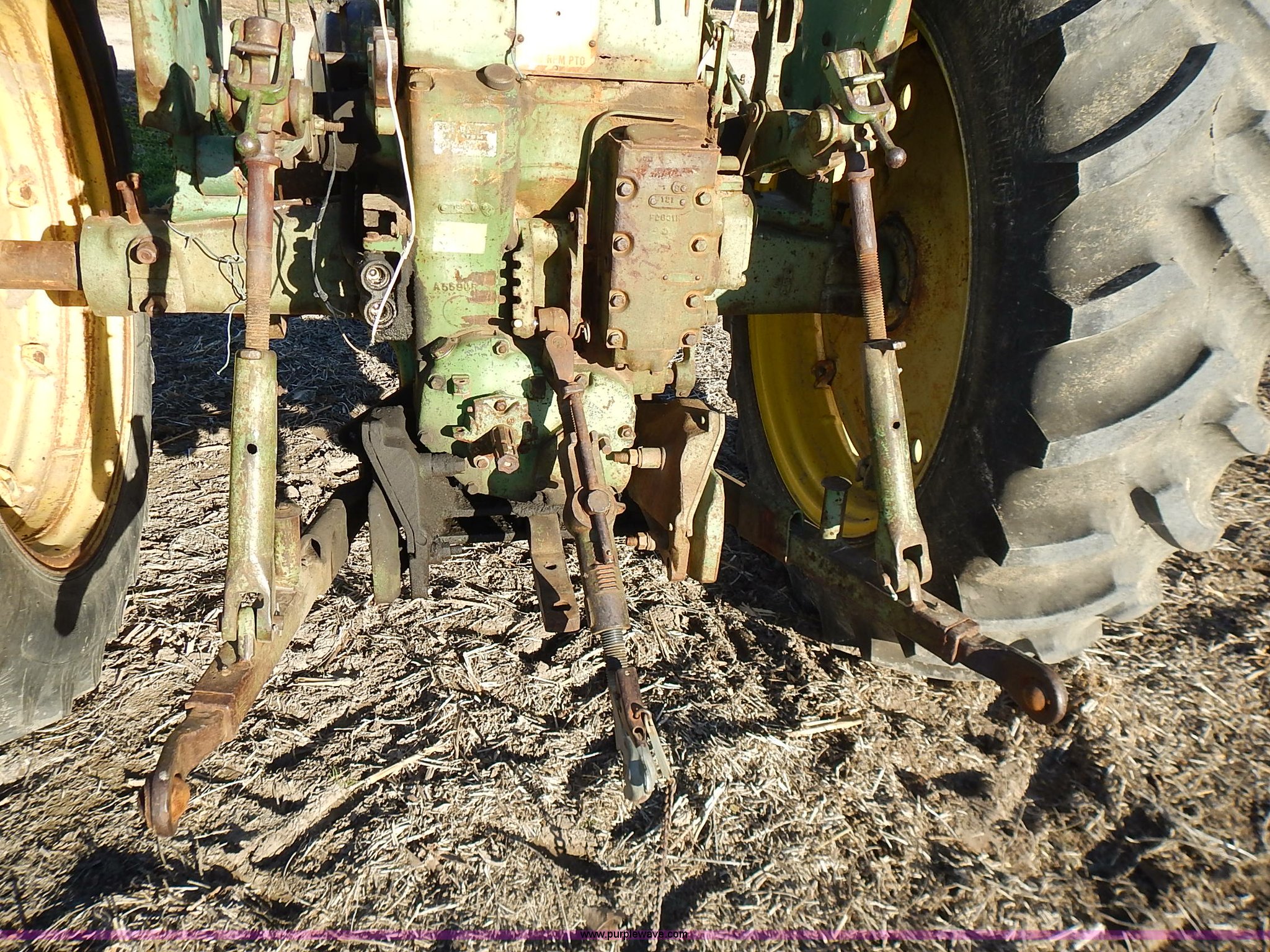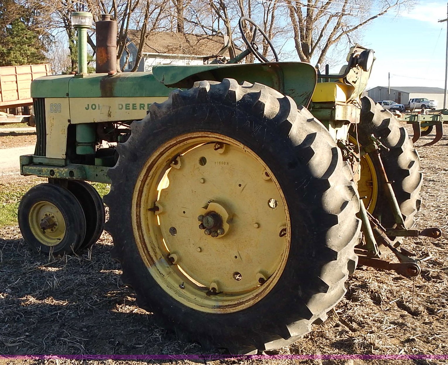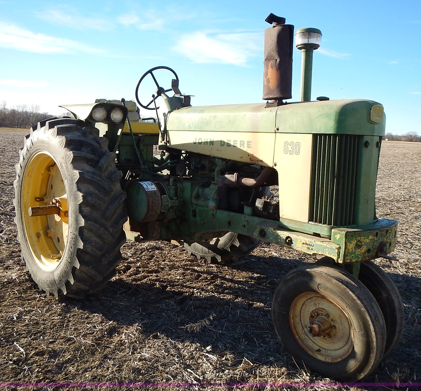 John Deere 630 tractor. 3,617 hours on meter, John Deere two cylinder gas engine, 6F-1R gears, Front and rear work lights, Power steering, Side belt pulley, Three point, 540 PTO, Draw bar, Rear hydraulic remote set, Regency 6.00-16 front tires, Titan 15.5-38 rear tires, Dents, Scratches, Paint faded, Seat damage, Serial 6309665. Lawrence, KS 66044