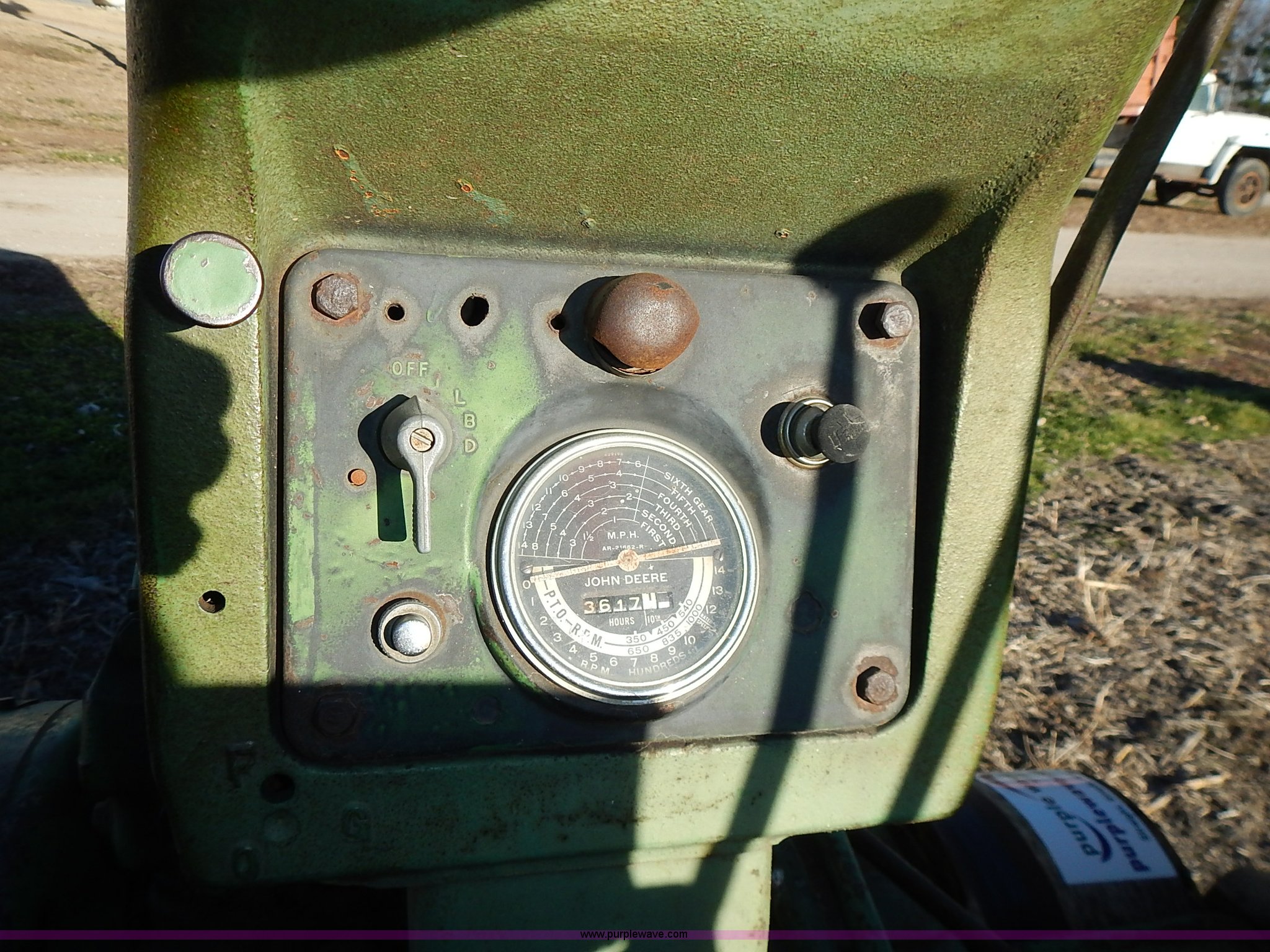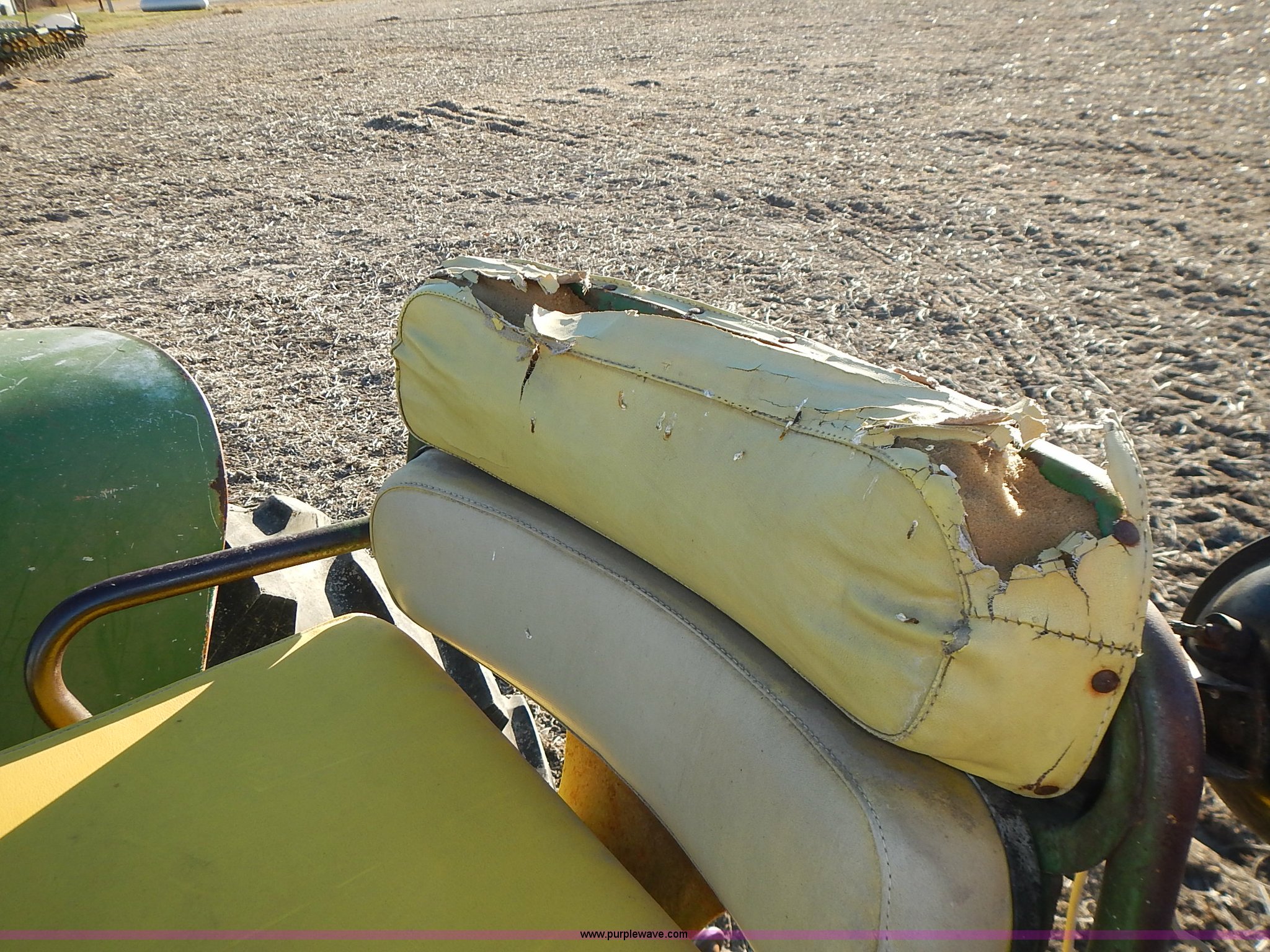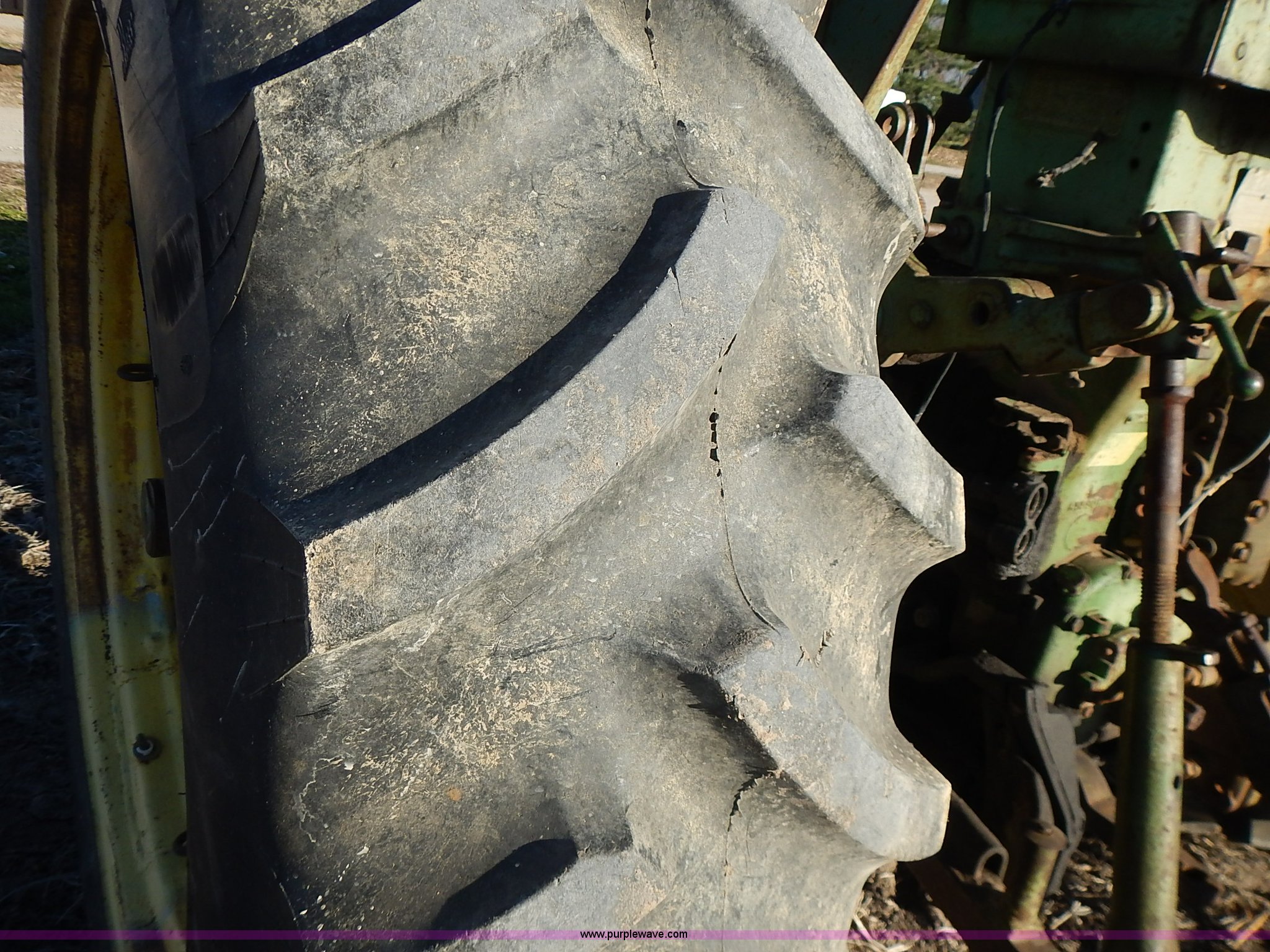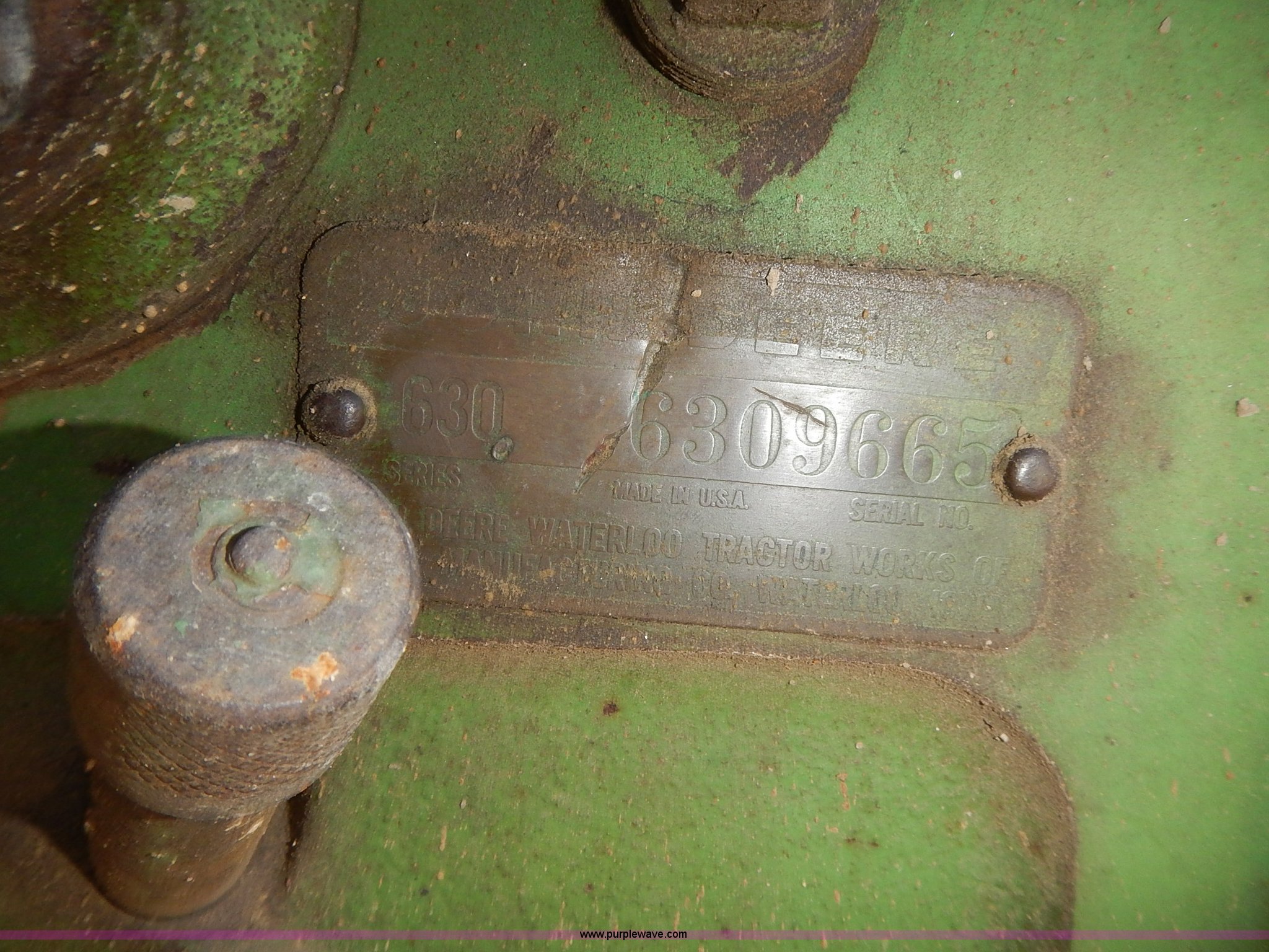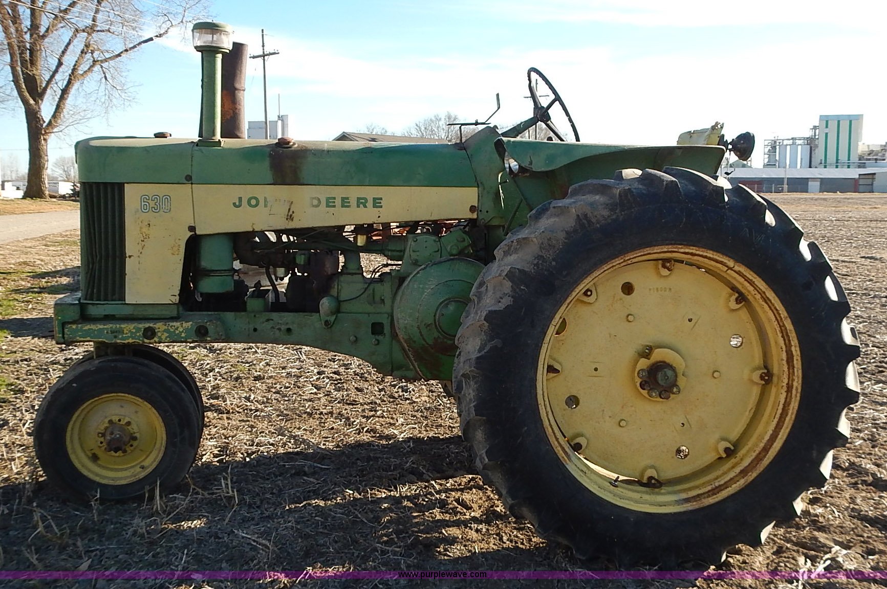 Purple Wave is selling a used Tractor in Kansas. This item is a John Deere 630 tractor with the following: 3,617 hours on meter, John Deere two cylinder gas engine, 6F-1R gears, Front and rear work lights, Power steering, Side belt pulley, Three point, 540 PTO, Draw bar, Rear hydraulic remote set, Regency 6.00-16 front tires, Titan 15.5-38 rear tires, Dents, Scratches, Paint faded, Seat damage, Serial 6309665