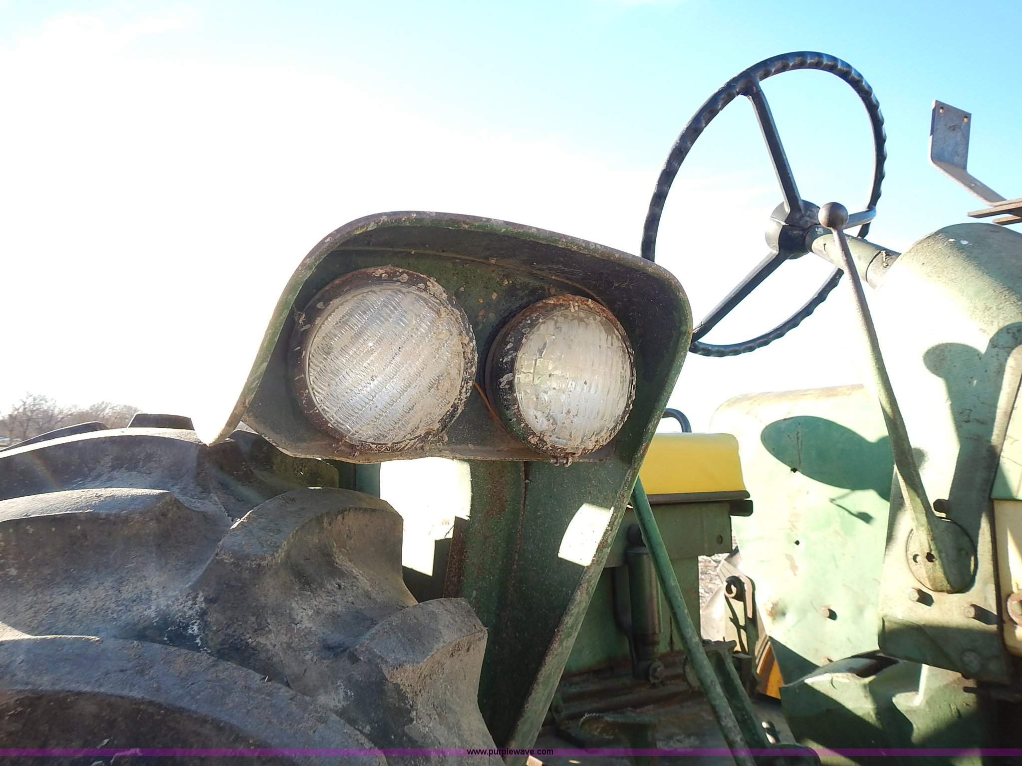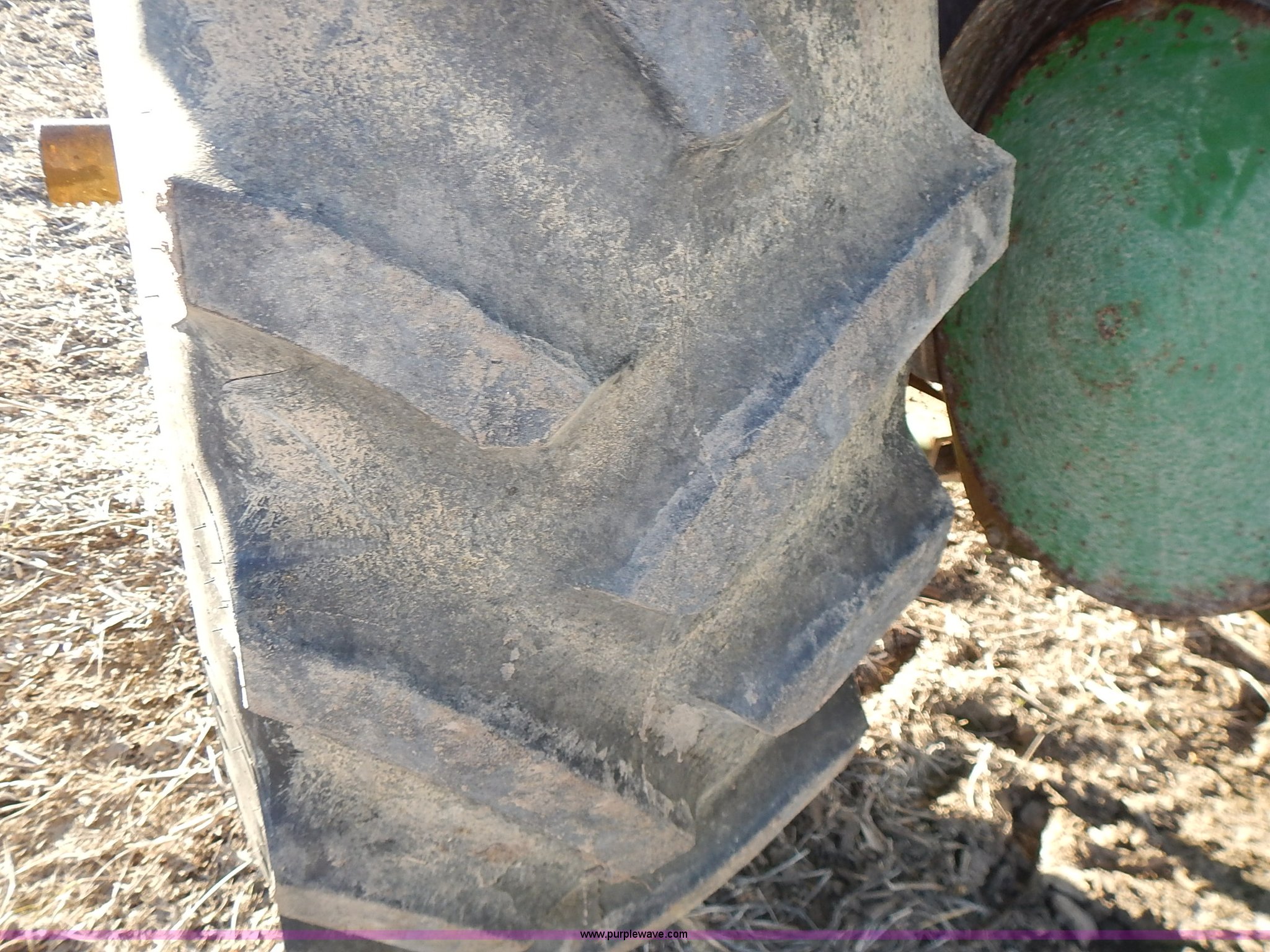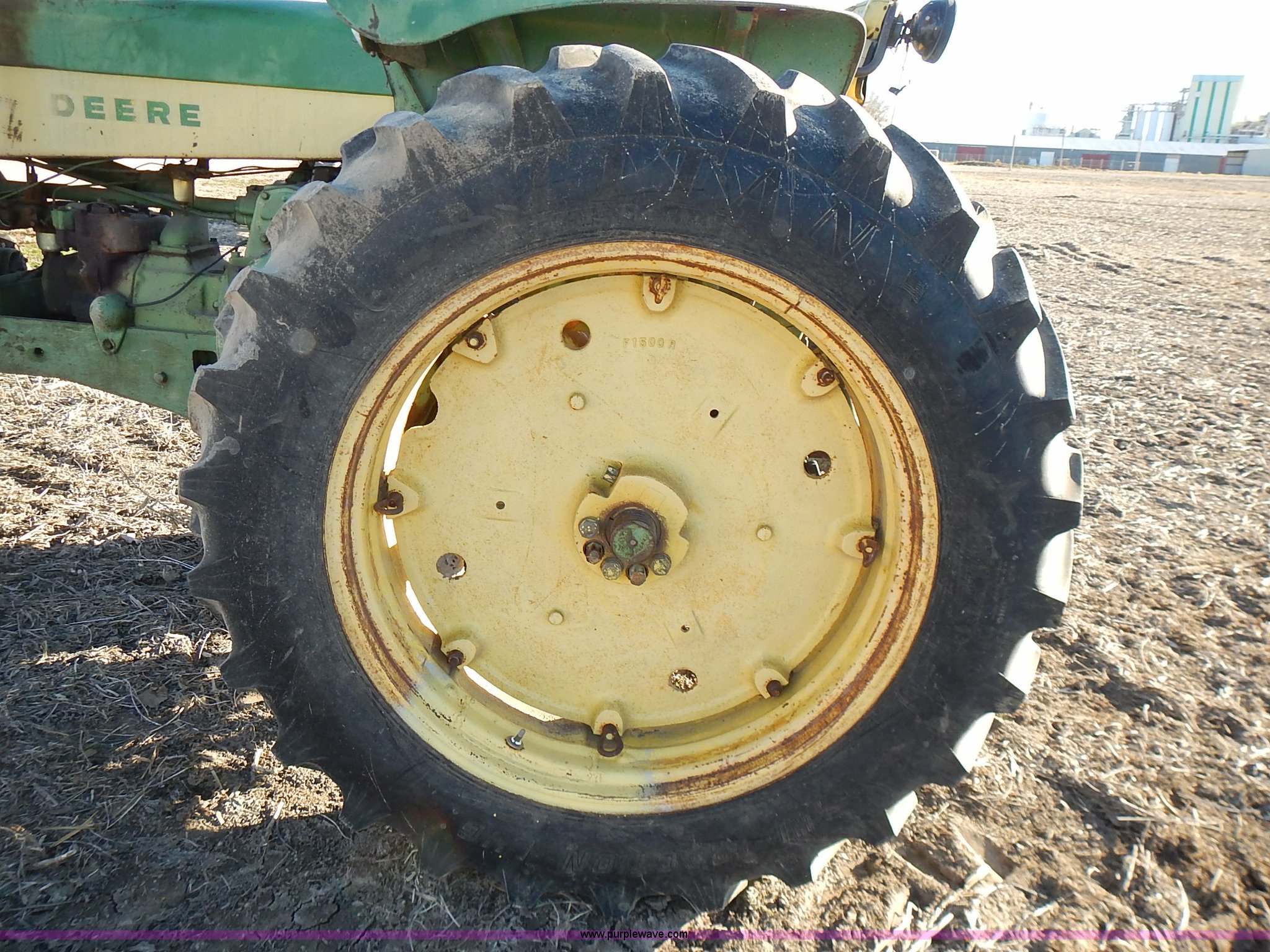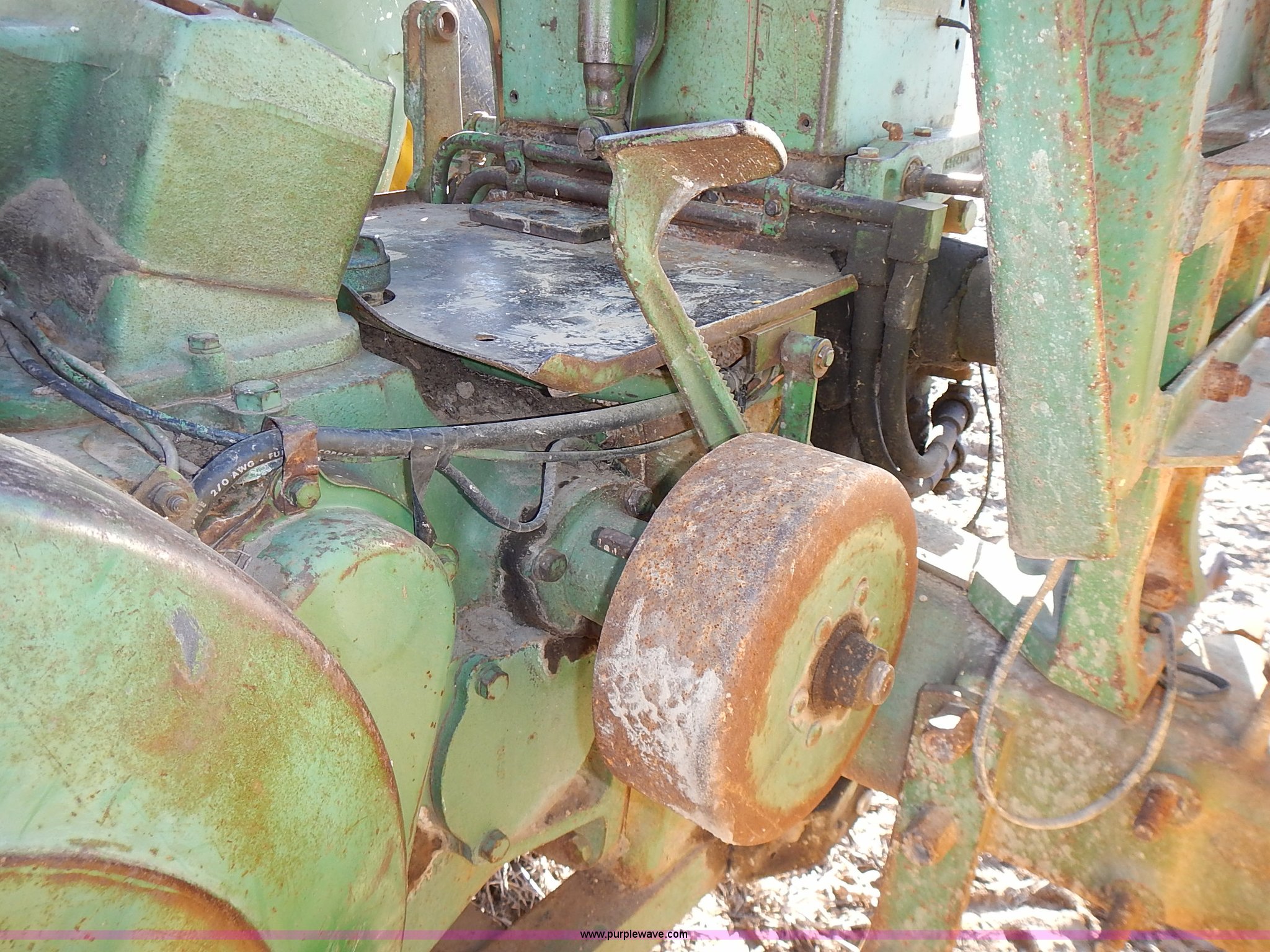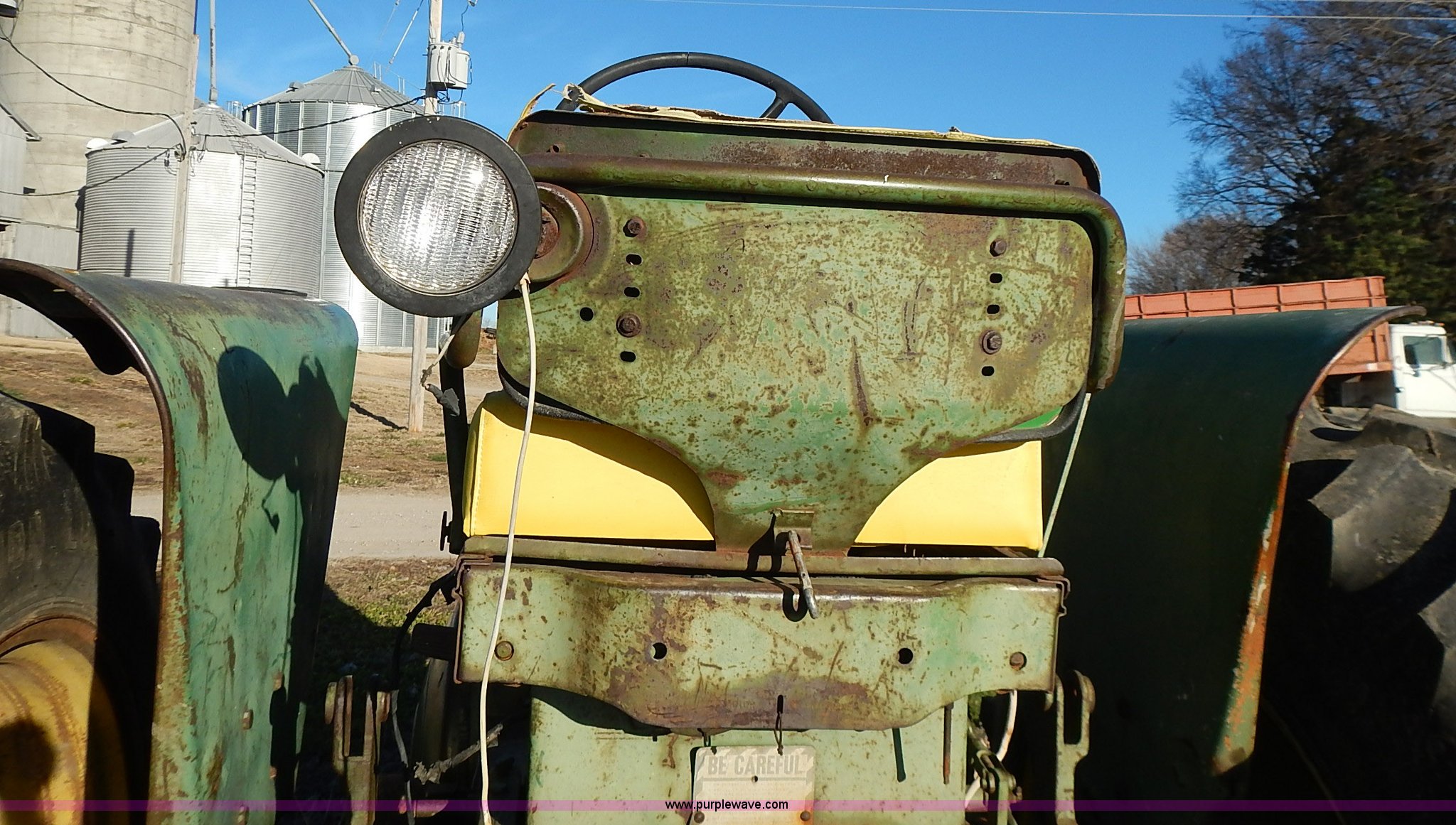 Purple Wave is selling a used Tractor in Kansas. This item is a John Deere 630 tractor with the following: 3,617 hours on meter, John Deere two cylinder gas engine, 6F-1R gears, Front and rear work lights, Power steering, Side belt pulley, Three point, 540 PTO, Draw bar, Rear hydraulic remote set, Regency 6.00-16 front tires, Titan 15.5-38 rear tires, Dents, Scratches, Paint faded, Seat damage, Serial 6309665