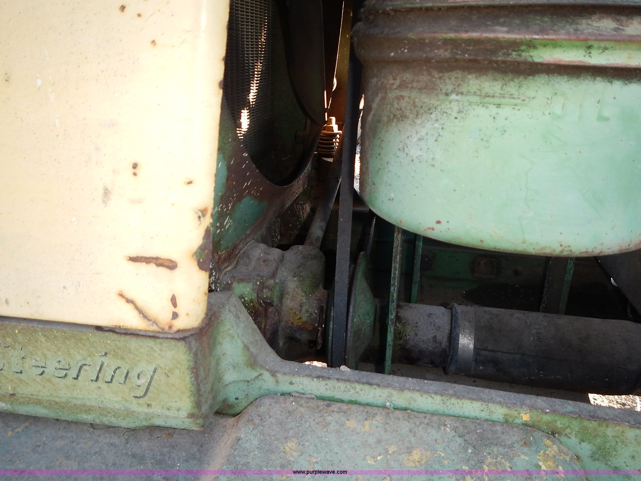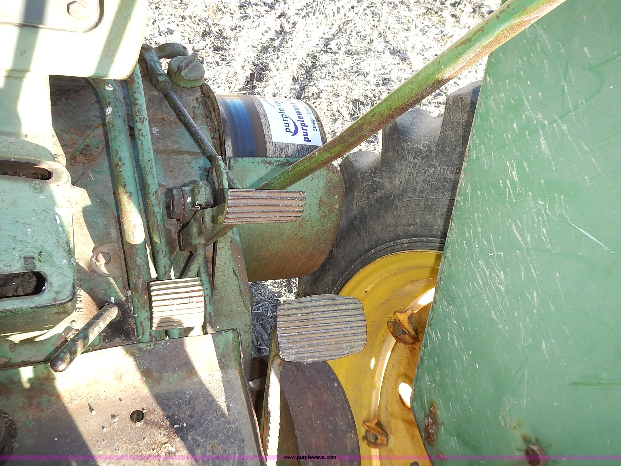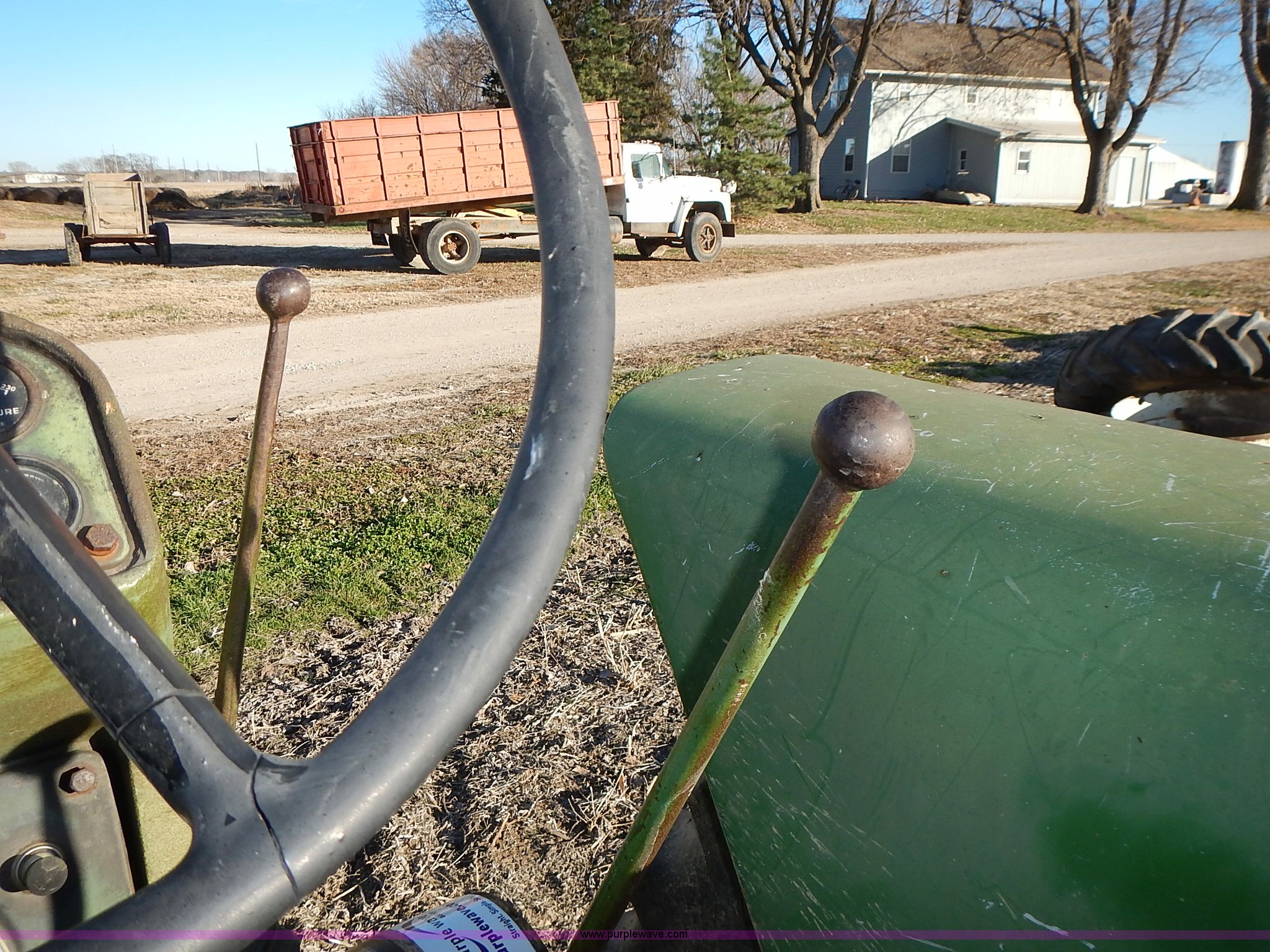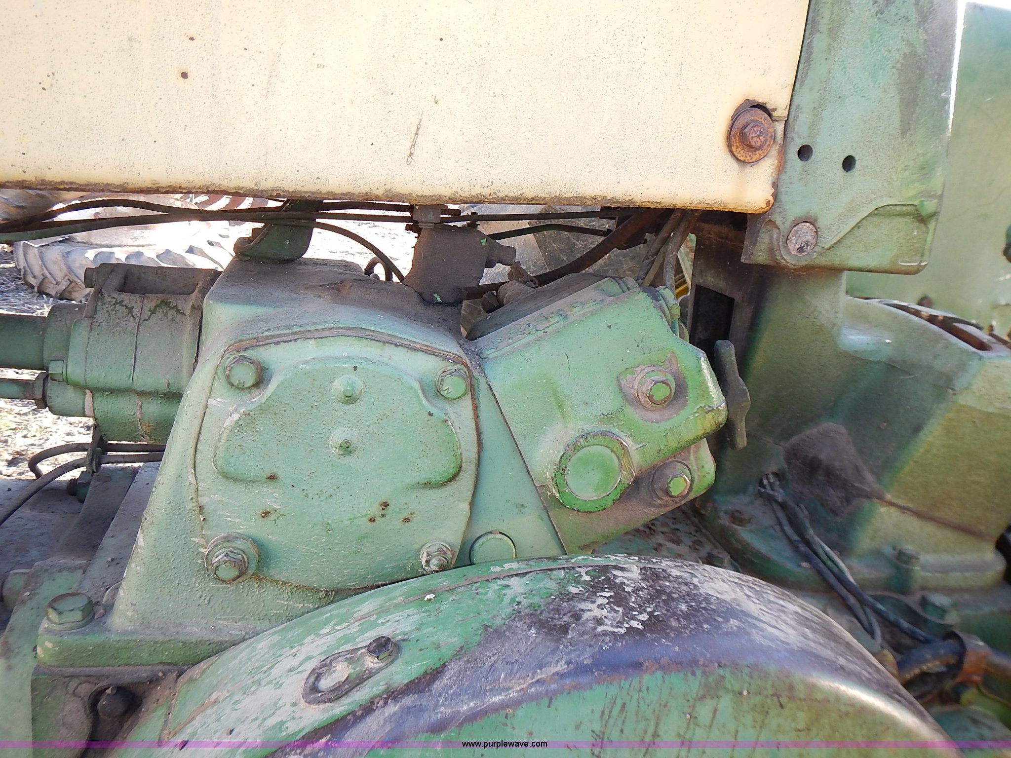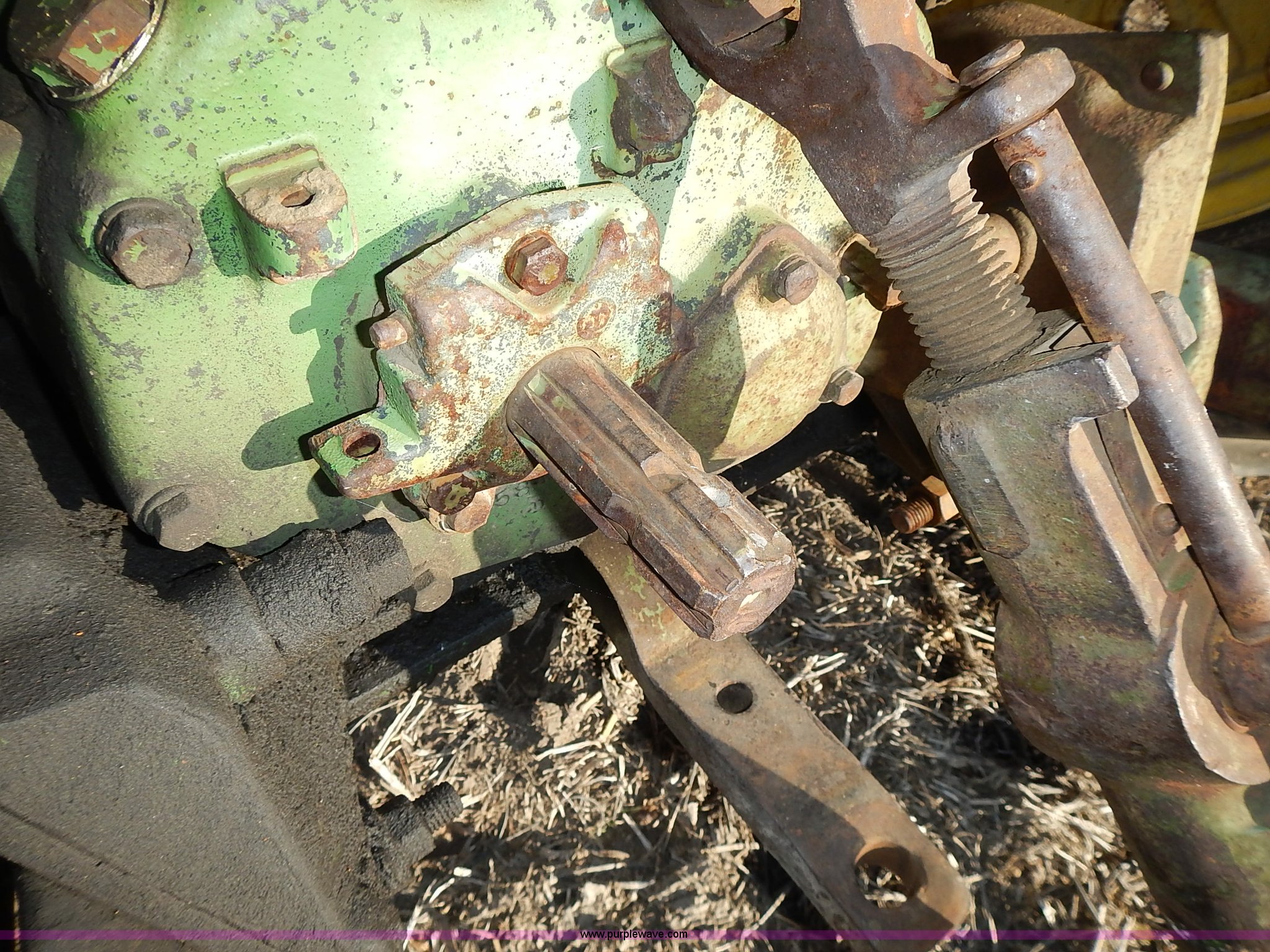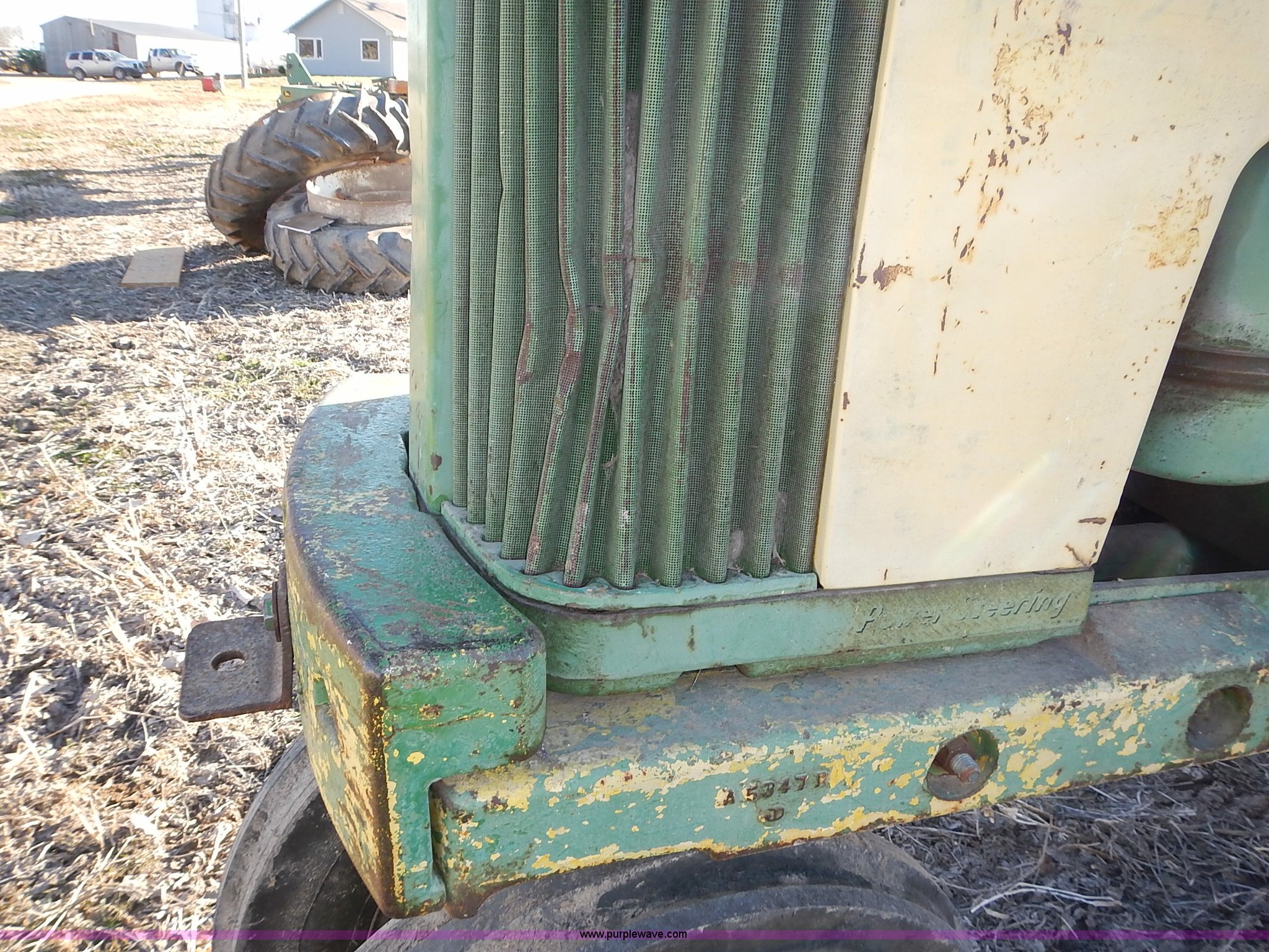 Purple Wave is selling a used Tractor in Kansas. This item is a John Deere 630 tractor with the following: 3,617 hours on meter, John Deere two cylinder gas engine, 6F-1R gears, Front and rear work lights, Power steering, Side belt pulley, Three point, 540 PTO, Draw bar, Rear hydraulic remote set, Regency 6.00-16 front tires, Titan 15.5-38 rear tires, Dents, Scratches, Paint faded, Seat damage, Serial 6309665