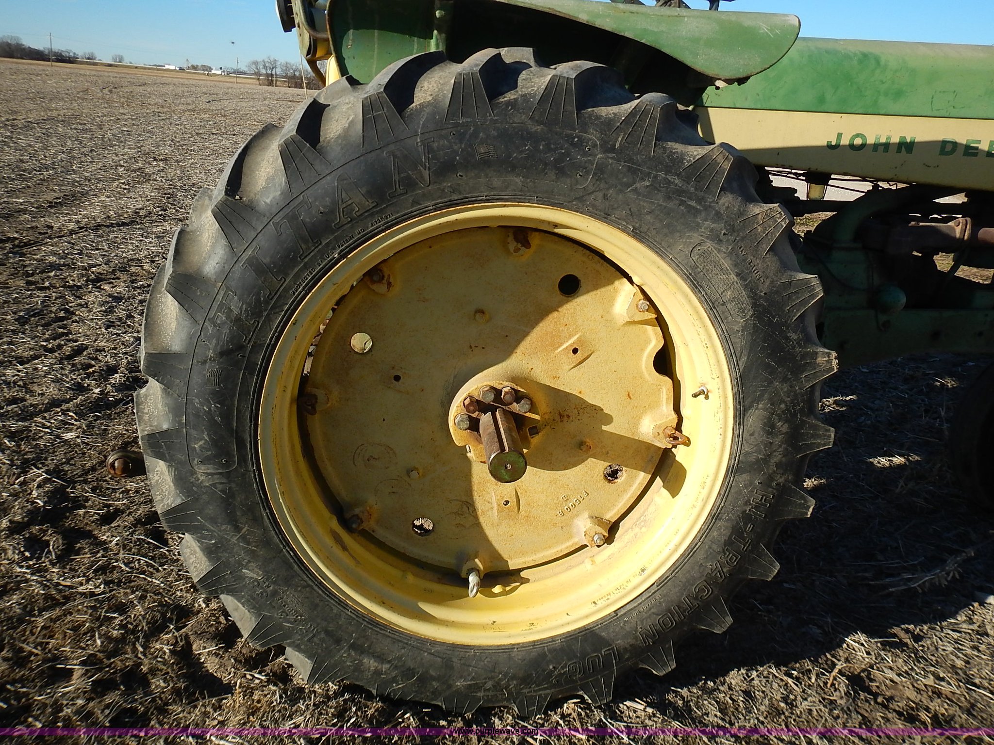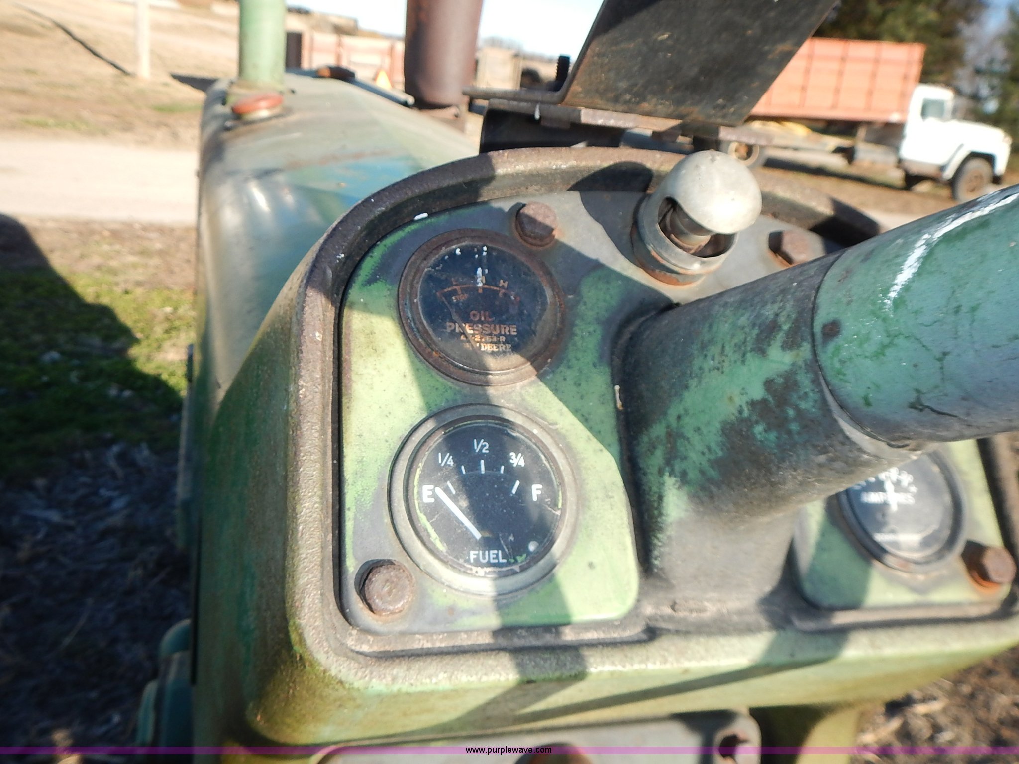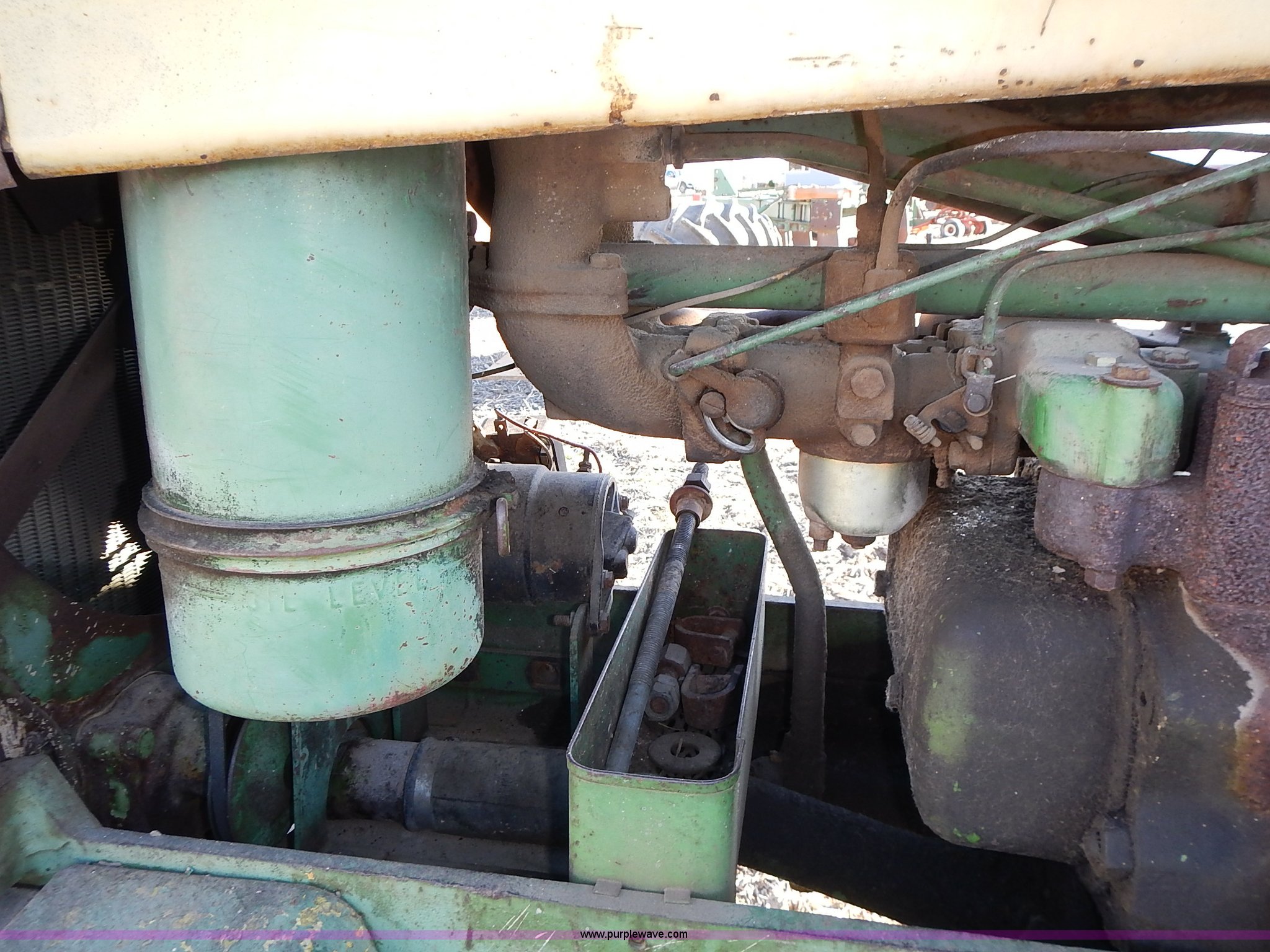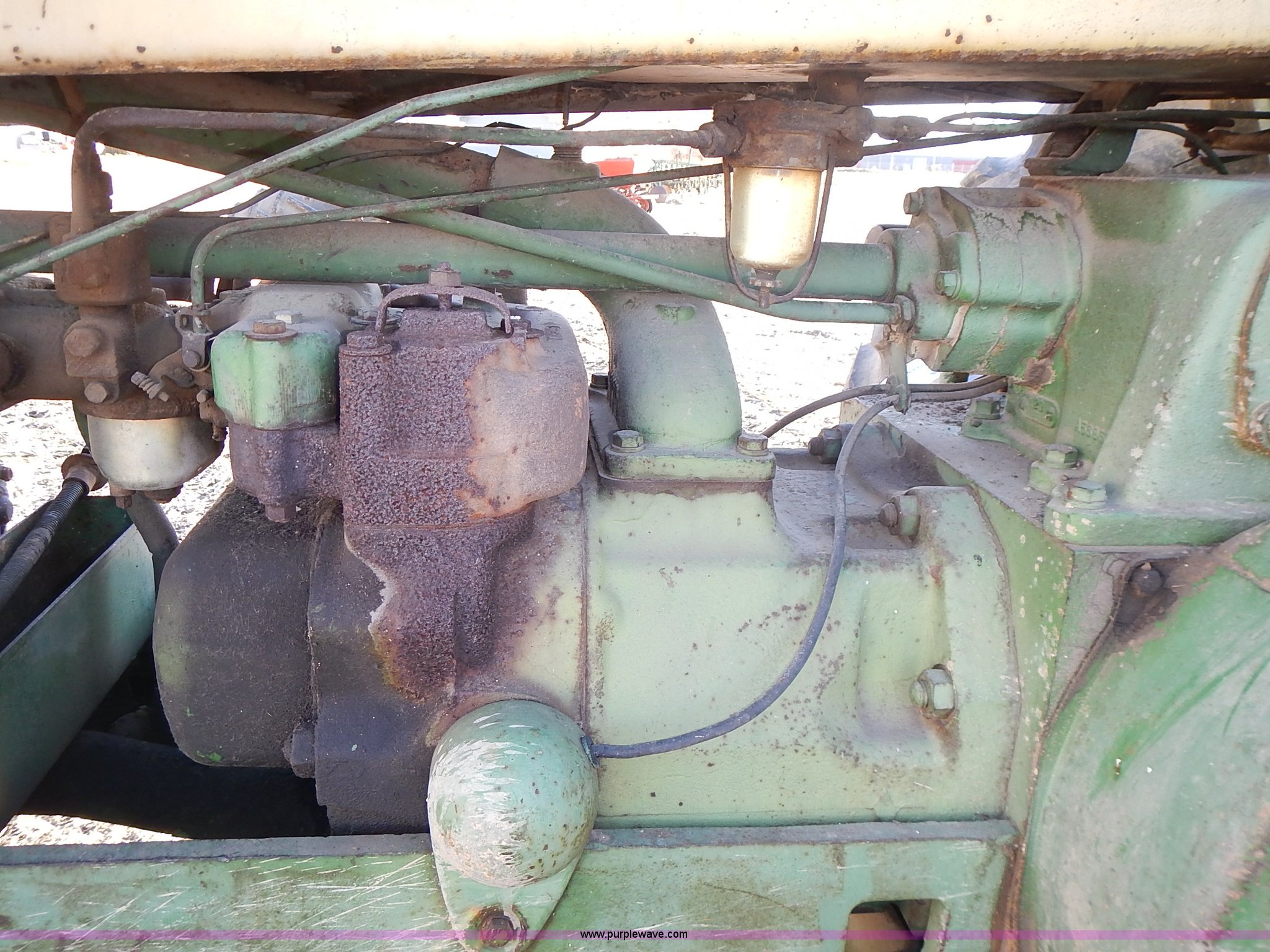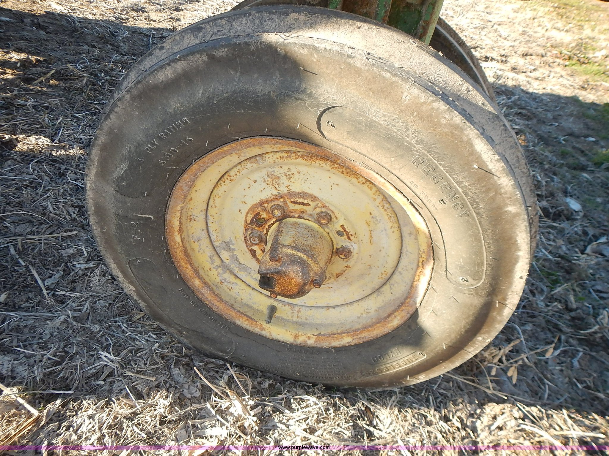 Purple Wave is selling a used Tractor in Kansas. This item is a John Deere 630 tractor with the following: 3,617 hours on meter, John Deere two cylinder gas engine, 6F-1R gears, Front and rear work lights, Power steering, Side belt pulley, Three point, 540 PTO, Draw bar, Rear hydraulic remote set, Regency 6.00-16 front tires, Titan 15.5-38 rear tires, Dents, Scratches, Paint faded, Seat damage, Serial 6309665
