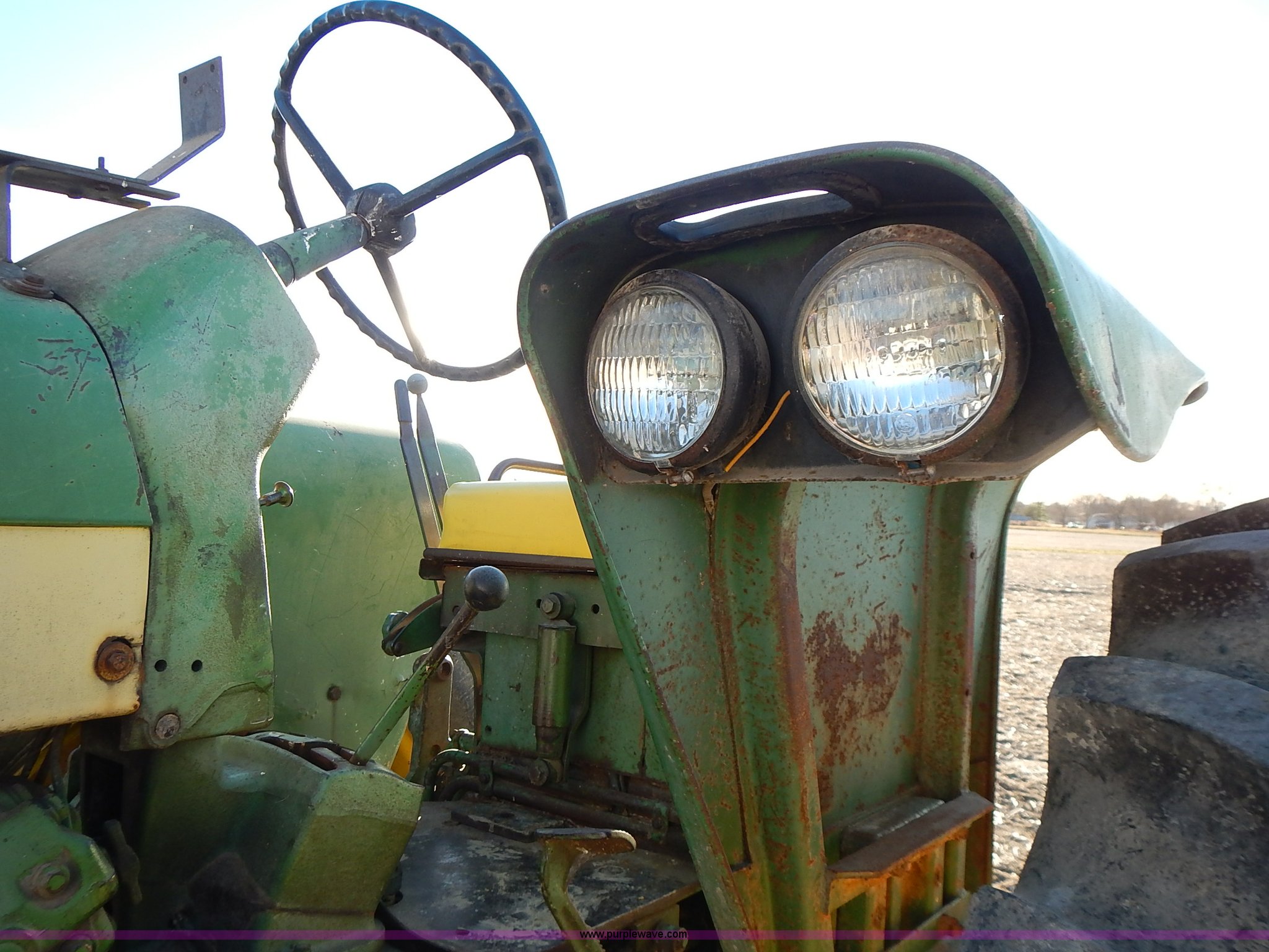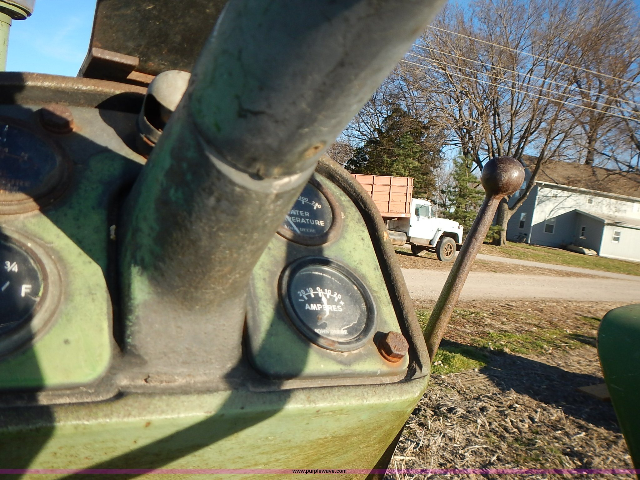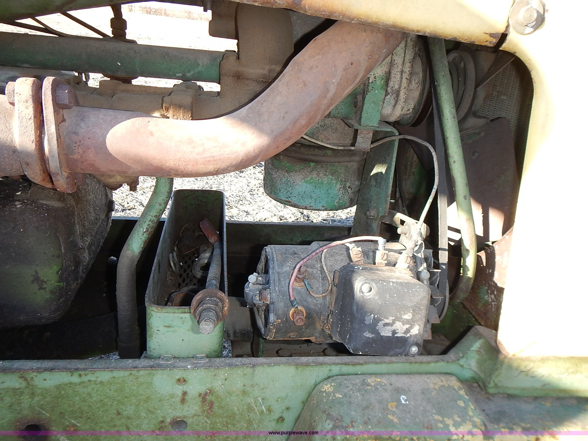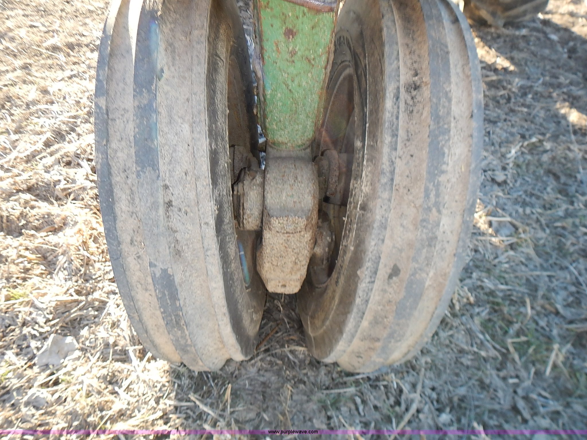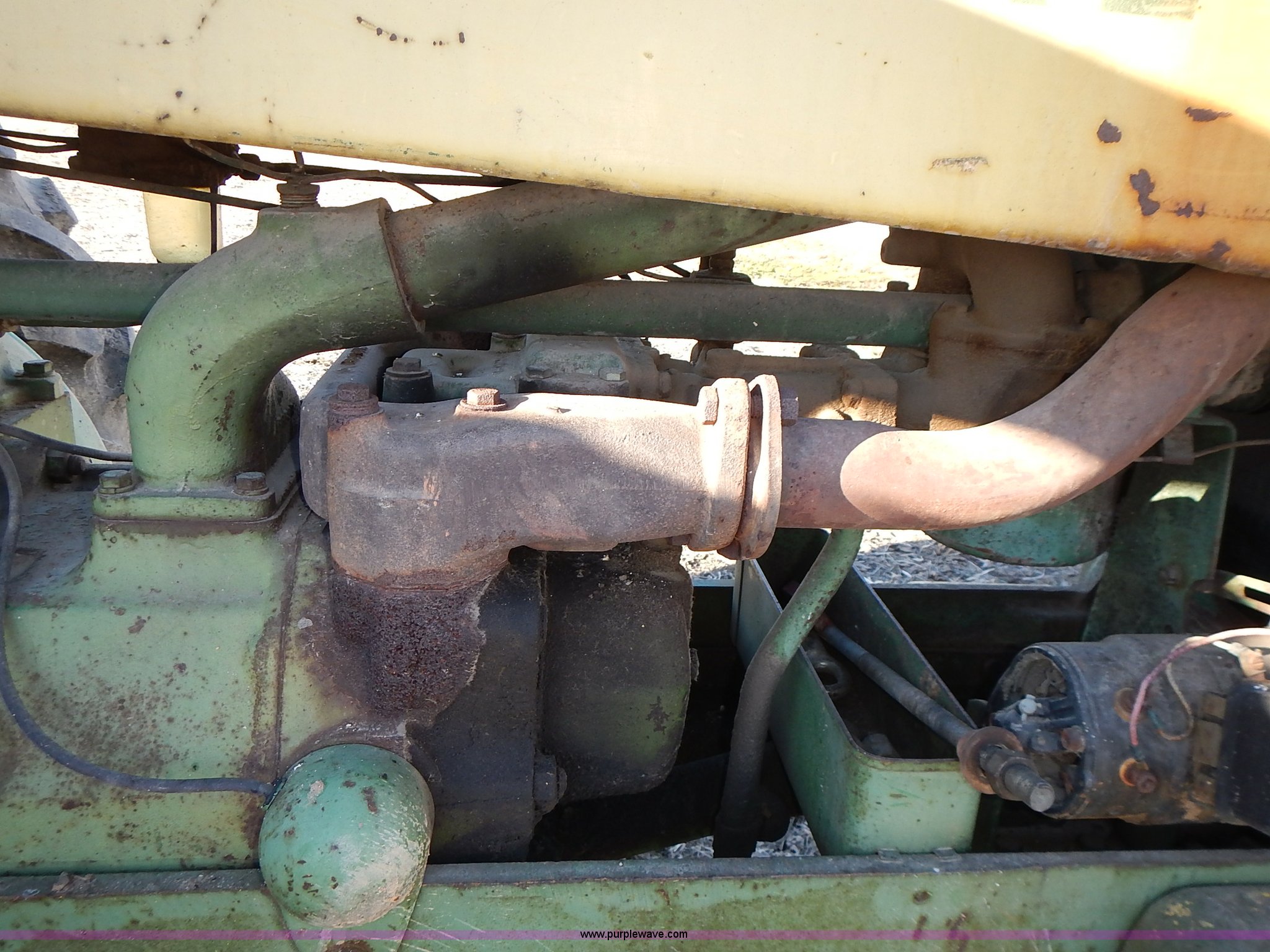 Purple Wave is selling a used Tractor in Kansas. This item is a John Deere 630 tractor with the following: 3,617 hours on meter, John Deere two cylinder gas engine, 6F-1R gears, Front and rear work lights, Power steering, Side belt pulley, Three point, 540 PTO, Draw bar, Rear hydraulic remote set, Regency 6.00-16 front tires, Titan 15.5-38 rear tires, Dents, Scratches, Paint faded, Seat damage, Serial 6309665